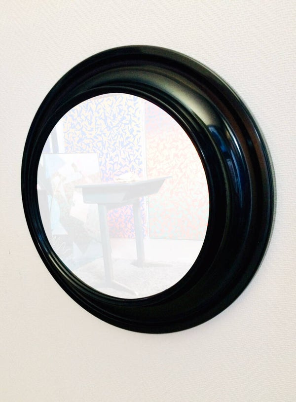Vintage Midcentury Modern Design round protruding black Mirror. Made in Italy, 1970's. In very good condition. 58cm x 58cm x 8cm.