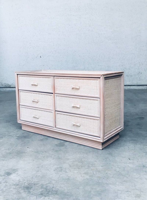 Vintage Design Washed Rattan and Wood Chest of Drawers. Made in the 1980's, probably Italy. No markings or maker labels. Wood constructed with woven rattan in cream washed color. 6 drawers on this low sideboard. This comes in good, used condition. Has a lot of patina from it's use and age. Loss of paint color on the wood as on the rattan. As can be seen in the pictures. Nice proportions and patina make the great look for this chest. Measures 79cm x 130,5cm x 49,5cm.