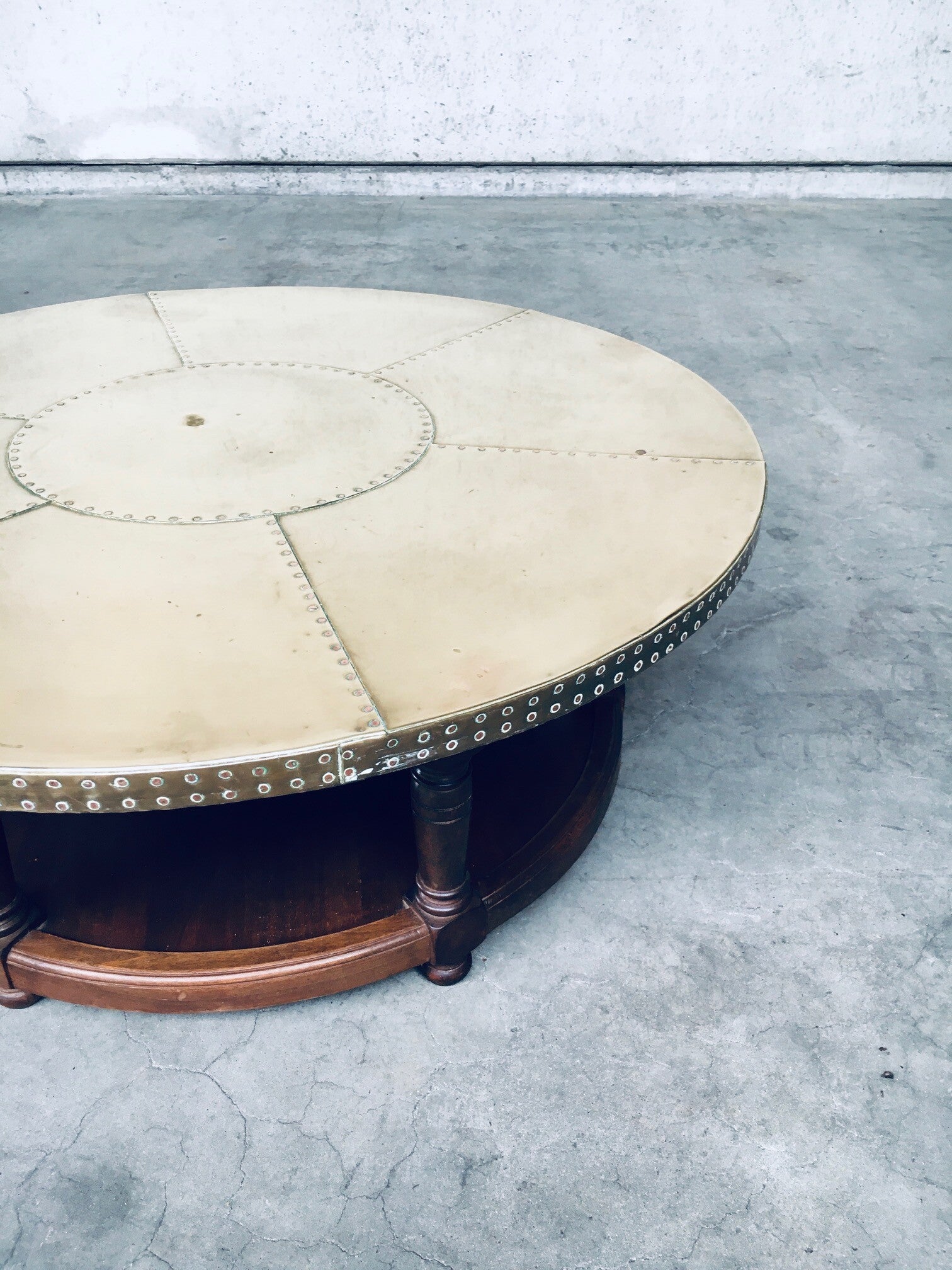 Vintage Artisan Design Brass Sheet covered round Coffee Table. Made in the 1970's. Wood constructed base with turned and carved legs. Brass sheets cover the top which are nailed. The brass top has wear marks from it's use and age with a dent in the round middle part (as can be seen in the pictures). A nice patinated artisan made coffee table for a great look. This measures 39,5cm x 100cm x 100cm.