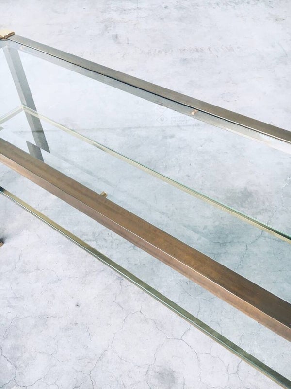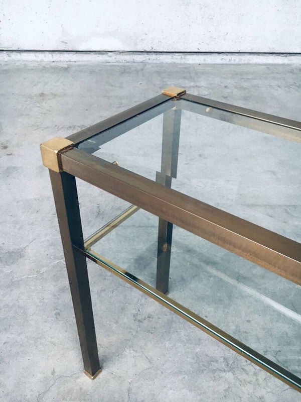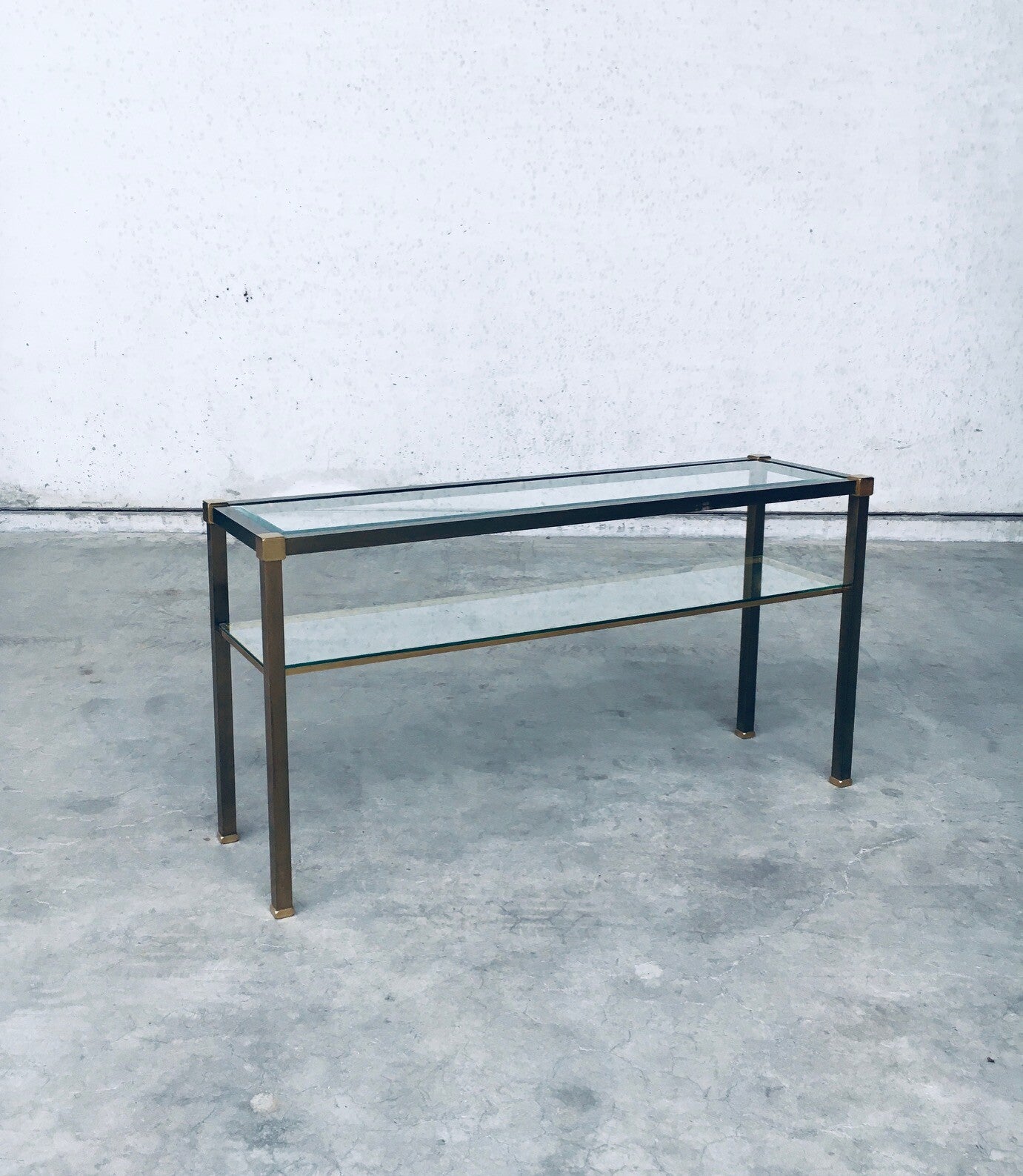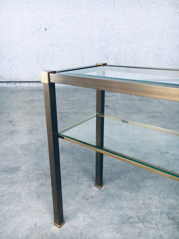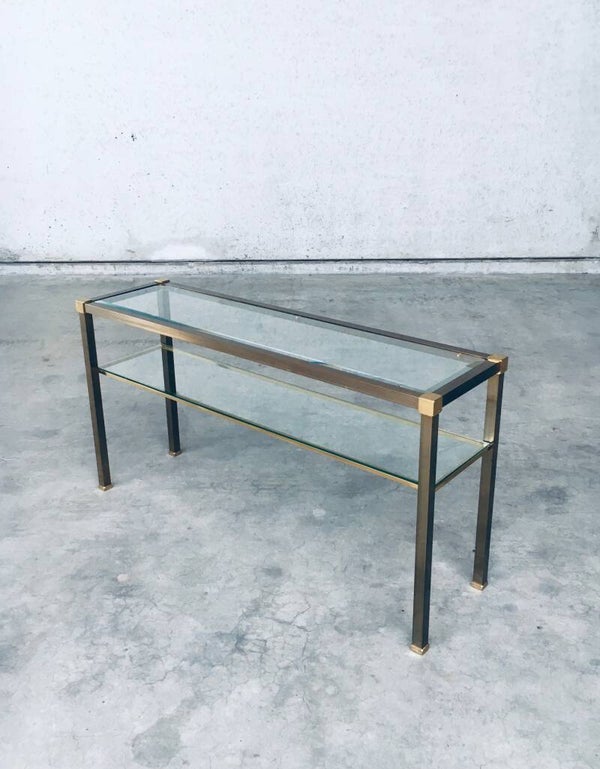 Vintage Design Hollywood Regency Style Slender Two Tier Console. Made in the Netherlands, 1970's period. 2 tone brass construction with glass inlay. The top glass has beveled edges. Sleek and minimalist in design. This comes in very good condition, with normal wear from it's use and age. Measures 70cm x 135cm x 37cm.