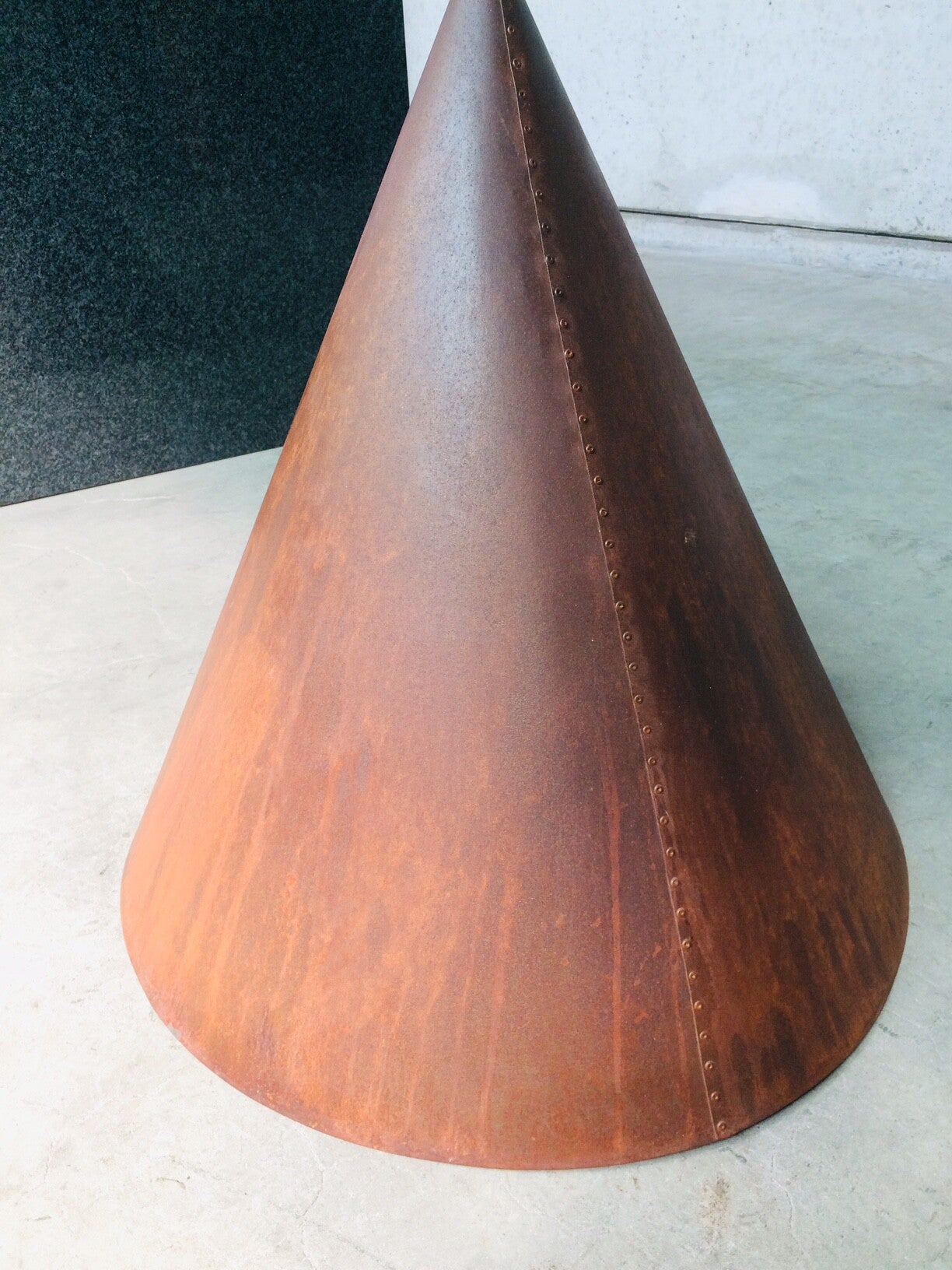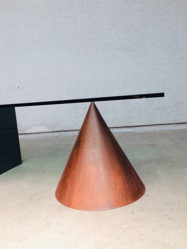 Post modern design architectural dining table KONO by Massimo & Lella Vignelli for Casigliani, Italy, 1984 / 1985. A true masterpiece. The Kono table consists of a black granite base of 70cm high and of a red copper cone, oxidized following ancient procedure. This cone is 70cm high with a 70cm base. In near perfect condition. 220cm x 105cm x 72cm.