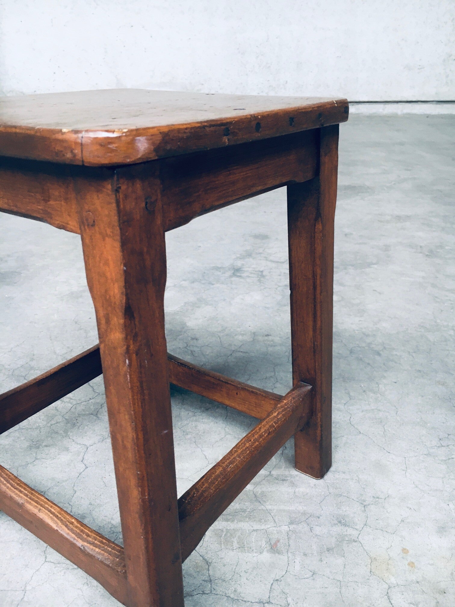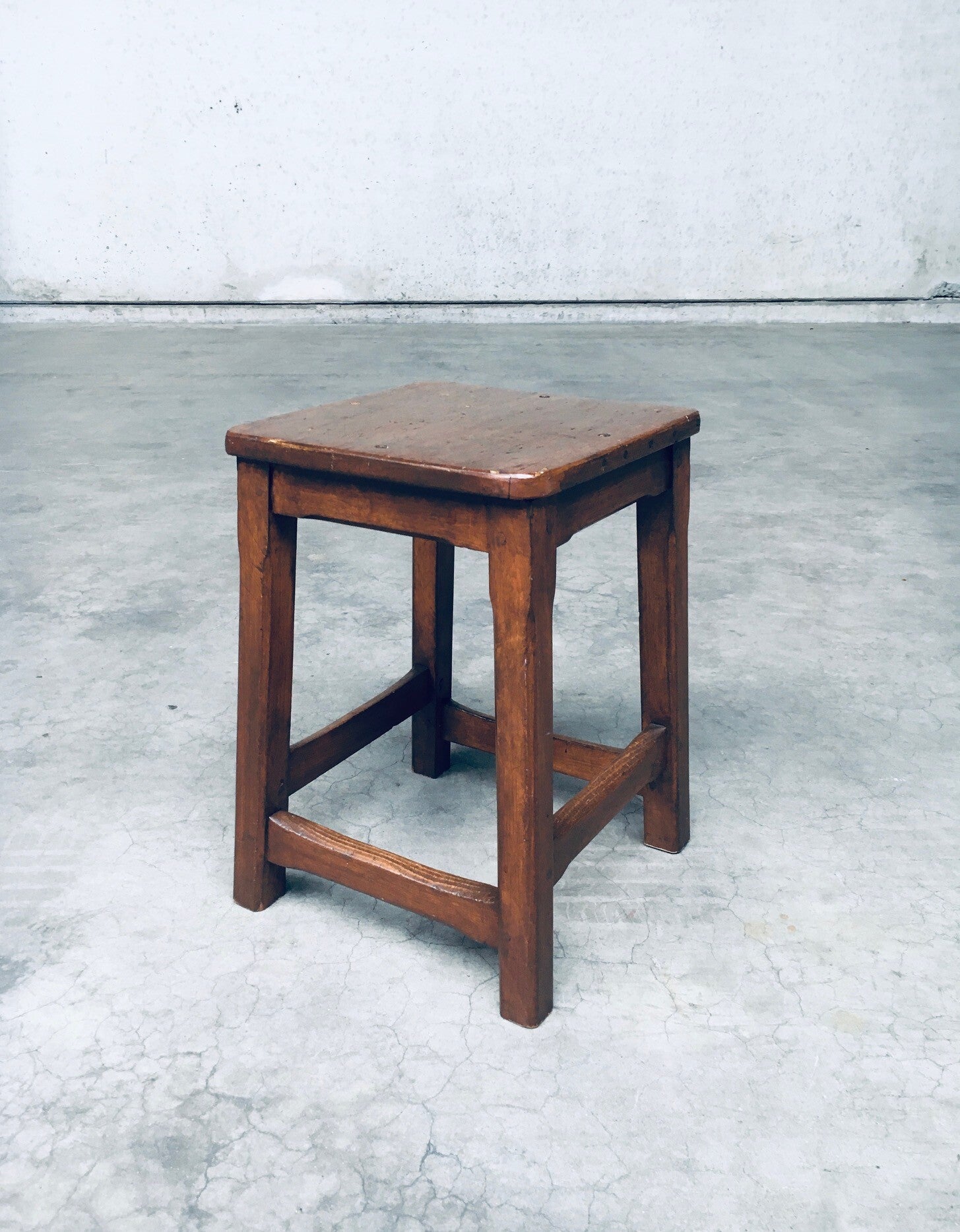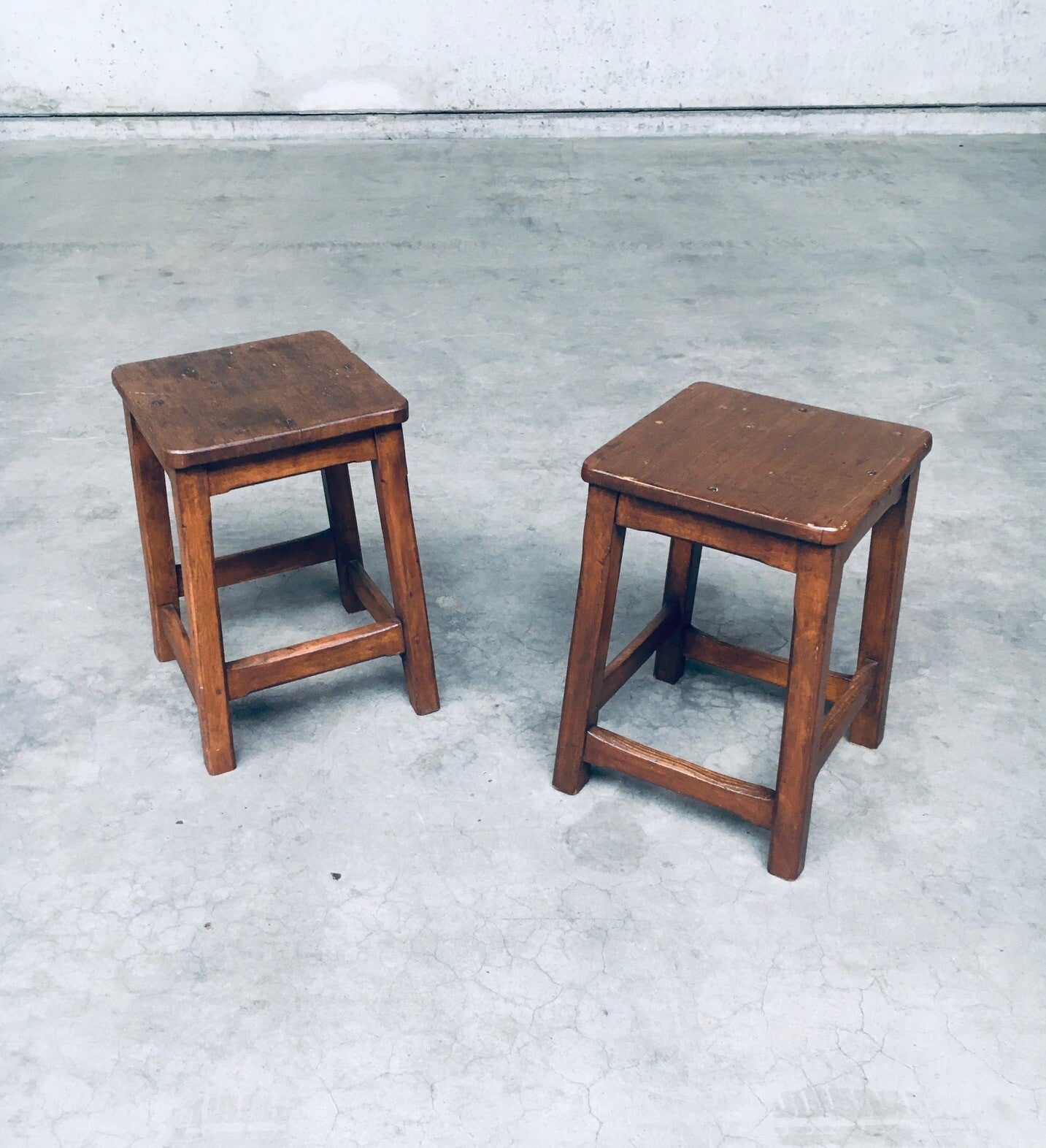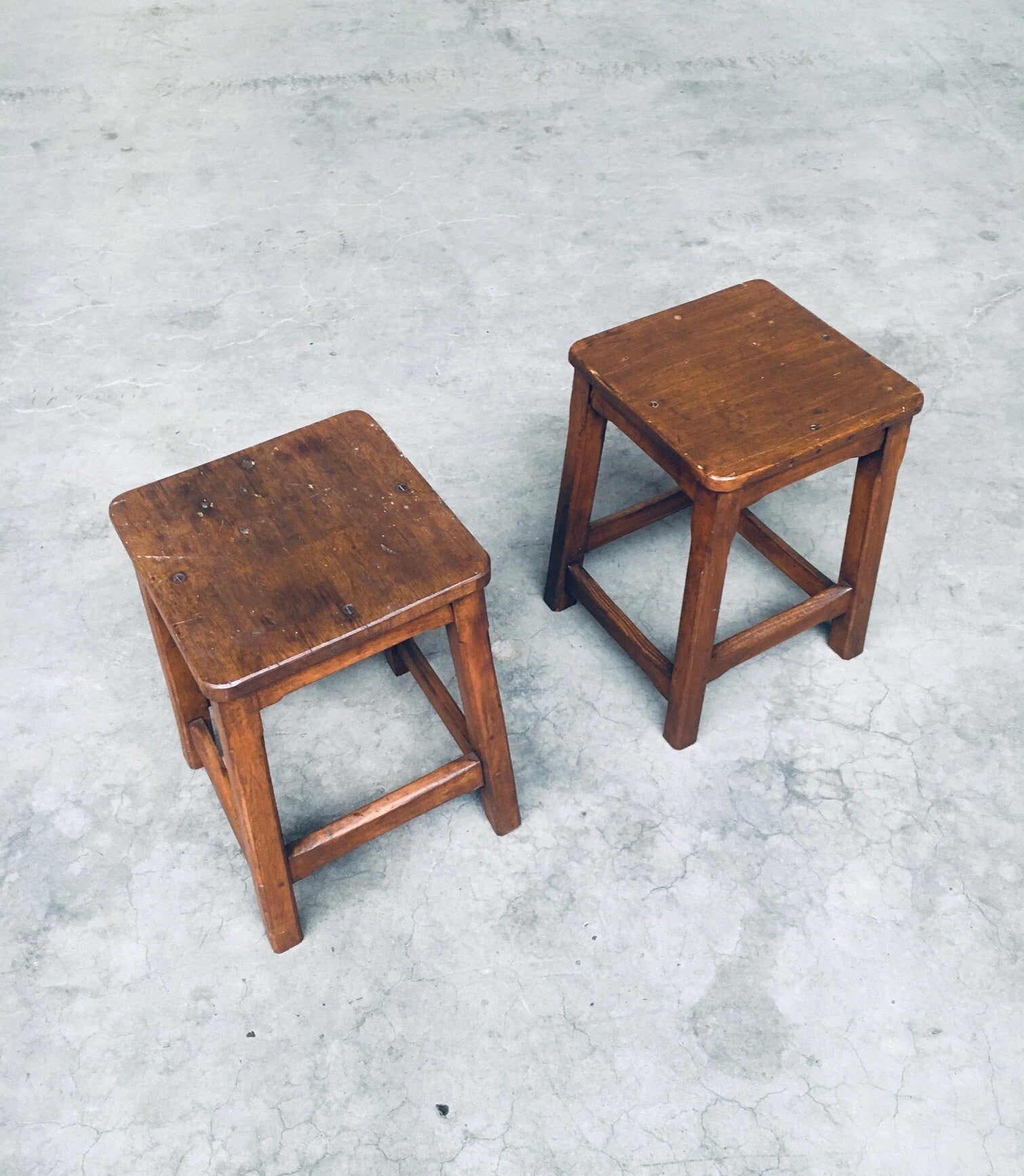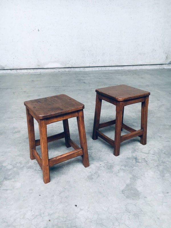 Vintage Hand Crafted Design Solid Wood Stool set. Made in Belgium, 1940's period. Solid beech or birch wood constructed square stools. Solid and sturdy low stools. Both are in very good, all original condition. Each measures 49cm x 33cm x 33cm.