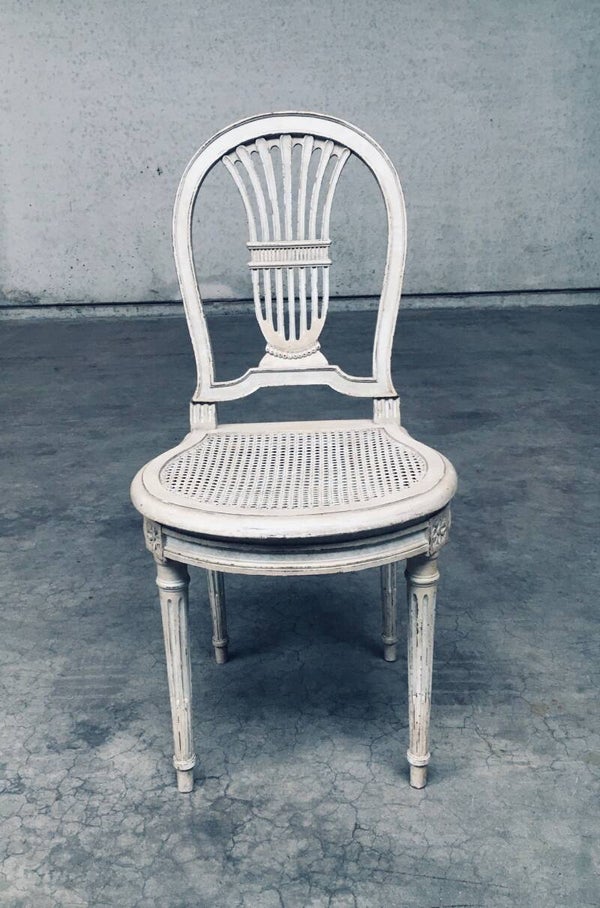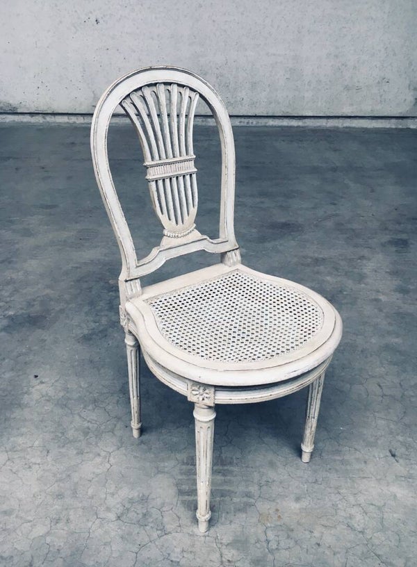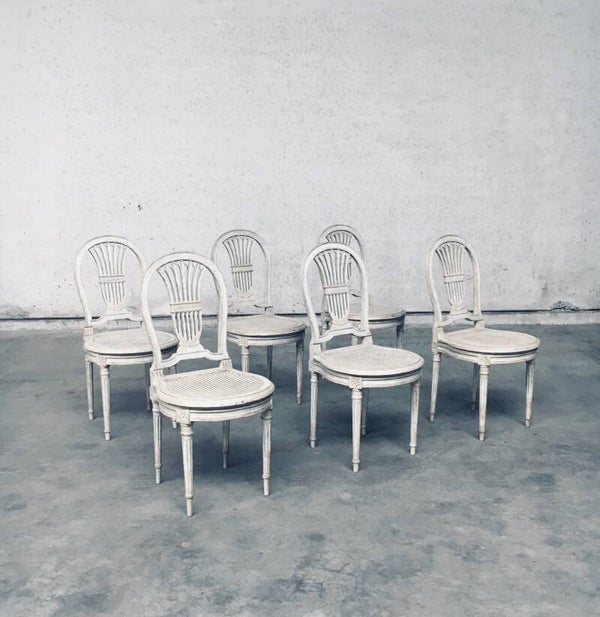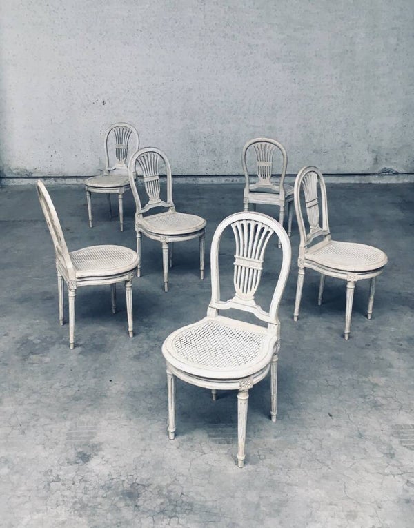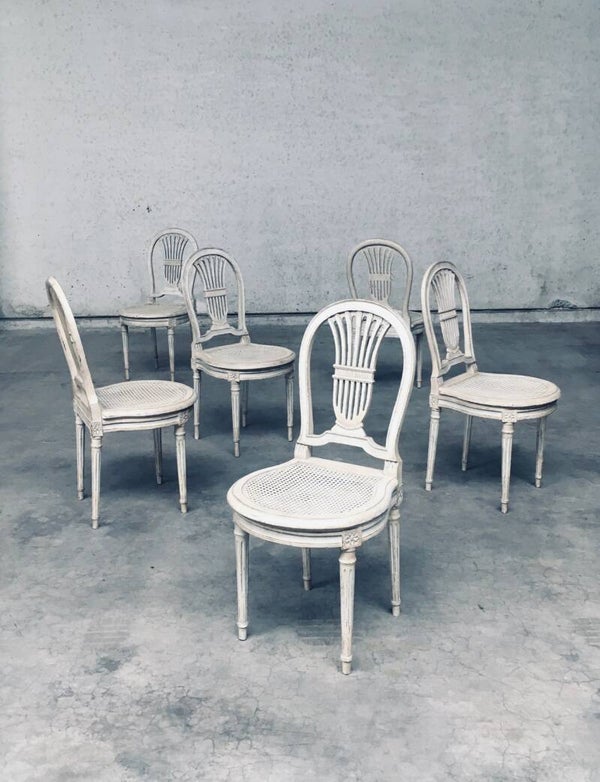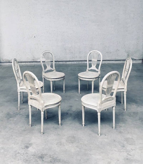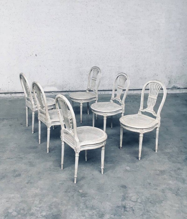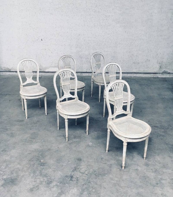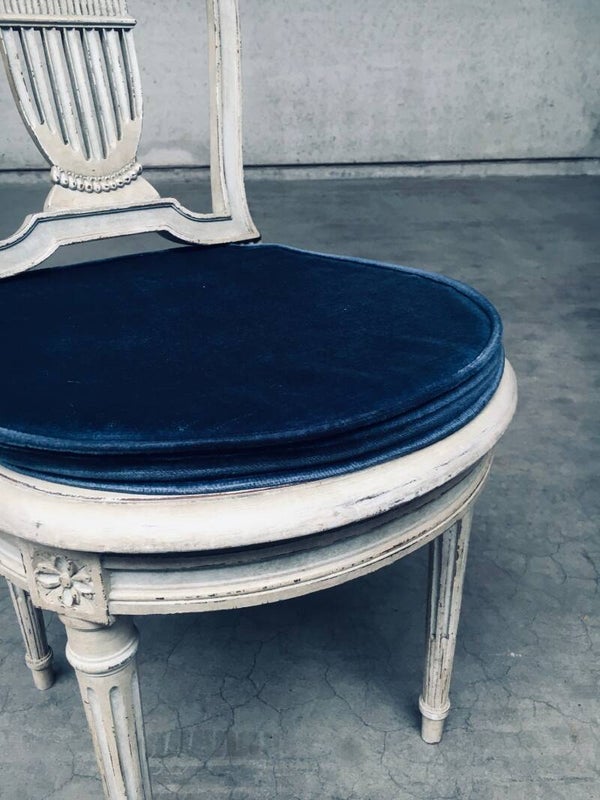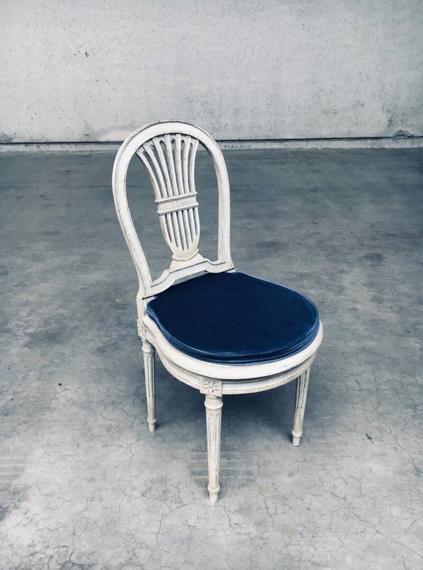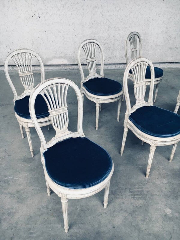 Vintage Louis XVI Design Style Dining Chair set of 6. Made in France, 1940's period. Hot Air Balloon Model Fer à Cheval. Ivory lacquered / stained wood constructed chairs with cane webbing seats. They all have a custom made dark blue velvet cushion for comfortable sitting. All chairs are in good, used condition. With patina and signs of their age and use. Each chair measures 92,5cm x 45cm x 48cm. Seat height 45cm.