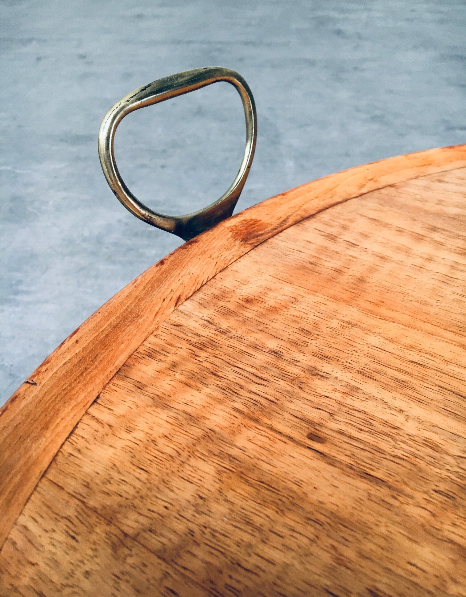 Vintage Midcentury Modern Design "TRAY" Coffee or Side Table. Made in Italy, 1960's period. No maker markings. Elm wood constructed round tray table with slender tapered legs with brass feet. The round tray top has brass handles. This comes in very good, all original condition with normal signs of it's use and age. Measures 45,5cm x 68,5cm x 68,5cm.