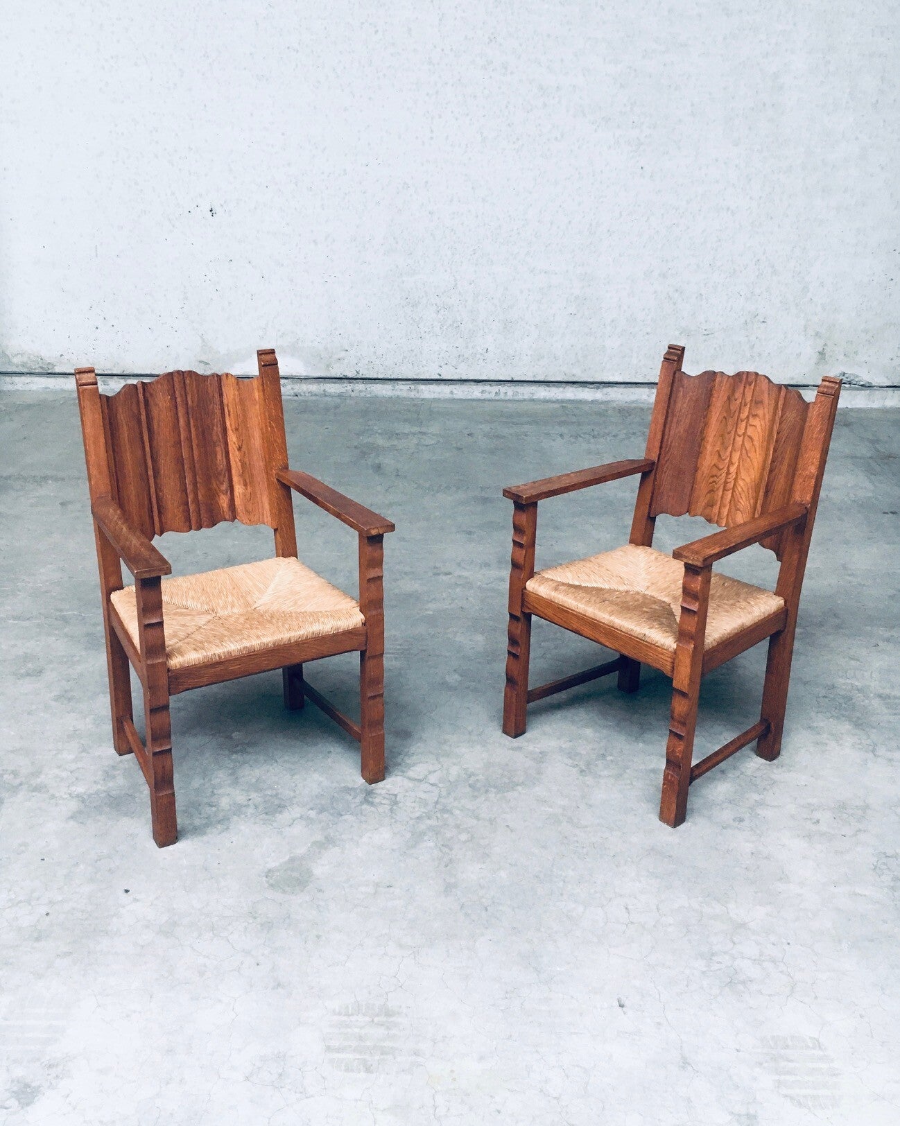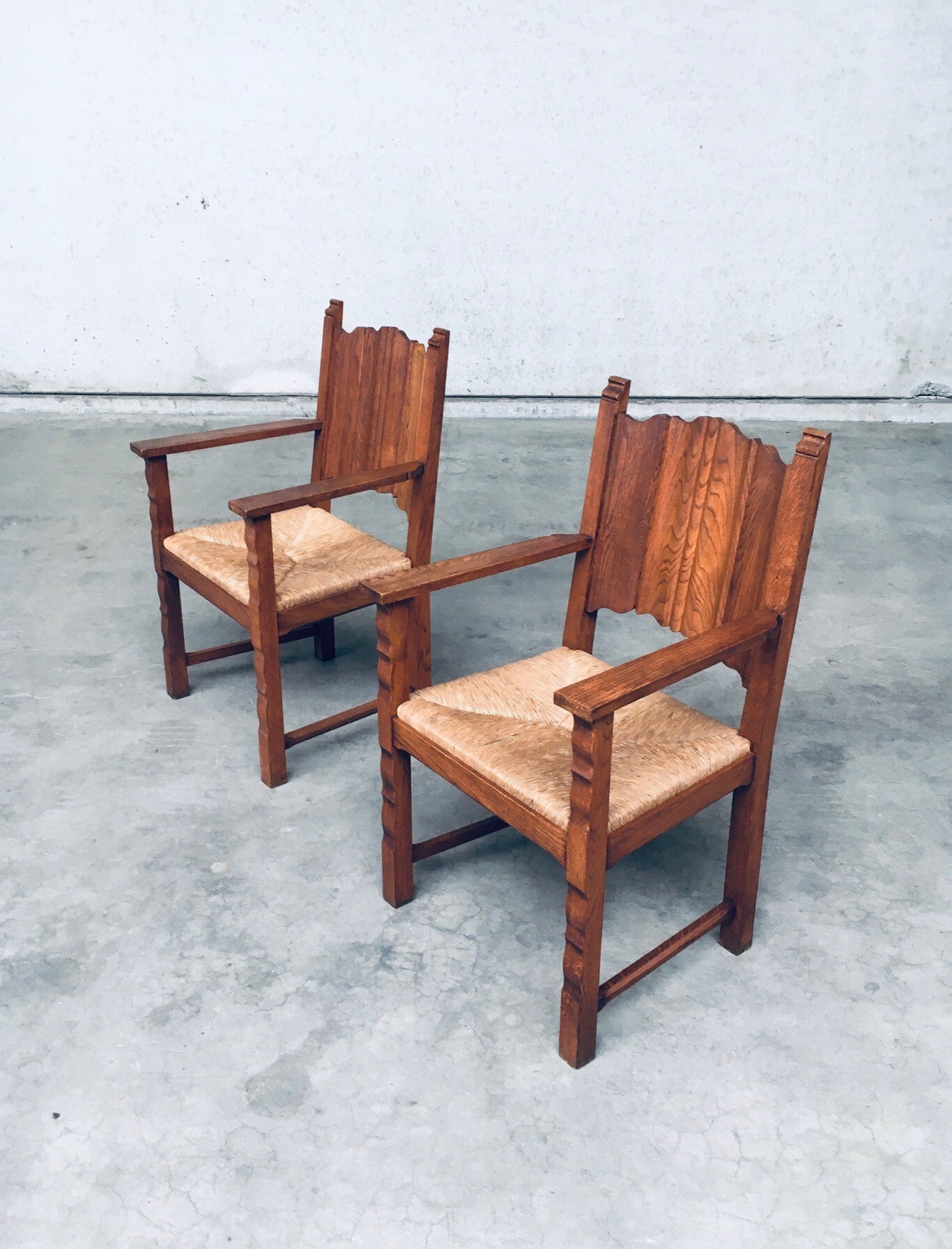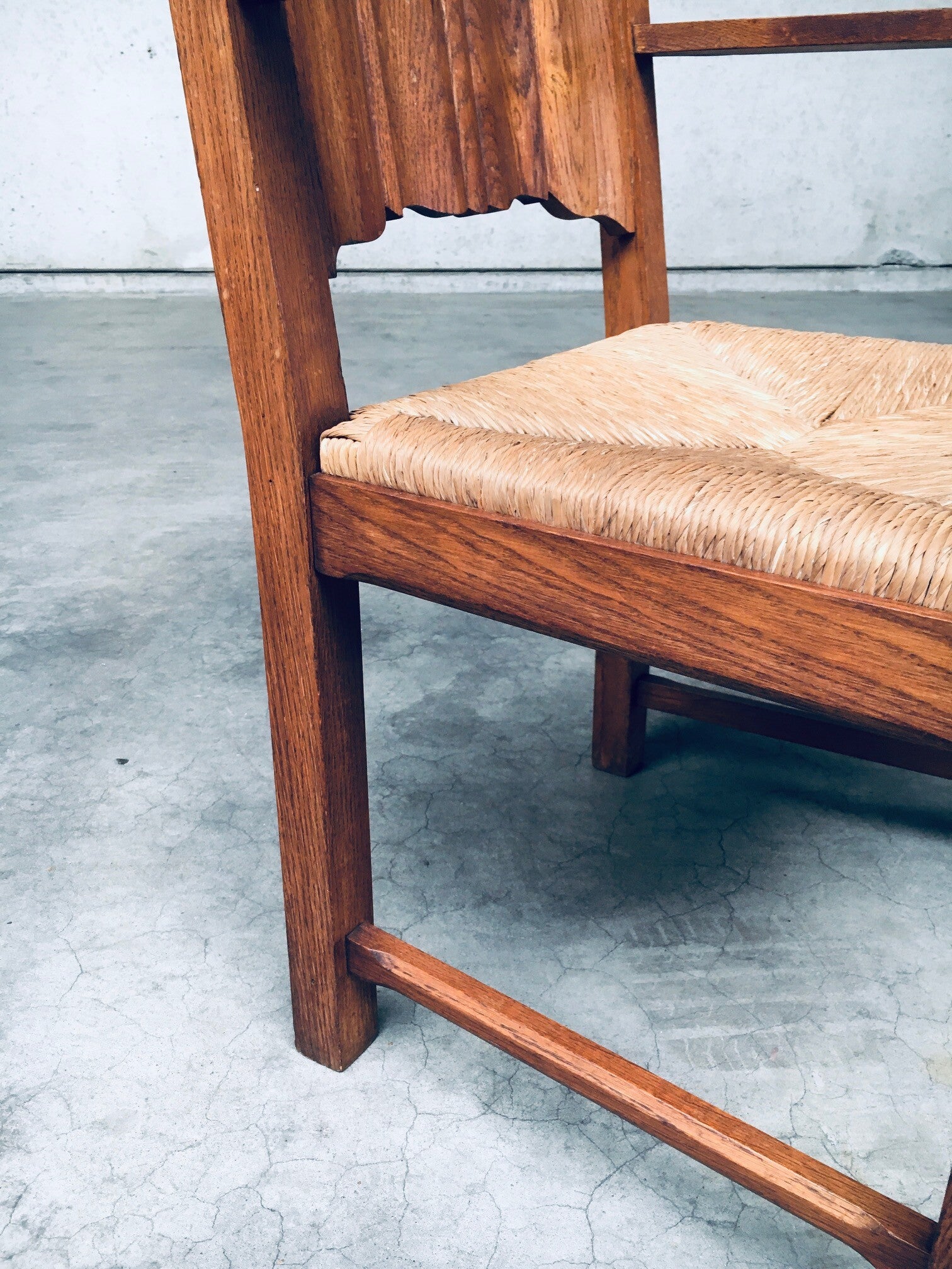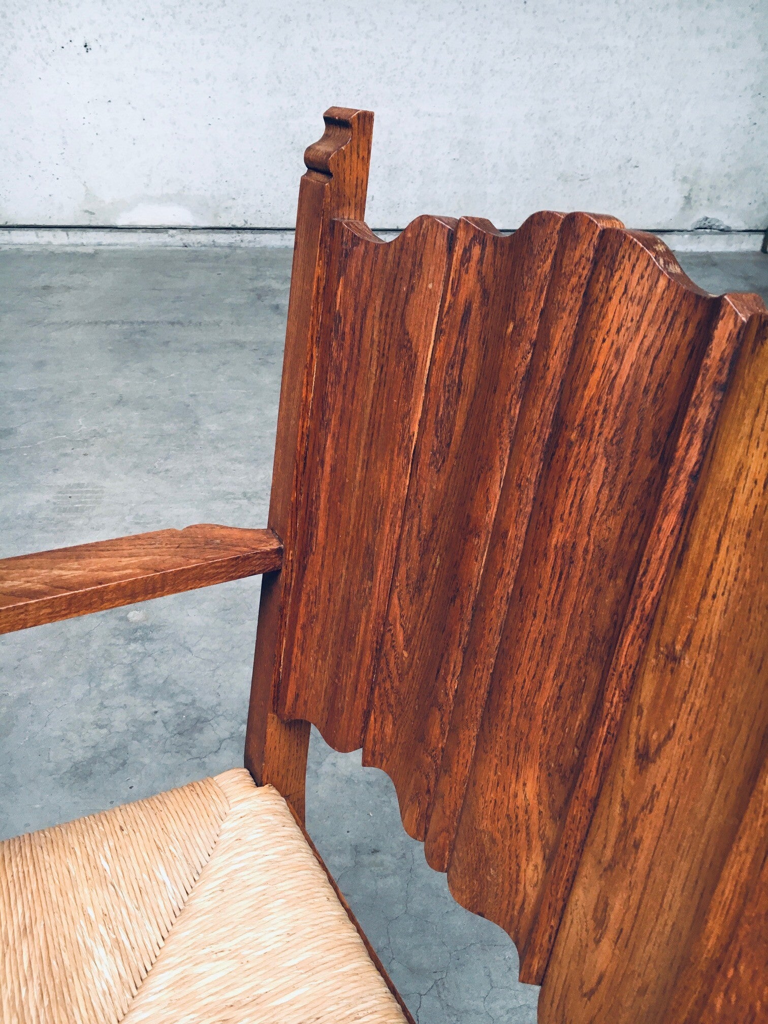 Original Rustic Travail Populaire Oak & Rush Arm Chair set of 2. Made in Belgium, 1960's period. Solid oak constructed armchair with rush woven seat. Well made, sturdy and large armchairs. They both come in very good condition with minor signs of their use and age. Each measures 100cm x 61cm x 57cm. Seat height measures 46cm.