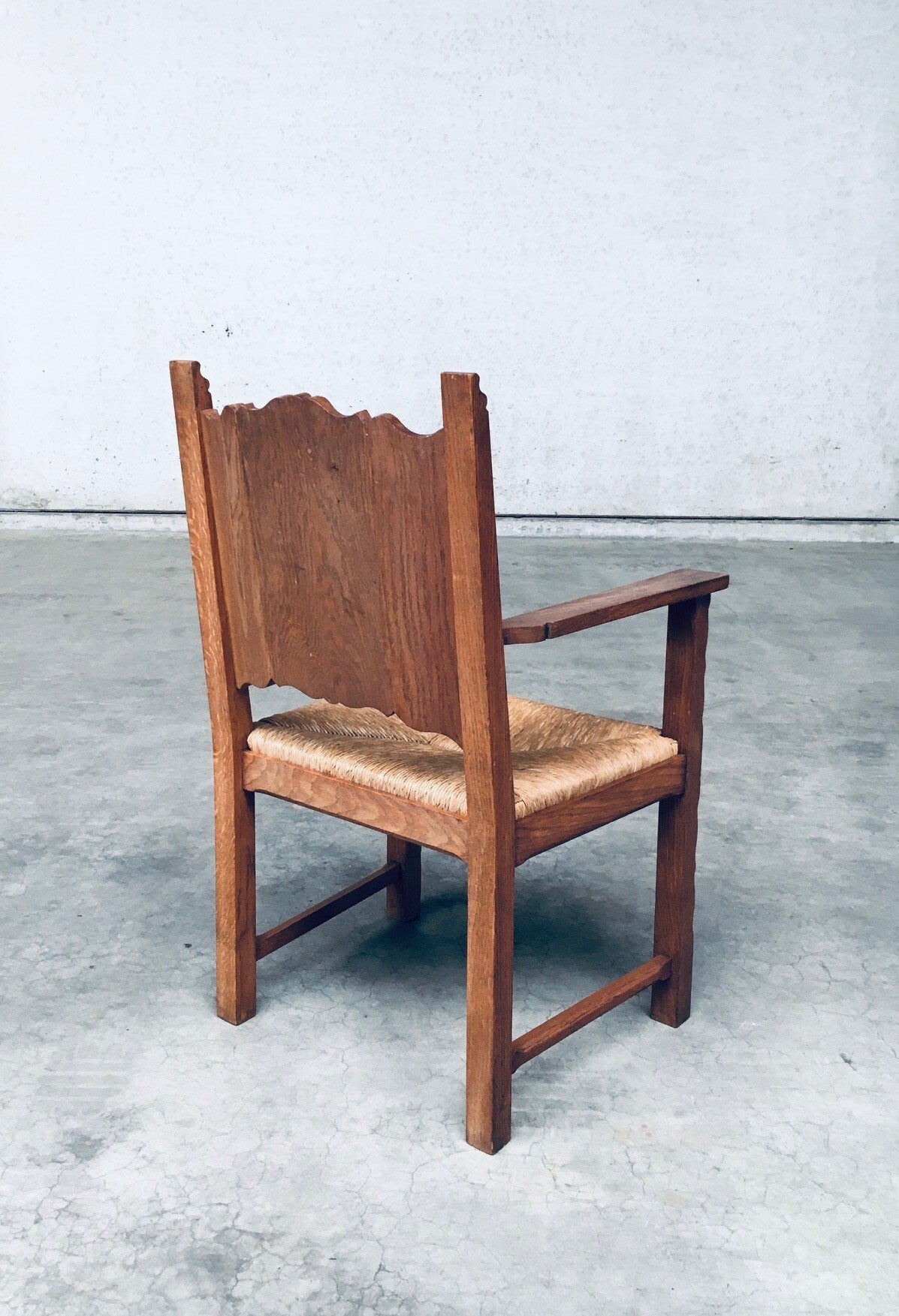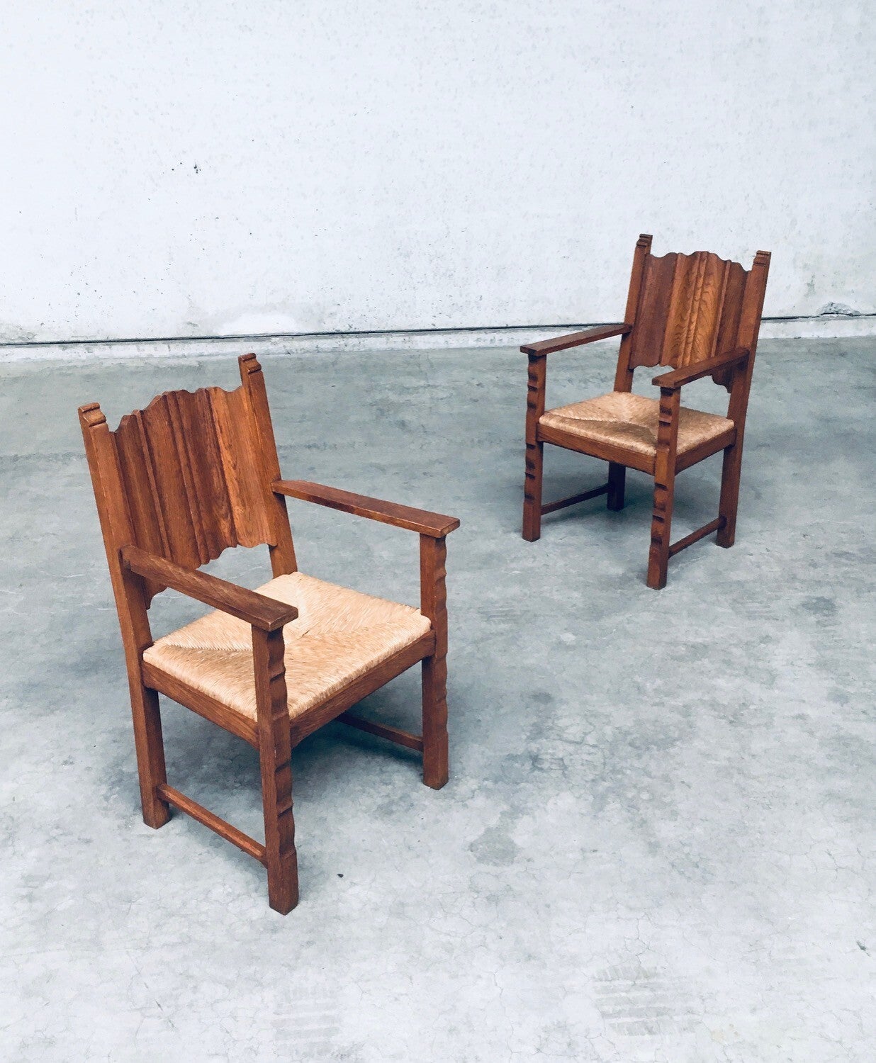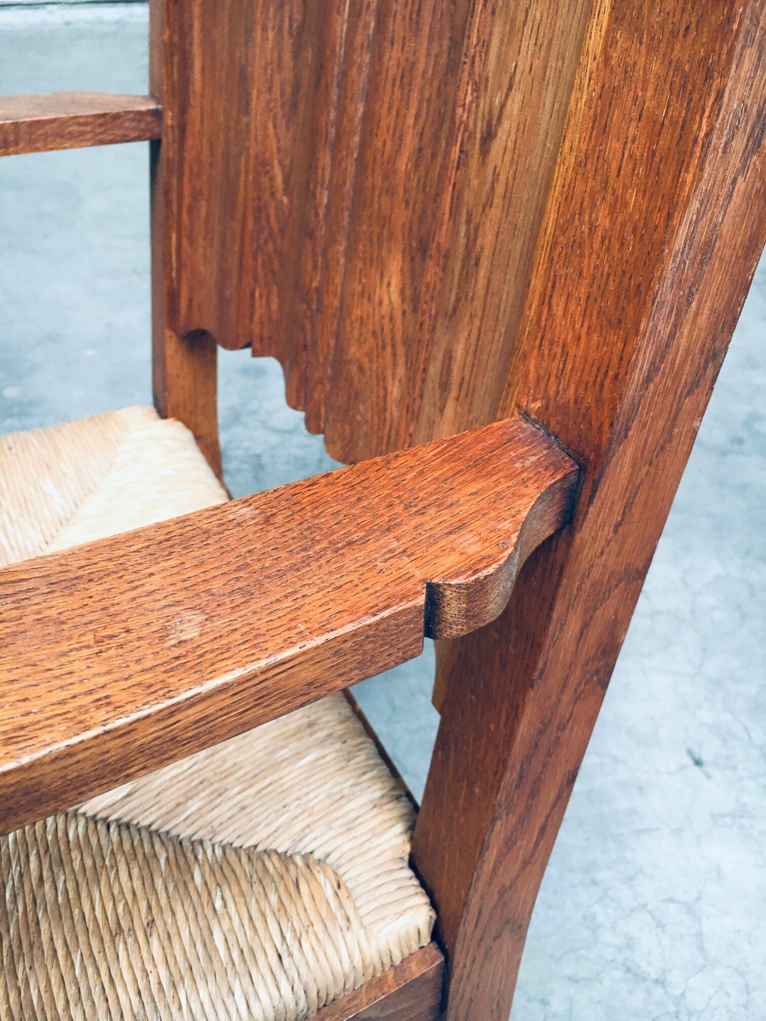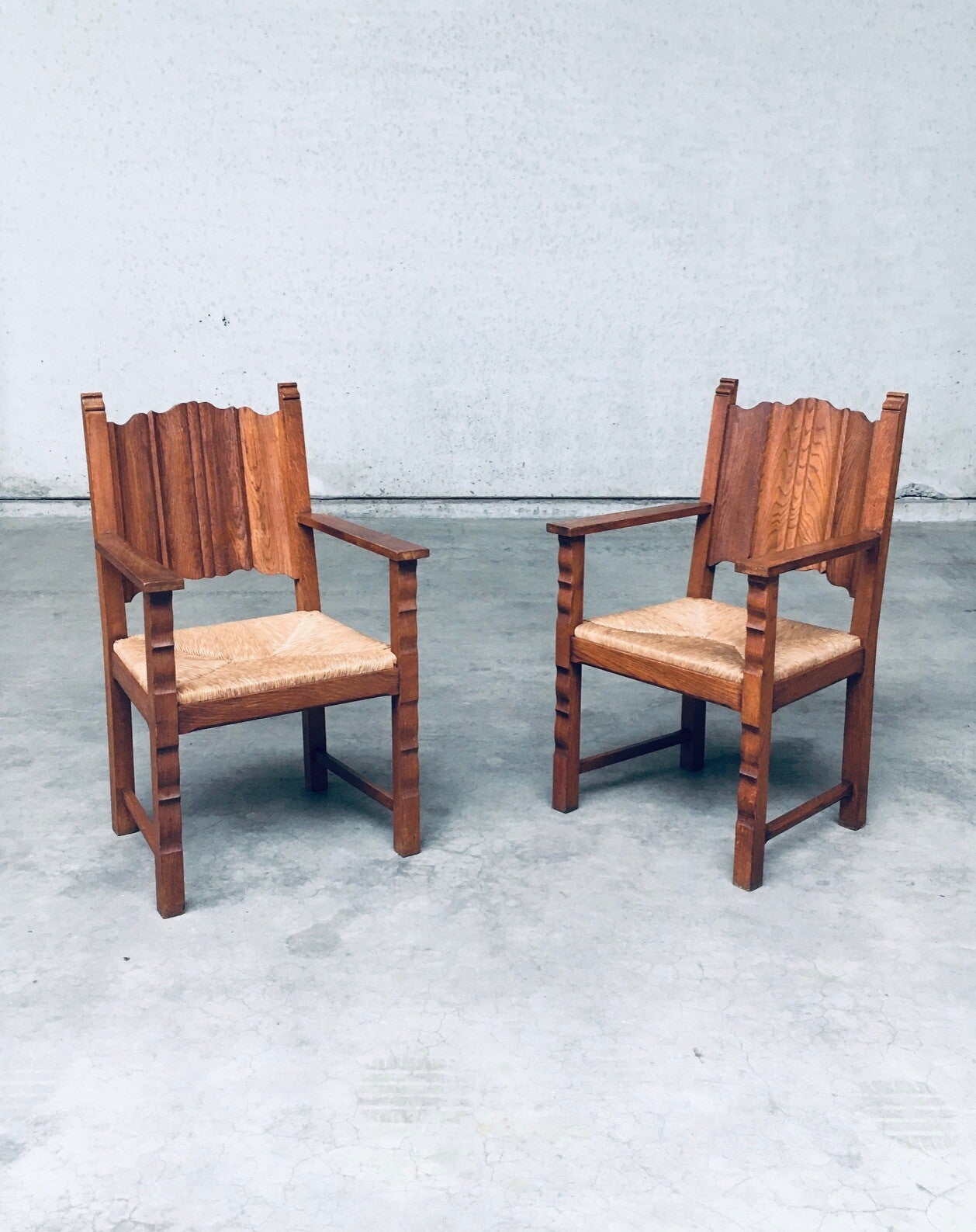 Original Rustic Travail Populaire Oak & Rush Arm Chair set of 2. Made in Belgium, 1960's period. Solid oak constructed armchair with rush woven seat. Well made, sturdy and large armchairs. They both come in very good condition with minor signs of their use and age. Each measures 100cm x 61cm x 57cm. Seat height measures 46cm.