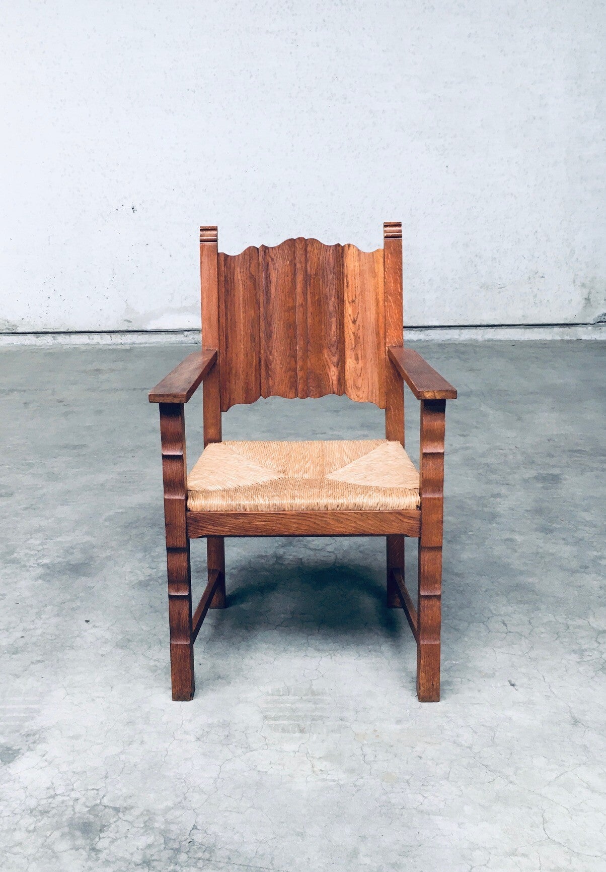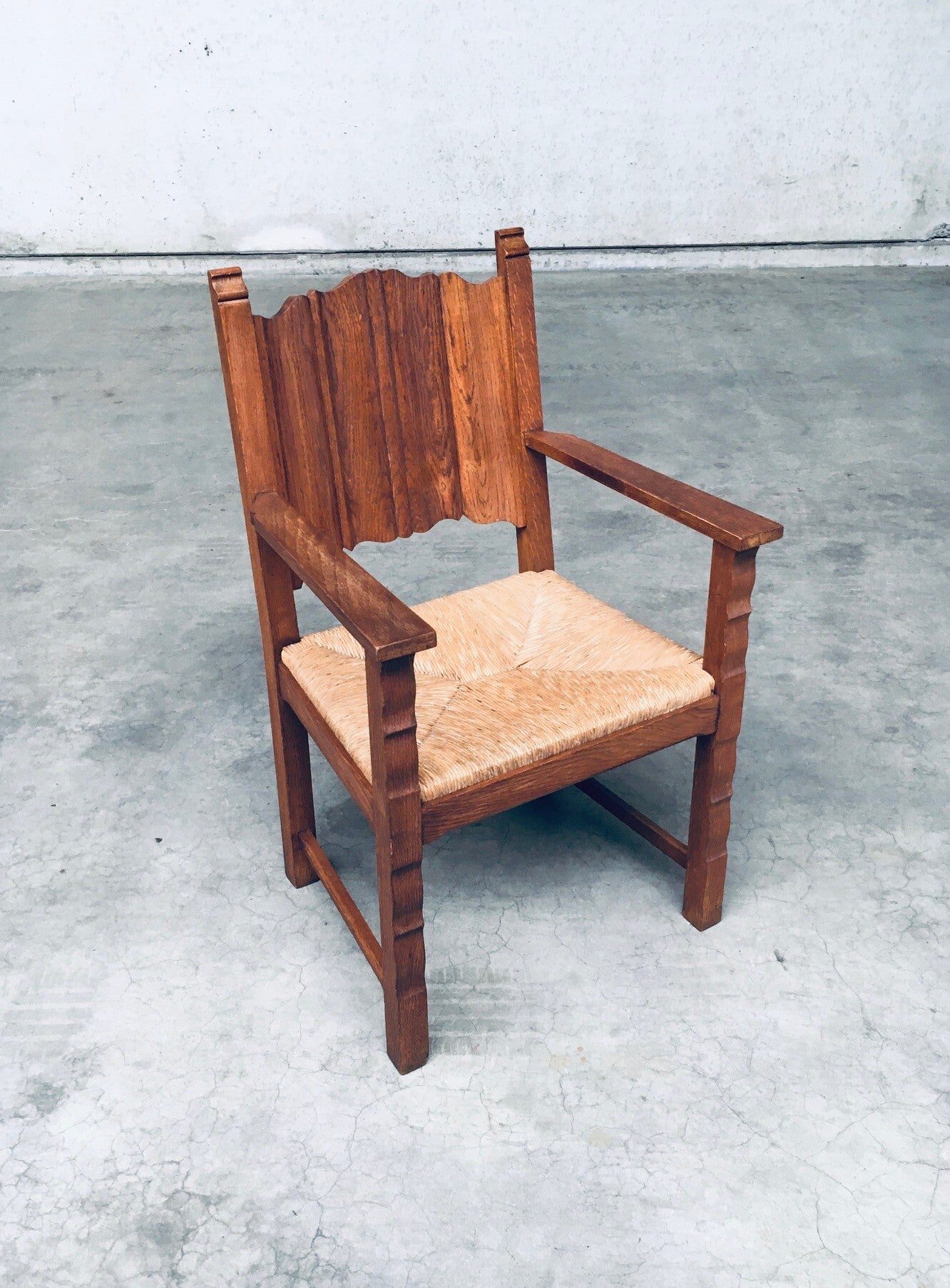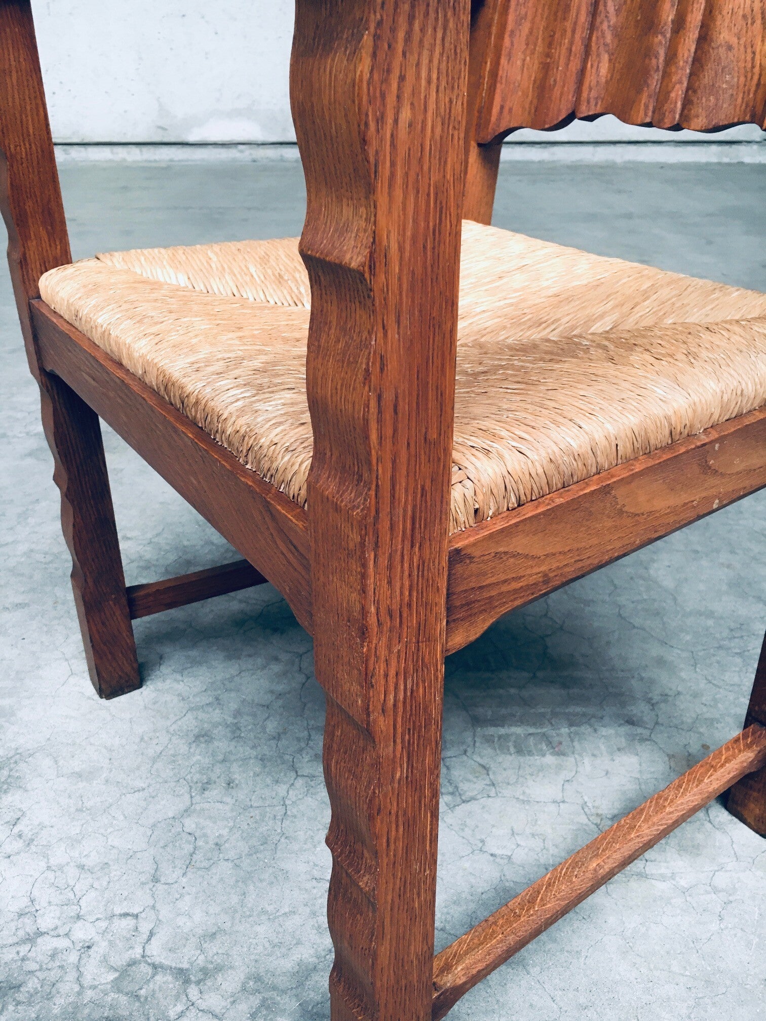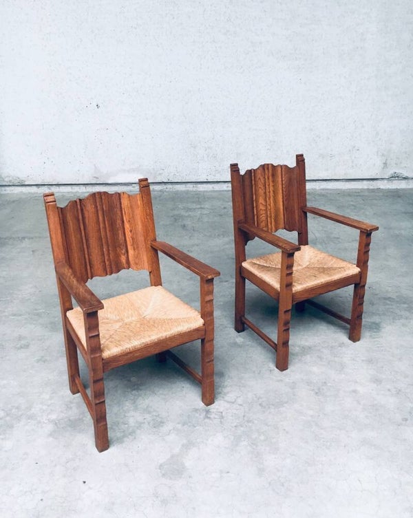 Original Rustic Travail Populaire Oak & Rush Arm Chair set of 2. Made in Belgium, 1960's period. Solid oak constructed armchair with rush woven seat. Well made, sturdy and large armchairs. They both come in very good condition with minor signs of their use and age. Each measures 100cm x 61cm x 57cm. Seat height measures 46cm.