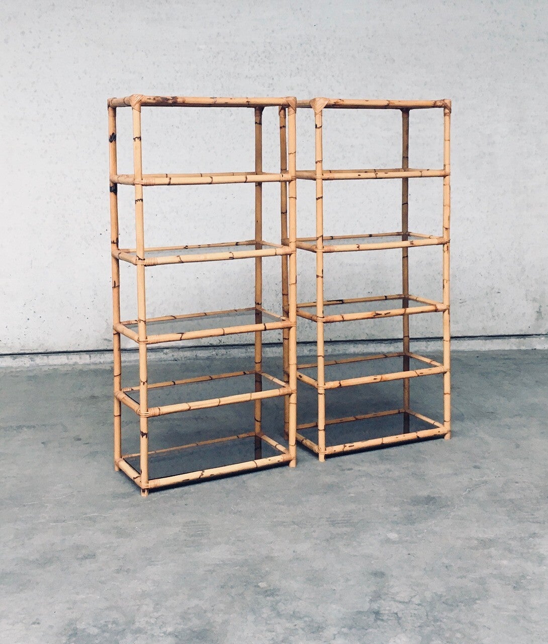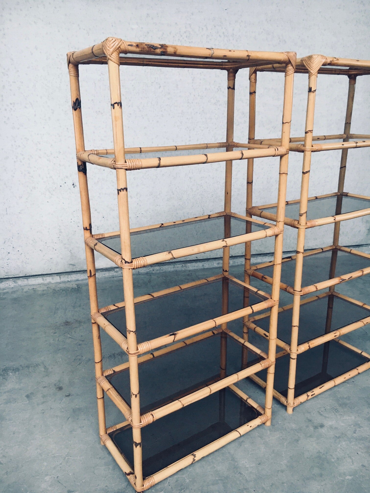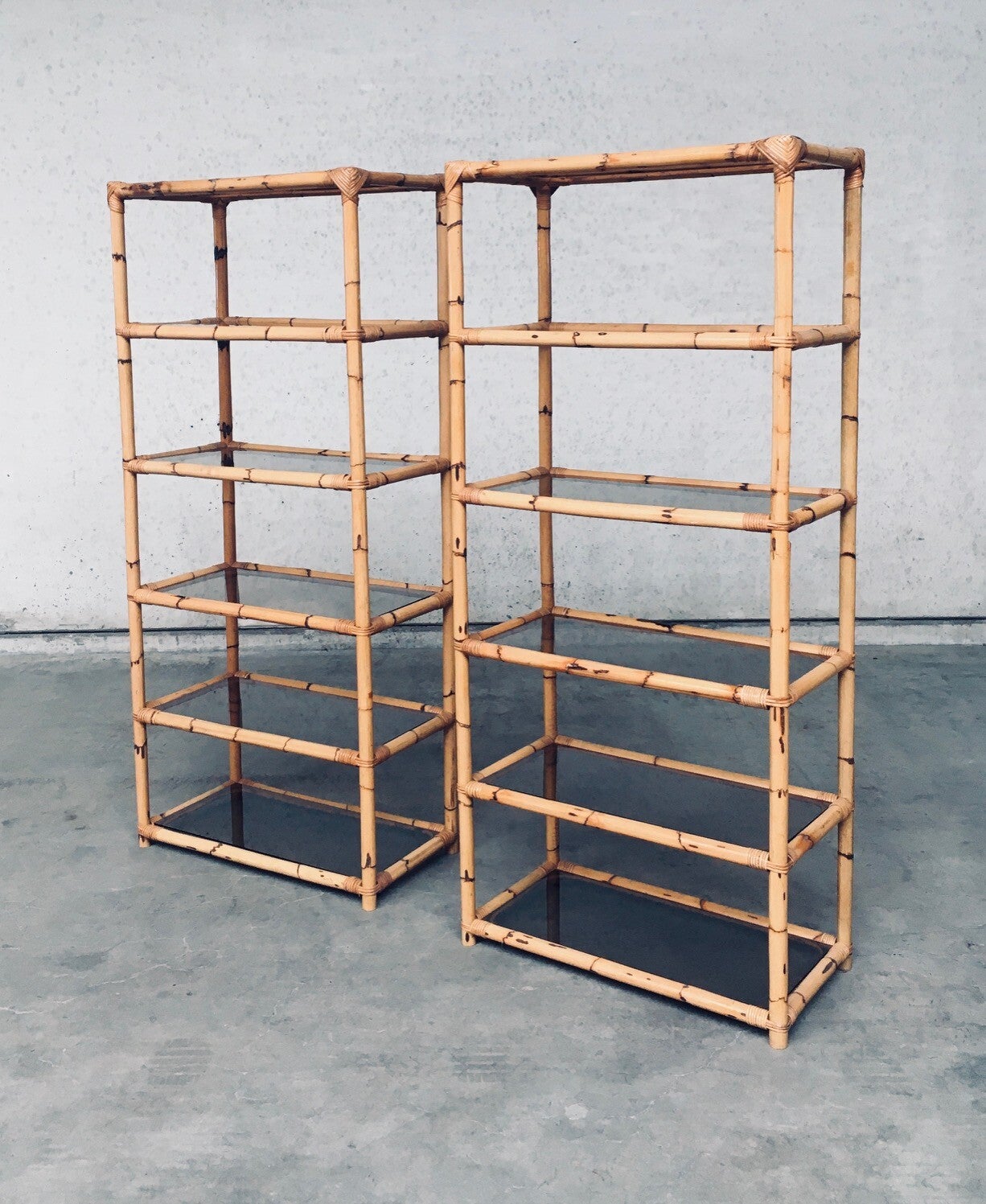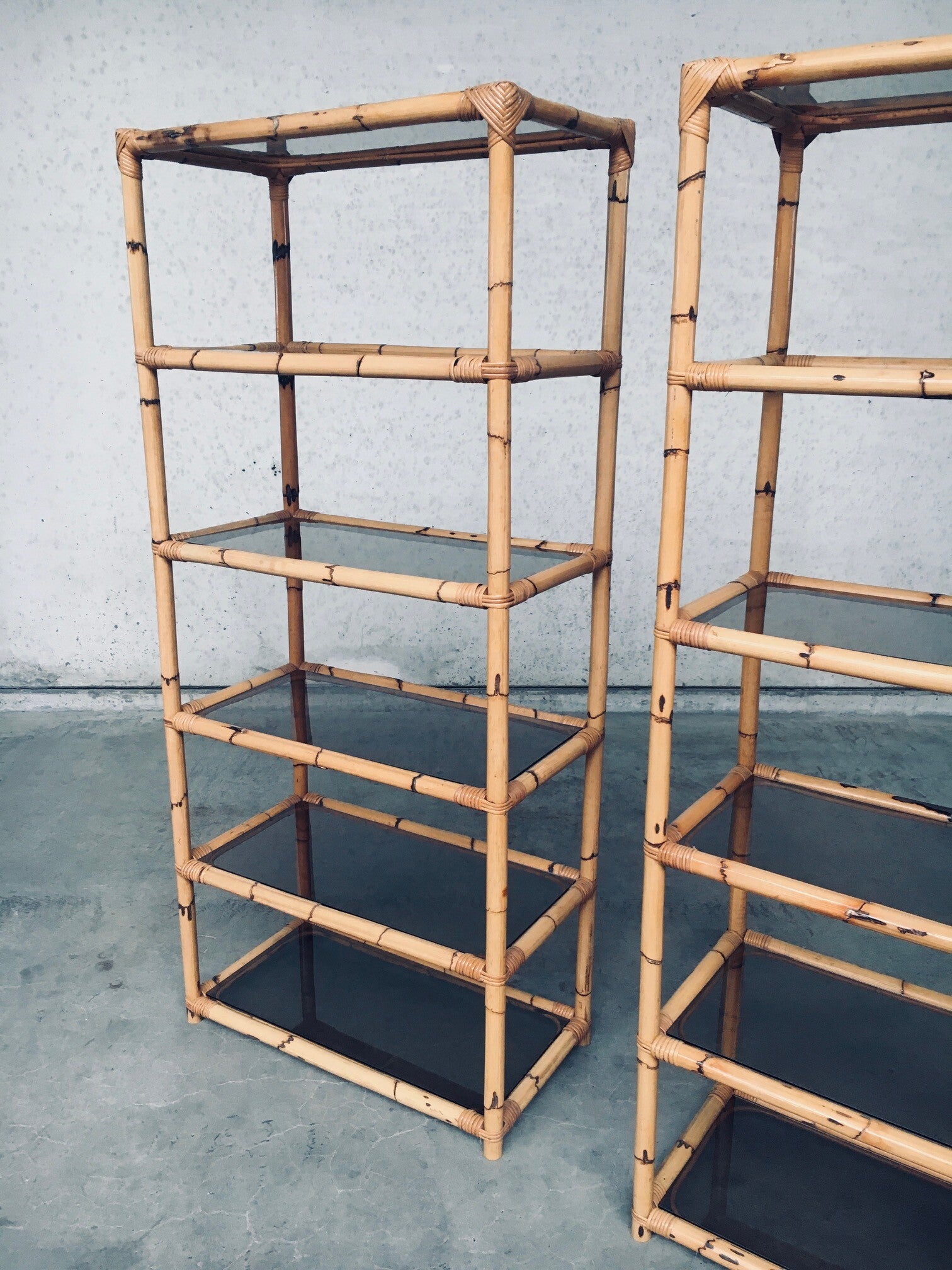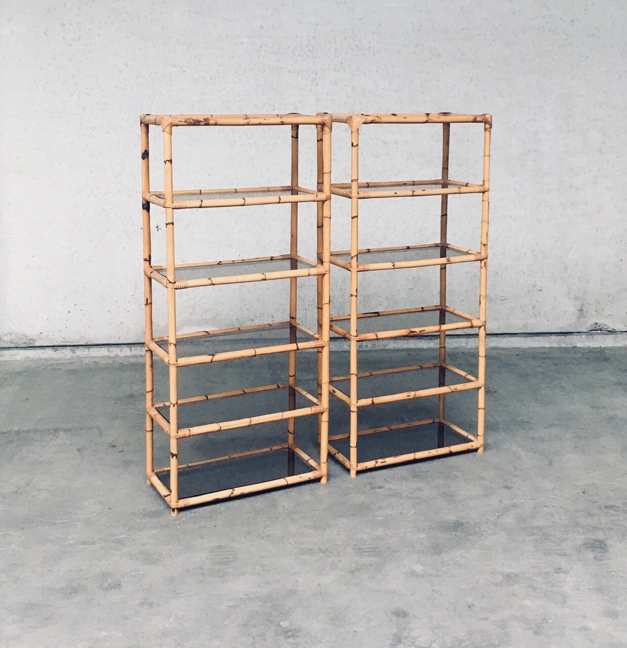 Vintage Boho Style Design Bamboo Shelving Unit Set of 2. Made in Italy, 1960's / 70's period. All bamboo constructed frame with brown smoke glass inlay shelves. Can be used a bookcase or display unit. Both are in very good, all original condition with minor wear from their use and age. Each measures 185cm x 83cm x 43cm.