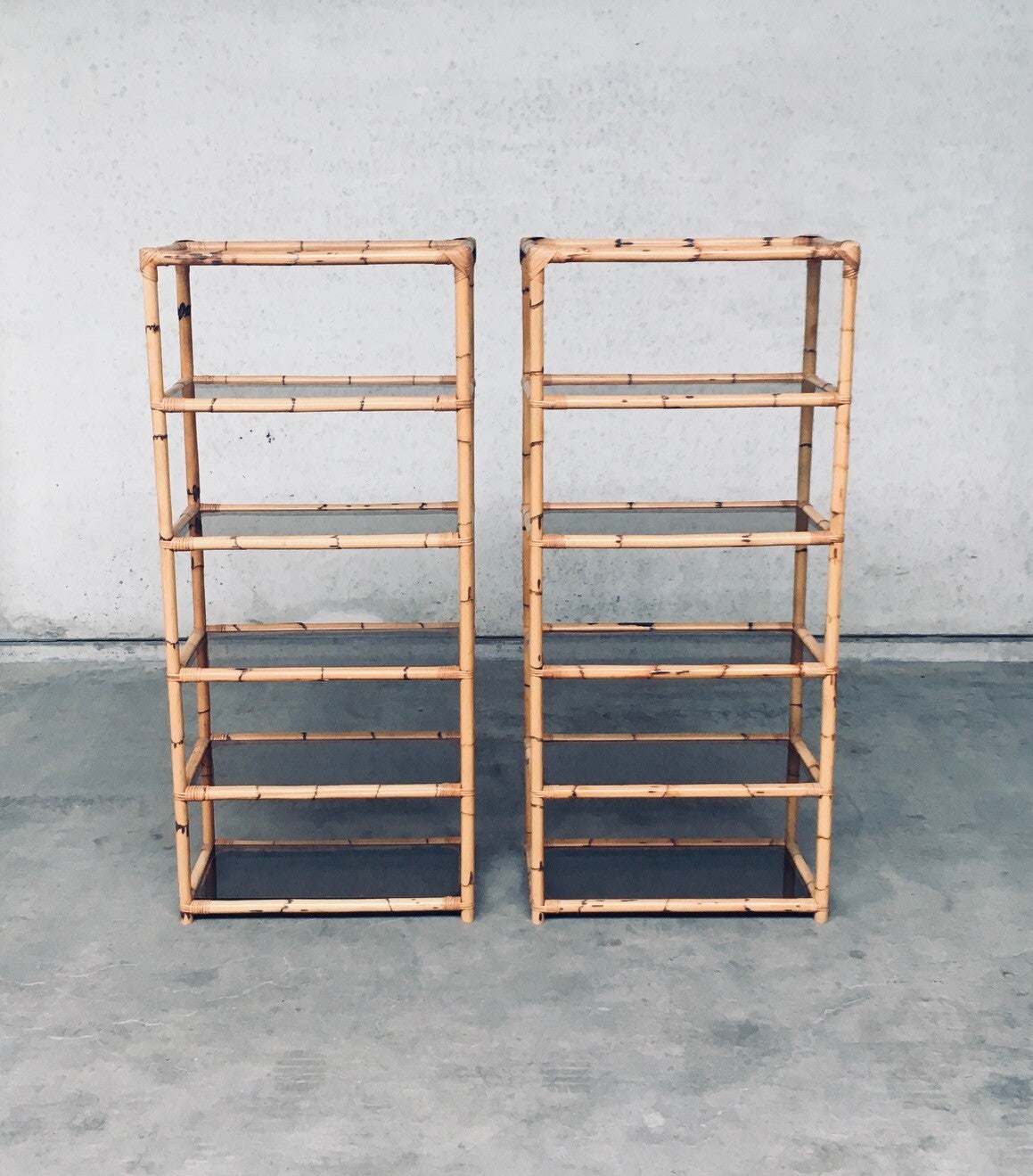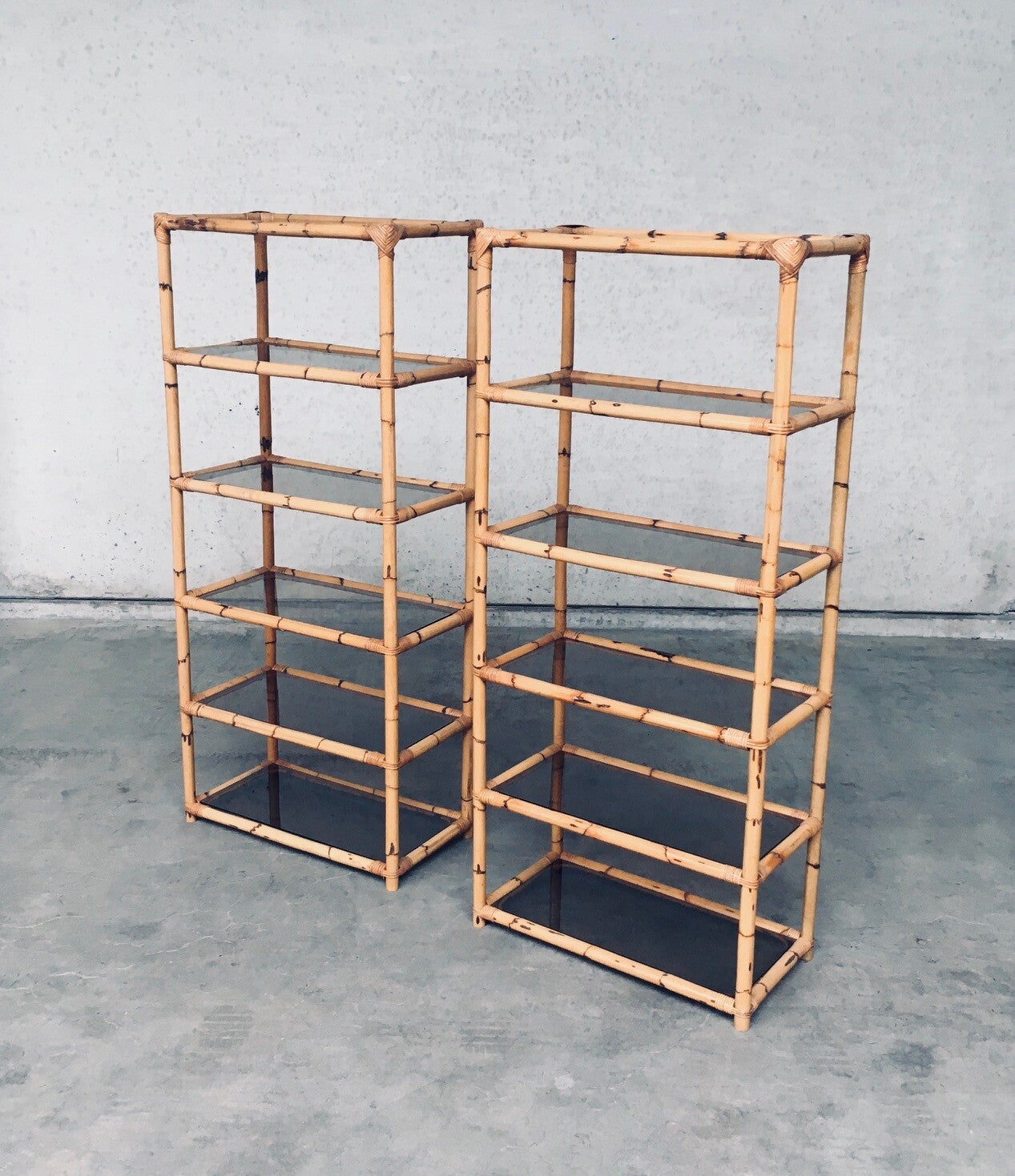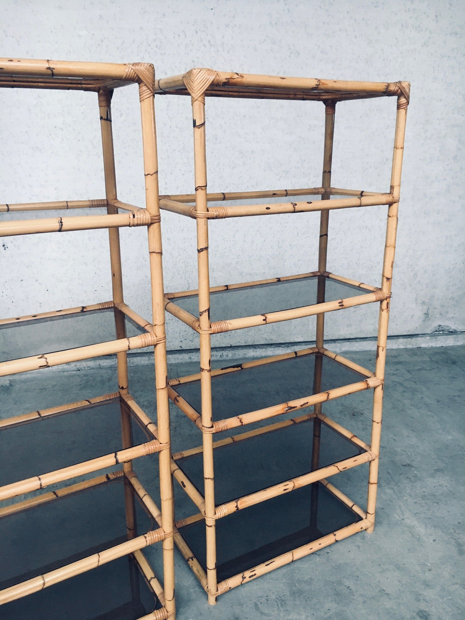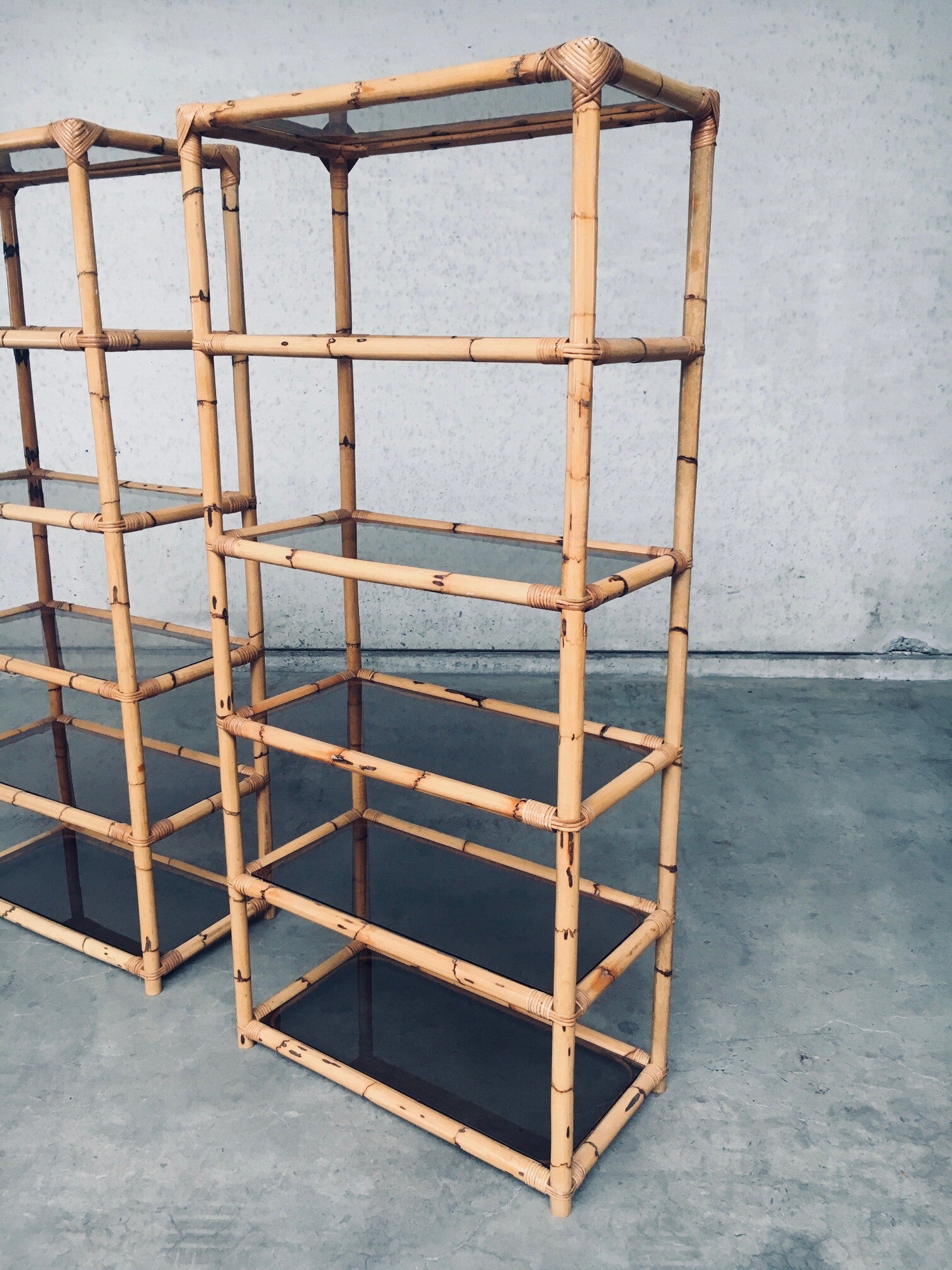Vintage Boho Style Design Bamboo Shelving Unit Set of 2. Made in Italy, 1960's / 70's period. All bamboo constructed frame with brown smoke glass inlay shelves. Can be used a bookcase or display unit. Both are in very good, all original condition with minor wear from their use and age. Each measures 185cm x 83cm x 43cm.