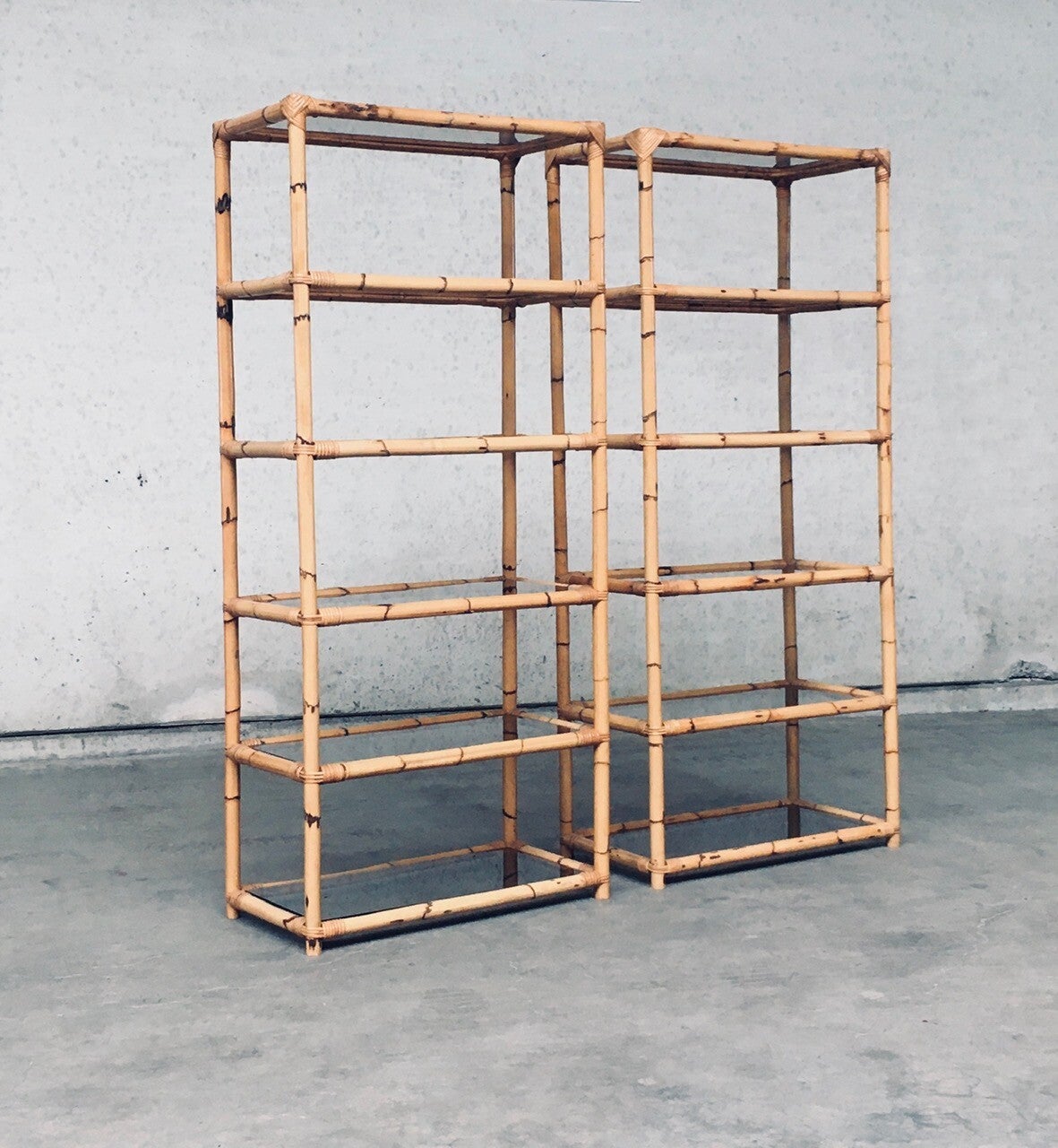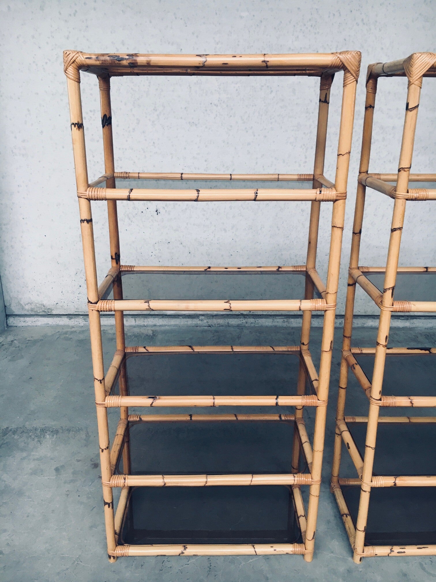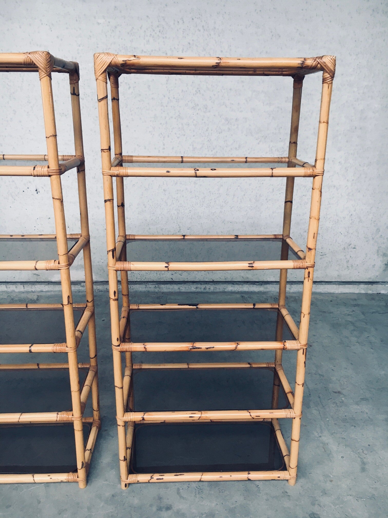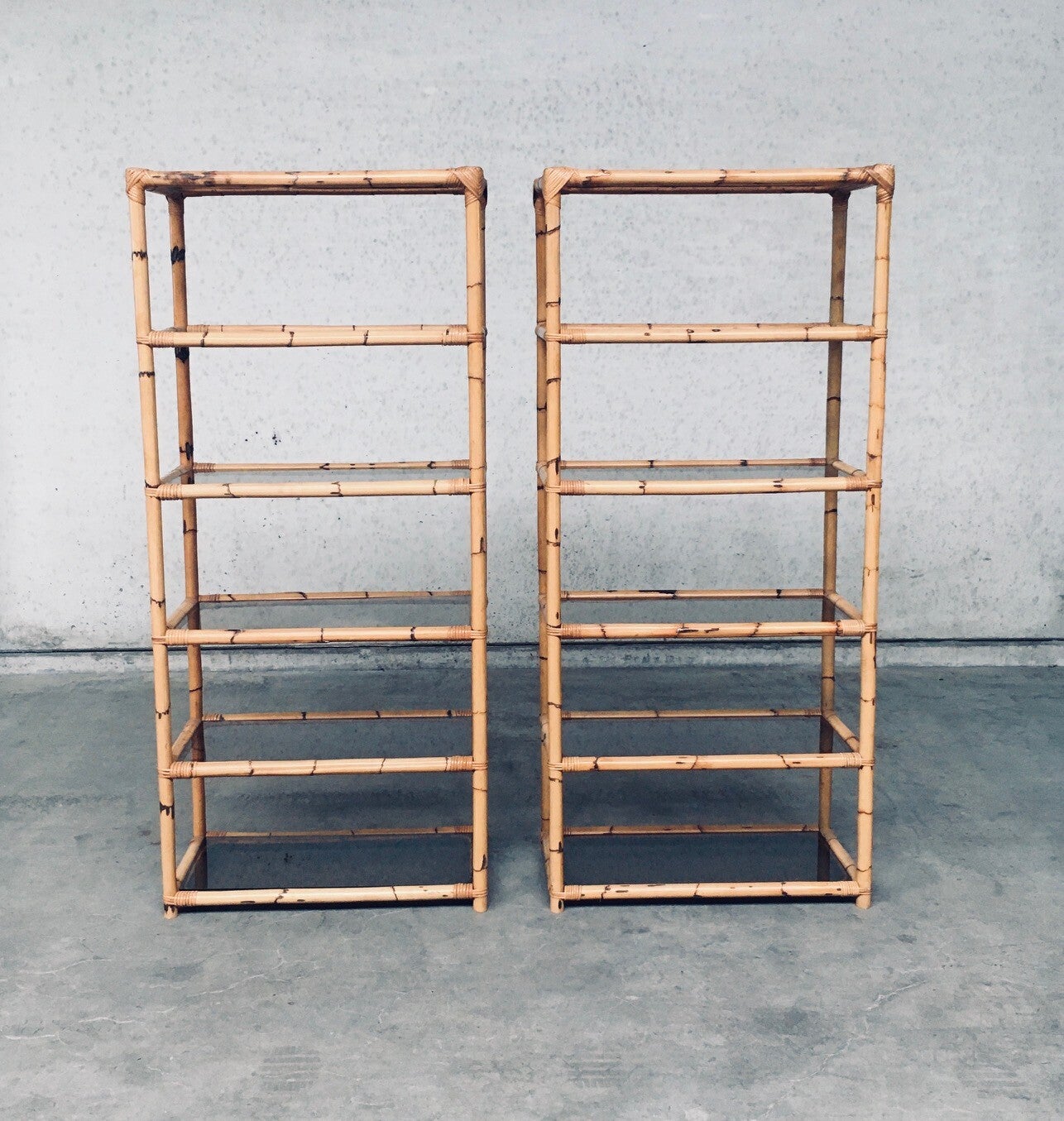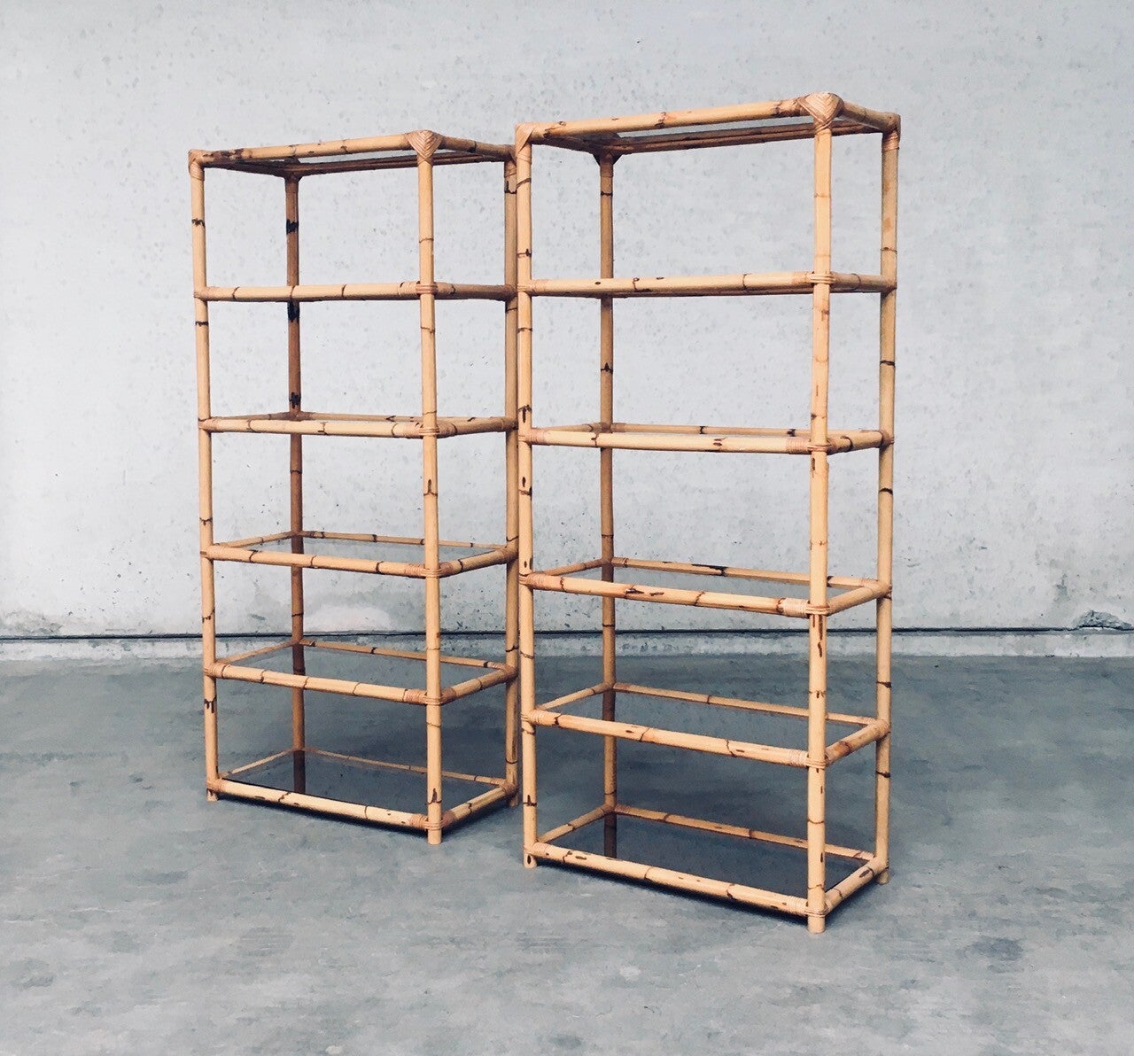 Vintage Boho Style Design Bamboo Shelving Unit Set of 2. Made in Italy, 1960's / 70's period. All bamboo constructed frame with brown smoke glass inlay shelves. Can be used a bookcase or display unit. Both are in very good, all original condition with minor wear from their use and age. Each measures 185cm x 83cm x 43cm.