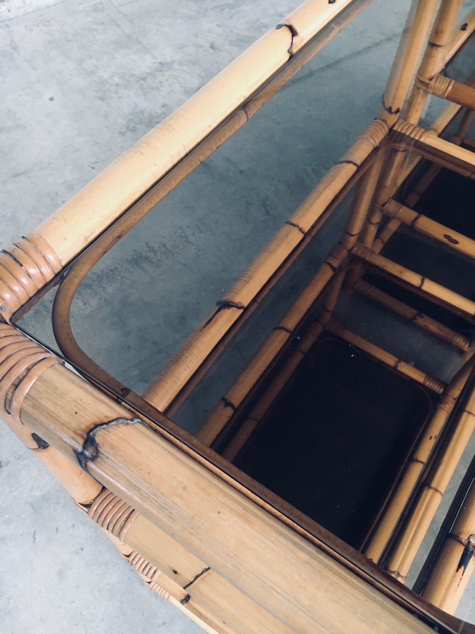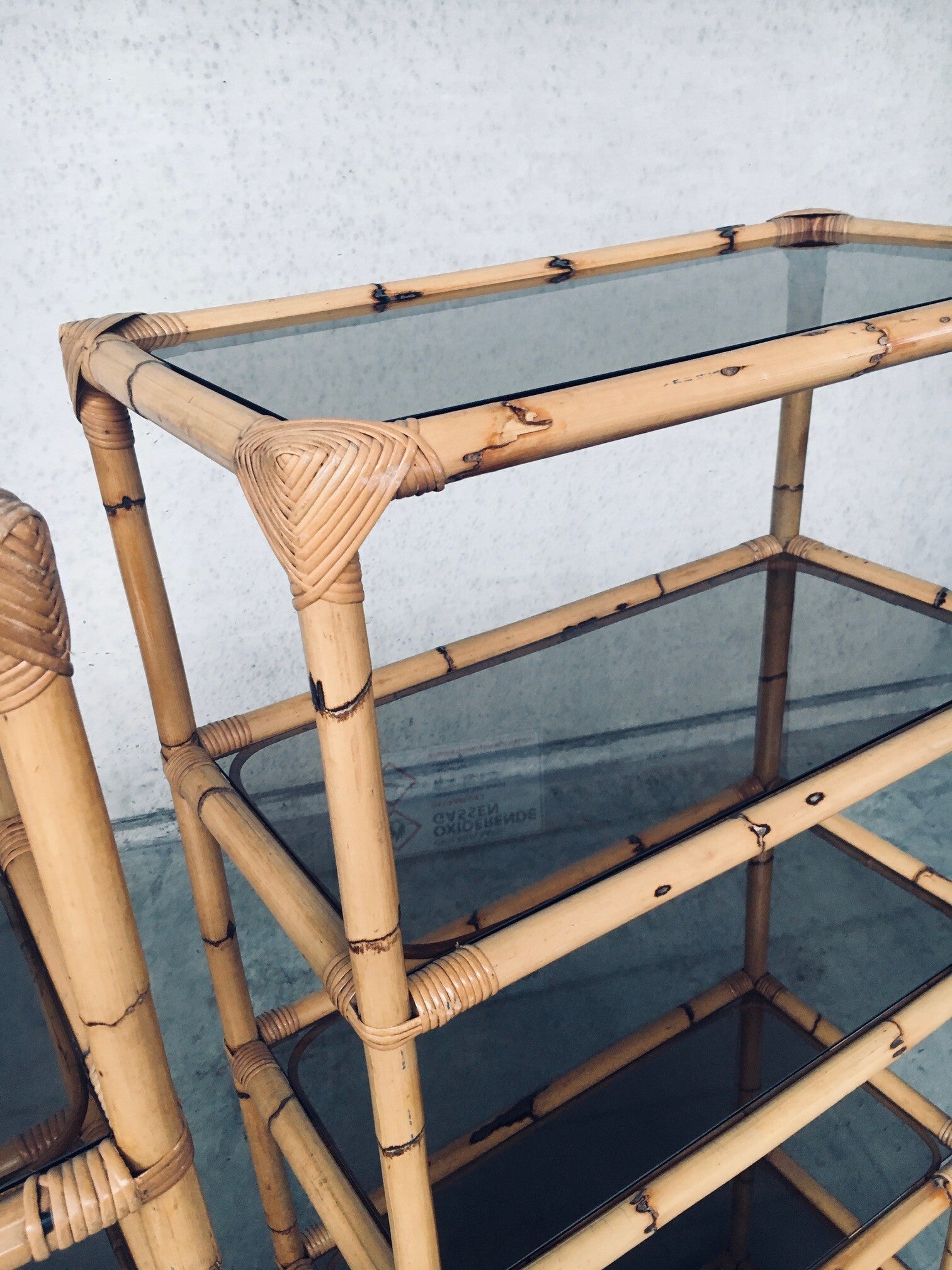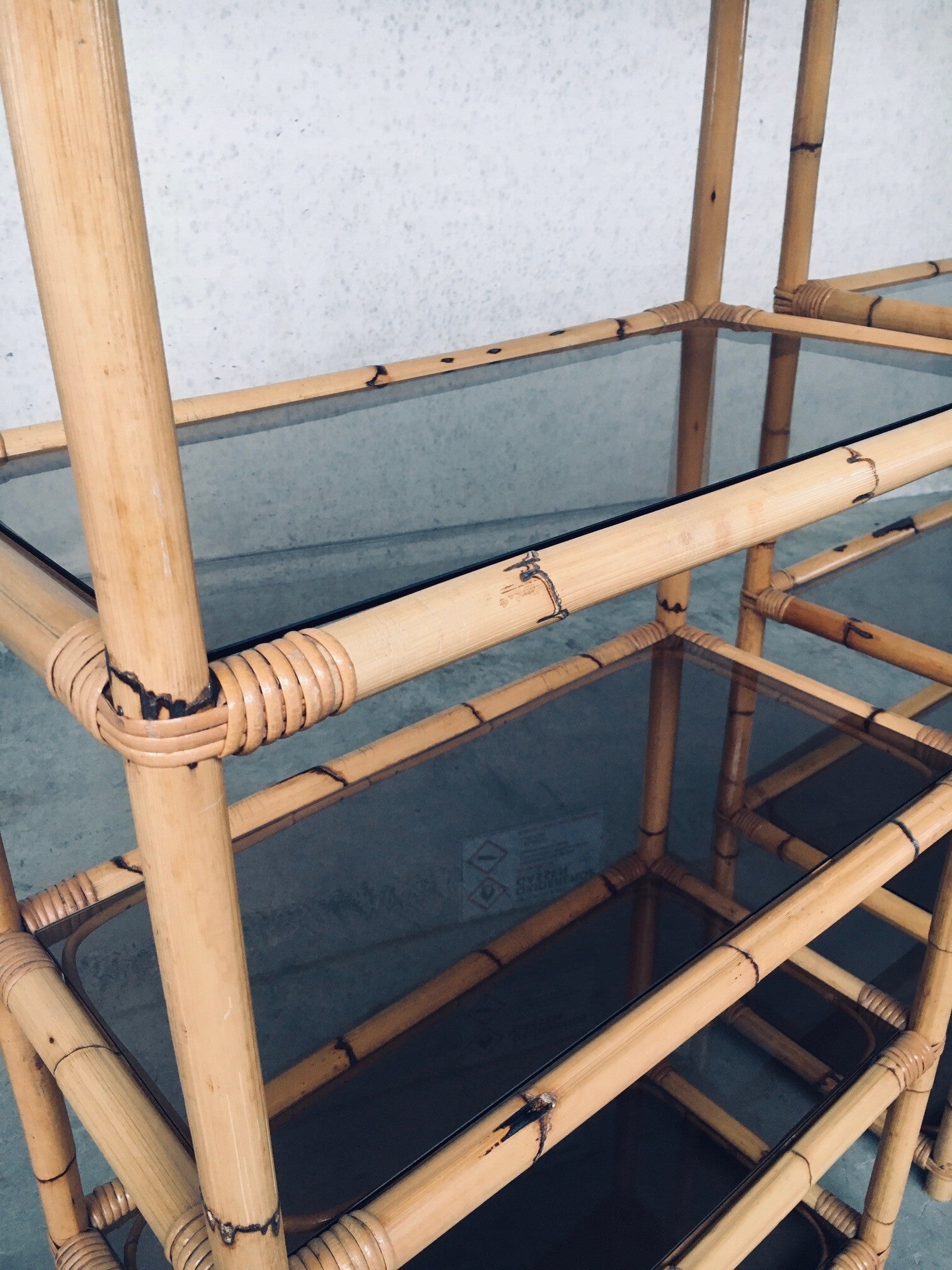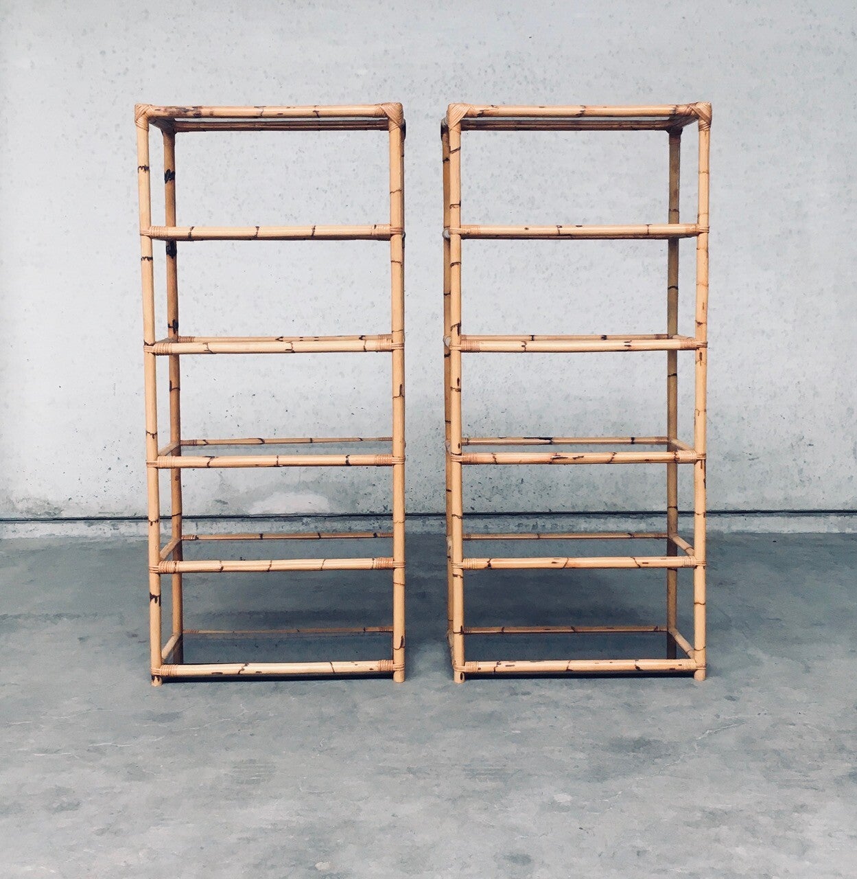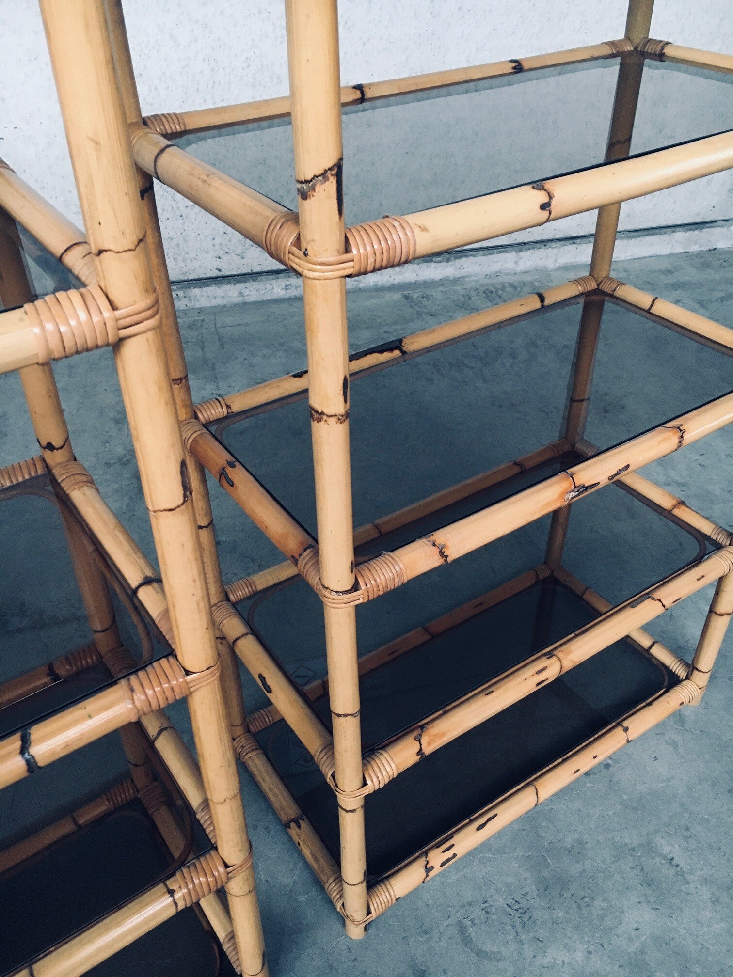 Vintage Boho Style Design Bamboo Shelving Unit Set of 2. Made in Italy, 1960's / 70's period. All bamboo constructed frame with brown smoke glass inlay shelves. Can be used a bookcase or display unit. Both are in very good, all original condition with minor wear from their use and age. Each measures 185cm x 83cm x 43cm.