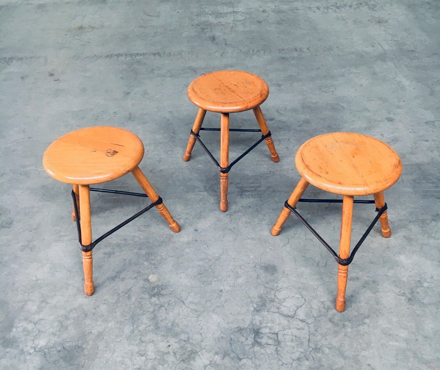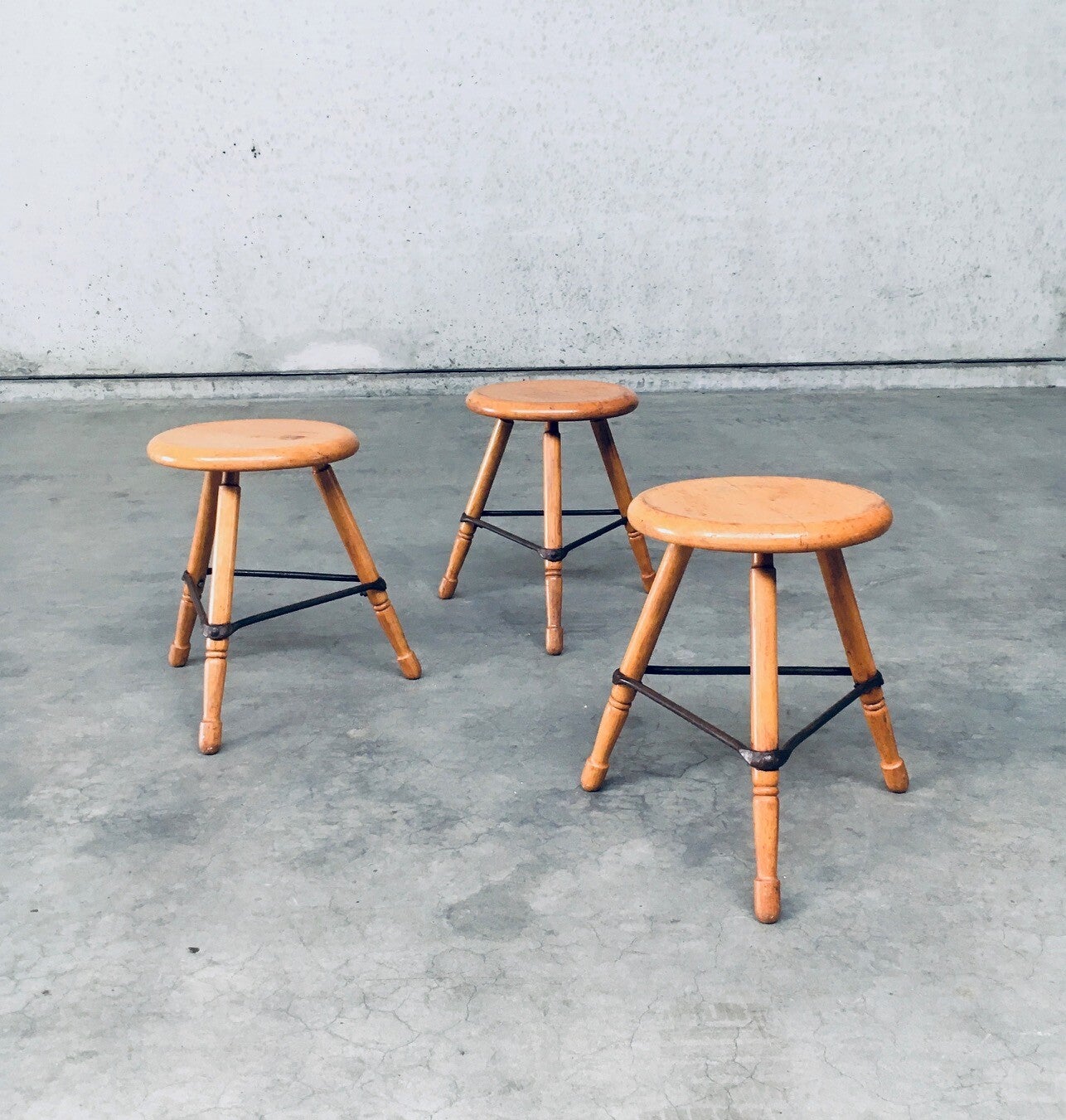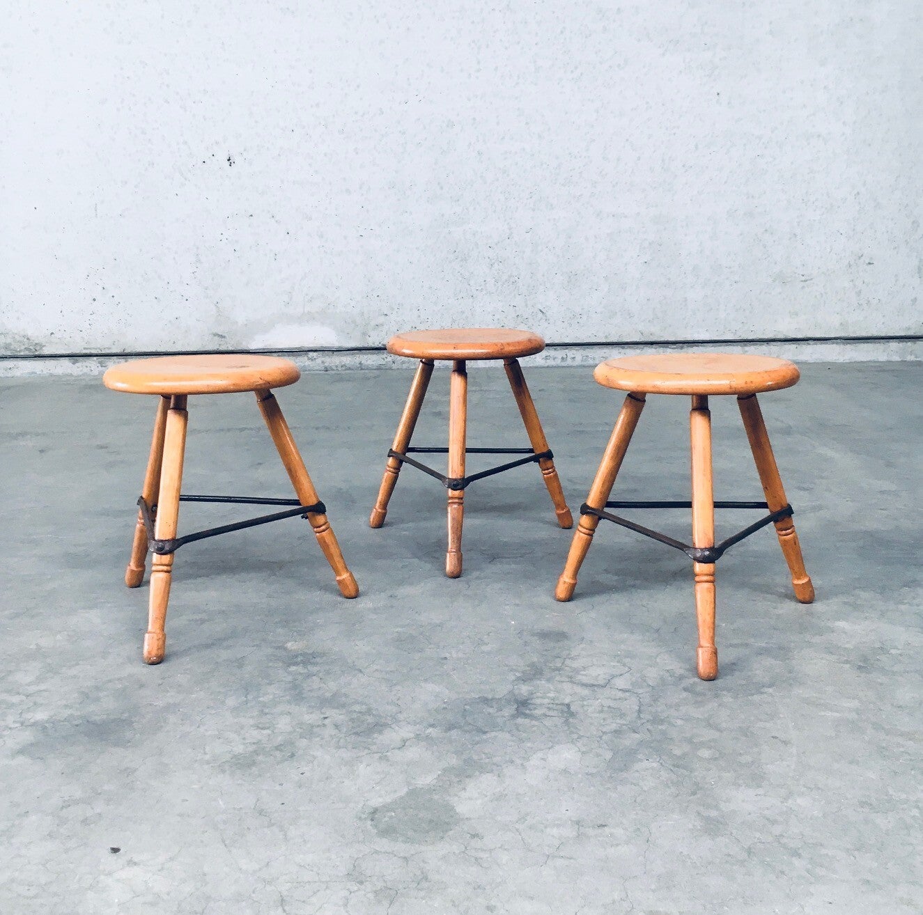 Vintage Midcentury Industrial Design Low Tripod Stool set of 3. Made in Belgium, 1950's period. Marked D.L.O. on the bottom of one stool. Solid beech wood construction with iron border strenghtening strip. The legs are nicely turned and the seats are shaped with rounded edges for ease of use and comfort. Beautiful in it's simplicity. they all show signs of their age and use. All are in good, original condition. Each measures 47cm x 47cm x 47cm.
