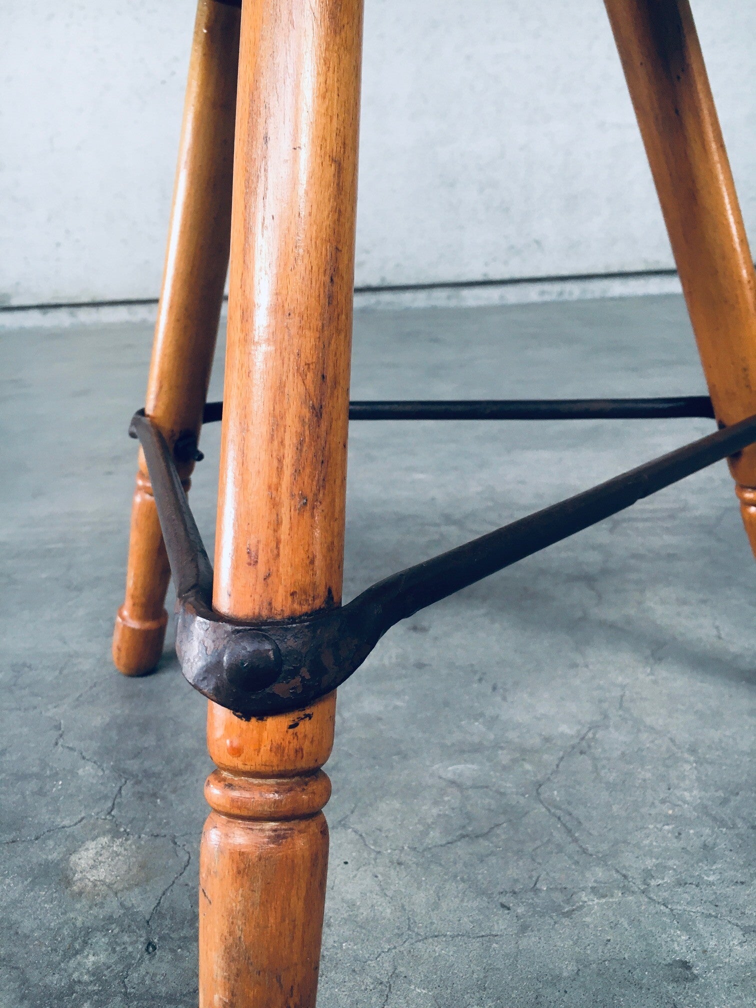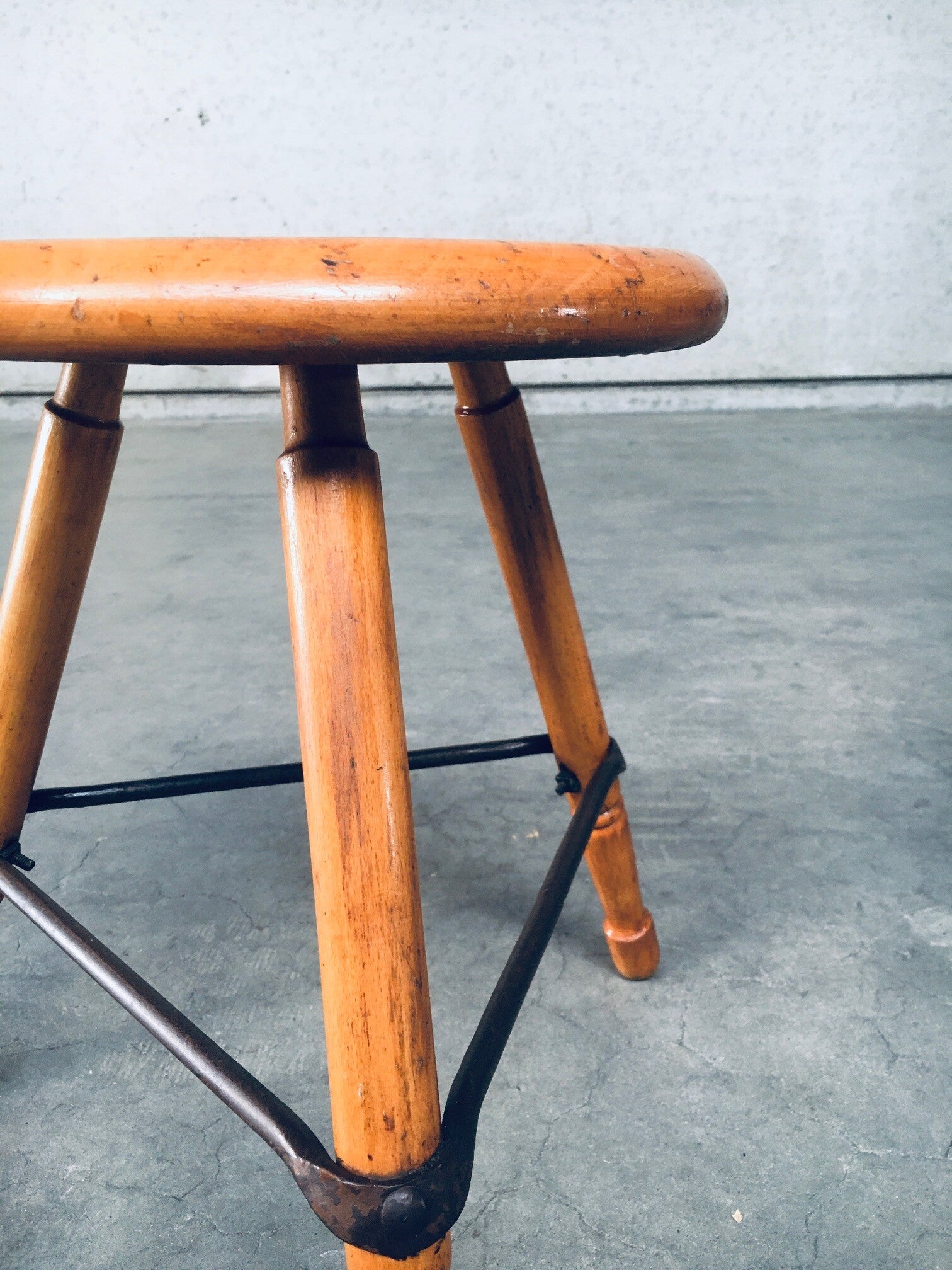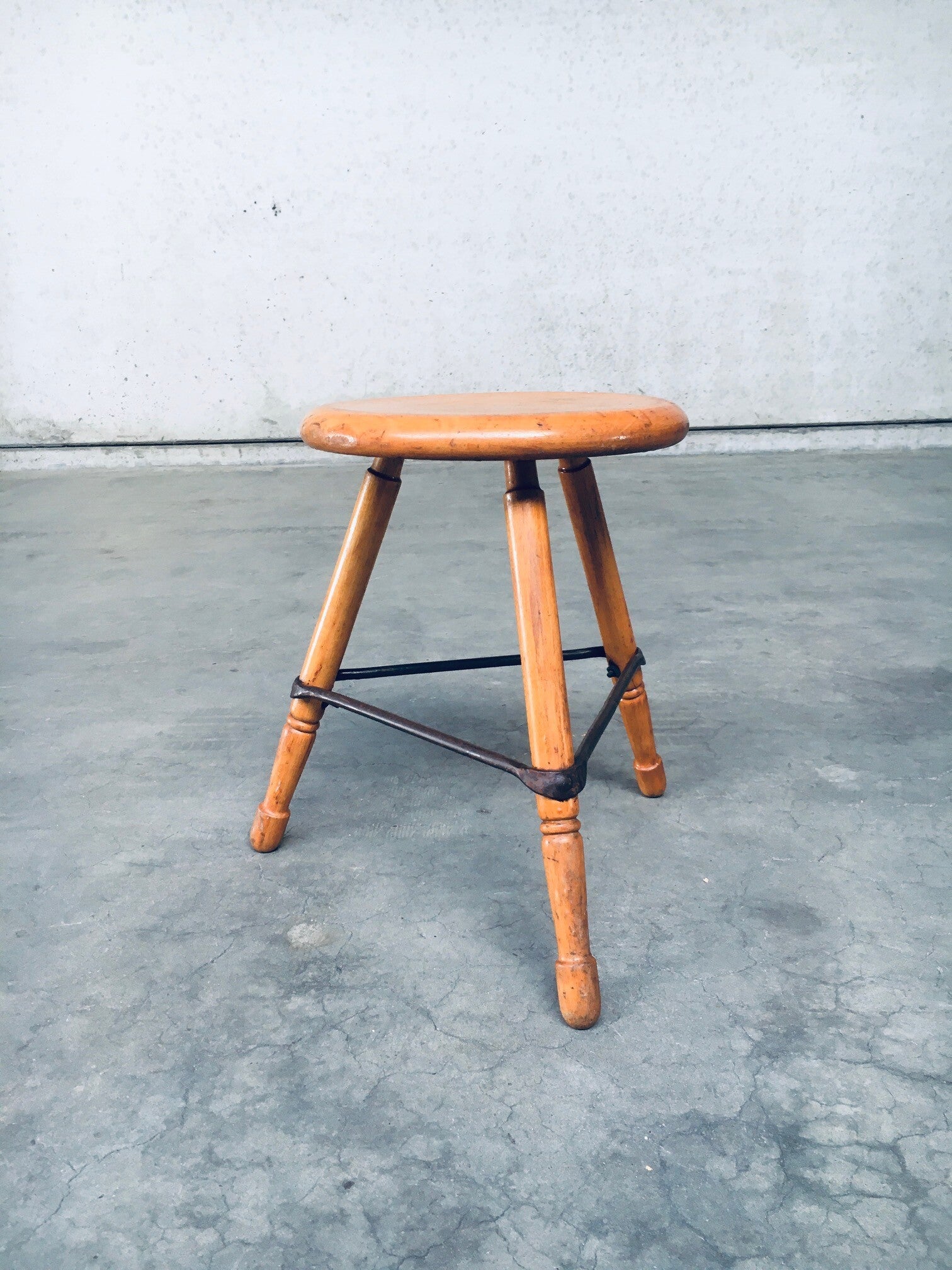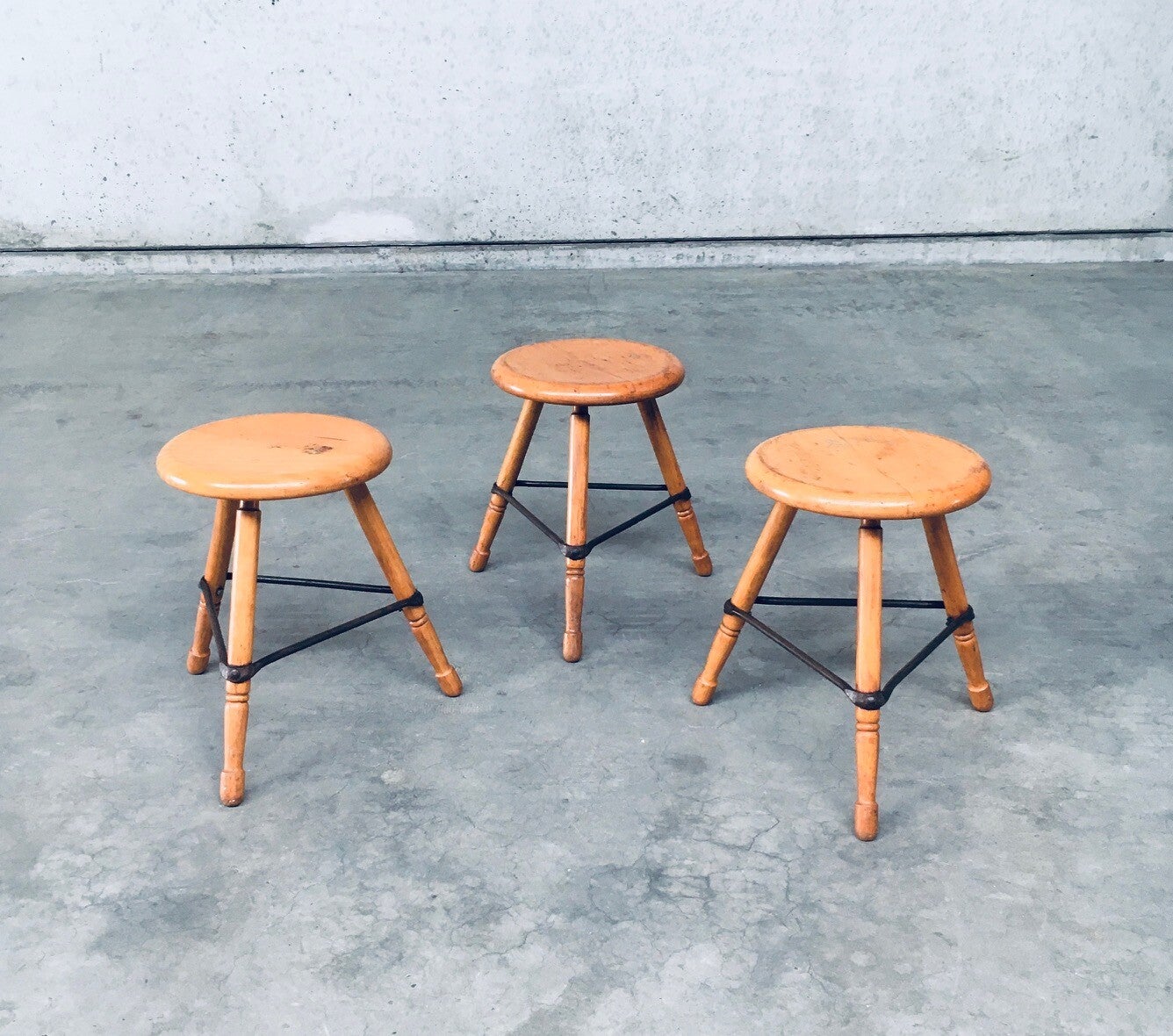 Vintage Midcentury Industrial Design Low Tripod Stool set of 3. Made in Belgium, 1950's period. Marked D.L.O. on the bottom of one stool. Solid beech wood construction with iron border strenghtening strip. The legs are nicely turned and the seats are shaped with rounded edges for ease of use and comfort. Beautiful in it's simplicity. they all show signs of their age and use. All are in good, original condition. Each measures 47cm x 47cm x 47cm.