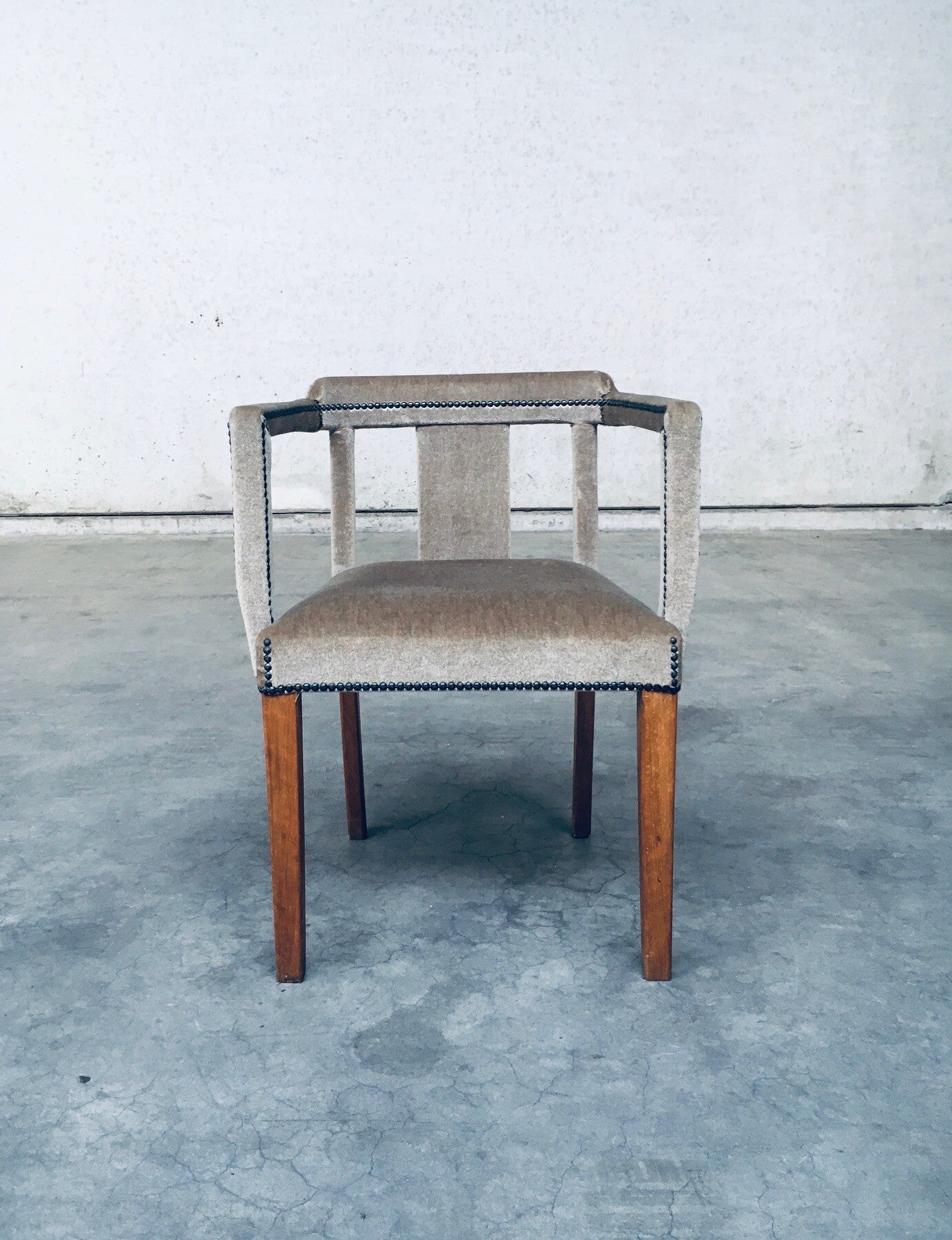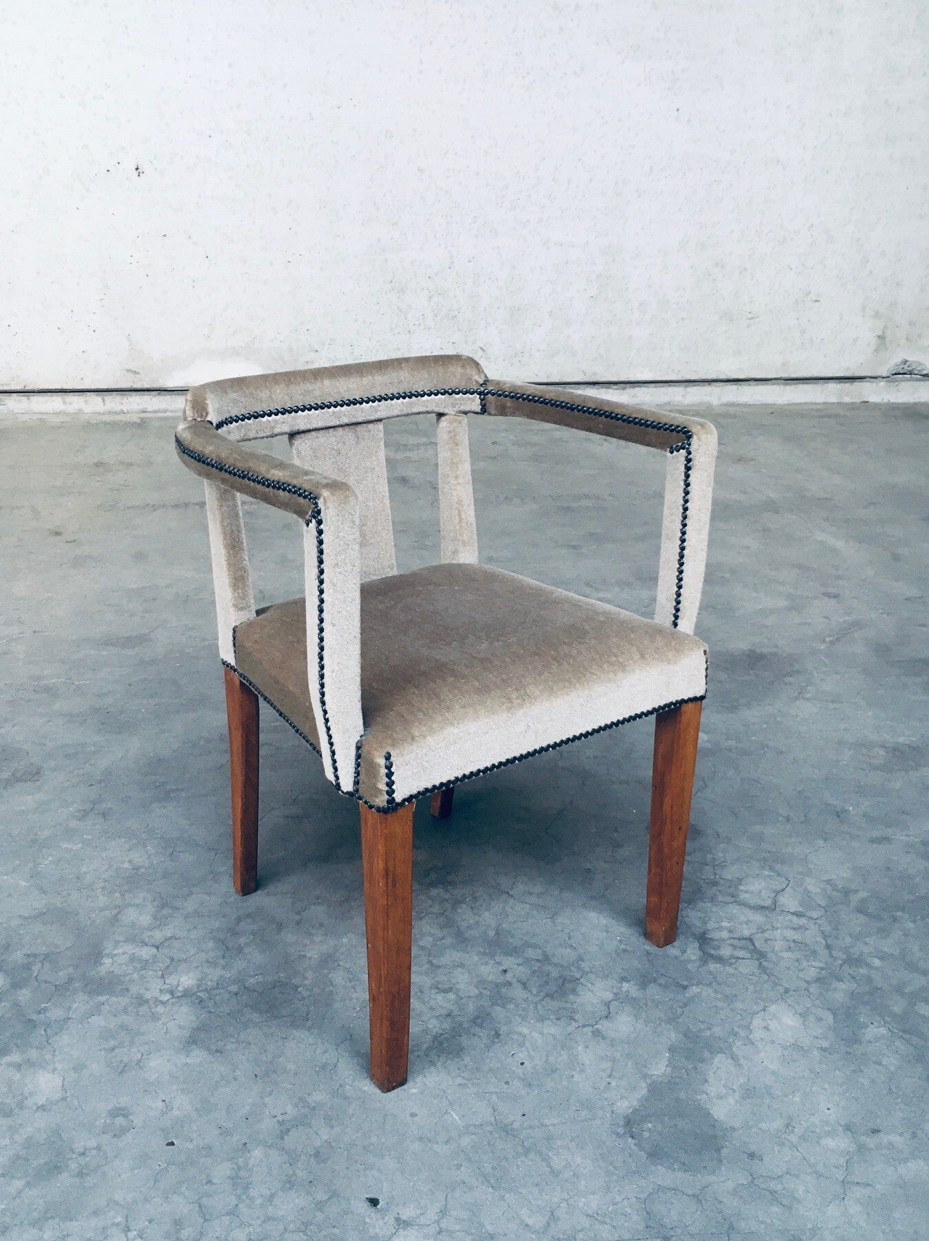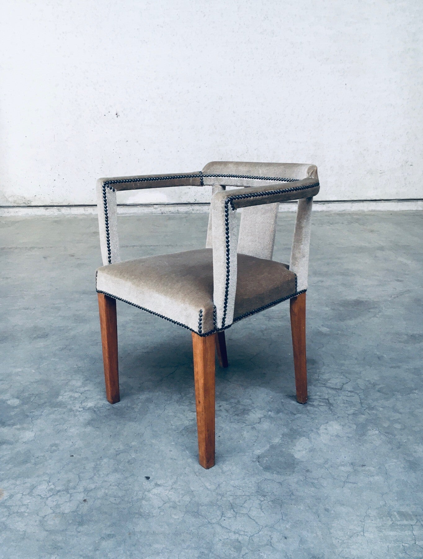 Early 20th Century Boudoir Velvet covered Side Arm Chair. Made in Scandinavia, Sweden, 1920's - 30's period. Teak wood construction with velvet covered seat, armrests and back finished with brass studs. the finish gives this a lush look and feel which fits well in a boudoir, dressing room. This comes in beautiful, very good, all original condition. Measures 75,5cm x 58cm x 47cm - seat height: 48cm.