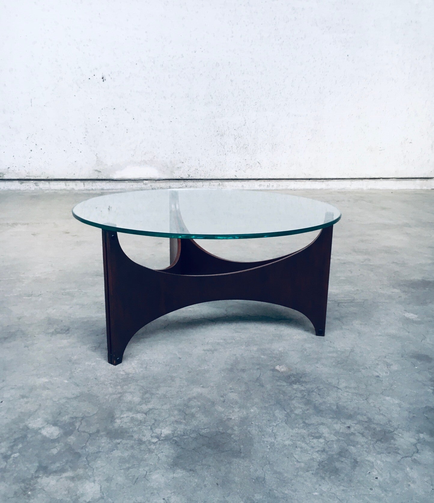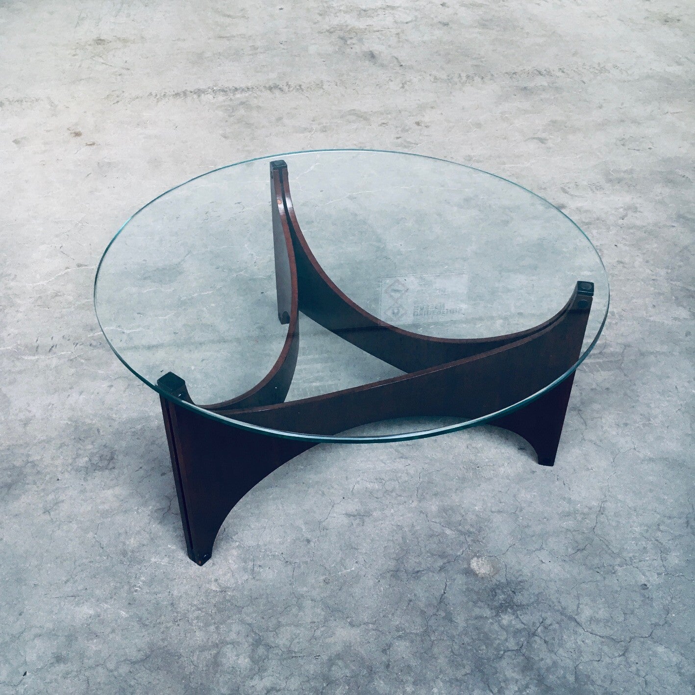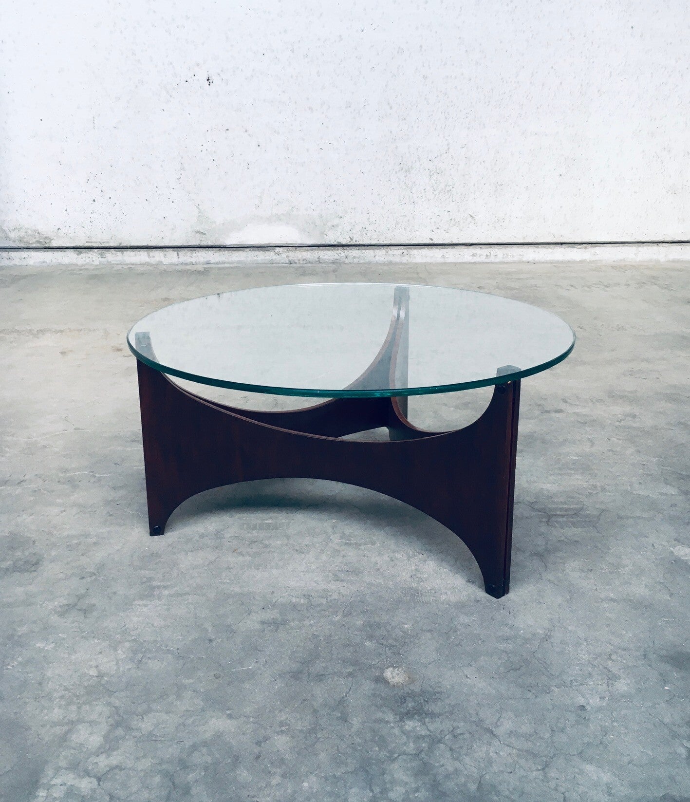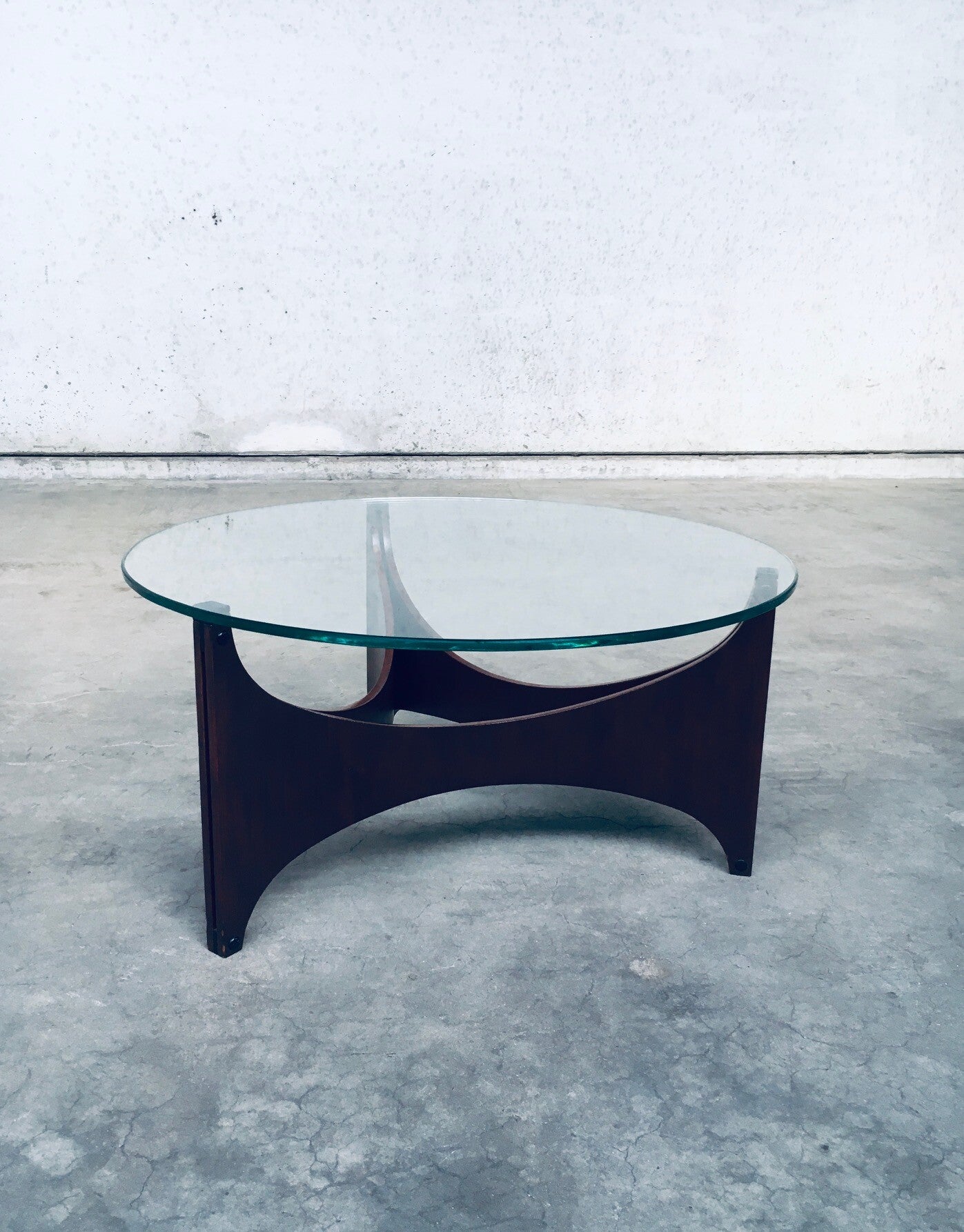 Vintage Midcentury Dutch Space Age Design Tripod Coffee Table by Werner Blaser for Spectrum. Model TZ 75. Made in the Netherlands, 1960's / 1970's period. Bent wood dark stained tripod base with thick round glass top. Well designed and constructed small size coffee table. This comes in very good condition. The glass top has a very small chip on the border and a very small pit in the glass top. This measures 42cm high x 85cm wide x 85cm deep.