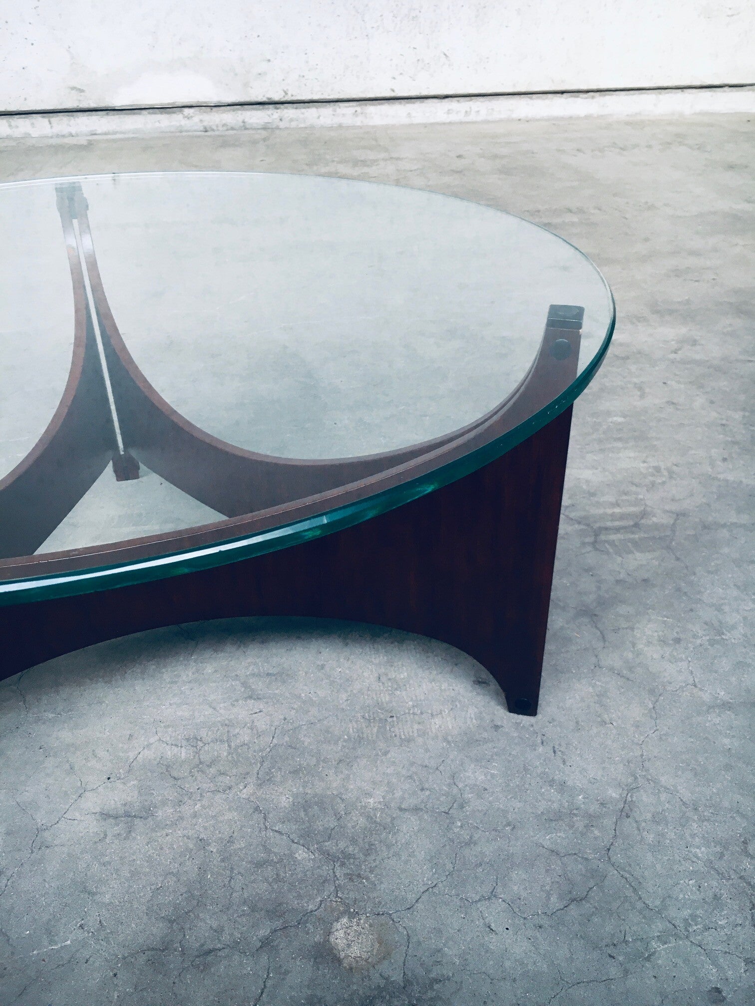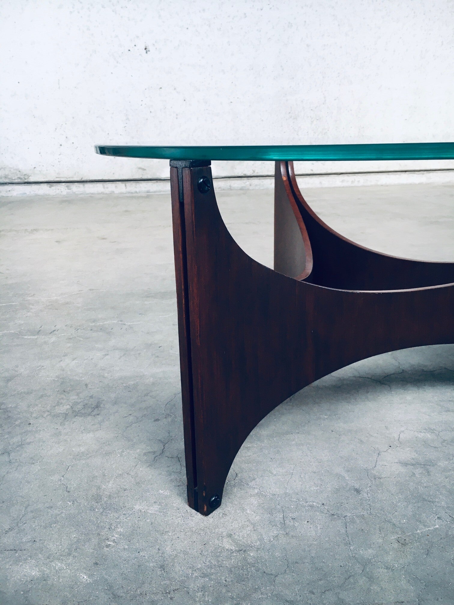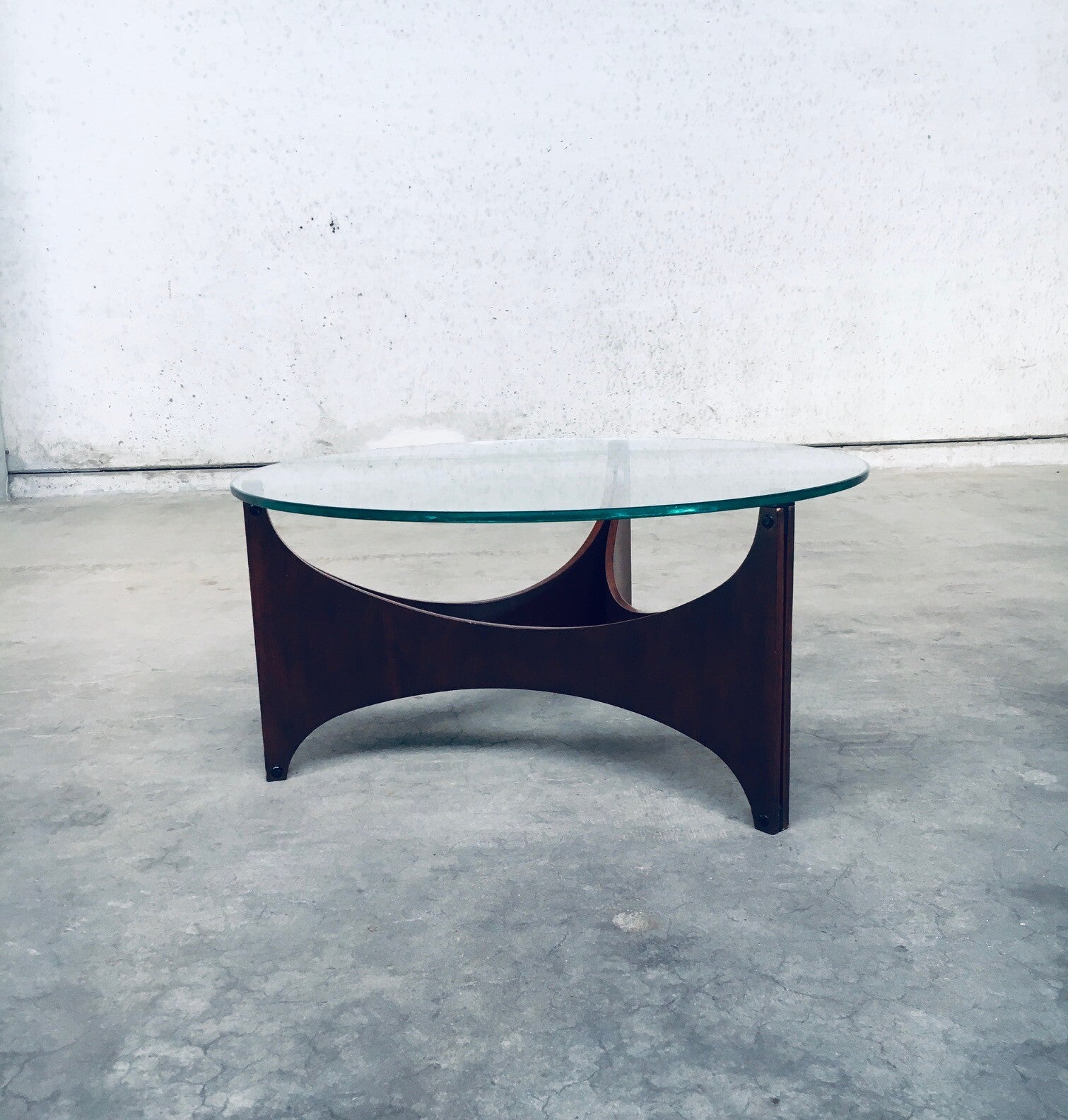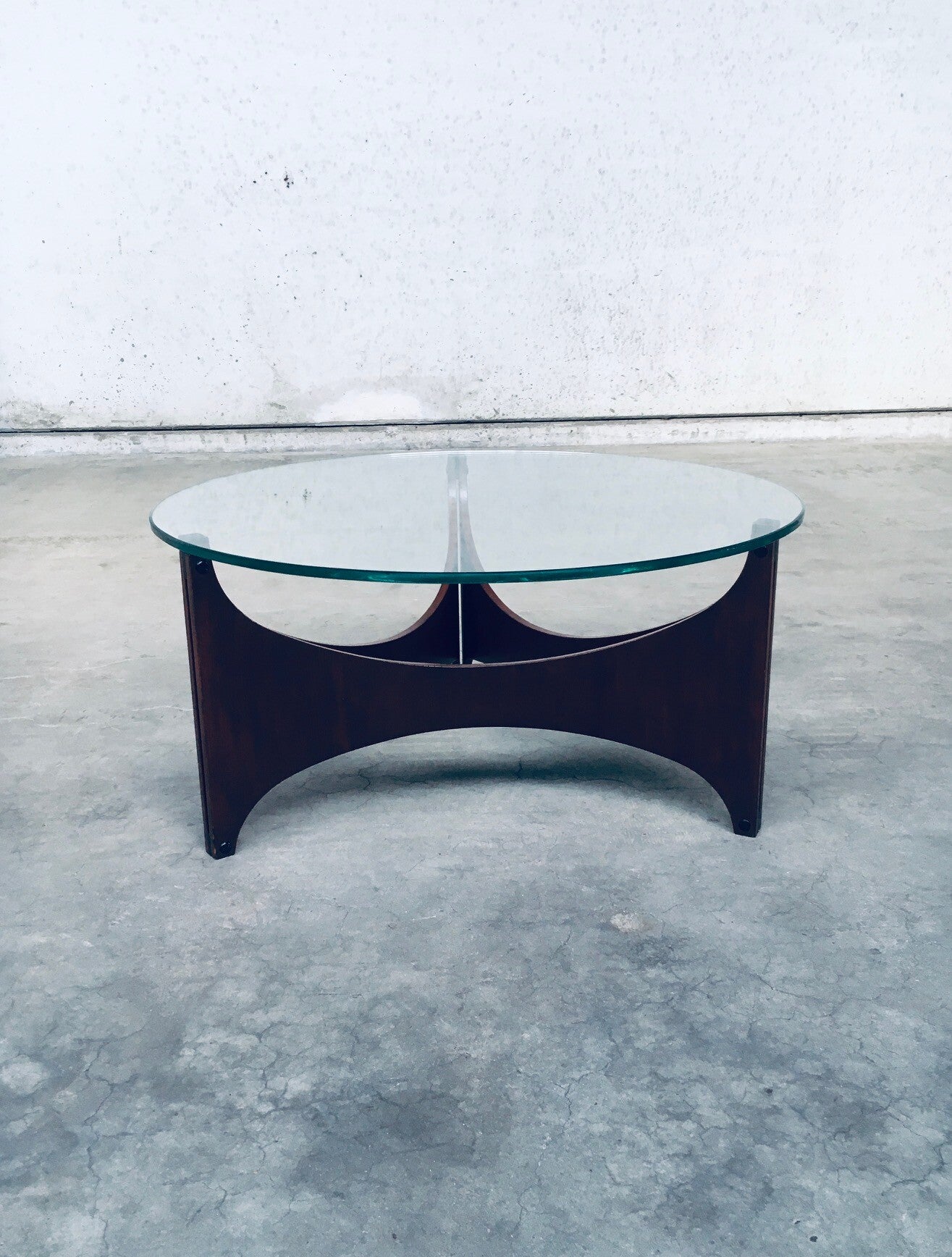 Vintage Midcentury Dutch Space Age Design Tripod Coffee Table by Werner Blaser for Spectrum. Model TZ 75. Made in the Netherlands, 1960's / 1970's period. Bent wood dark stained tripod base with thick round glass top. Well designed and constructed small size coffee table. This comes in very good condition. The glass top has a very small chip on the border and a very small pit in the glass top. This measures 42cm high x 85cm wide x 85cm deep.