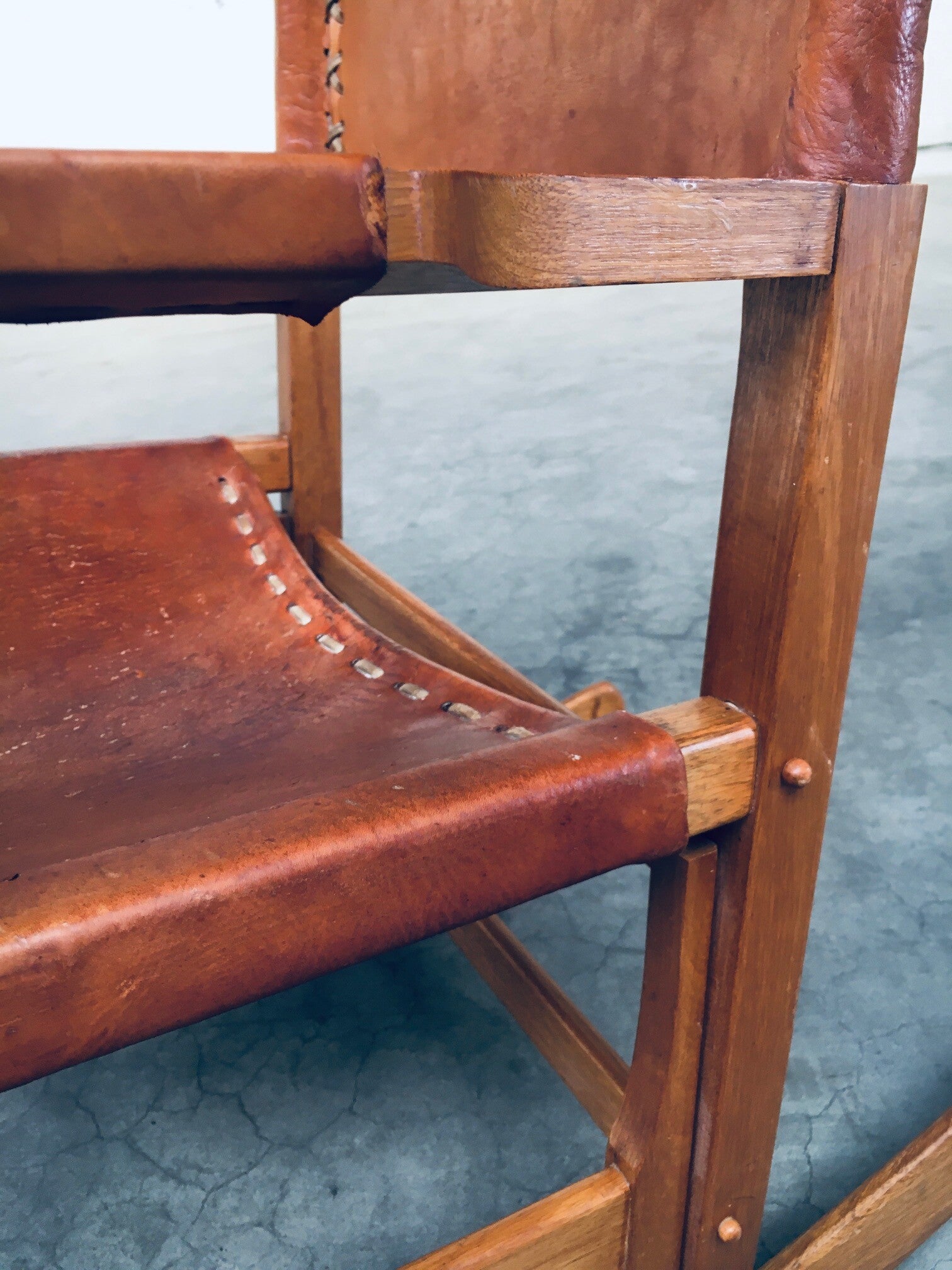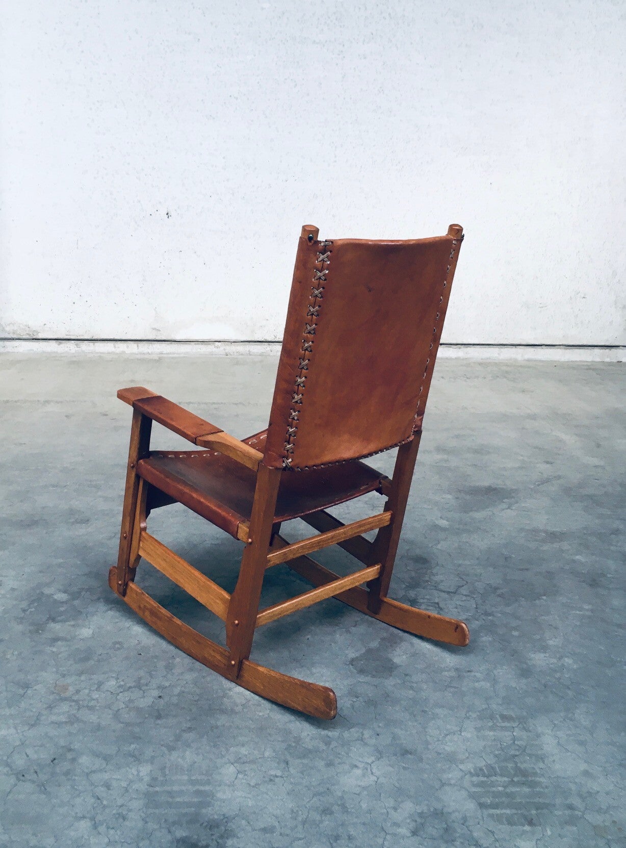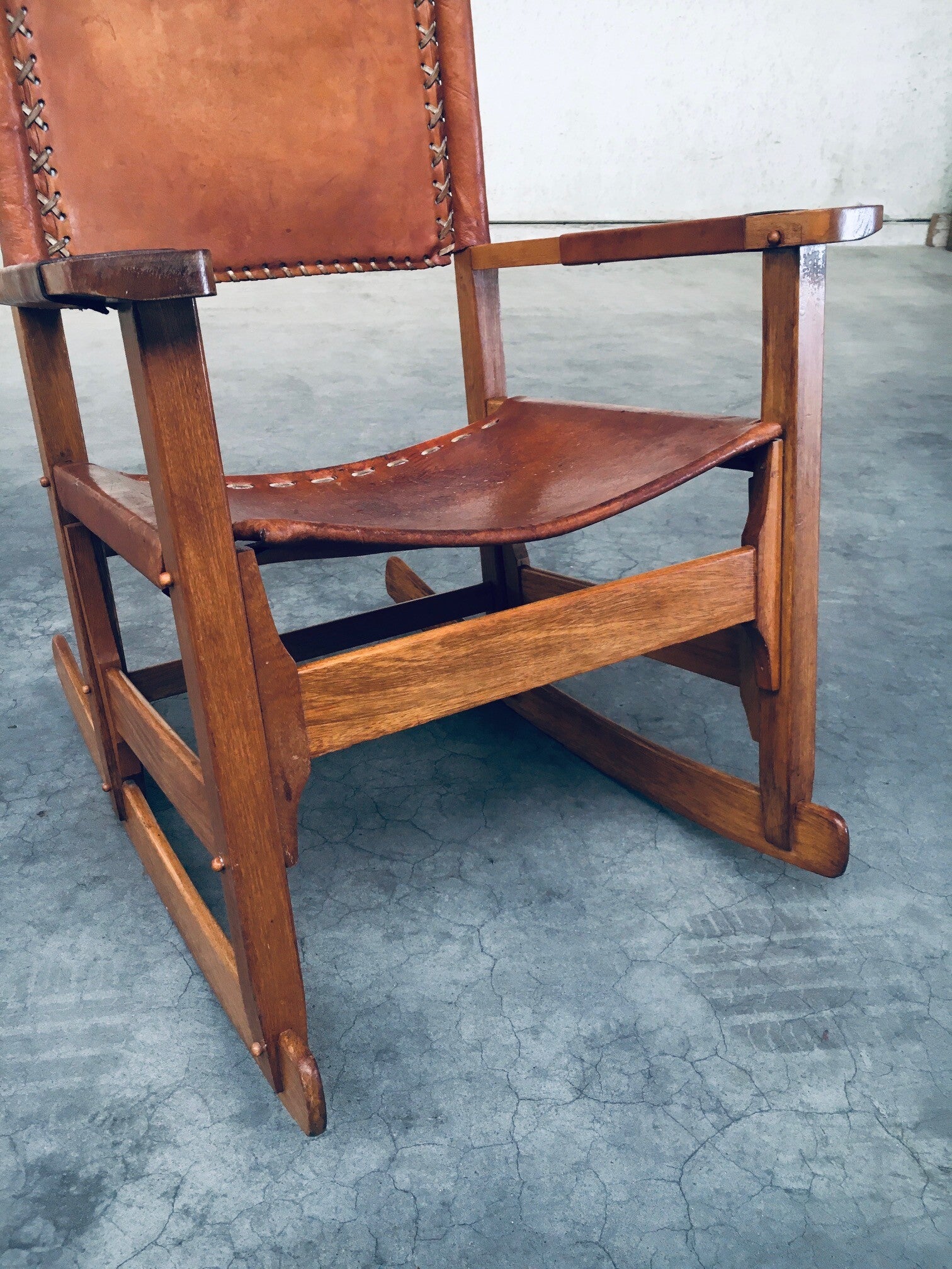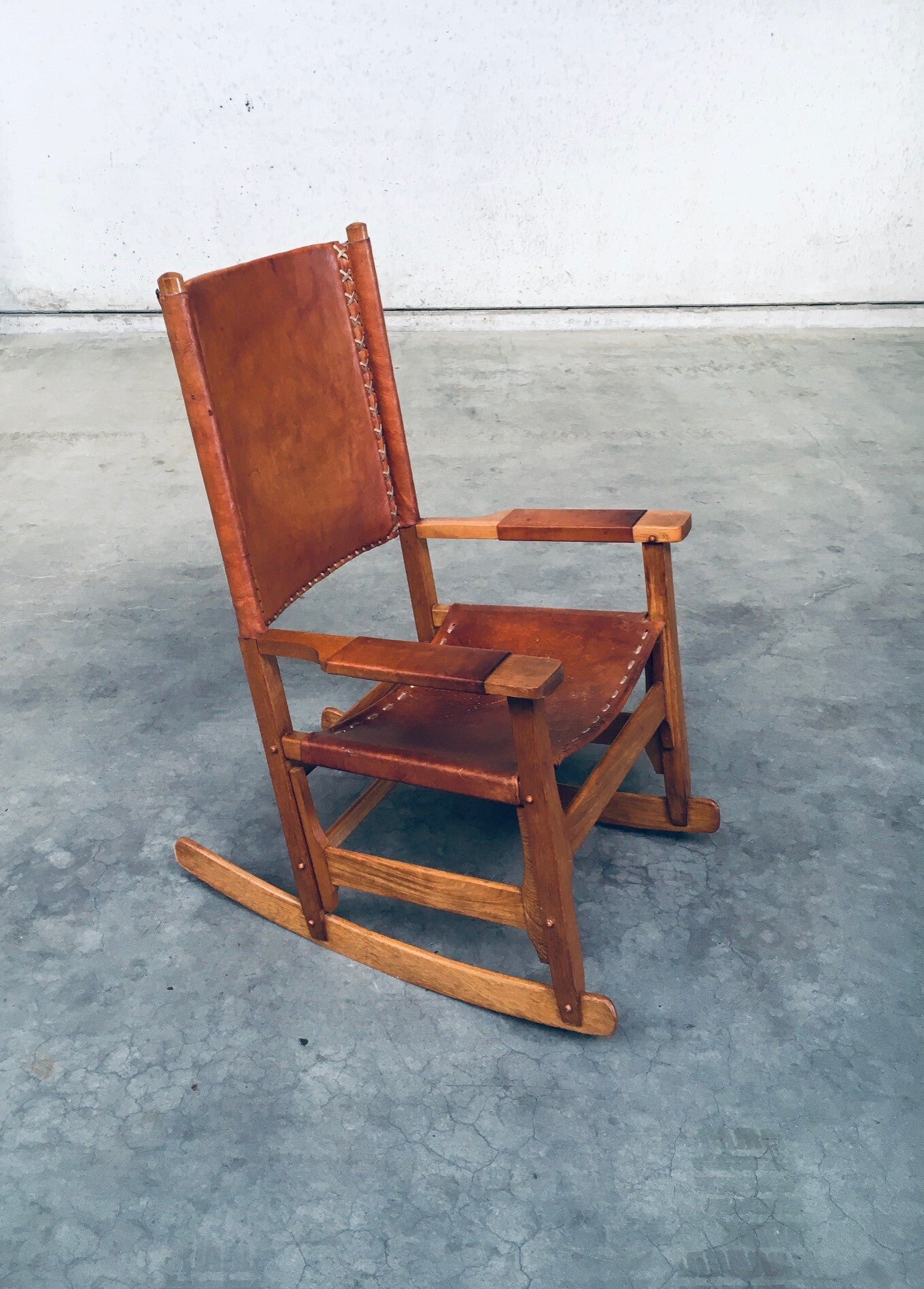 Vintage South American Design Leather Rocking Chair by Werner Biermann for Artesano Bogota. Made in Colombia, 1960's period. Has a manufacturing stamp on the inside beneat the seat. Thick leather seat and back with leather cross stitchings, leather pads glued on the armrests, all on a hardwood frame. The leather backrest has come loose from it's brass studs which holds this slightly more up on the back, but has not effect on the sturdyness. Comes in very good, all original condition with beautifull patina from it's age and use. Measures 105cm x 63cm x 82cm - seat height measures 42cm.