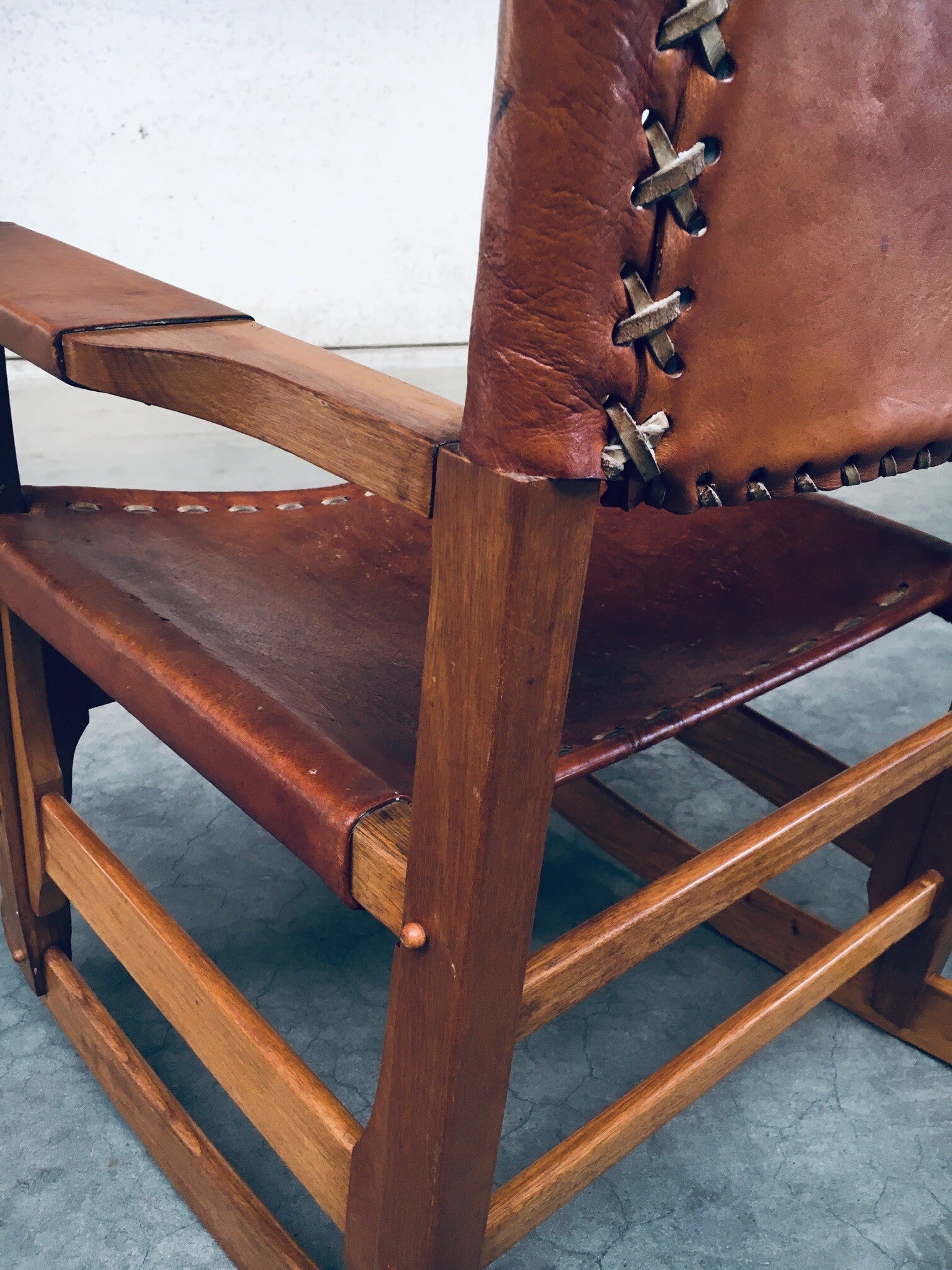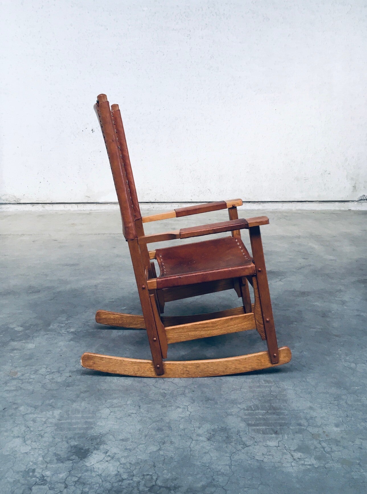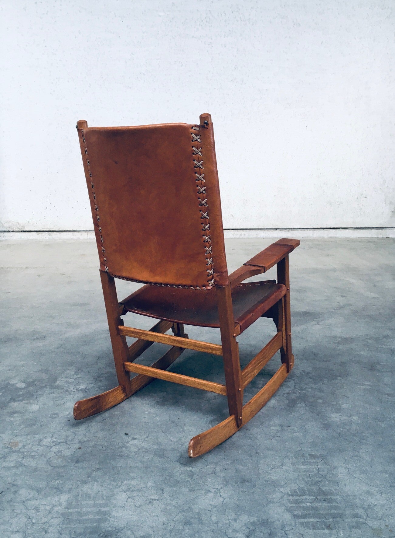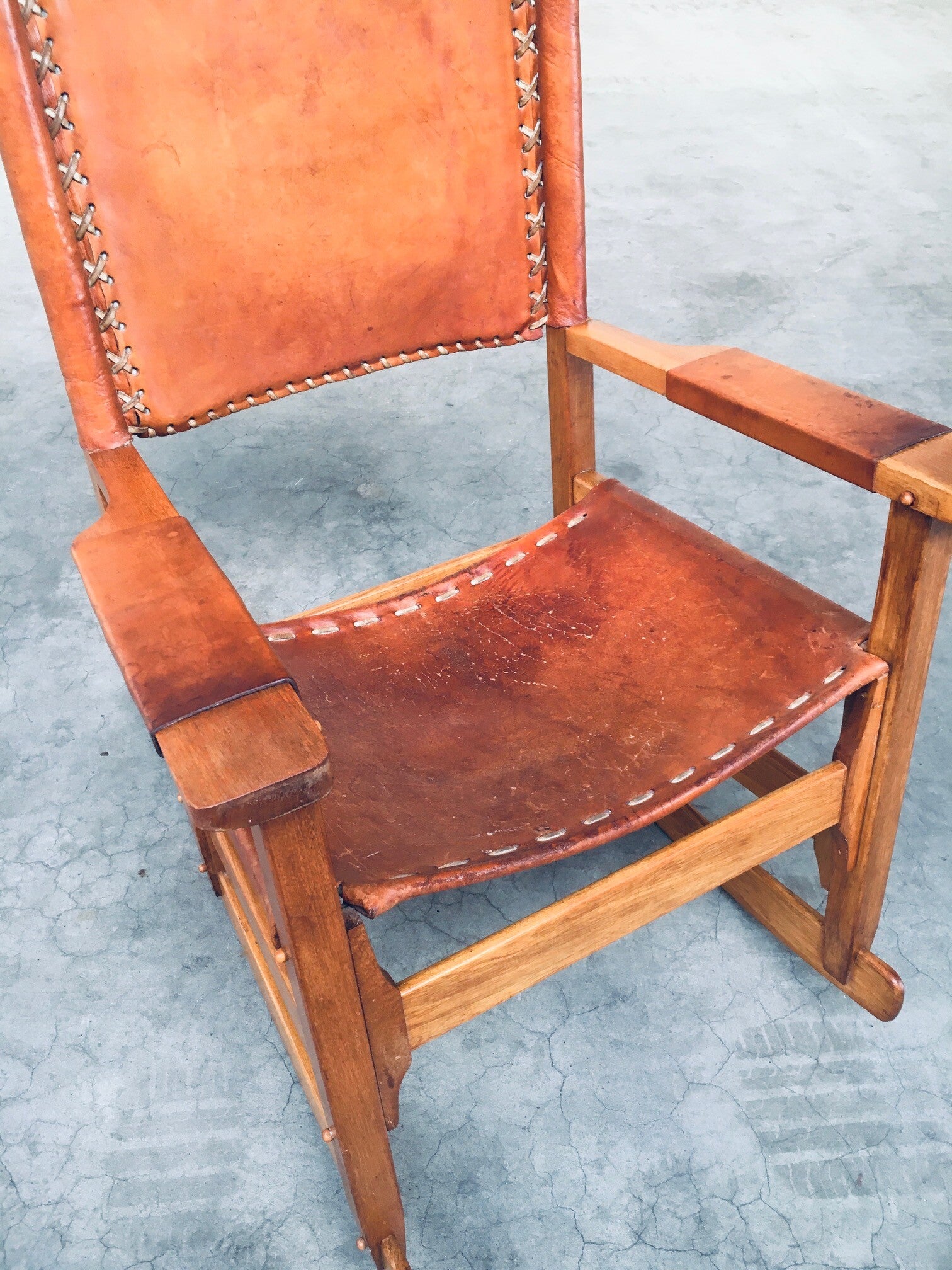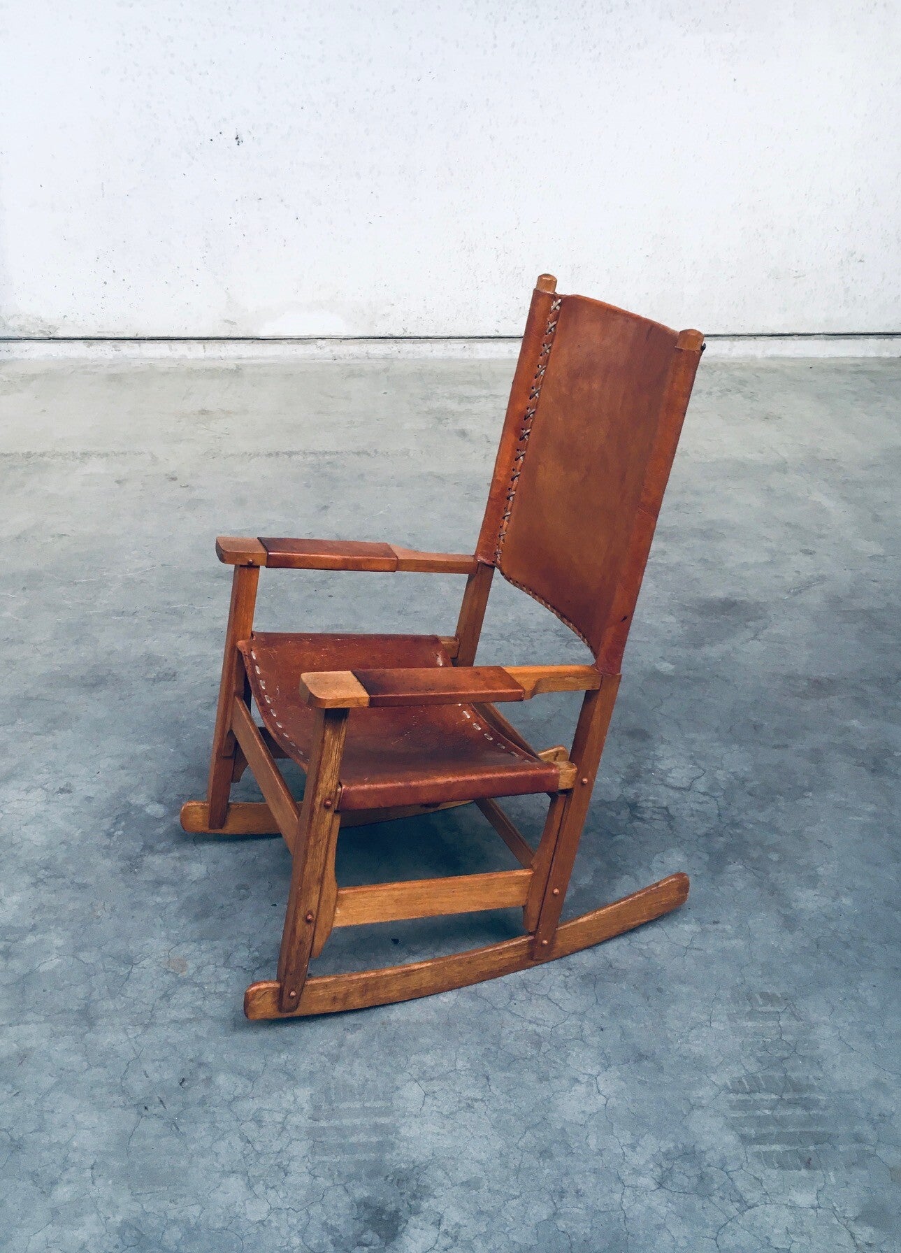 Vintage South American Design Leather Rocking Chair by Werner Biermann for Artesano Bogota. Made in Colombia, 1960's period. Has a manufacturing stamp on the inside beneat the seat. Thick leather seat and back with leather cross stitchings, leather pads glued on the armrests, all on a hardwood frame. The leather backrest has come loose from it's brass studs which holds this slightly more up on the back, but has not effect on the sturdyness. Comes in very good, all original condition with beautifull patina from it's age and use. Measures 105cm x 63cm x 82cm - seat height measures 42cm.