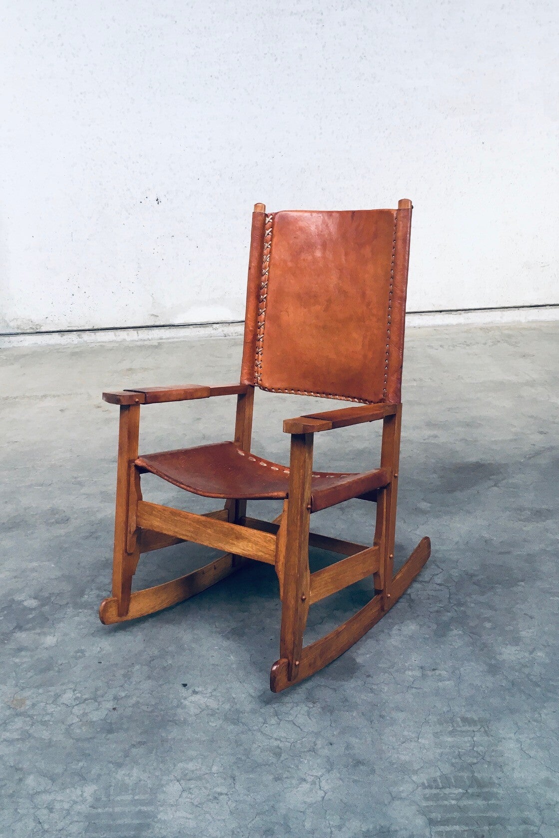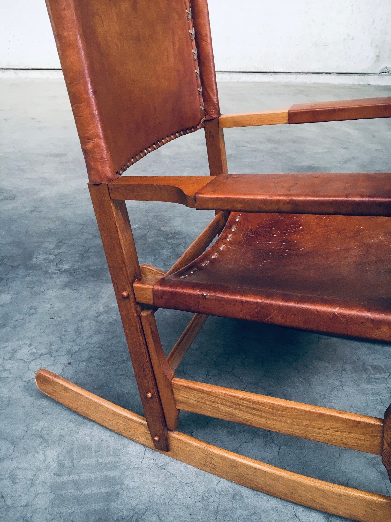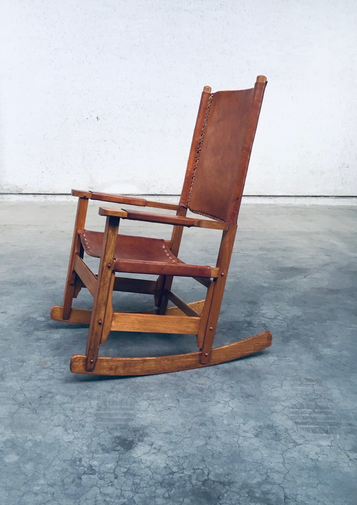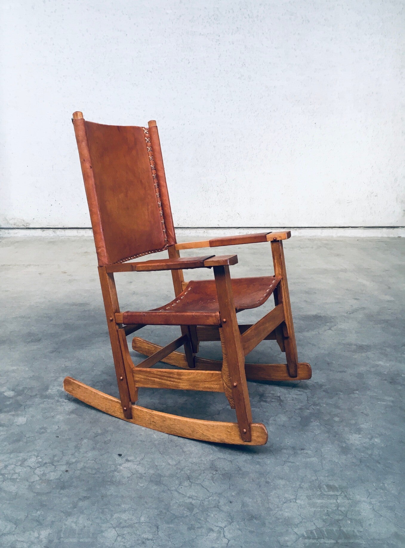 Vintage South American Design Leather Rocking Chair by Werner Biermann for Artesano Bogota. Made in Colombia, 1960's period. Has a manufacturing stamp on the inside beneat the seat. Thick leather seat and back with leather cross stitchings, leather pads glued on the armrests, all on a hardwood frame. The leather backrest has come loose from it's brass studs which holds this slightly more up on the back, but has not effect on the sturdyness. Comes in very good, all original condition with beautifull patina from it's age and use. Measures 105cm x 63cm x 82cm - seat height measures 42cm.