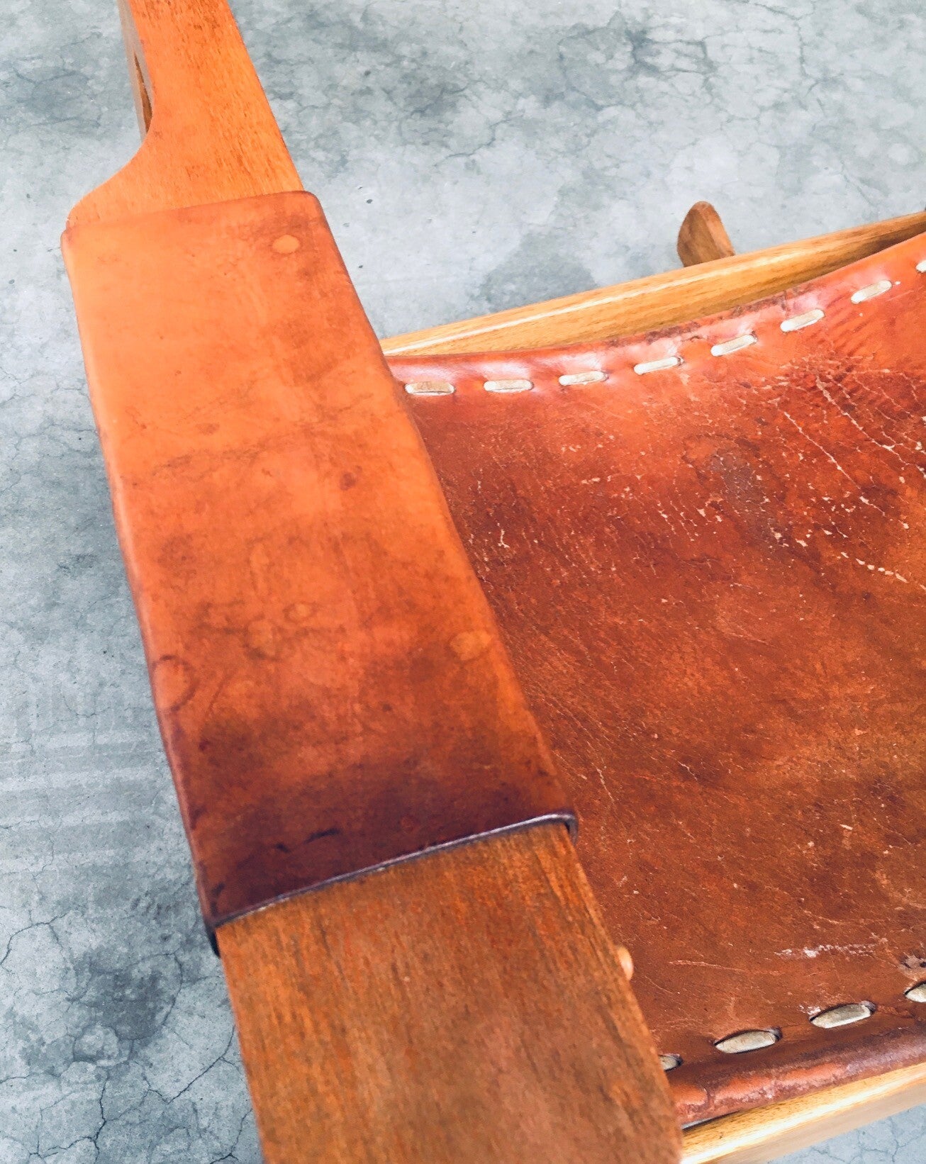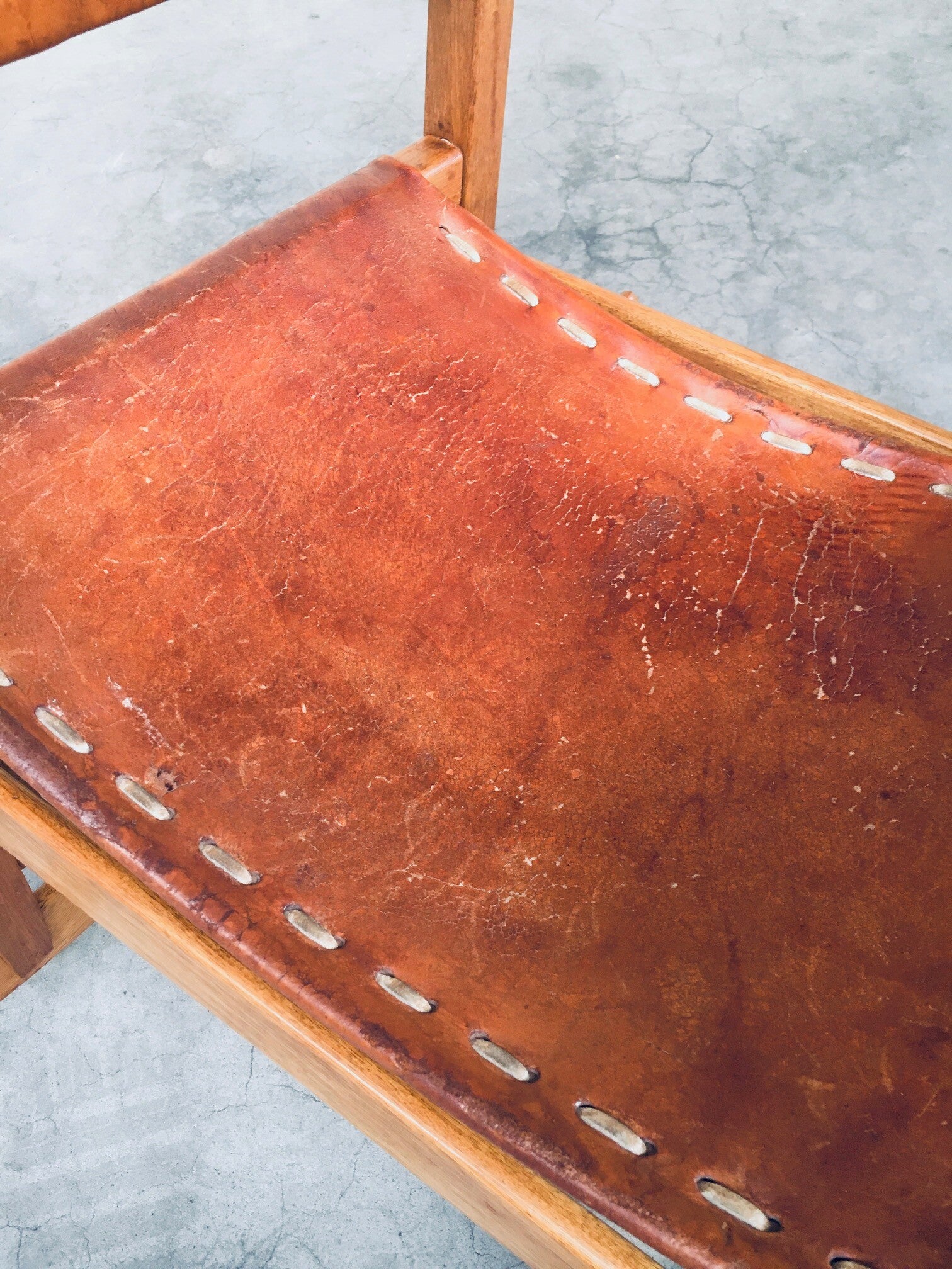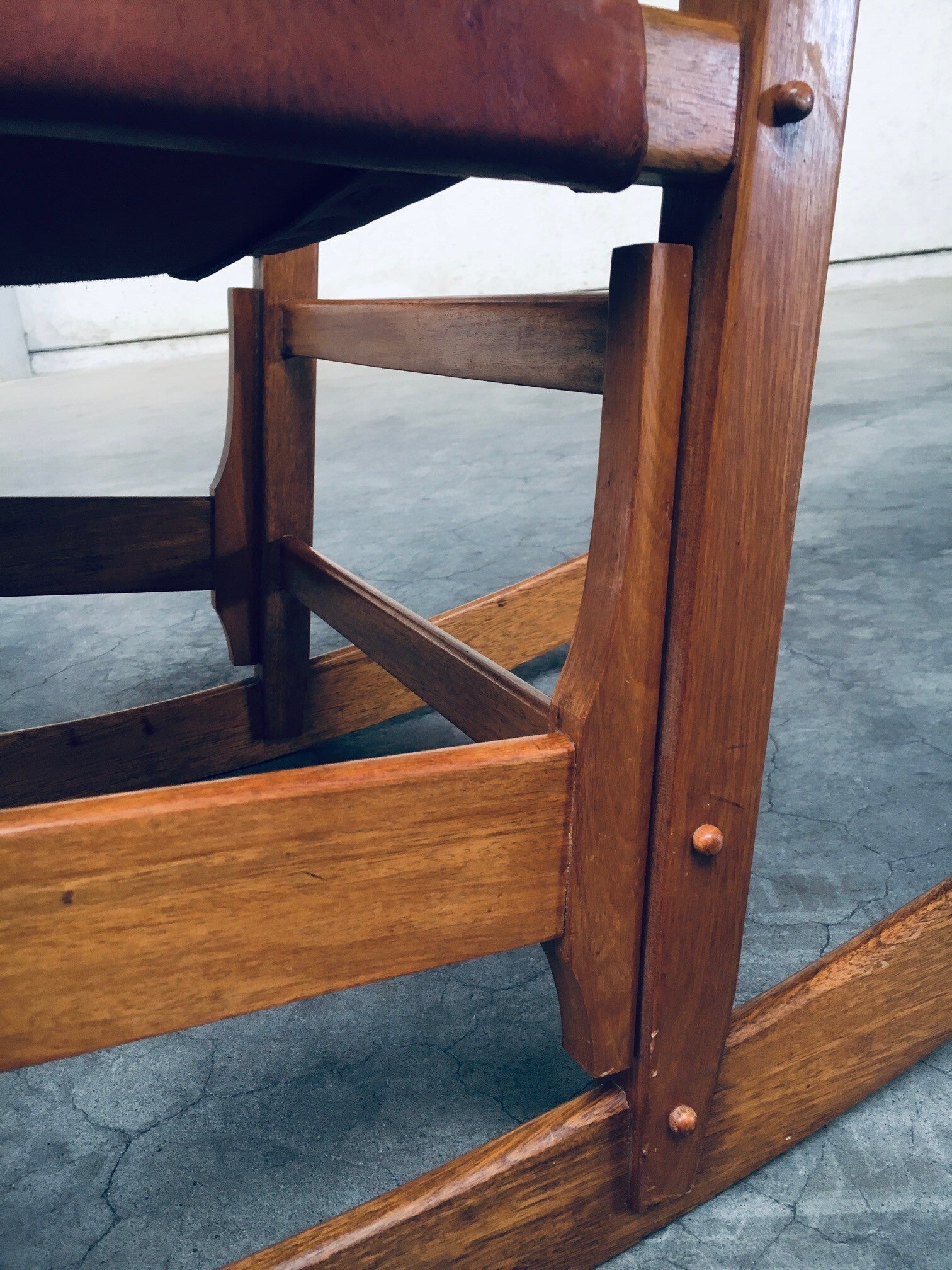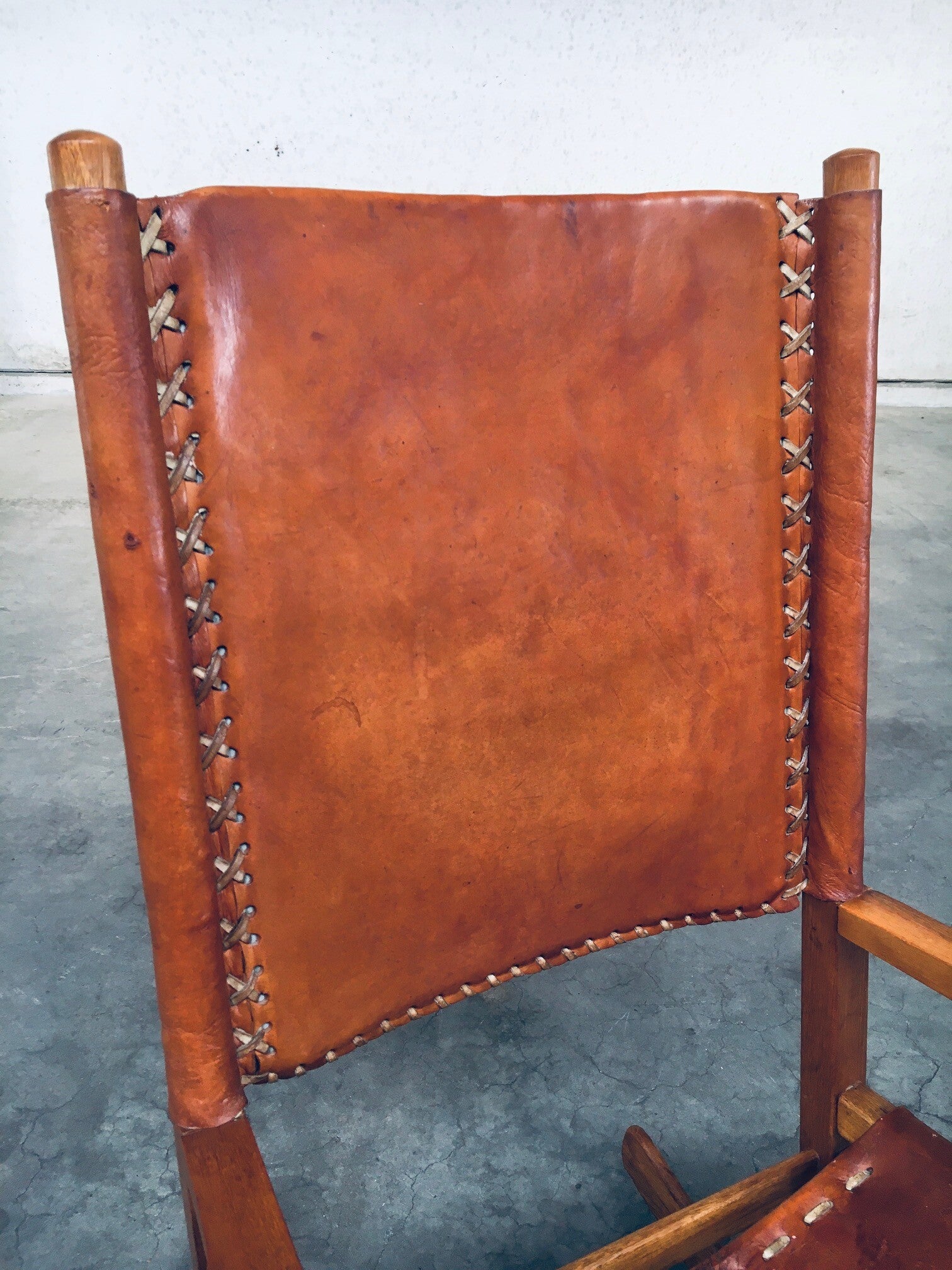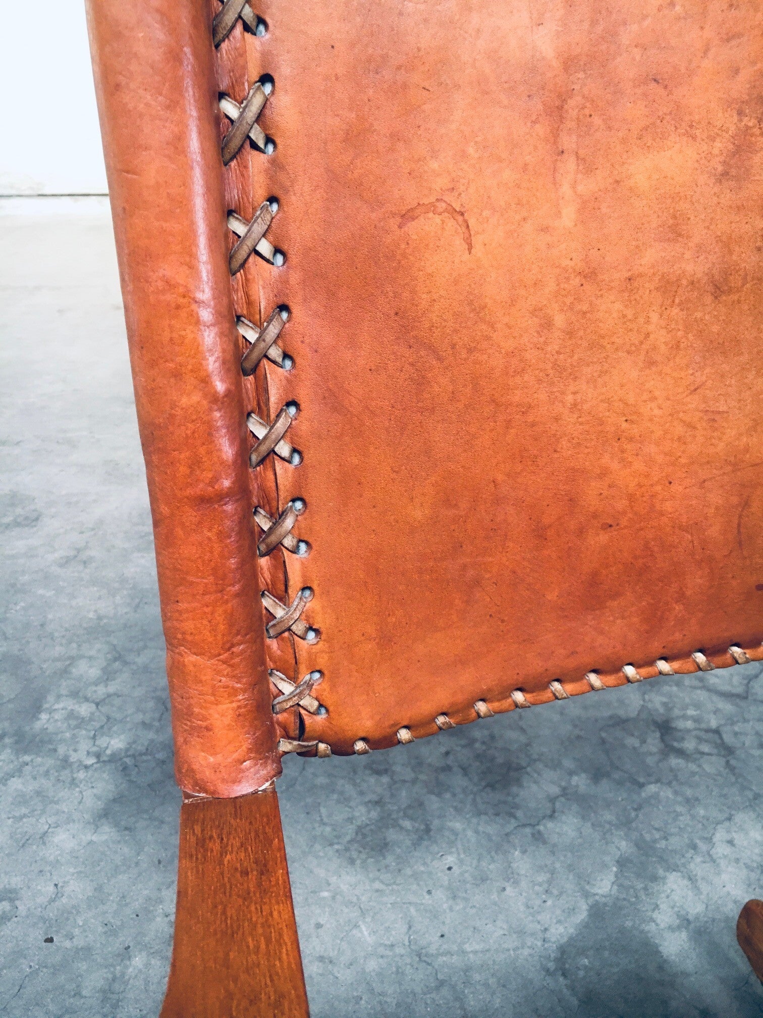 Vintage South American Design Leather Rocking Chair by Werner Biermann for Artesano Bogota. Made in Colombia, 1960's period. Has a manufacturing stamp on the inside beneat the seat. Thick leather seat and back with leather cross stitchings, leather pads glued on the armrests, all on a hardwood frame. The leather backrest has come loose from it's brass studs which holds this slightly more up on the back, but has not effect on the sturdyness. Comes in very good, all original condition with beautifull patina from it's age and use. Measures 105cm x 63cm x 82cm - seat height measures 42cm.