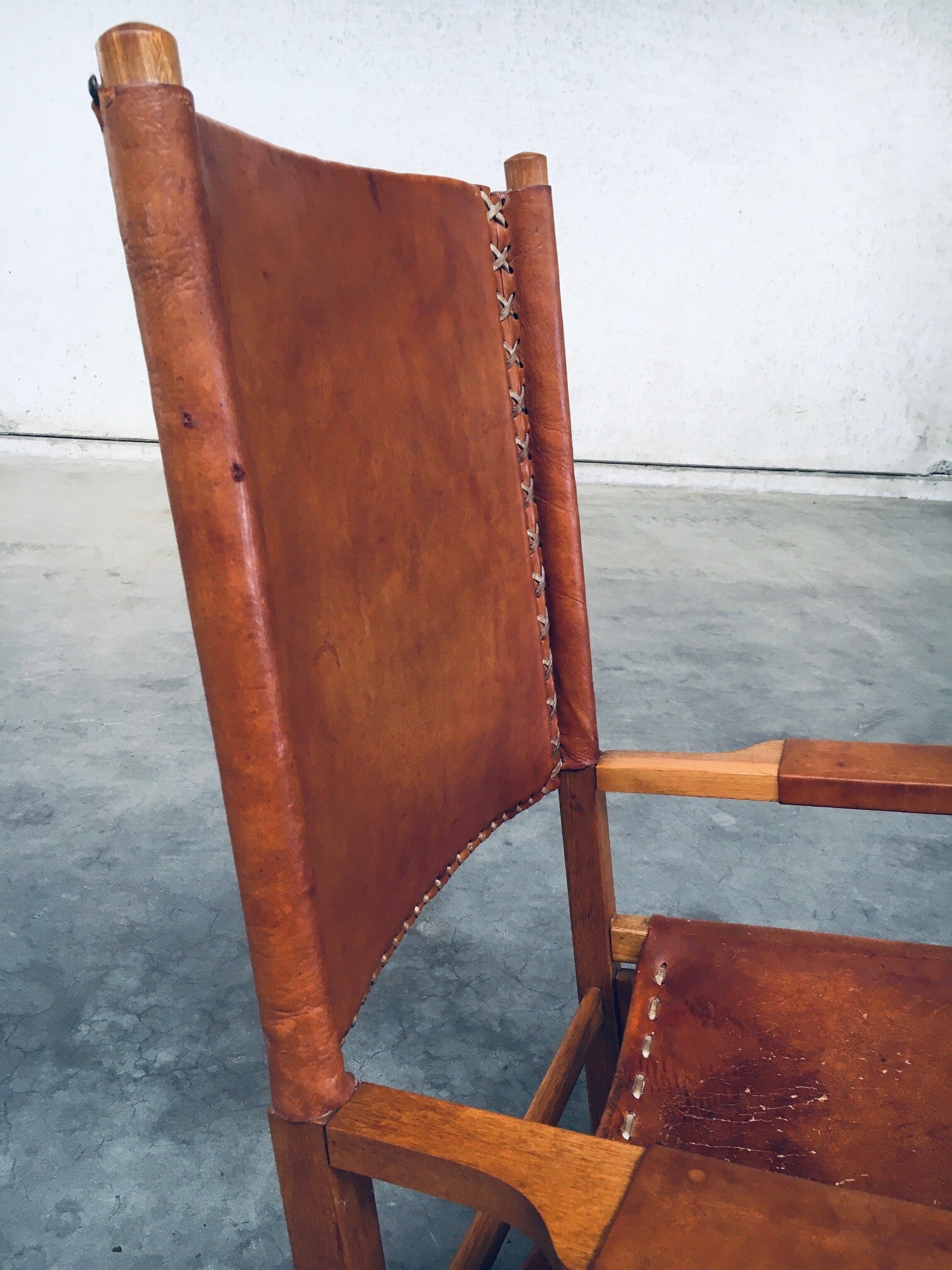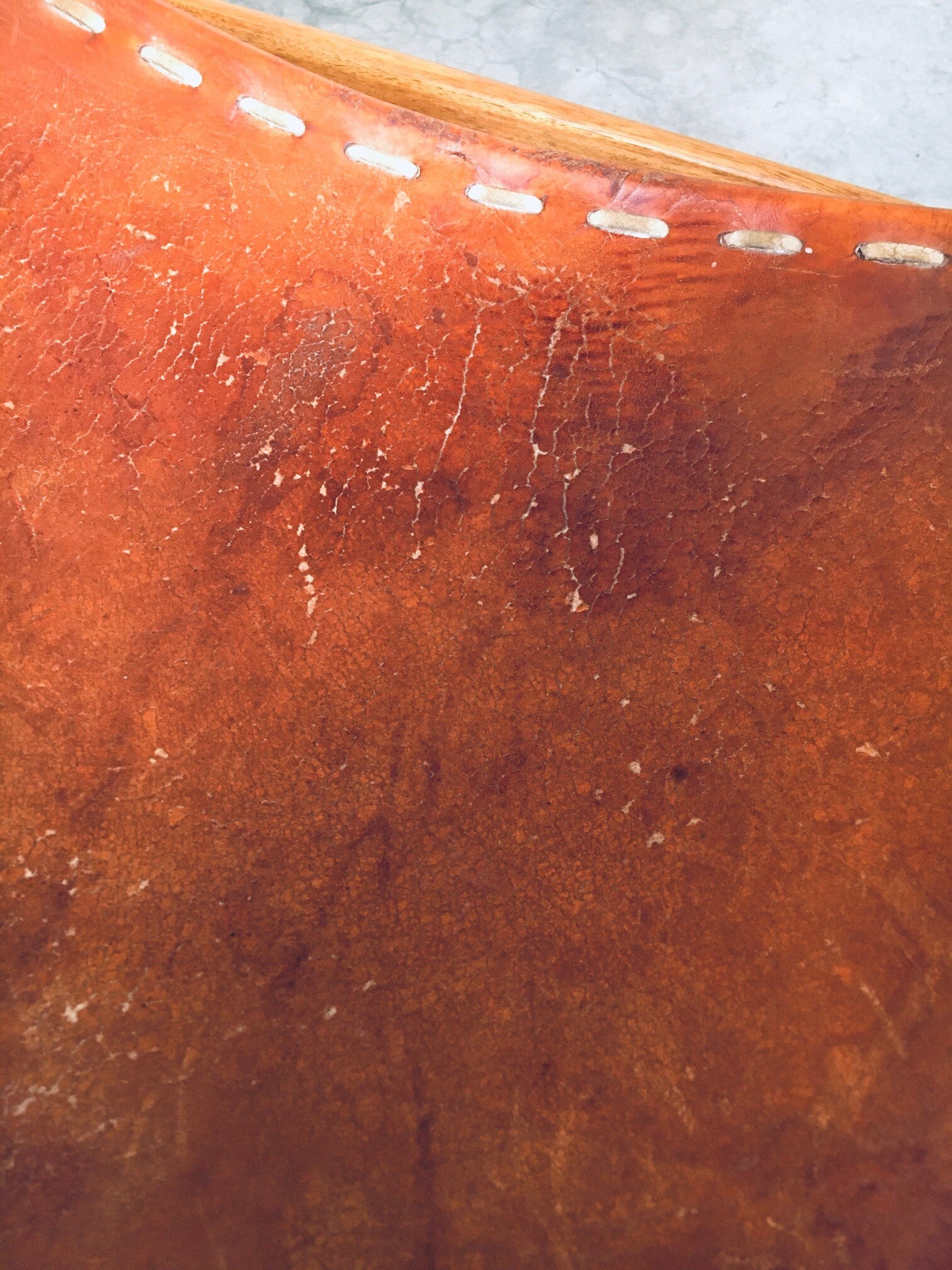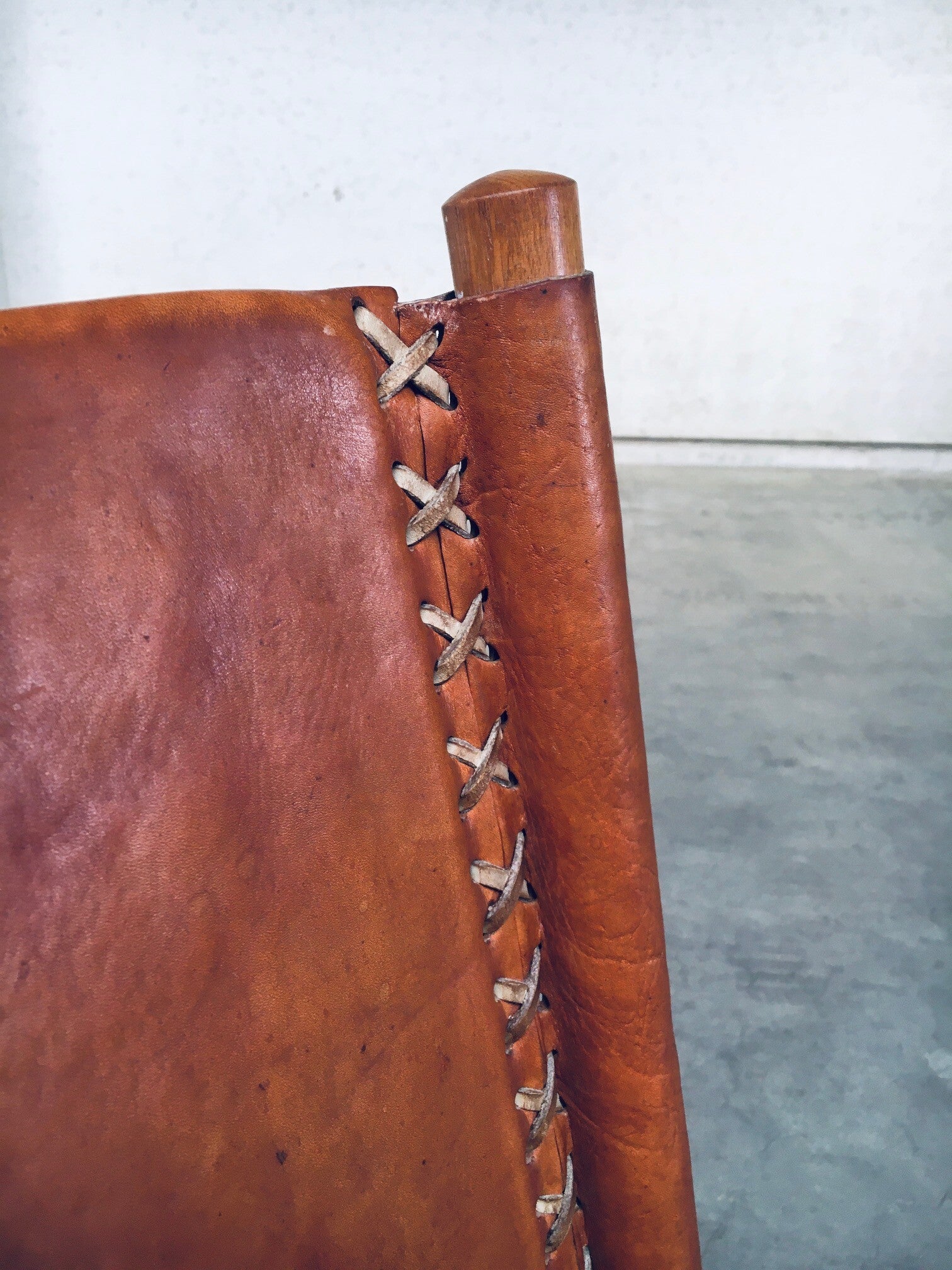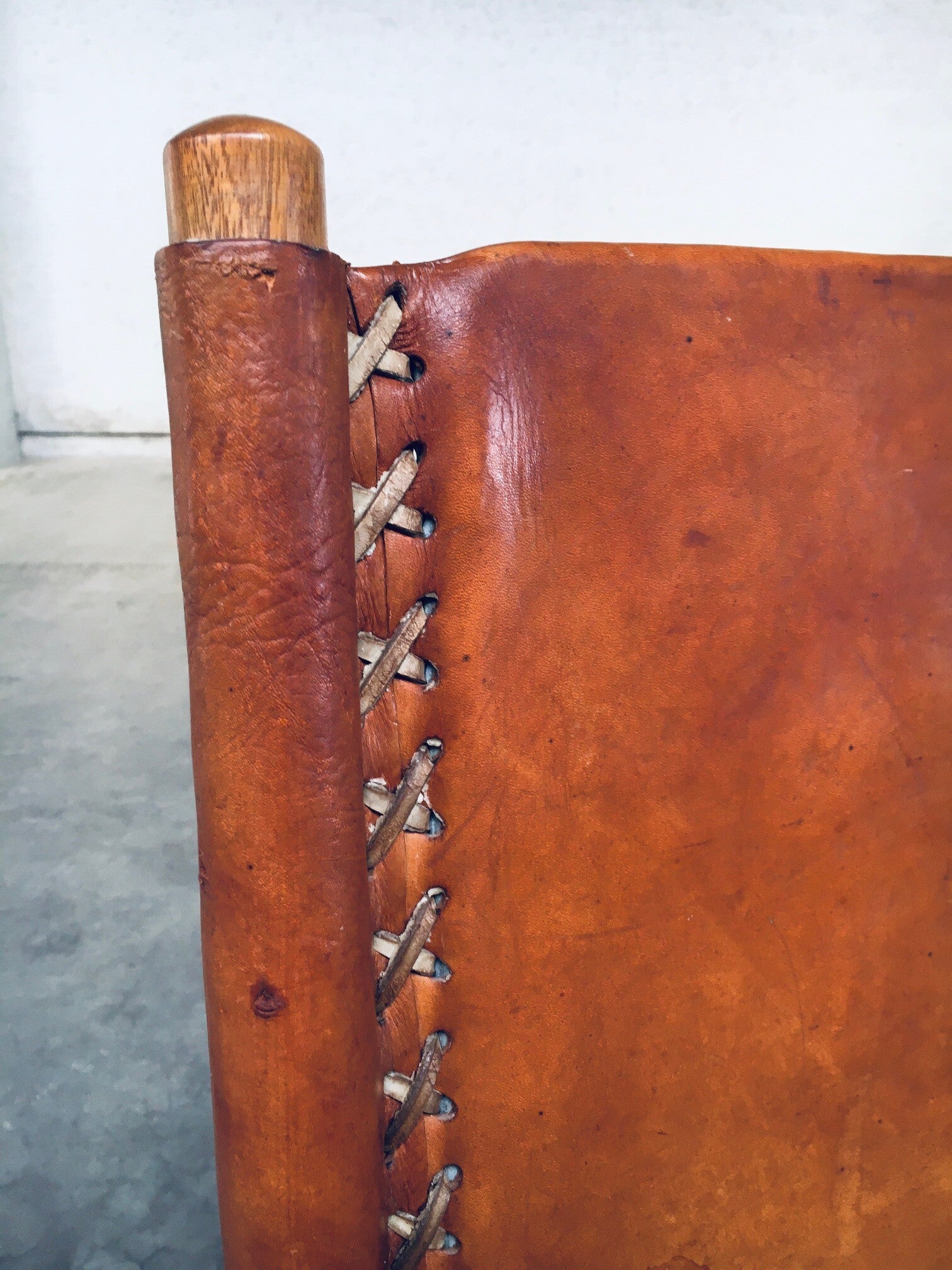Vintage South American Design Leather Rocking Chair by Werner Biermann for Artesano Bogota. Made in Colombia, 1960's period. Has a manufacturing stamp on the inside beneat the seat. Thick leather seat and back with leather cross stitchings, leather pads glued on the armrests, all on a hardwood frame. The leather backrest has come loose from it's brass studs which holds this slightly more up on the back, but has not effect on the sturdyness. Comes in very good, all original condition with beautifull patina from it's age and use. Measures 105cm x 63cm x 82cm - seat height measures 42cm.