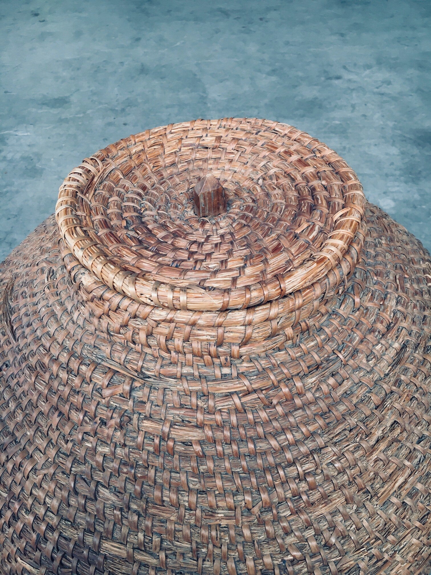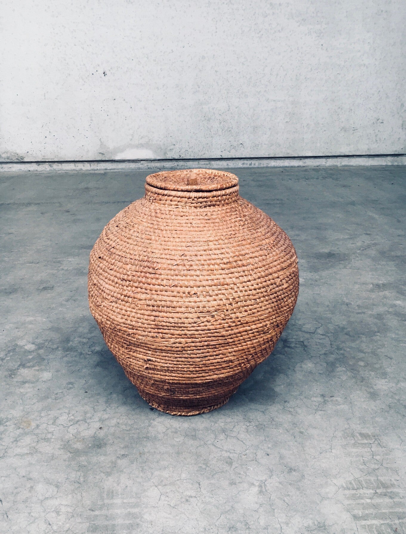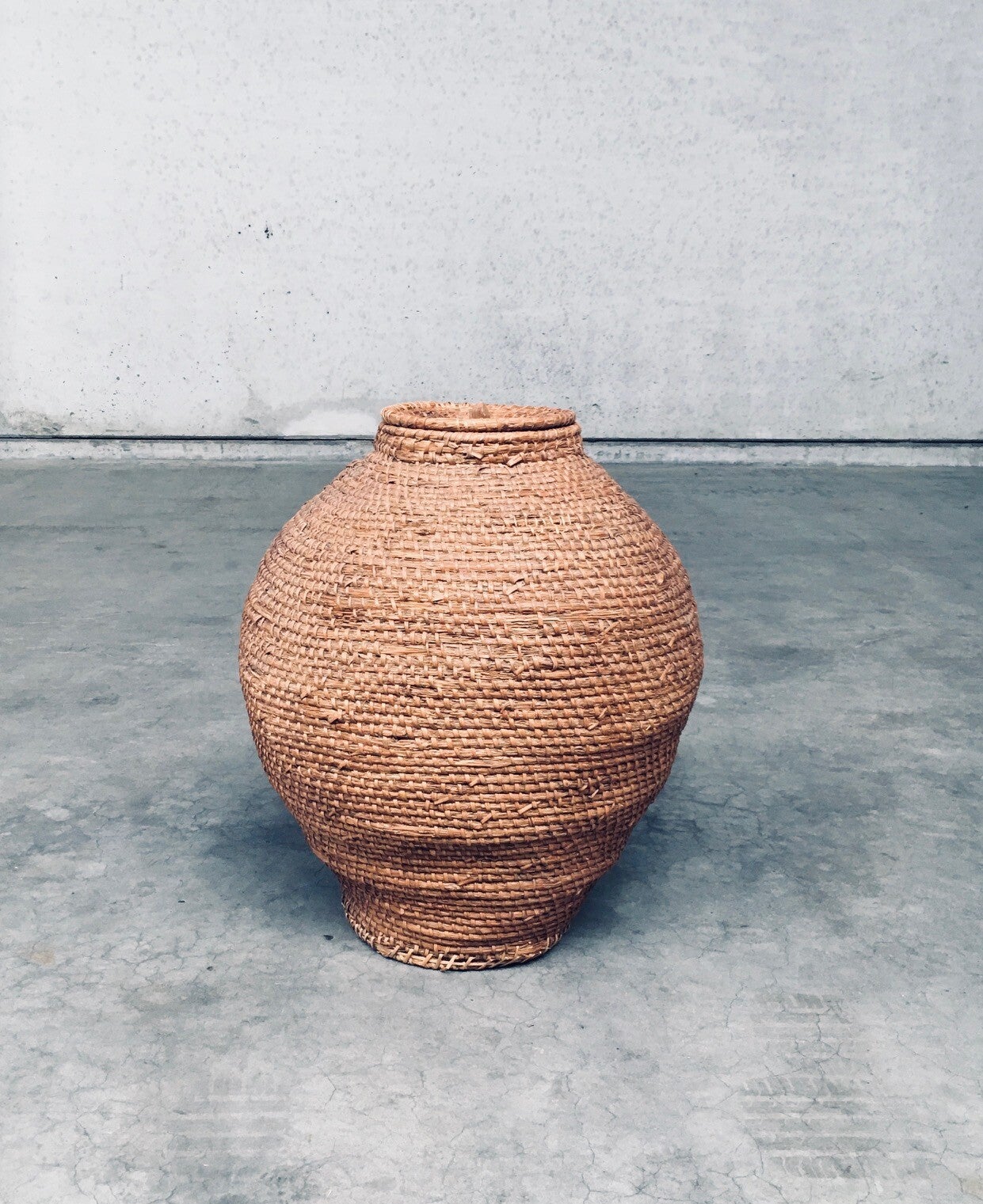 Early 20th Century Folk Art Primitive Straw Basket. Made in France. Dating back to the early 1900's. Woven wicker, braided natural straw XL coiled basket with cover lid. Originally designed for storing fruits like pears and apples, as well as everyday essentials, these striking pieces are versatile enough to adorn your entryway, living room or even outdoor spaces. Beautiful in shape and in very good original condition. This measures 72cm high x 60cm x 60cm.