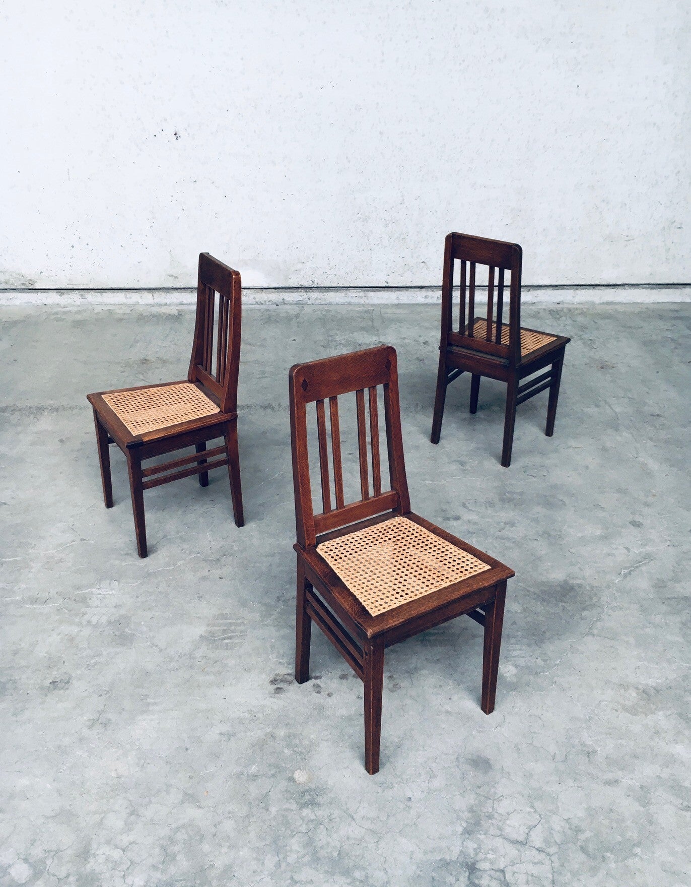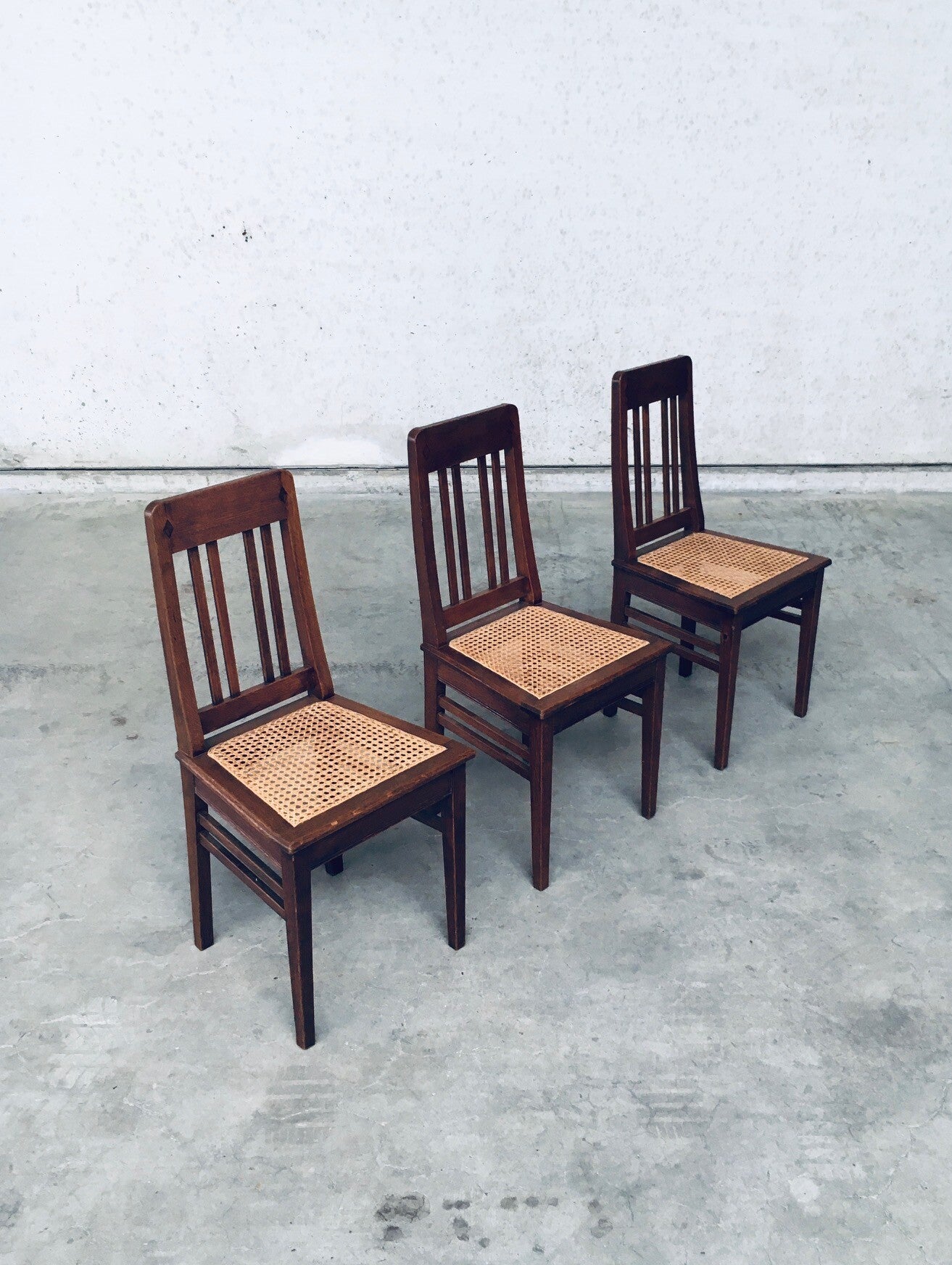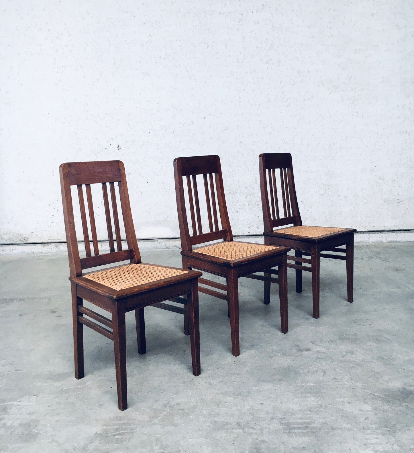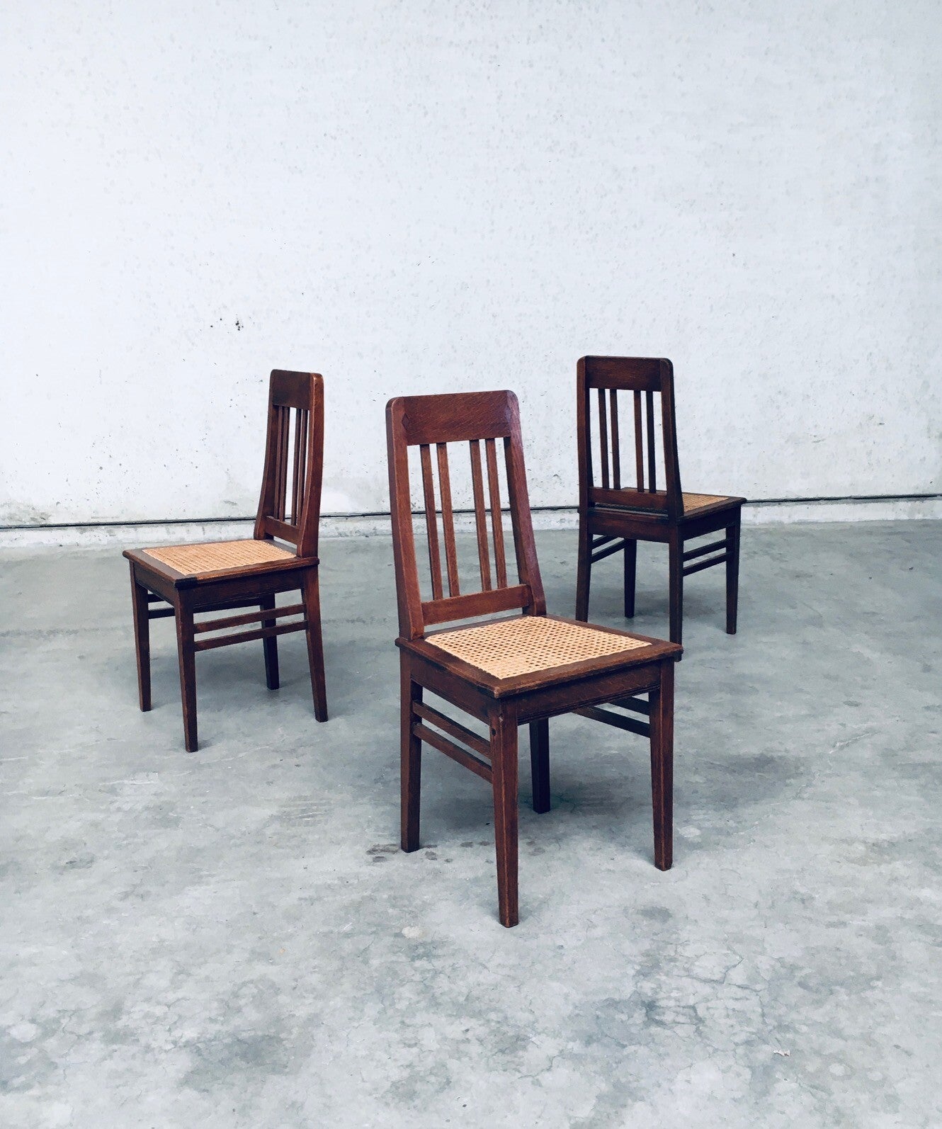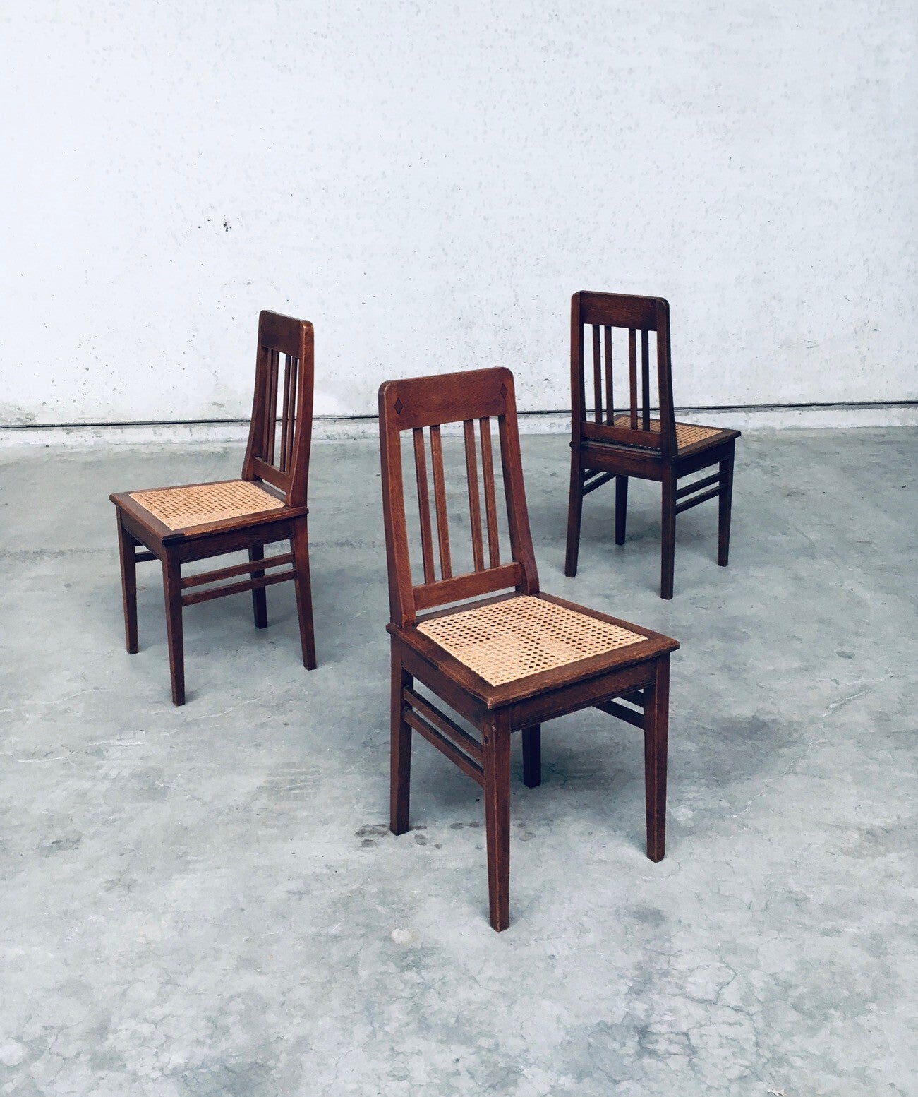 Early 20th Century Art Deco Design Period Dining Chair set of 3. Made in Belgium, 1920's - 30's period. Solid oak constructed chairs with woven webbing cane seats. Beautiful designed and made chairs with well constructed and small details. Like the diamond shape inlay on the top of the backrest, the small bend in the joint from back to seat, the intake at the back. Superb chairs that can be used as sidechairs in any room. Each chair comes in very good, original condition. They measure 91cm high x 43cm wide x 42cm deep. Seat height measures 45cm.