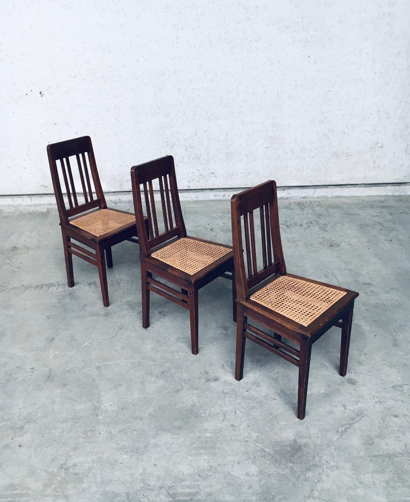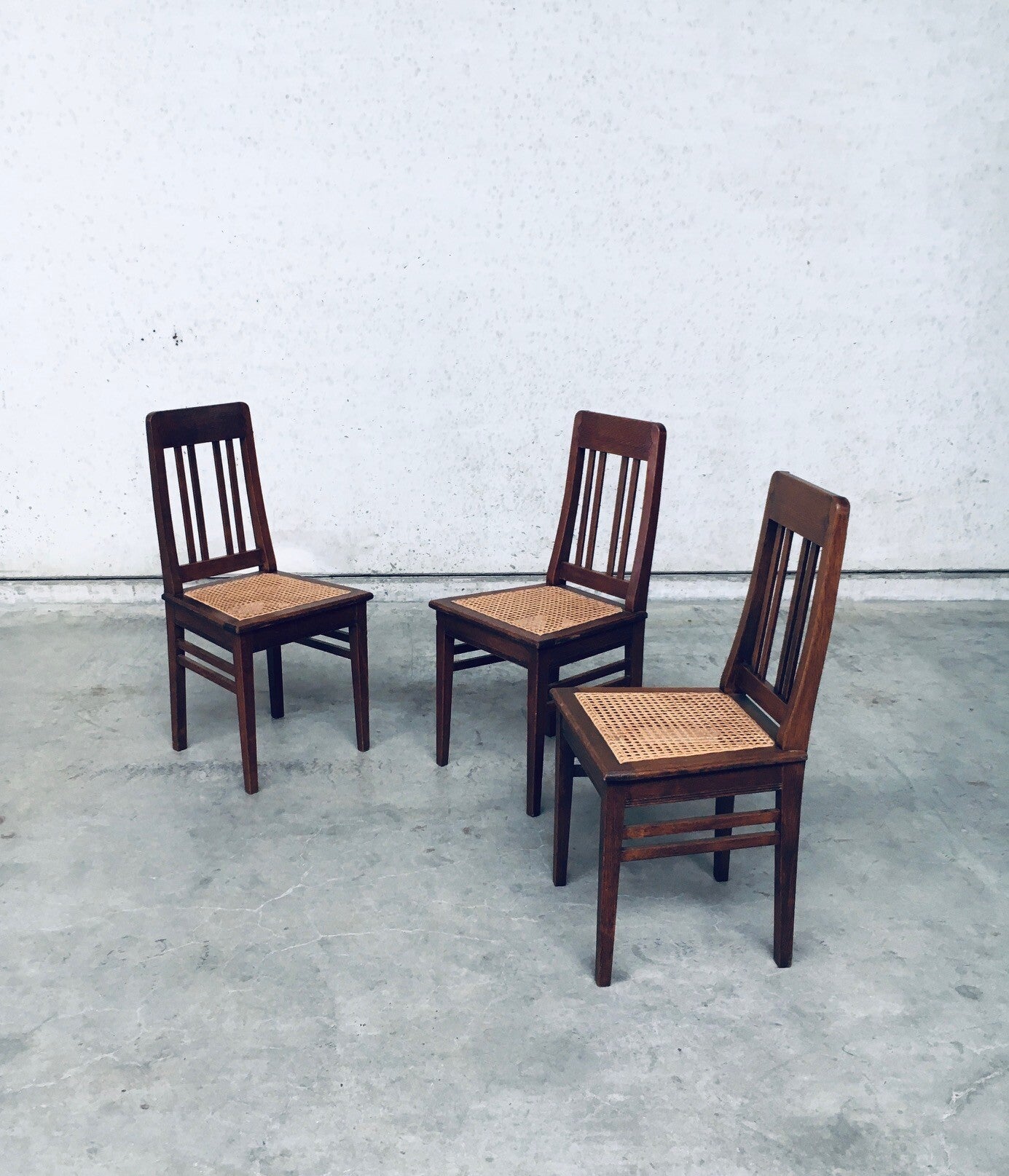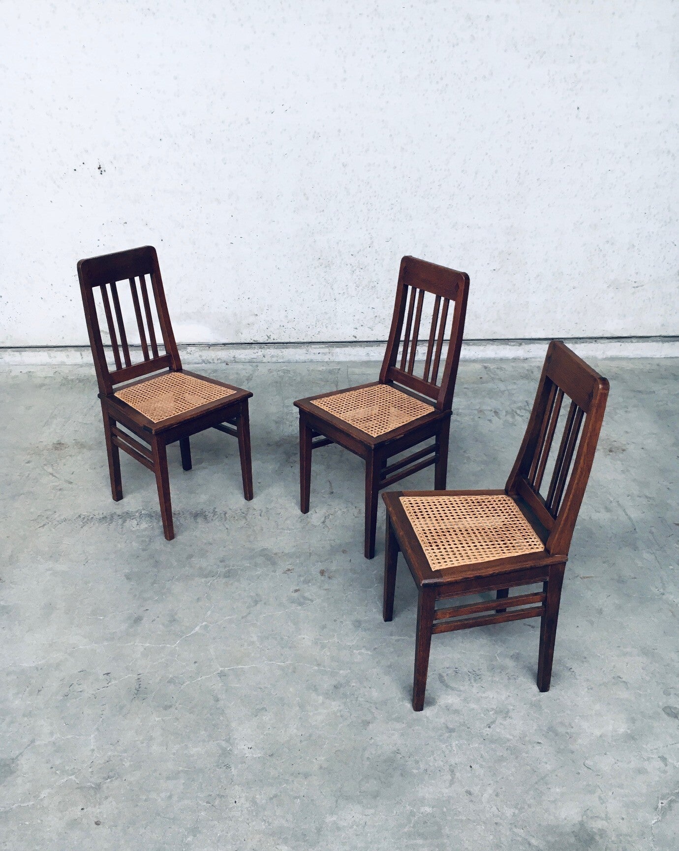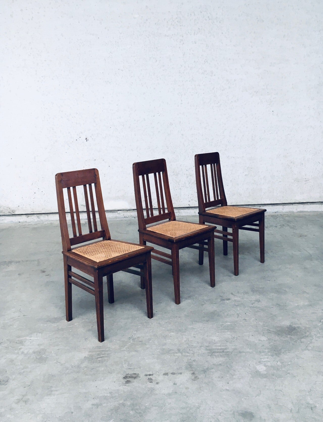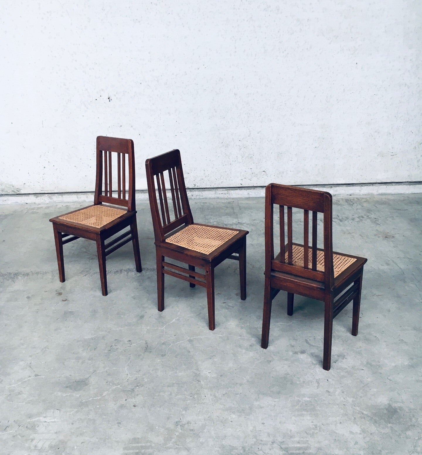Early 20th Century Art Deco Design Period Dining Chair set of 3. Made in Belgium, 1920's - 30's period. Solid oak constructed chairs with woven webbing cane seats. Beautiful designed and made chairs with well constructed and small details. Like the diamond shape inlay on the top of the backrest, the small bend in the joint from back to seat, the intake at the back. Superb chairs that can be used as sidechairs in any room. Each chair comes in very good, original condition. They measure 91cm high x 43cm wide x 42cm deep. Seat height measures 45cm.