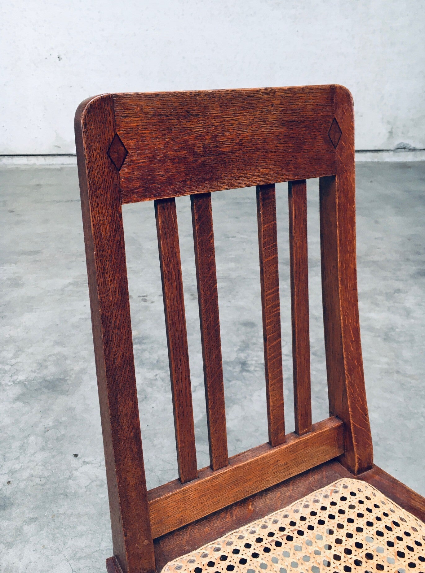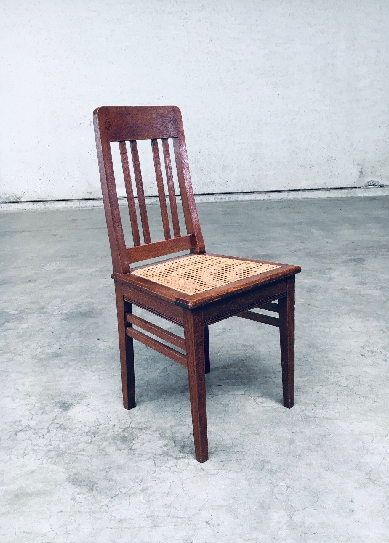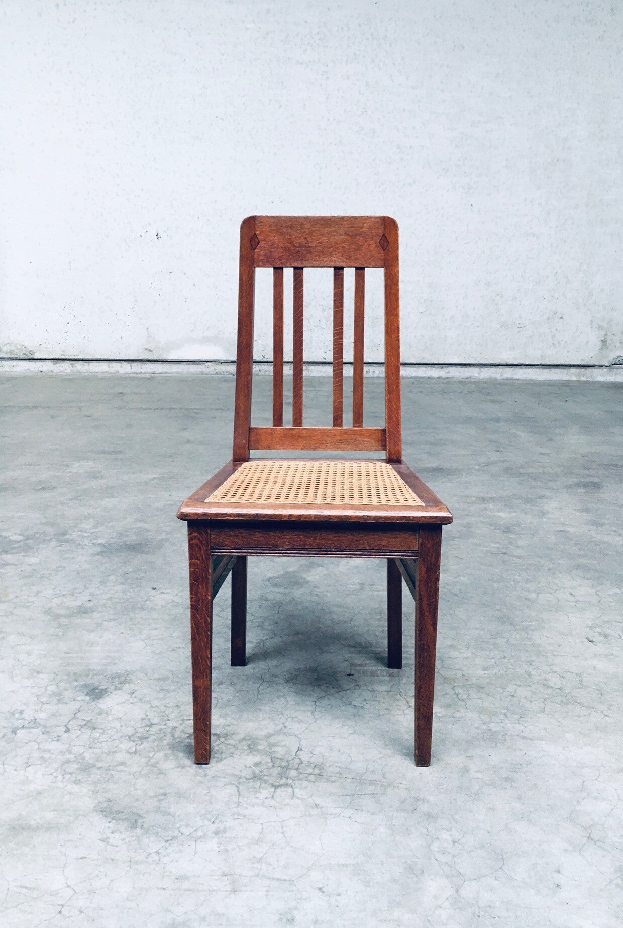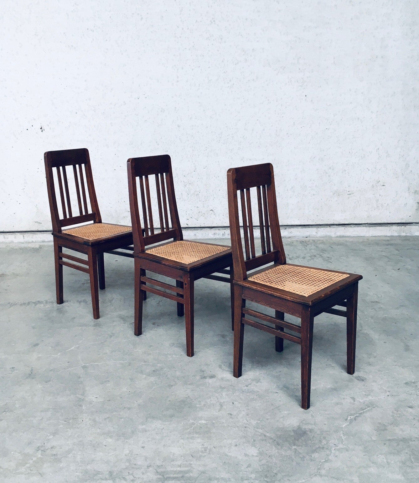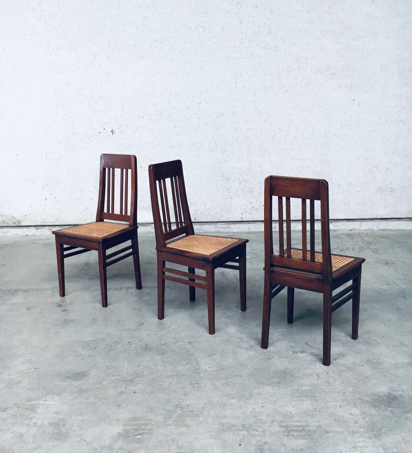 Early 20th Century Art Deco Design Period Dining Chair set of 3. Made in Belgium, 1920's - 30's period. Solid oak constructed chairs with woven webbing cane seats. Beautiful designed and made chairs with well constructed and small details. Like the diamond shape inlay on the top of the backrest, the small bend in the joint from back to seat, the intake at the back. Superb chairs that can be used as sidechairs in any room. Each chair comes in very good, original condition. They measure 91cm high x 43cm wide x 42cm deep. Seat height measures 45cm.