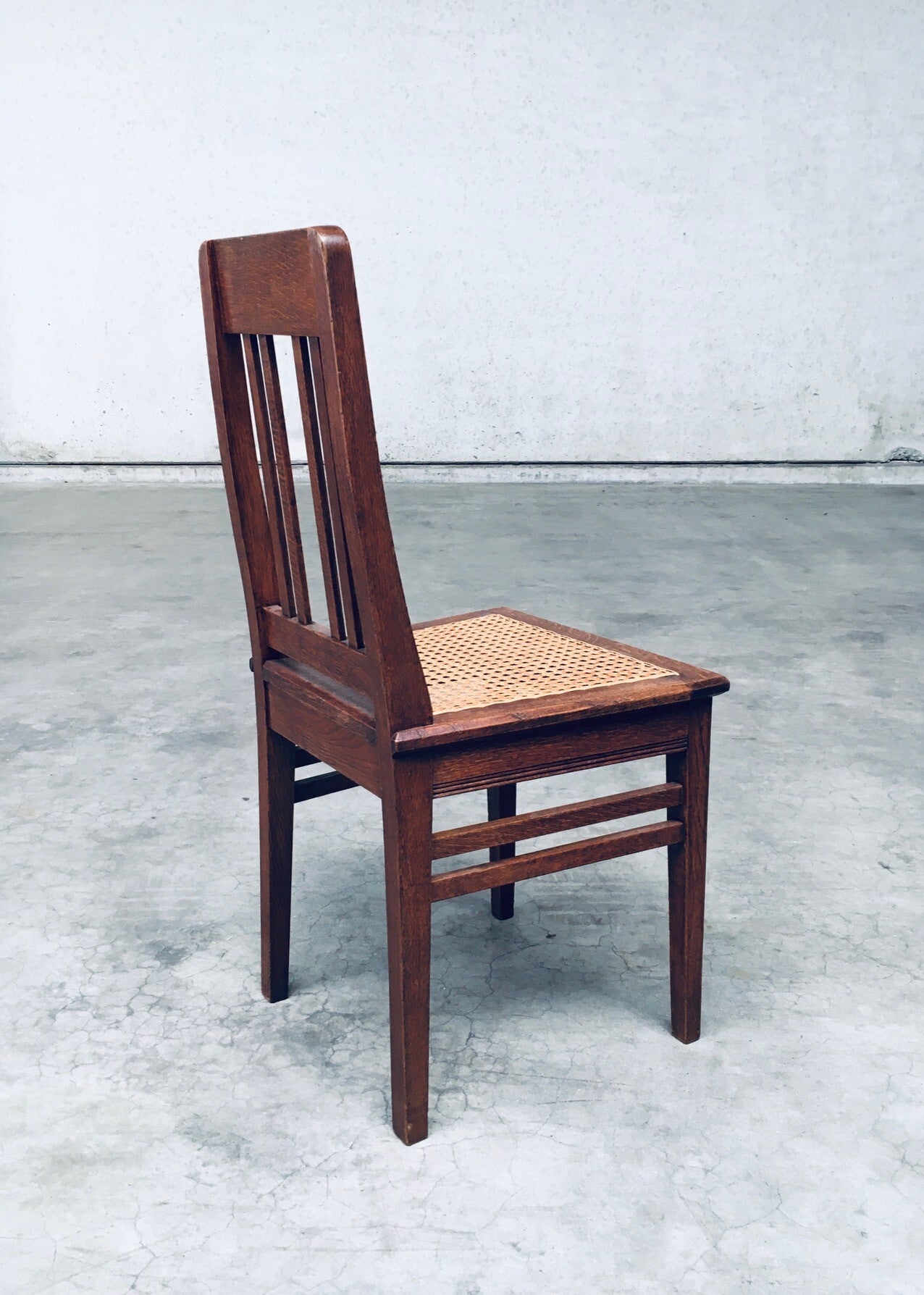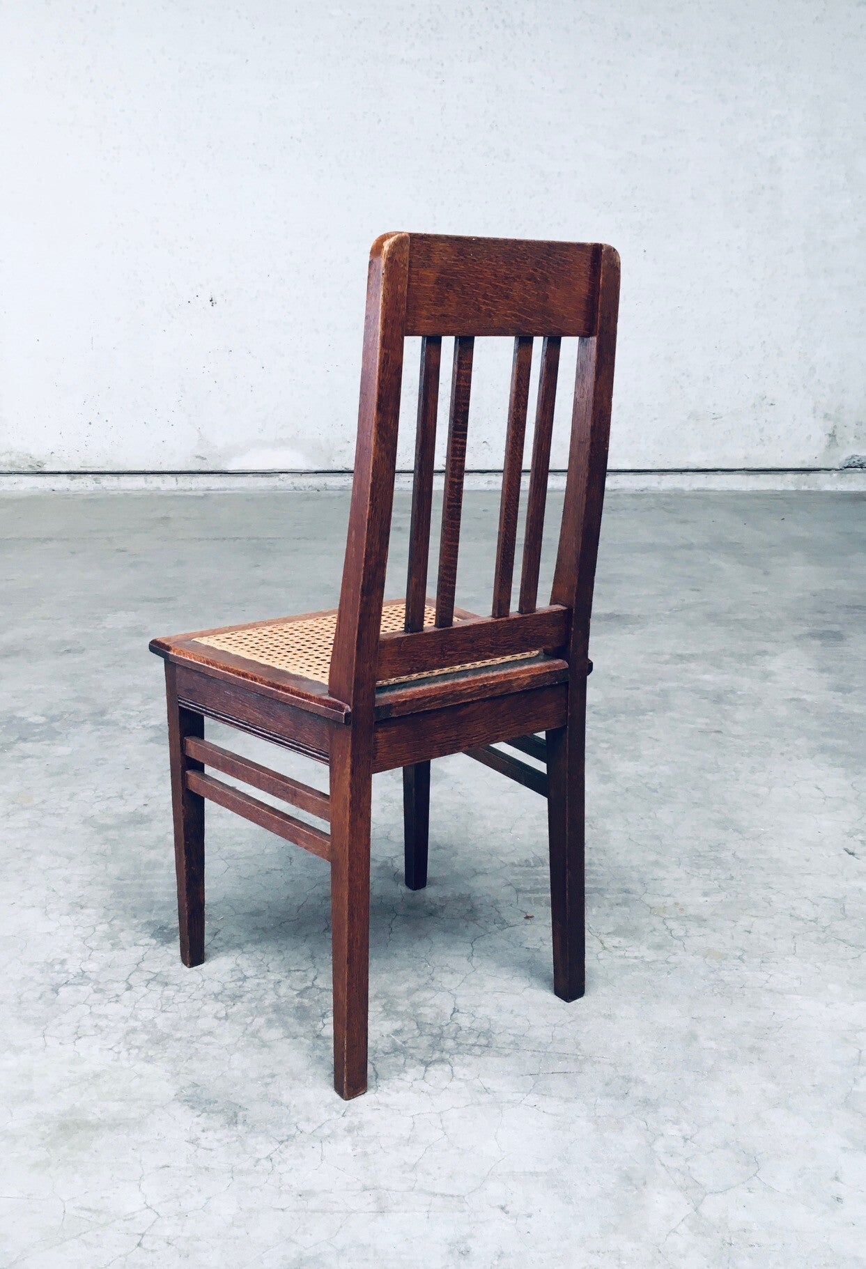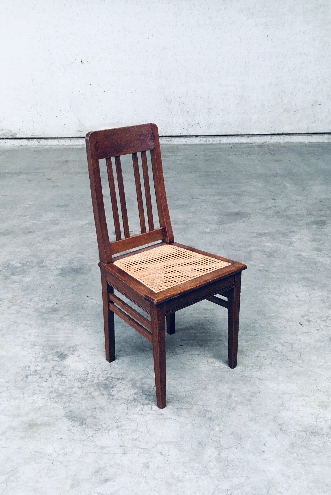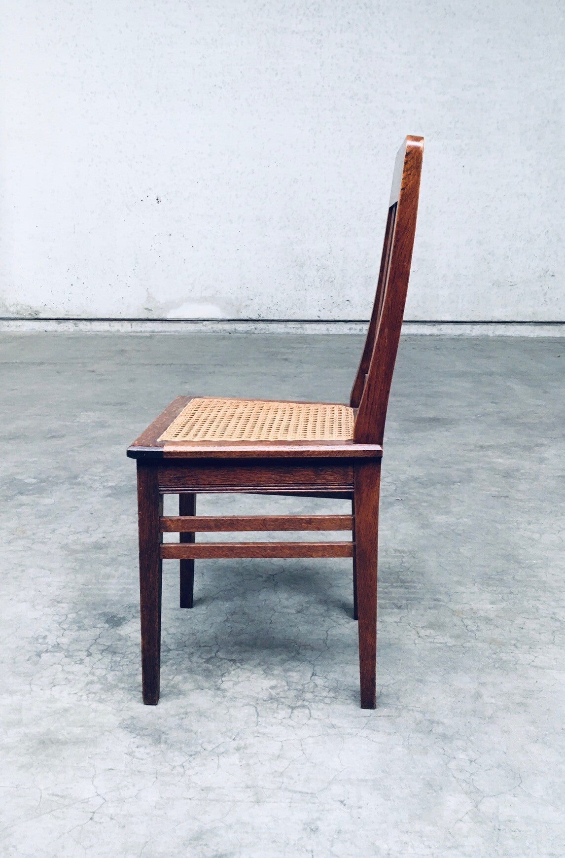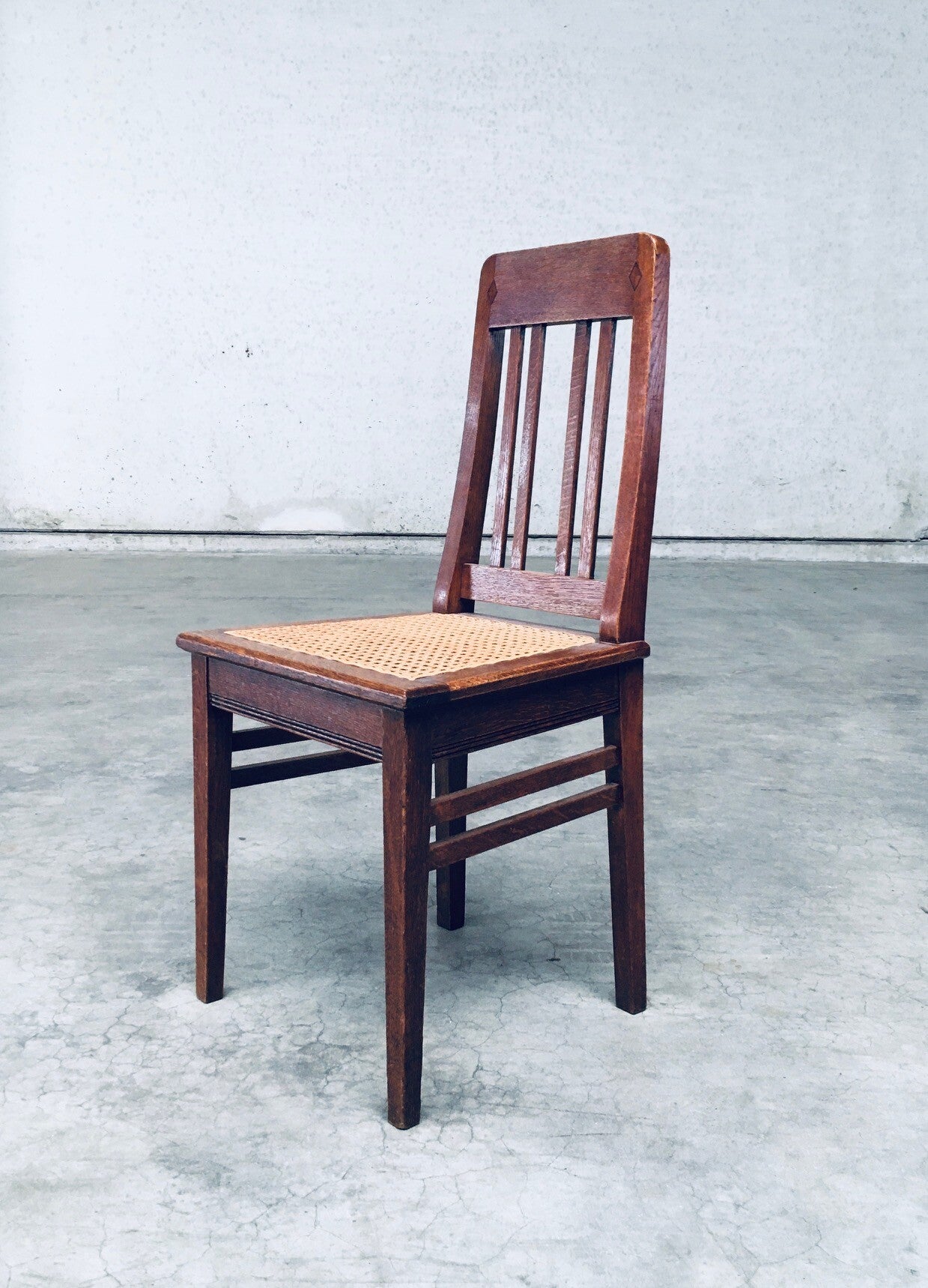 Early 20th Century Art Deco Design Period Dining Chair set of 3. Made in Belgium, 1920's - 30's period. Solid oak constructed chairs with woven webbing cane seats. Beautiful designed and made chairs with well constructed and small details. Like the diamond shape inlay on the top of the backrest, the small bend in the joint from back to seat, the intake at the back. Superb chairs that can be used as sidechairs in any room. Each chair comes in very good, original condition. They measure 91cm high x 43cm wide x 42cm deep. Seat height measures 45cm.