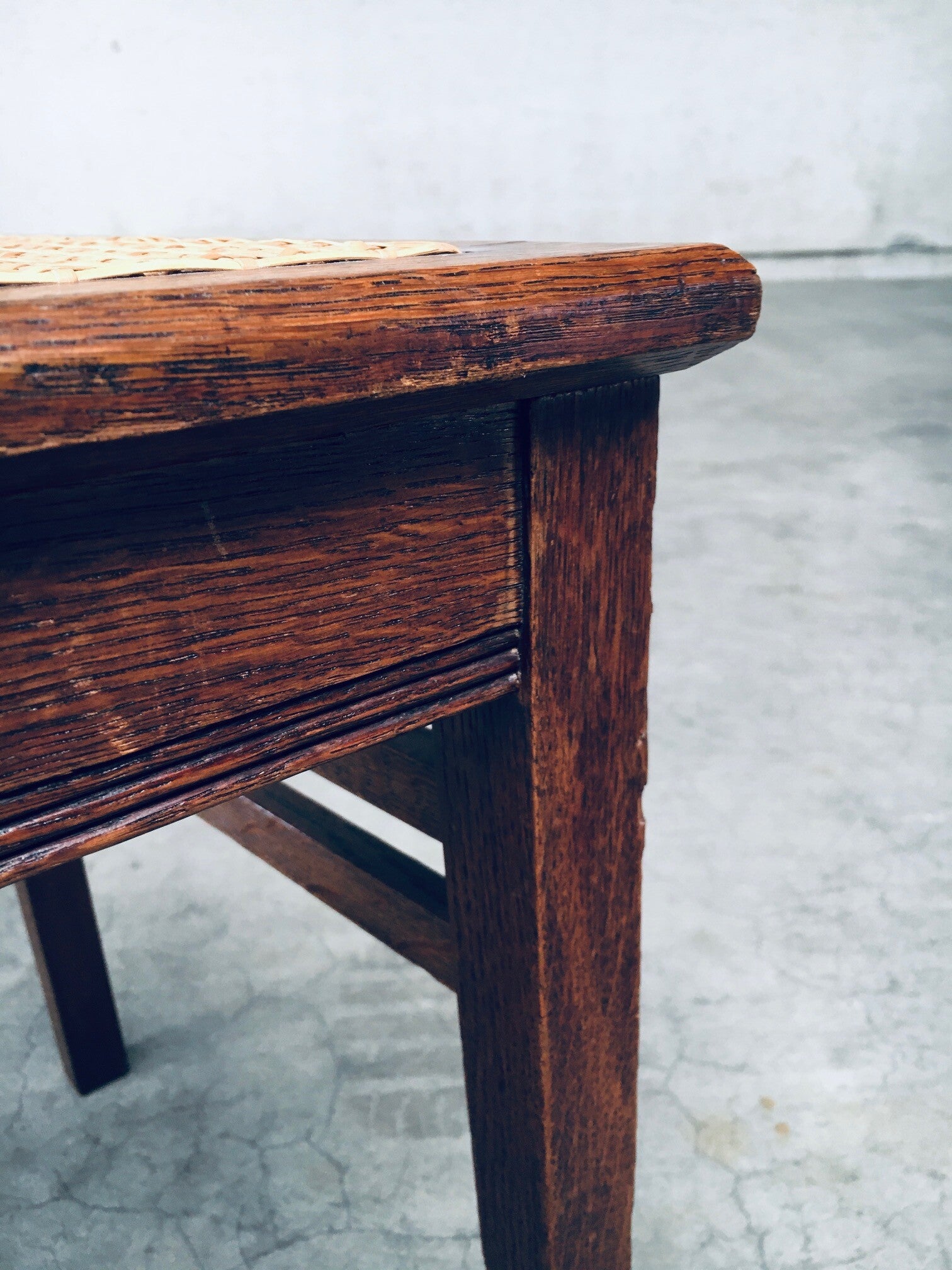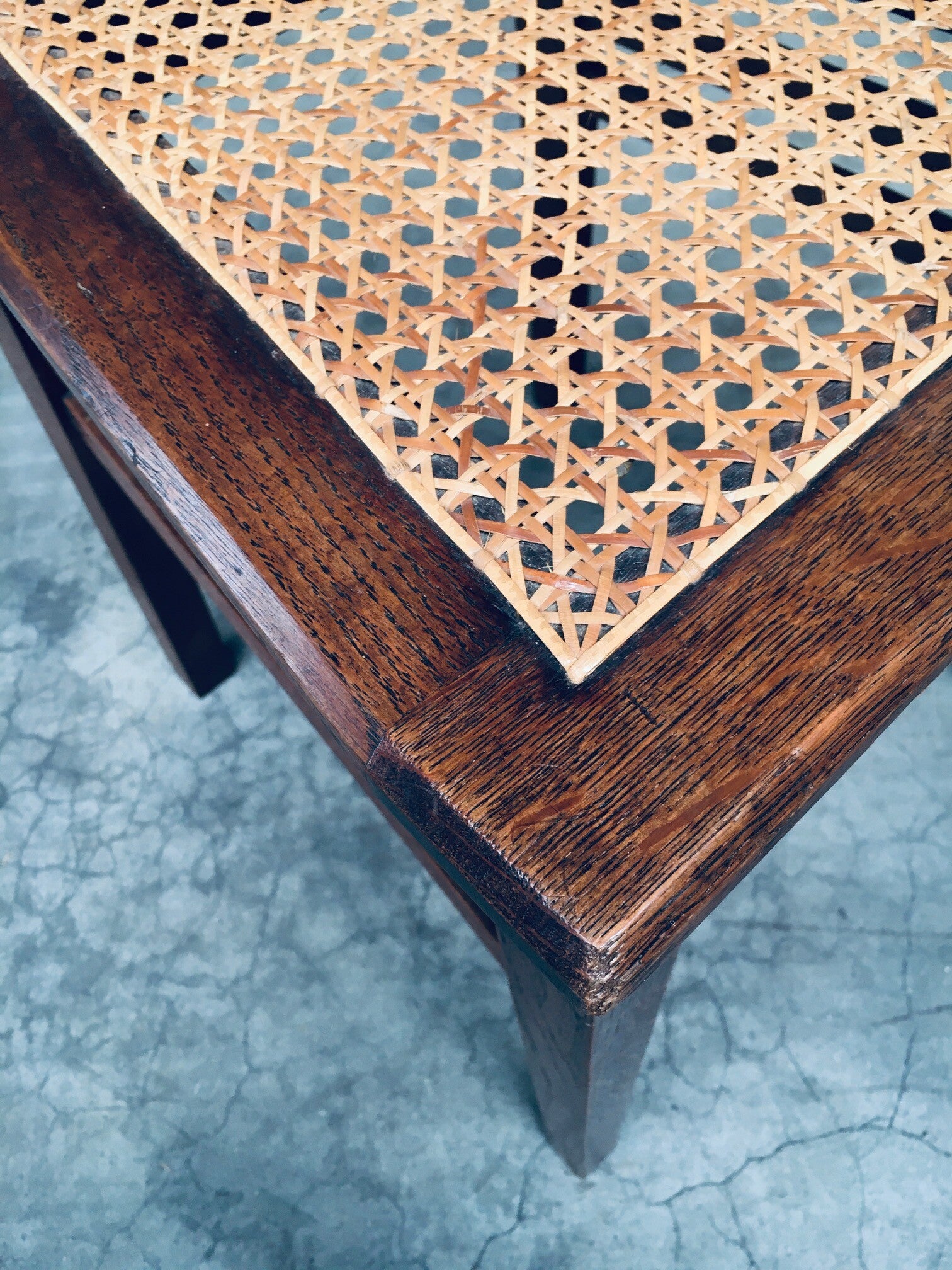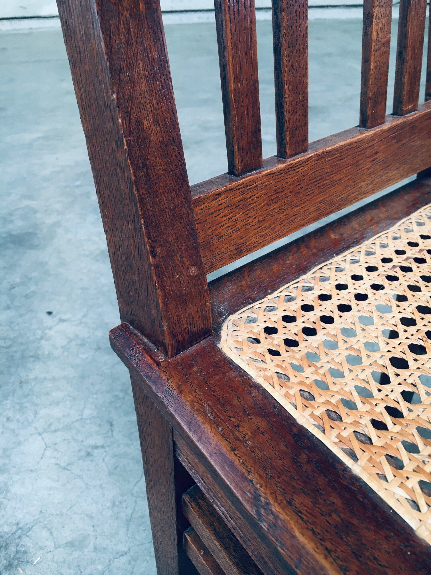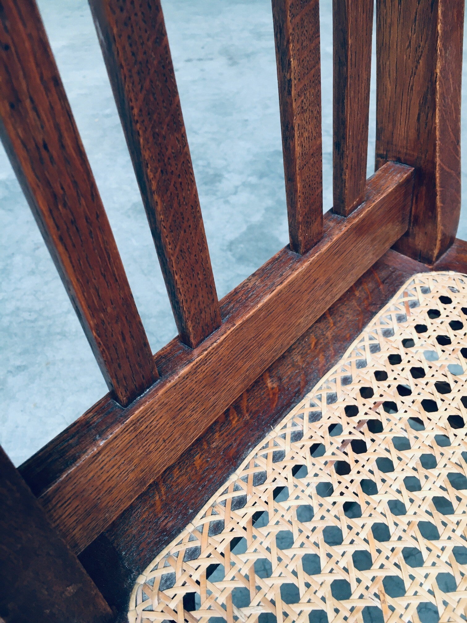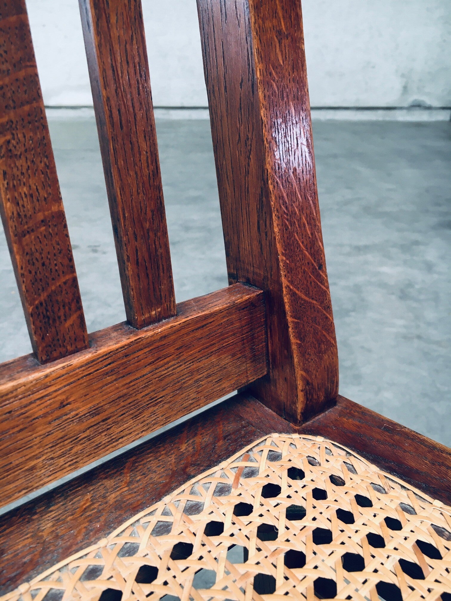 Early 20th Century Art Deco Design Period Dining Chair set of 3. Made in Belgium, 1920's - 30's period. Solid oak constructed chairs with woven webbing cane seats. Beautiful designed and made chairs with well constructed and small details. Like the diamond shape inlay on the top of the backrest, the small bend in the joint from back to seat, the intake at the back. Superb chairs that can be used as sidechairs in any room. Each chair comes in very good, original condition. They measure 91cm high x 43cm wide x 42cm deep. Seat height measures 45cm.