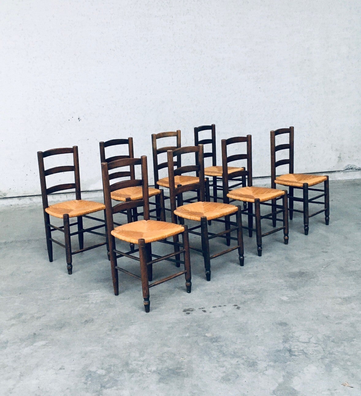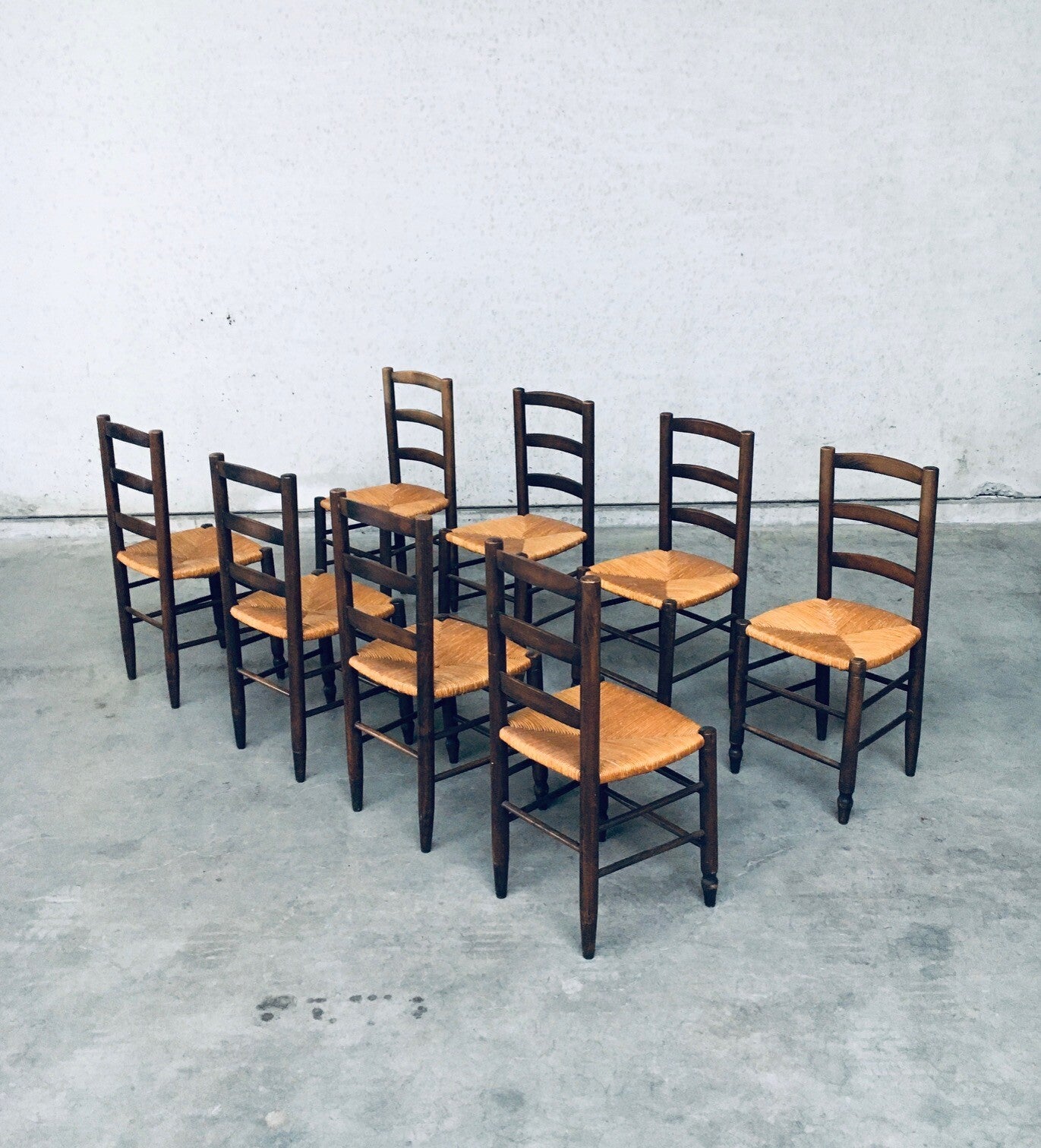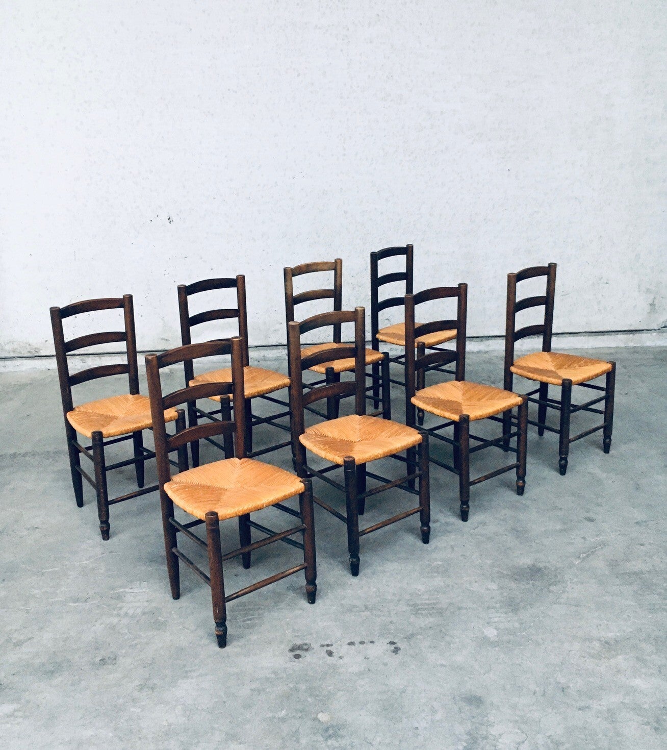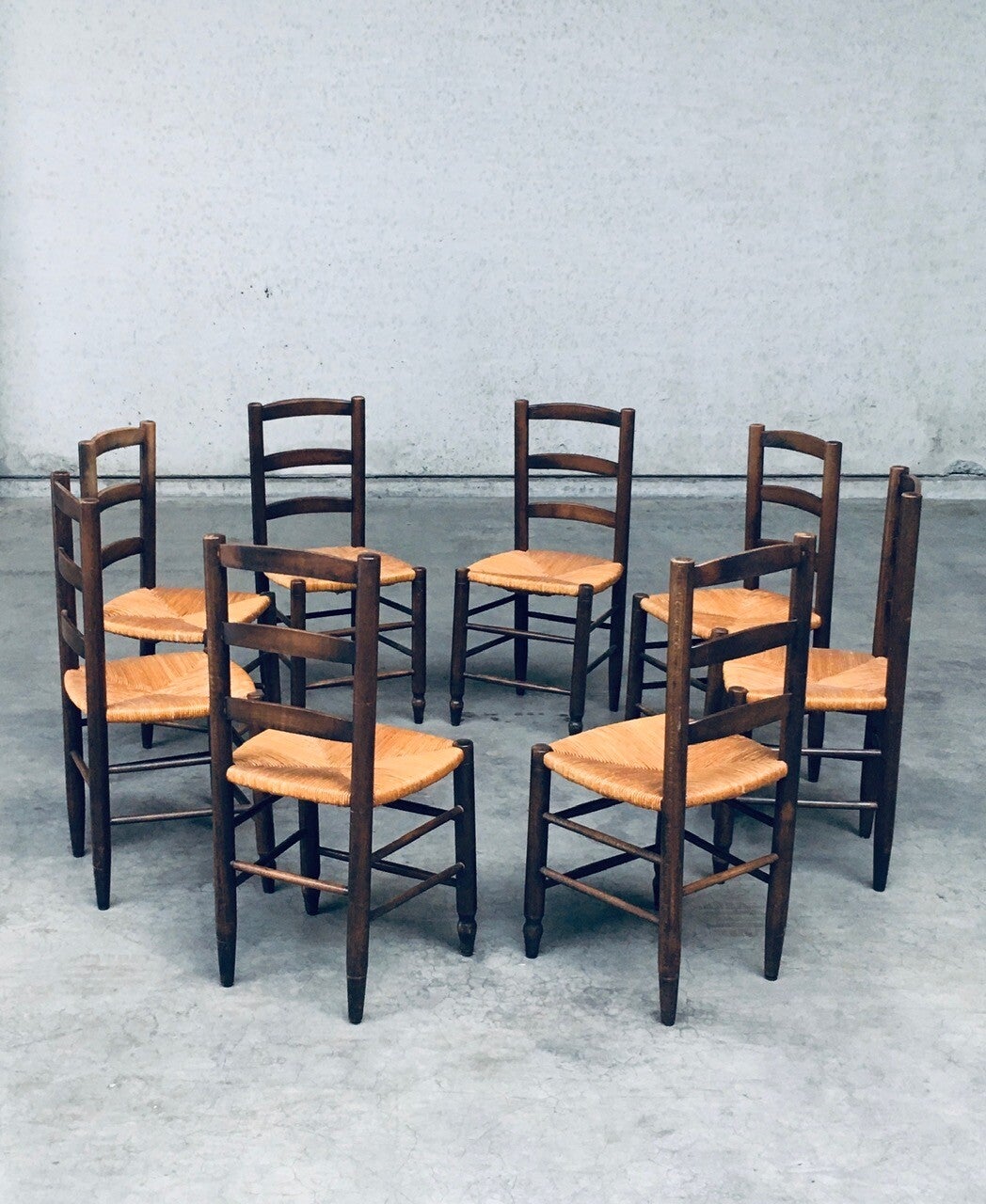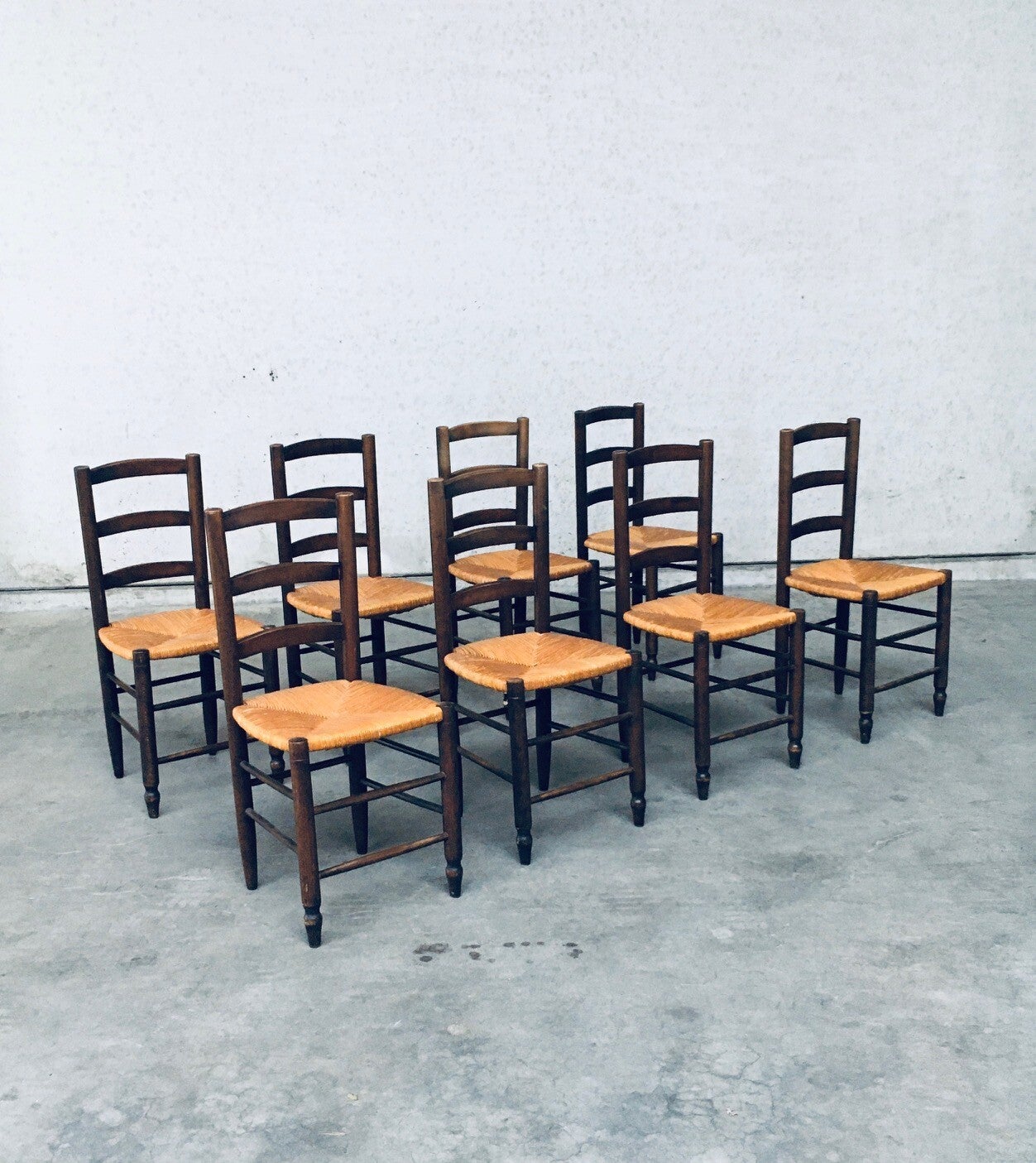 Vintage French Provincial Brutalist Design Patinated Oak & Rush Dining Chairs. Set of 8 chairs. Made in France, 1940's - 50's period. In the manner of Charlotte Perriand number 19 model chairs. Georges Robert style designed chairs. Patinated oak with woven straw / rush seats. Beautiful in their simplicity, these chairs will adorn your large country or design table with grace. All chairs come in good to very good, all original condition. With normal signs of wear from their age and use. Each chair measures 91cm x 41,5cm x 41cm. Seat Height measures 45cm.