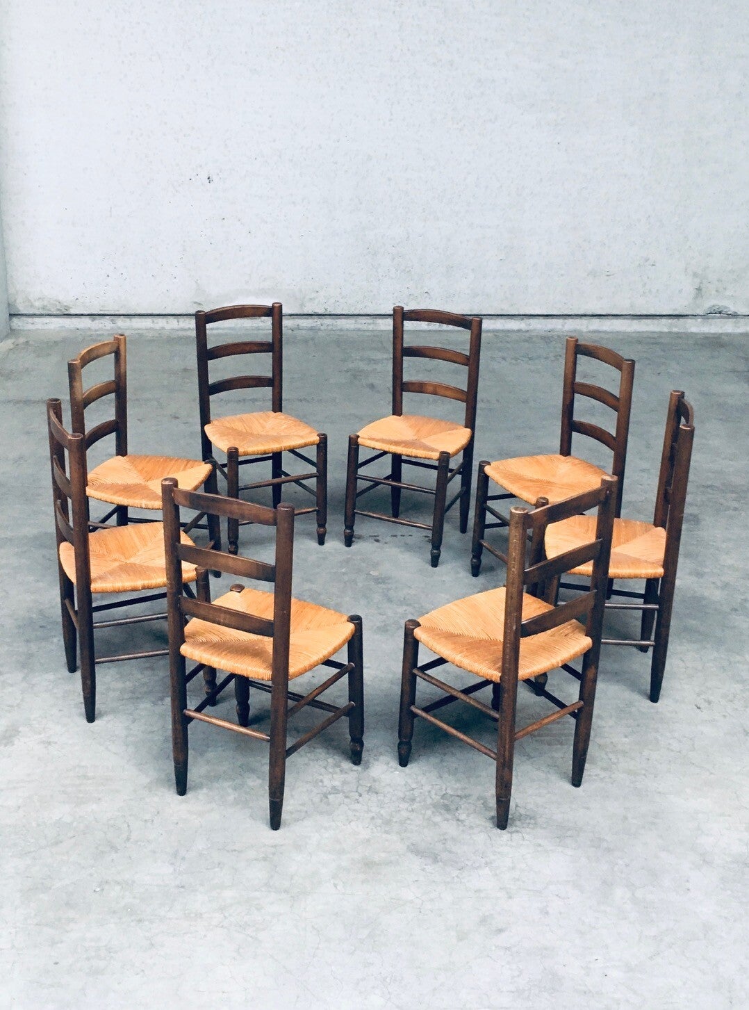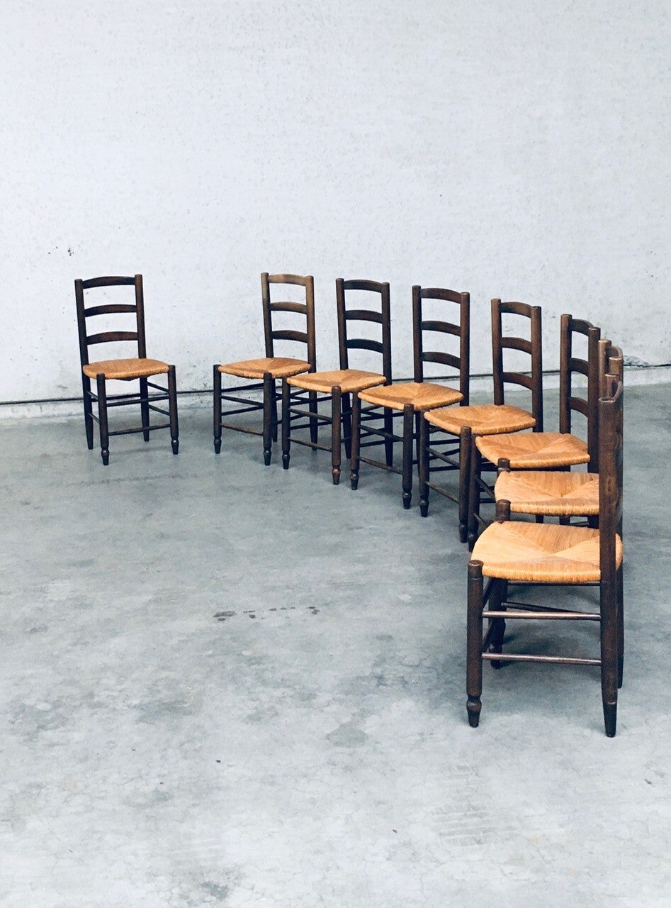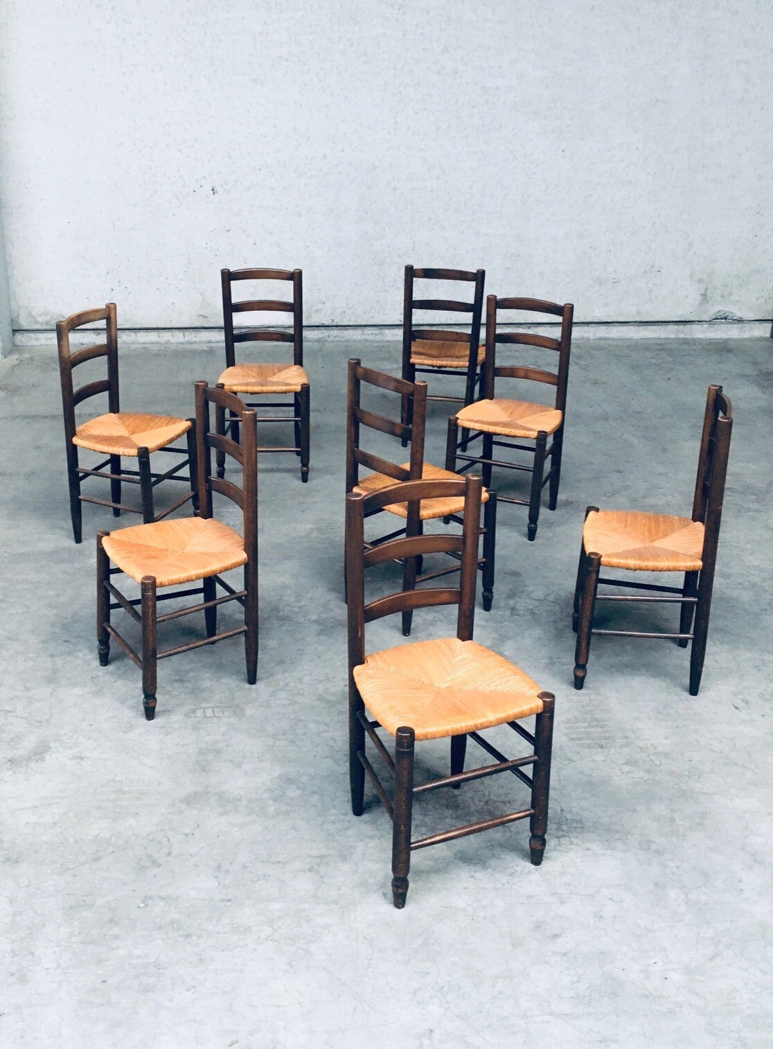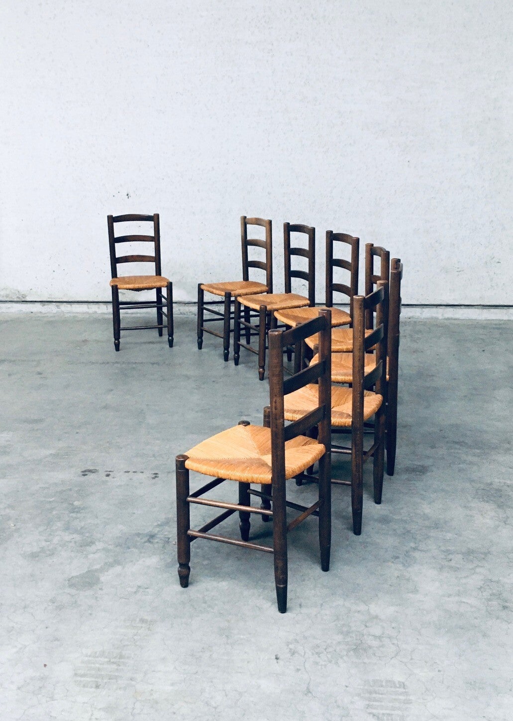 Vintage French Provincial Brutalist Design Patinated Oak & Rush Dining Chairs. Set of 8 chairs. Made in France, 1940's - 50's period. In the manner of Charlotte Perriand number 19 model chairs. Georges Robert style designed chairs. Patinated oak with woven straw / rush seats. Beautiful in their simplicity, these chairs will adorn your large country or design table with grace. All chairs come in good to very good, all original condition. With normal signs of wear from their age and use. Each chair measures 91cm x 41,5cm x 41cm. Seat Height measures 45cm.