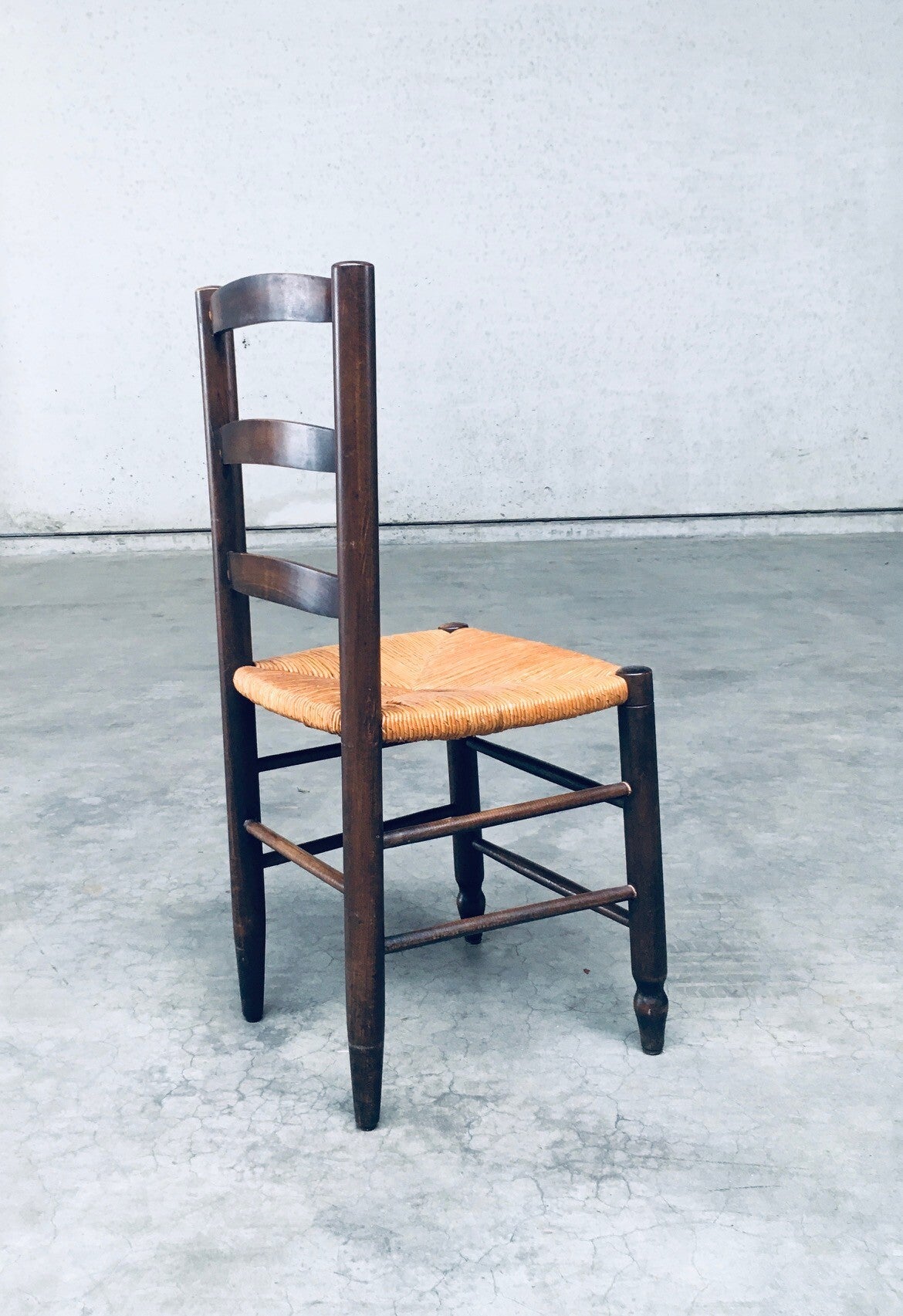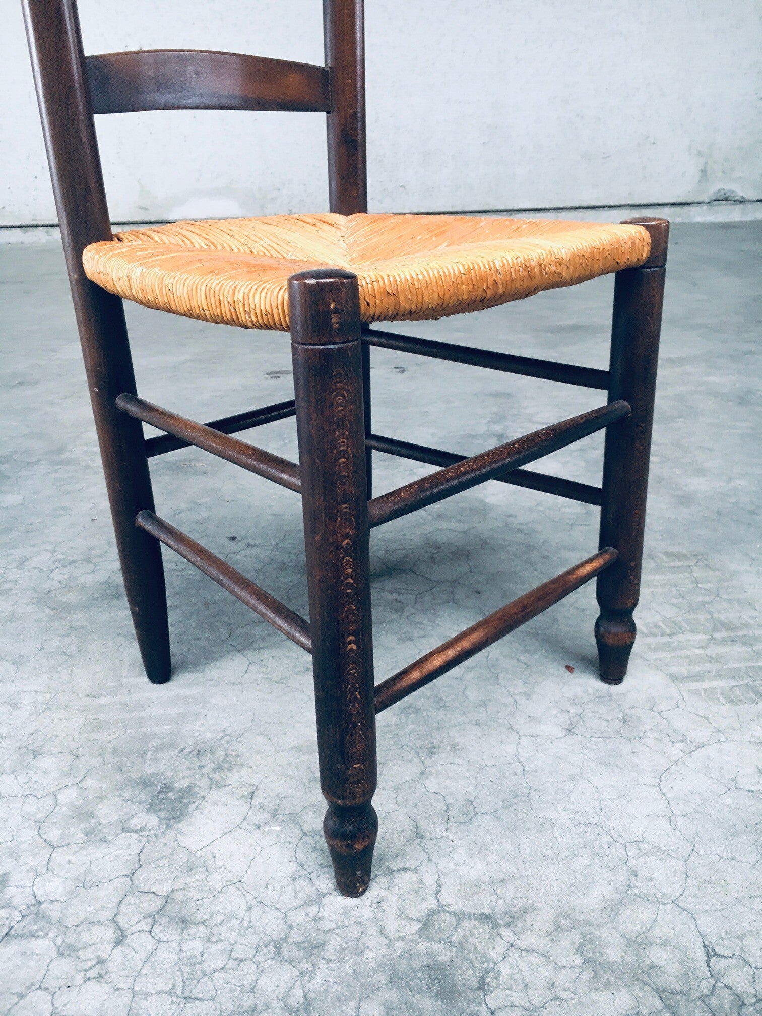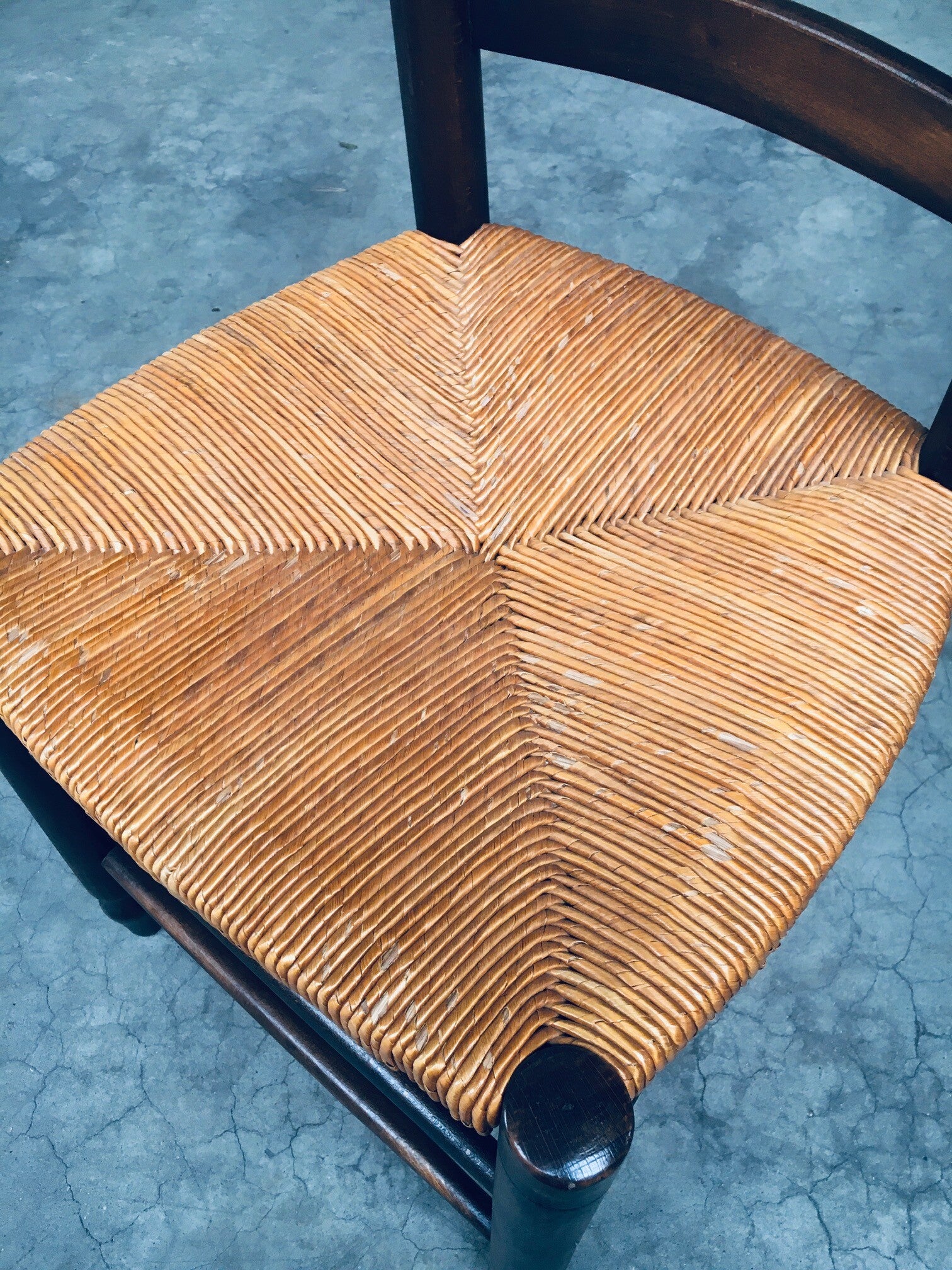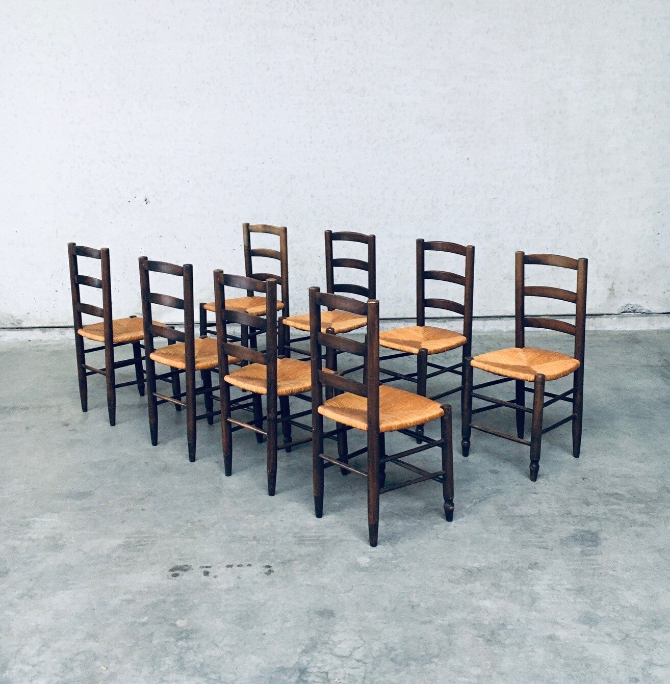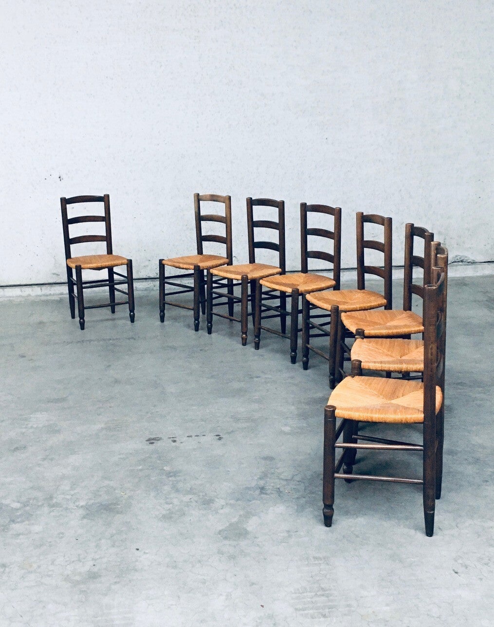 Vintage French Provincial Brutalist Design Patinated Oak & Rush Dining Chairs. Set of 8 chairs. Made in France, 1940's - 50's period. In the manner of Charlotte Perriand number 19 model chairs. Georges Robert style designed chairs. Patinated oak with woven straw / rush seats. Beautiful in their simplicity, these chairs will adorn your large country or design table with grace. All chairs come in good to very good, all original condition. With normal signs of wear from their age and use. Each chair measures 91cm x 41,5cm x 41cm. Seat Height measures 45cm.