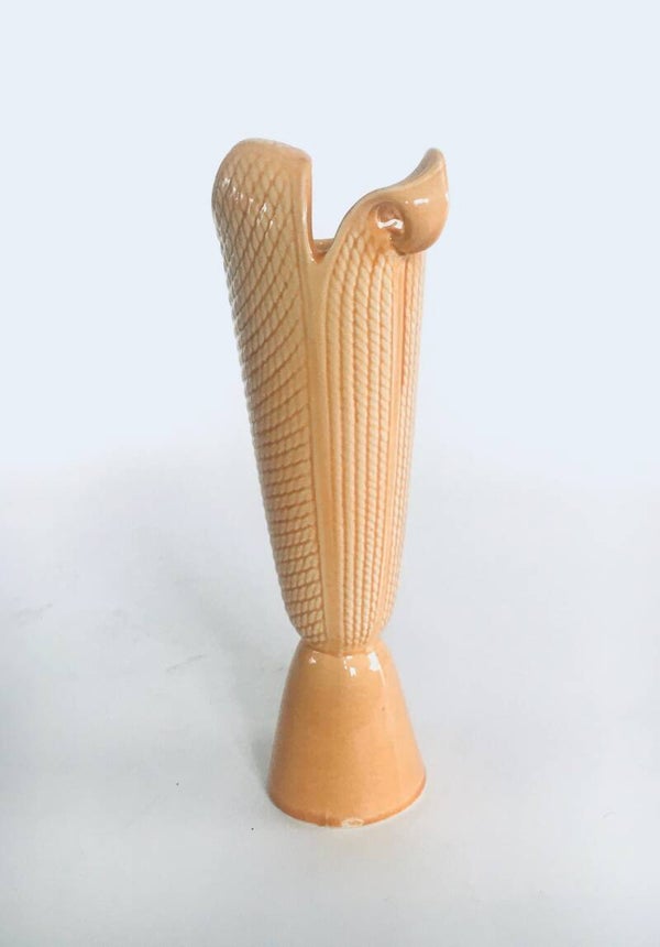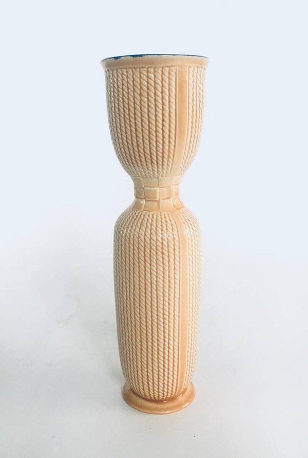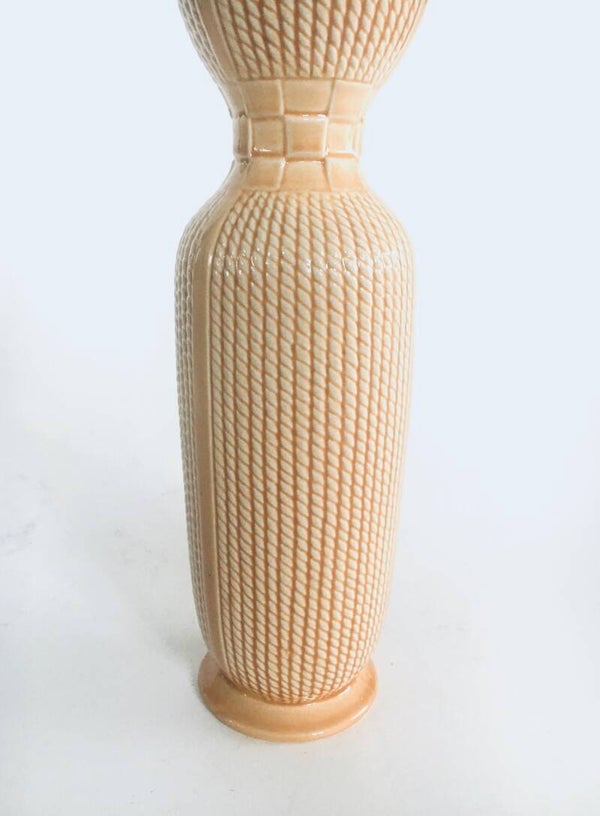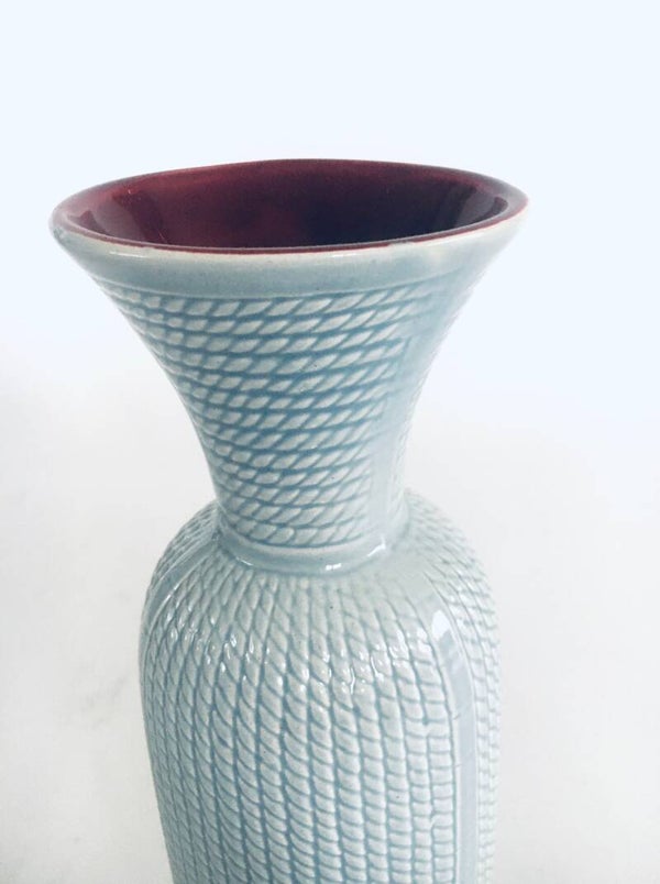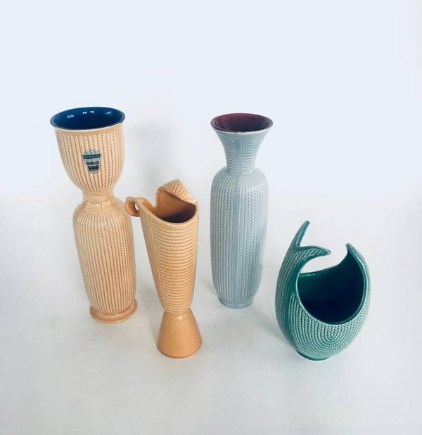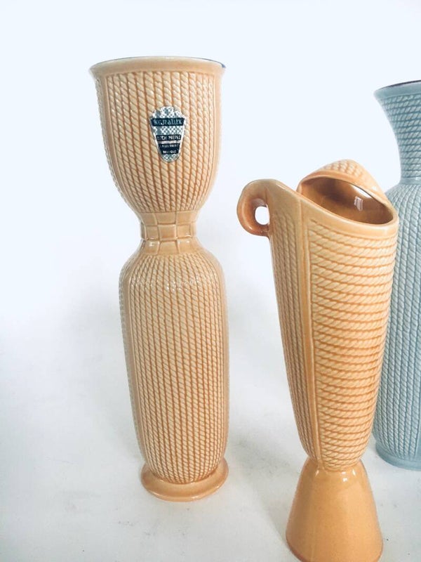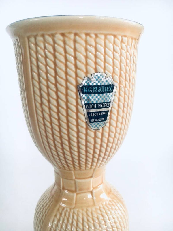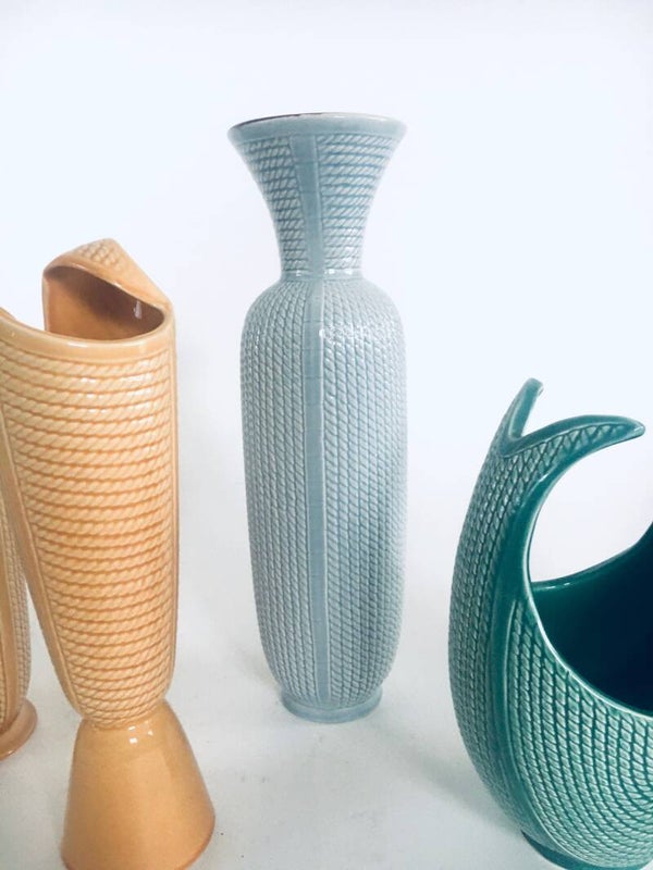 Vintage Midcentury Modern Design Ceramic Art Vase set. Keralux Studio D'Art Vases by Ernest D'Hossche for Boch Freres. Made in Belgium, 1956. All are stamped Keralux with reference / model number on the bottom. One has its original sticker label. Beautiful braided pattern vases in pastel colors. All vases are in very good condition. No damages. They measure; Green model: 23,5cm x 15cm x 13,5cm - Yellow trophy model: 30cm x 10cm x 9cm - Pale grey blue model: 36,5cm x 10,5cm x 10,5cm - Yellow pinched model: 38,5cm x 11,5cm x 11,5cm.
