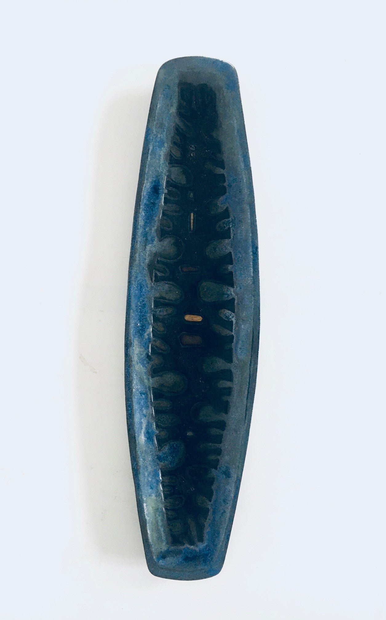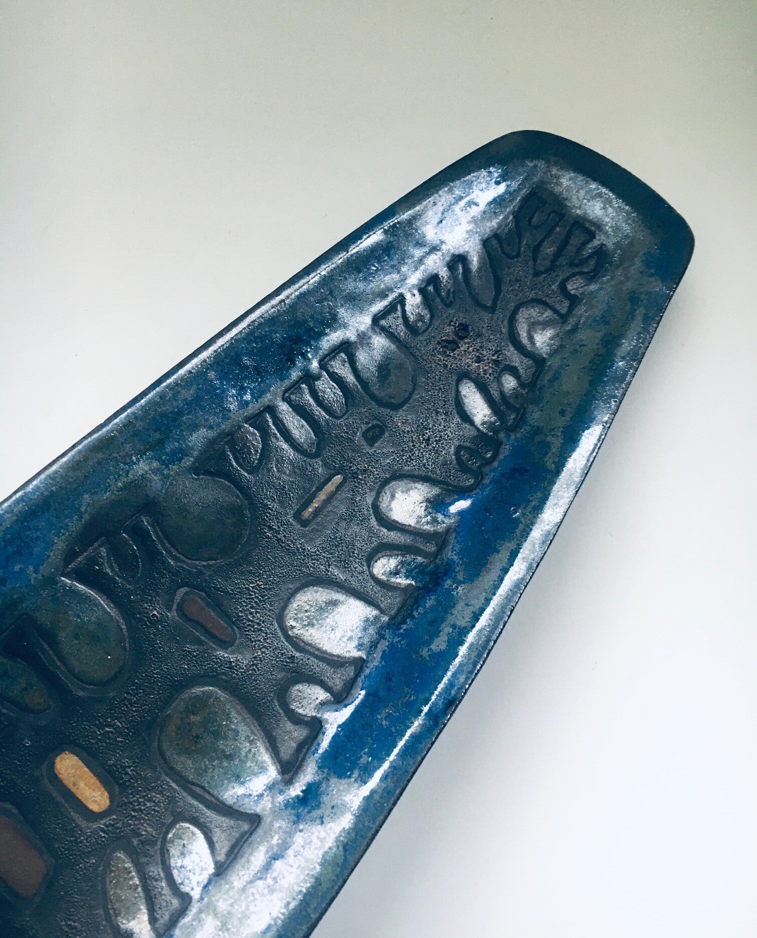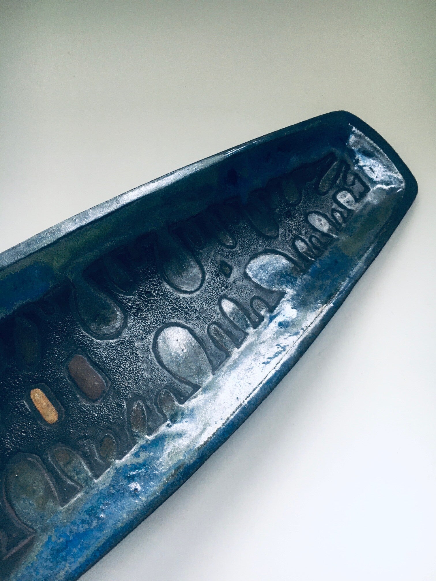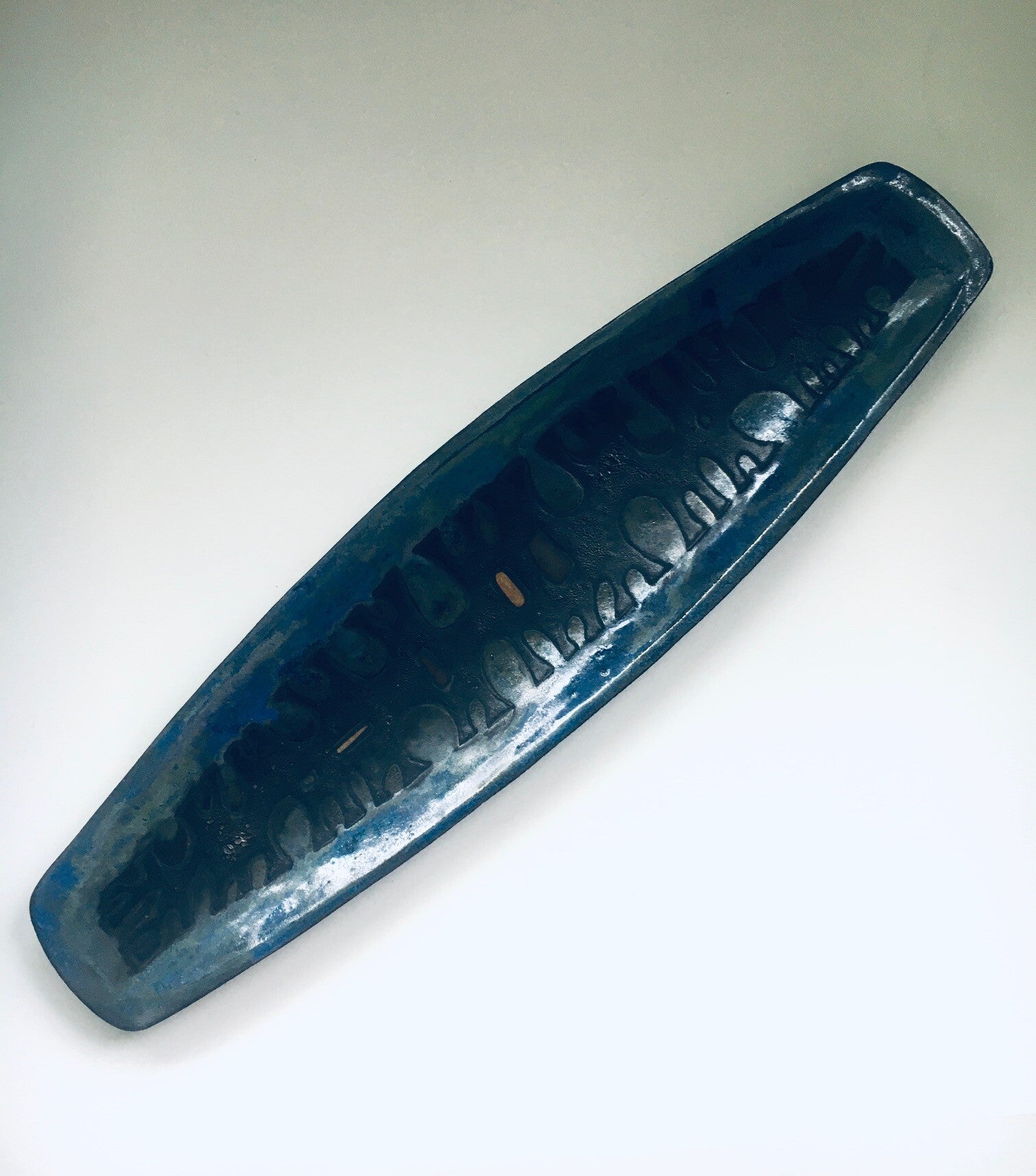 Vintage Midcentury Brutalist Design Art Ceramic Surfboard Dish by Studio Perignem. Made in Belgium, 1950's / 60's period. Impressive large surfboard shape bowl / dish in blues, black and pale orange glazes. This is not marked or lost its mark sticker which is common for these dishes. Beautiful made attributed dish in the style of Rogier Vandeweghe for Studio Perignem. This comes in very good condition, no damage. Measures 3,5cm x 58,5cm x 15cm.