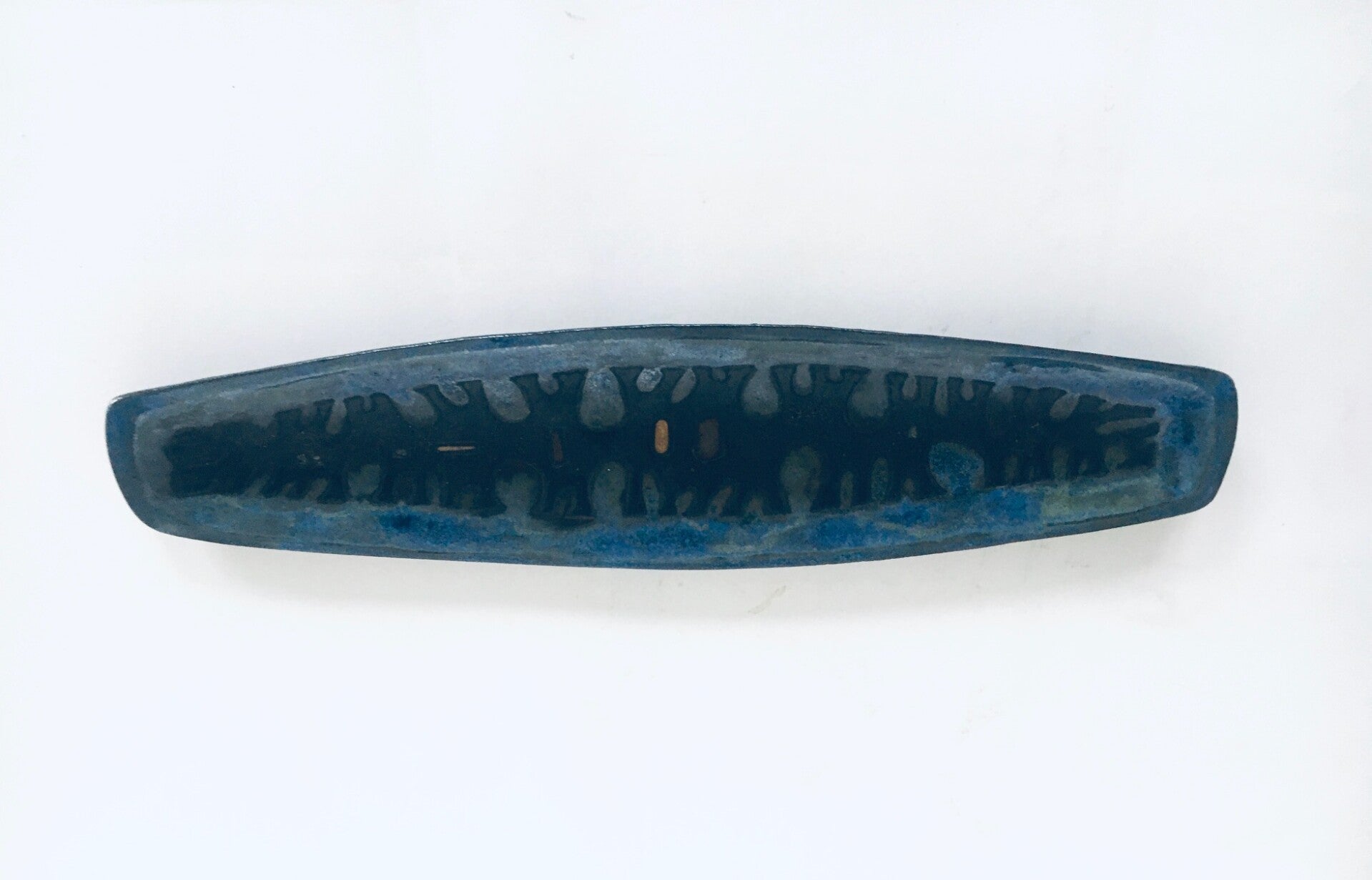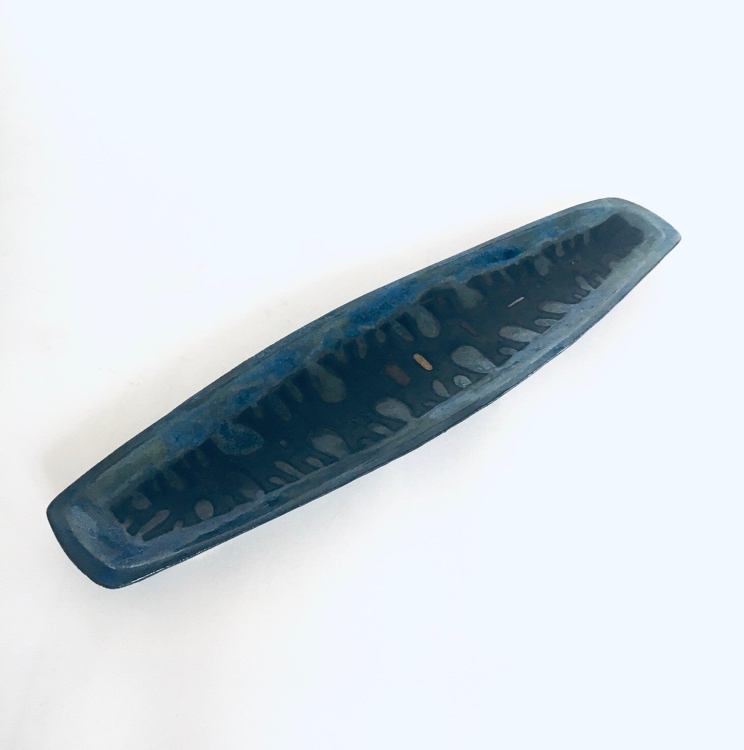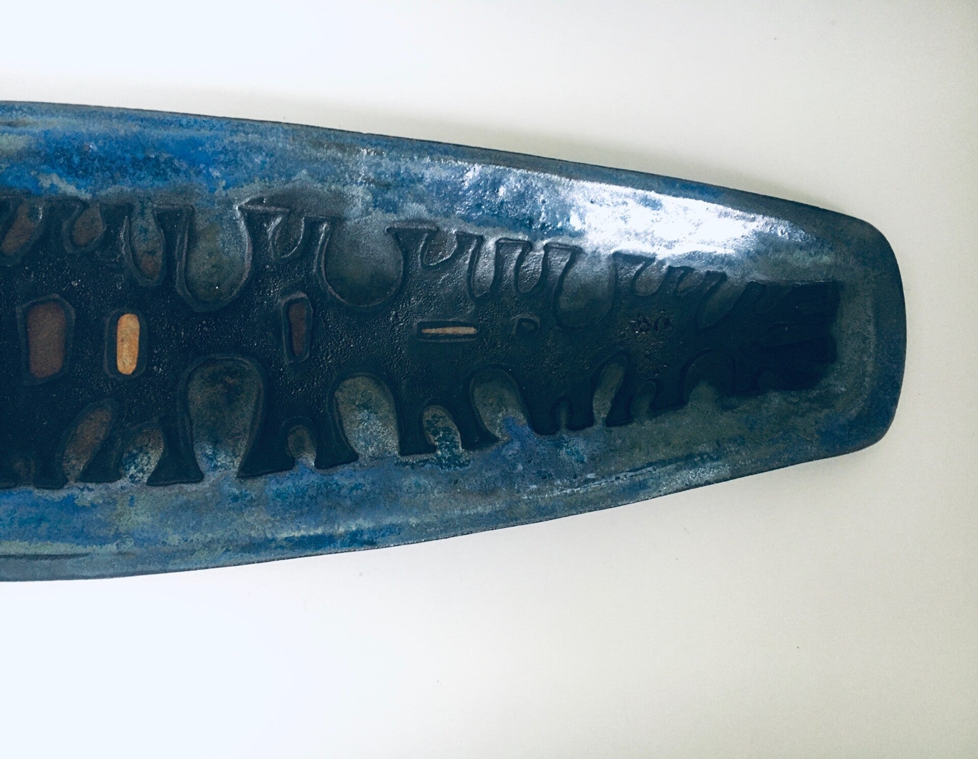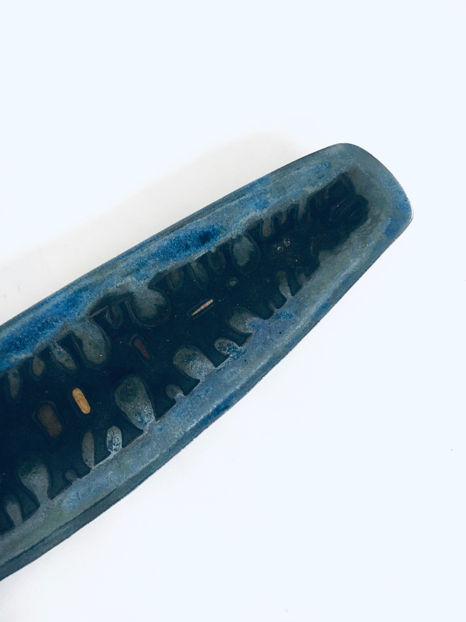 Vintage Midcentury Brutalist Design Art Ceramic Surfboard Dish by Studio Perignem. Made in Belgium, 1950's / 60's period. Impressive large surfboard shape bowl / dish in blues, black and pale orange glazes. This is not marked or lost its mark sticker which is common for these dishes. Beautiful made attributed dish in the style of Rogier Vandeweghe for Studio Perignem. This comes in very good condition, no damage. Measures 3,5cm x 58,5cm x 15cm.