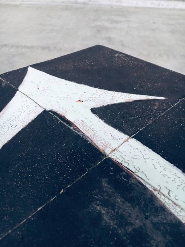 Handmade Artist made Ceramic Tile Side table. Made in Belgium, 1960's period. Studio Pottery made ceramic tiles with pale blue lightning bolt design on matt black, fitted in a steel welded rectangular base. This comes in good, original condition. Has normal wear for it's age and use. Some minor chippings on the tiles - see pictures. Measures 36cm x 57,5cm x 38,5cm.