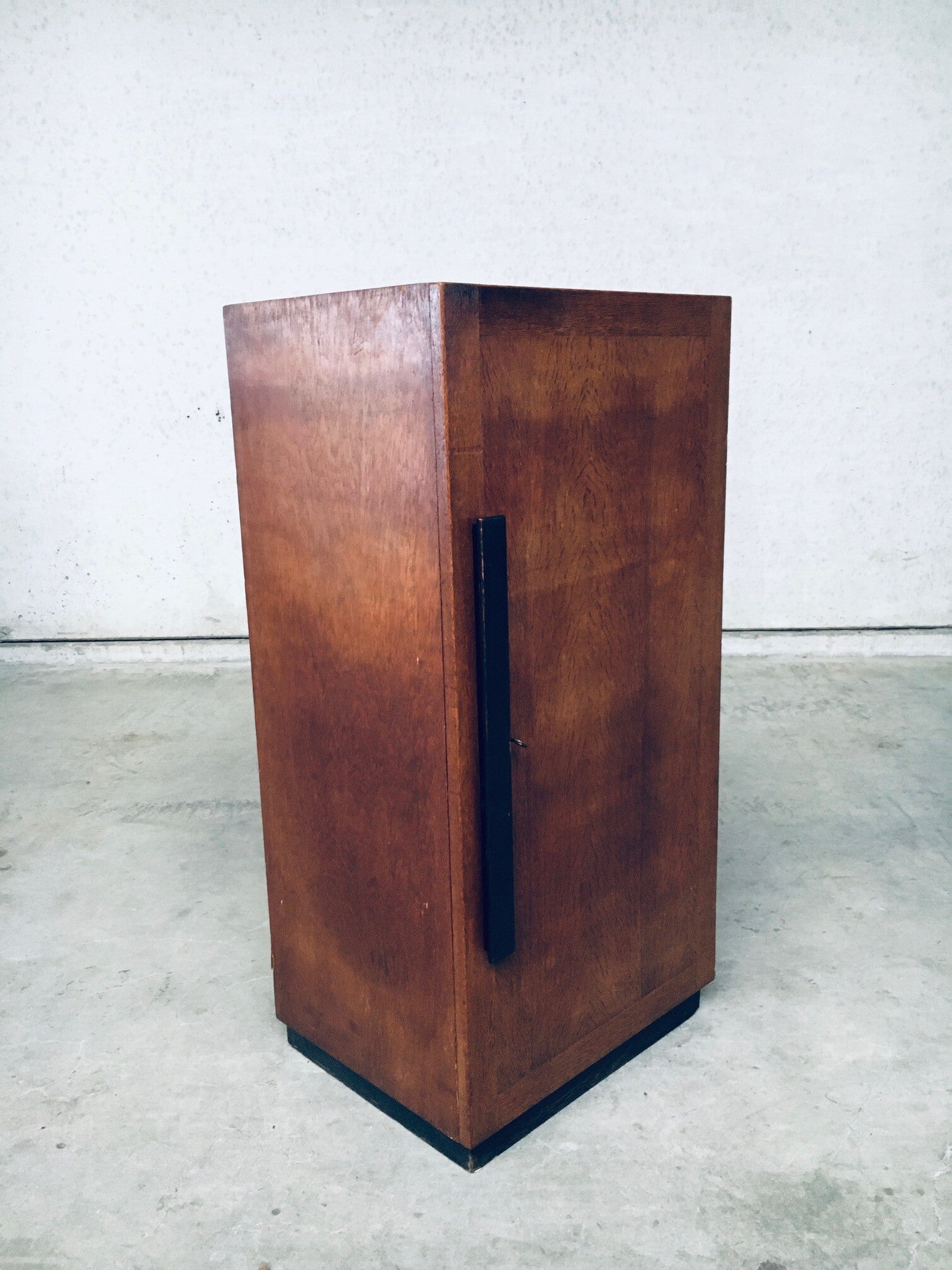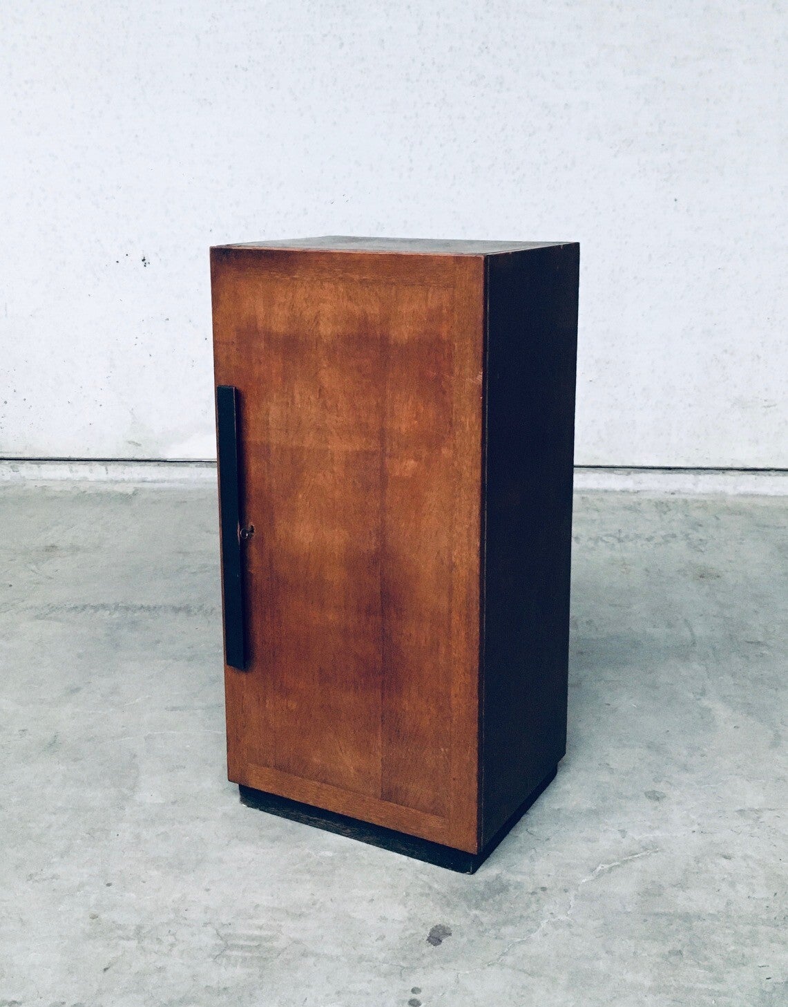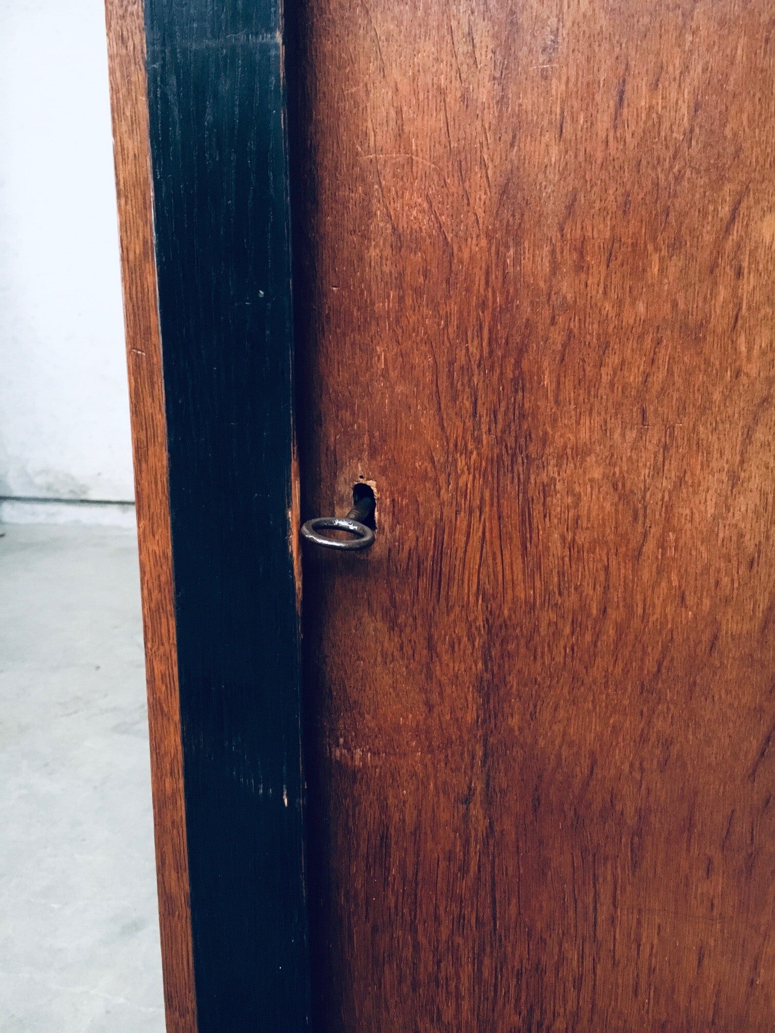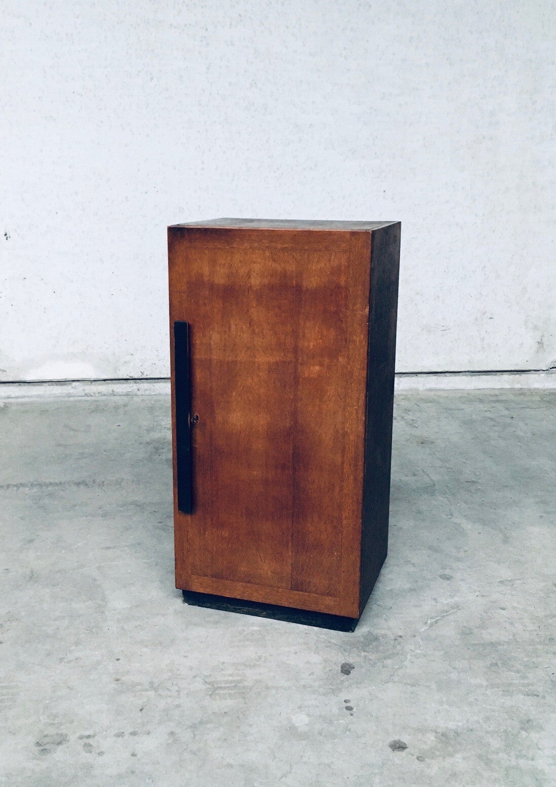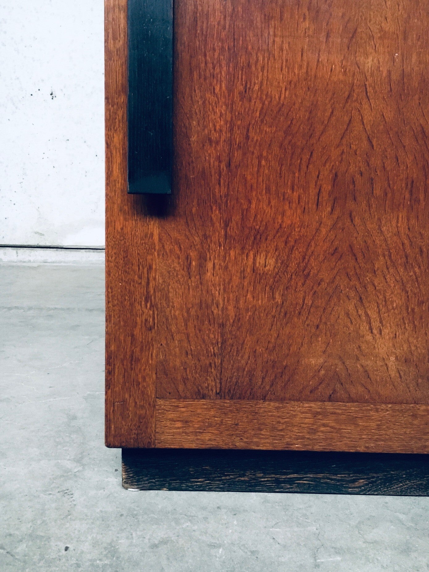 Early 20th Century Design High Cabinet in the style of Le Corbusier. Made in France, 1920's period. Oak constructed cabinet with carved black stained long handle and black painted base. Has different height compartments inside with two drawers, one has a brass handle, the other a keyhole. Probably missing a larger drawer underneath the 2 smaller drawers. Beautiful in it's simplicit, construction and use of materials which is remenissant to Le Corbusier designs. This comes in good, all original condition, with signs of it's use and age. Measures 122cm x 61cm x 47cm.
