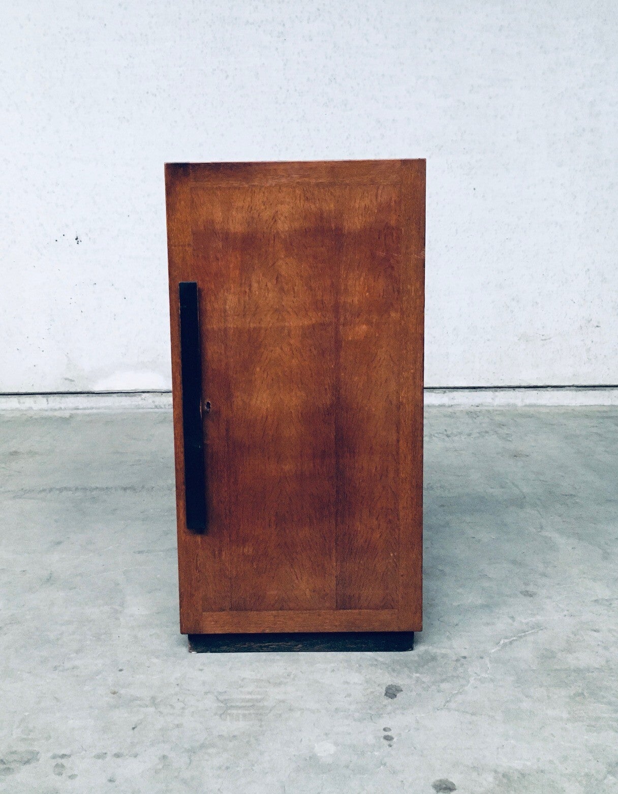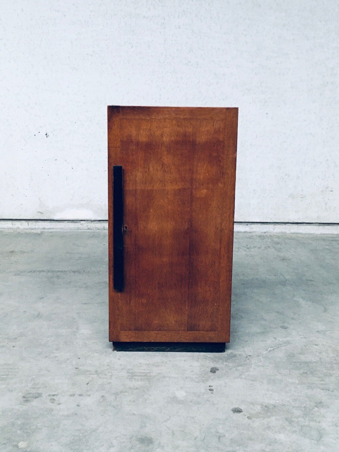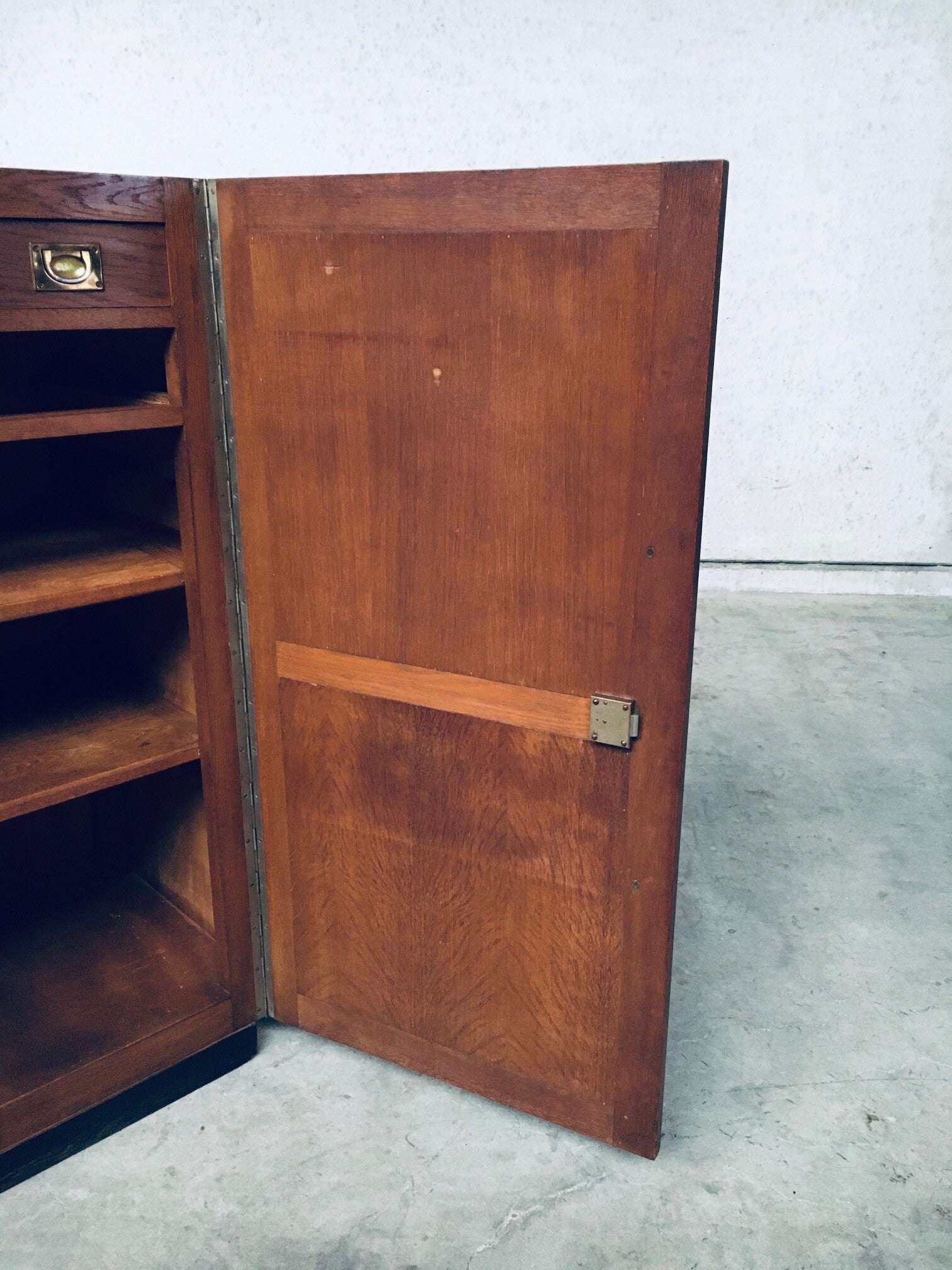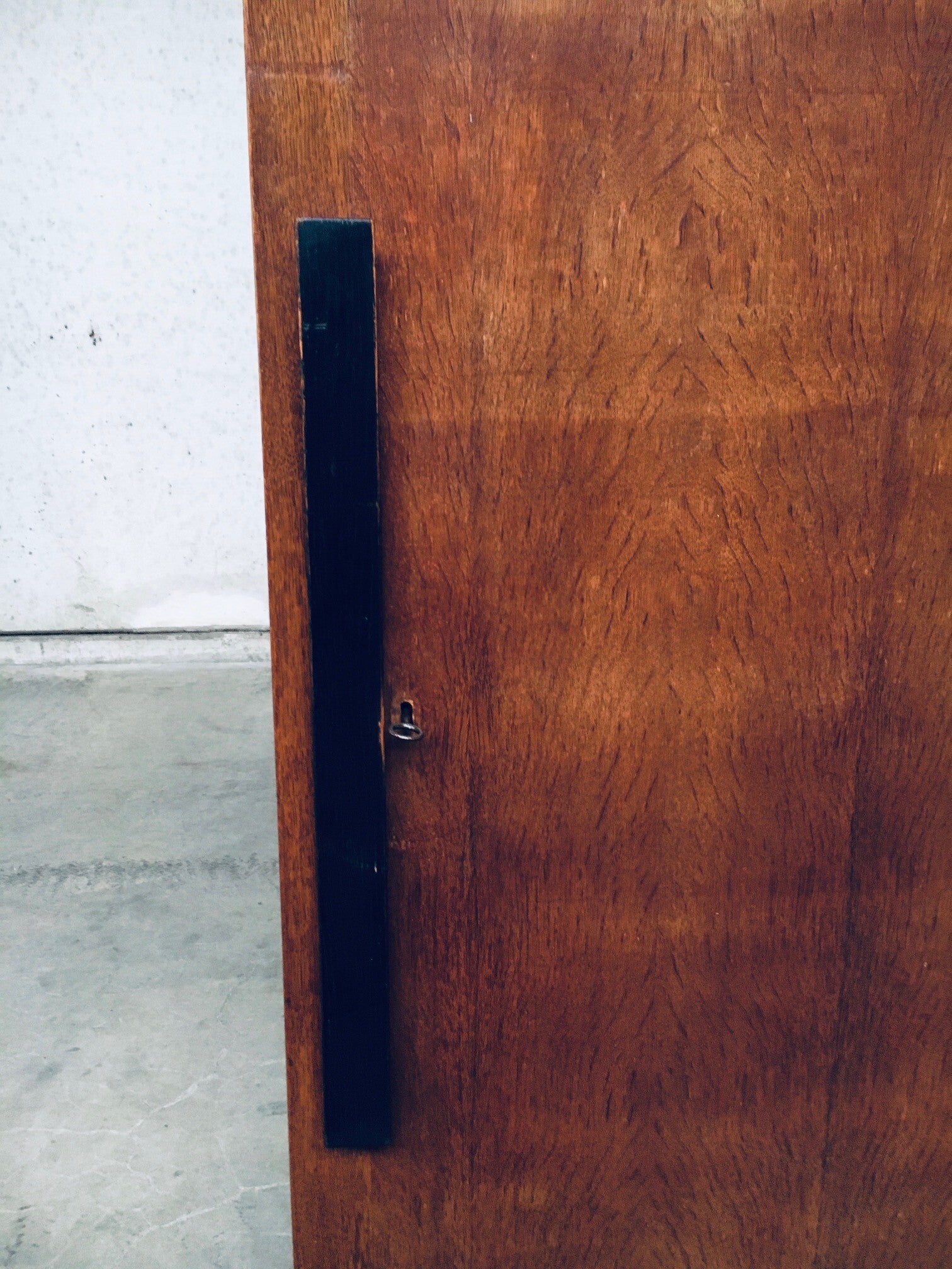 Early 20th Century Design High Cabinet in the style of Le Corbusier. Made in France, 1920's period. Oak constructed cabinet with carved black stained long handle and black painted base. Has different height compartments inside with two drawers, one has a brass handle, the other a keyhole. Probably missing a larger drawer underneath the 2 smaller drawers. Beautiful in it's simplicit, construction and use of materials which is remenissant to Le Corbusier designs. This comes in good, all original condition, with signs of it's use and age. Measures 122cm x 61cm x 47cm.