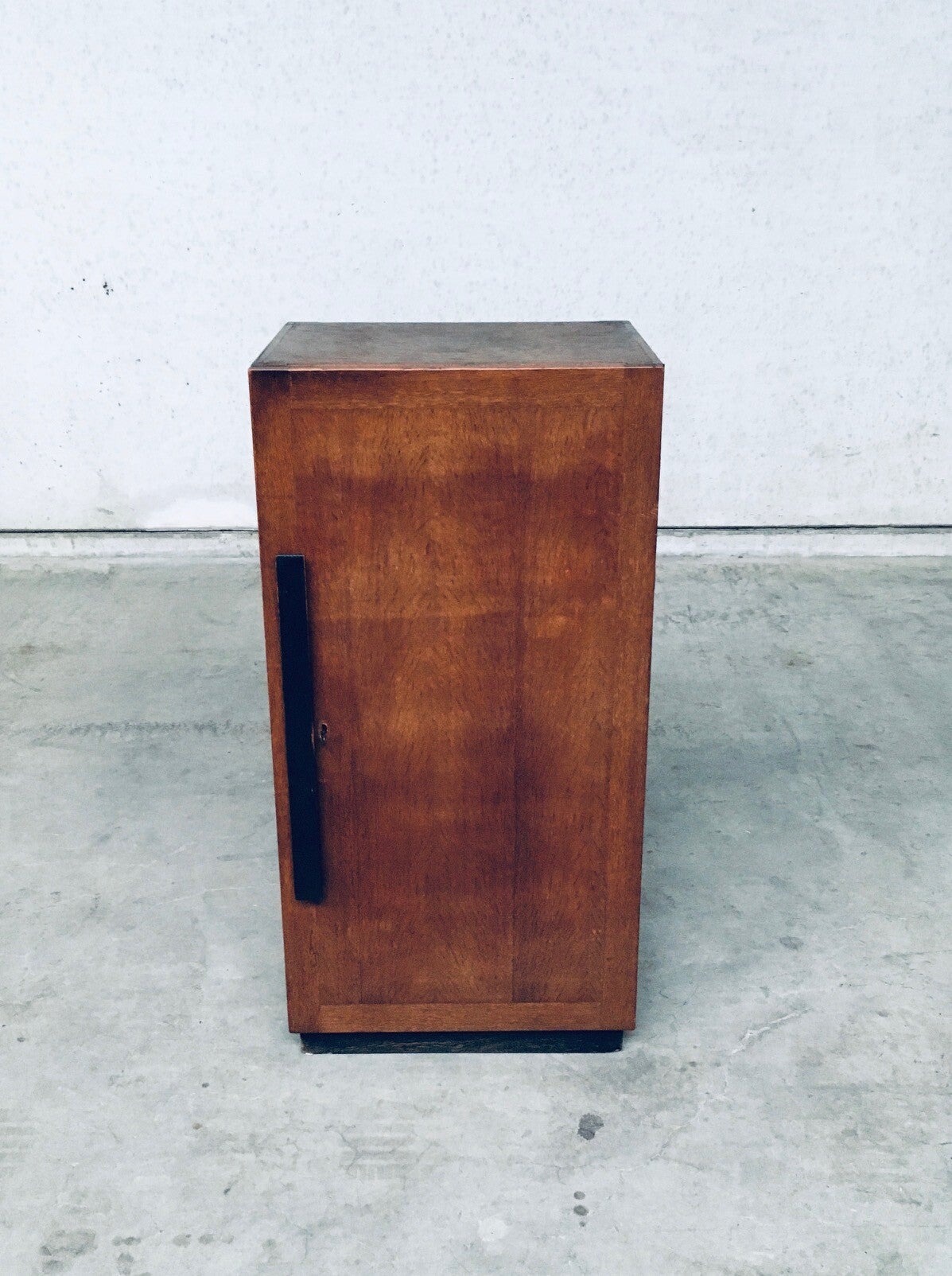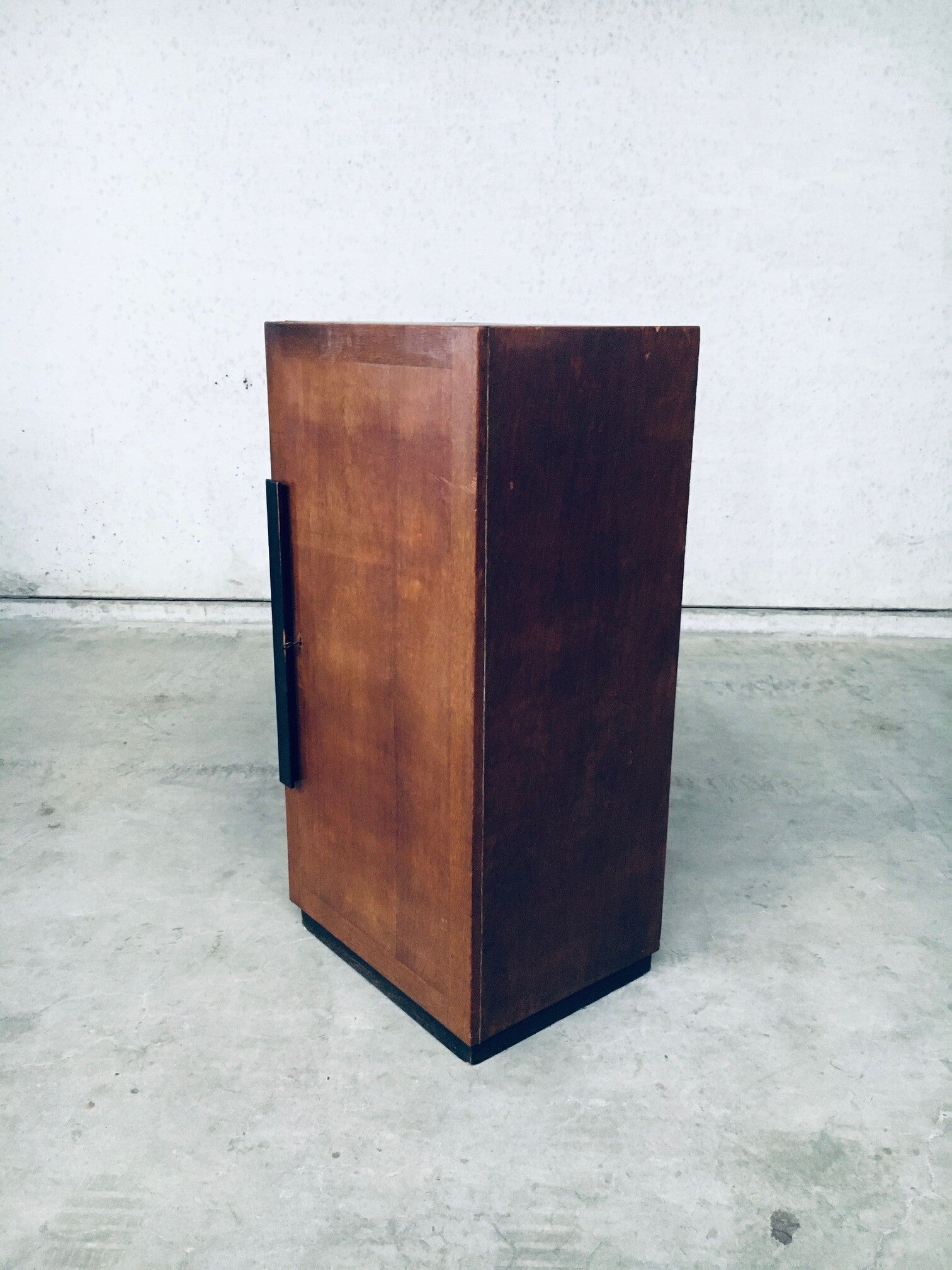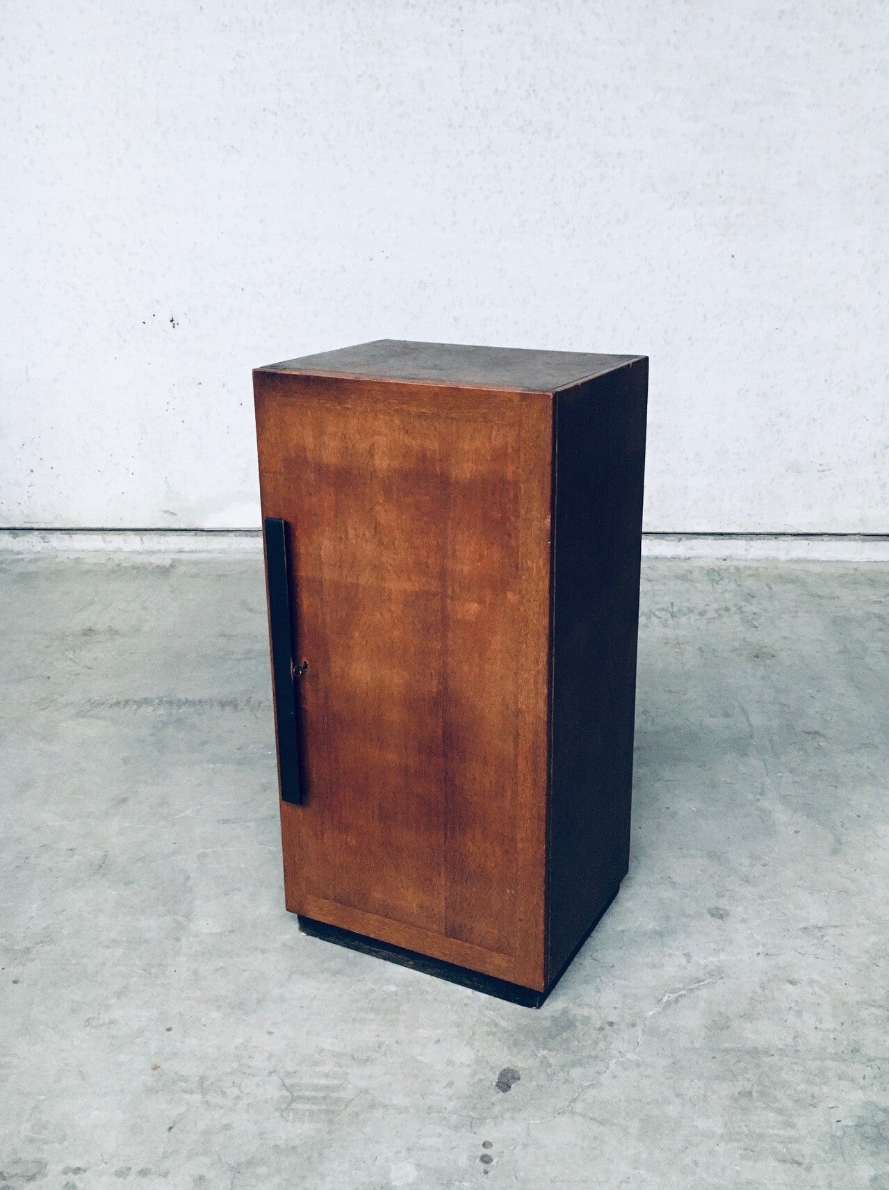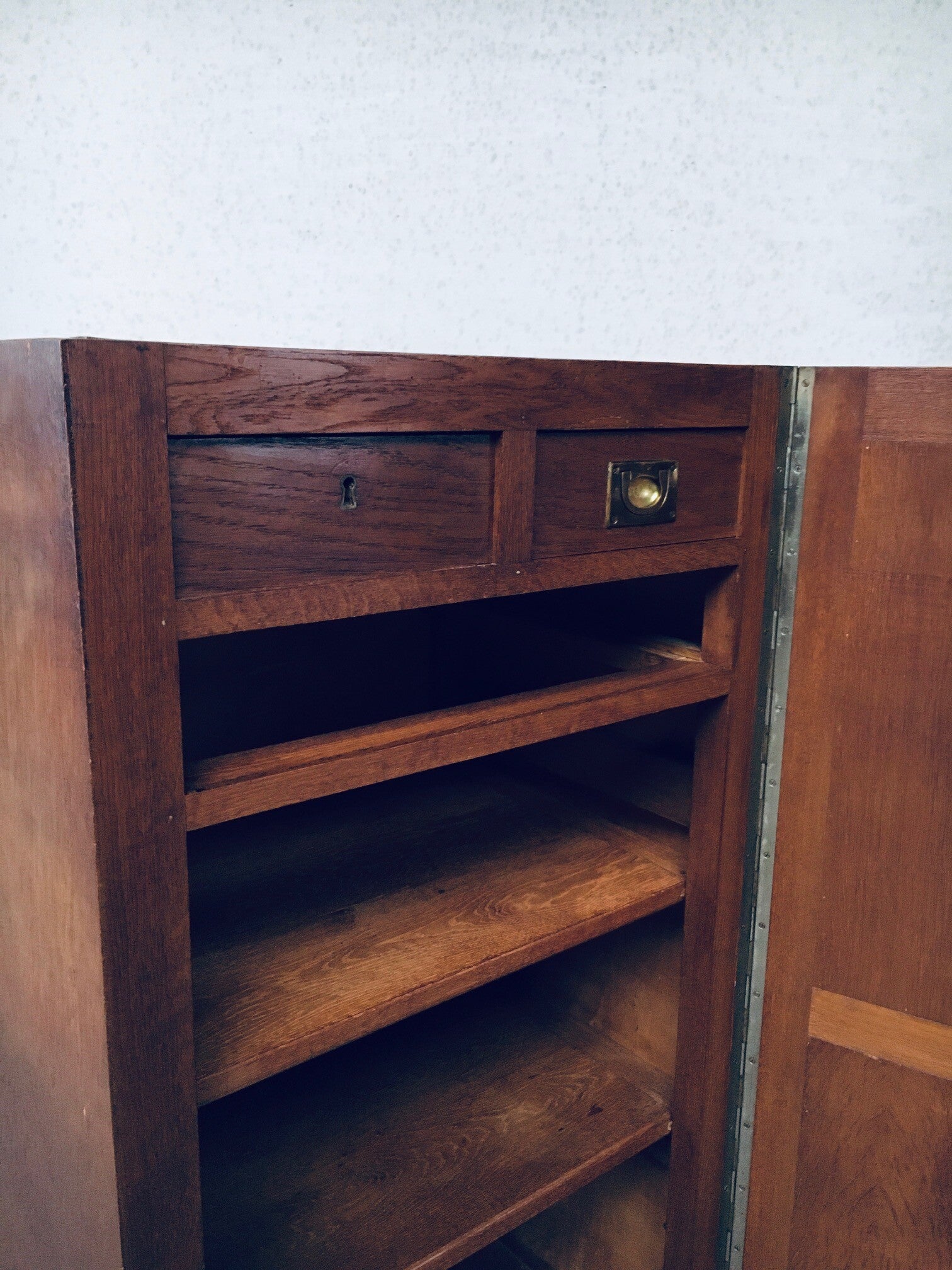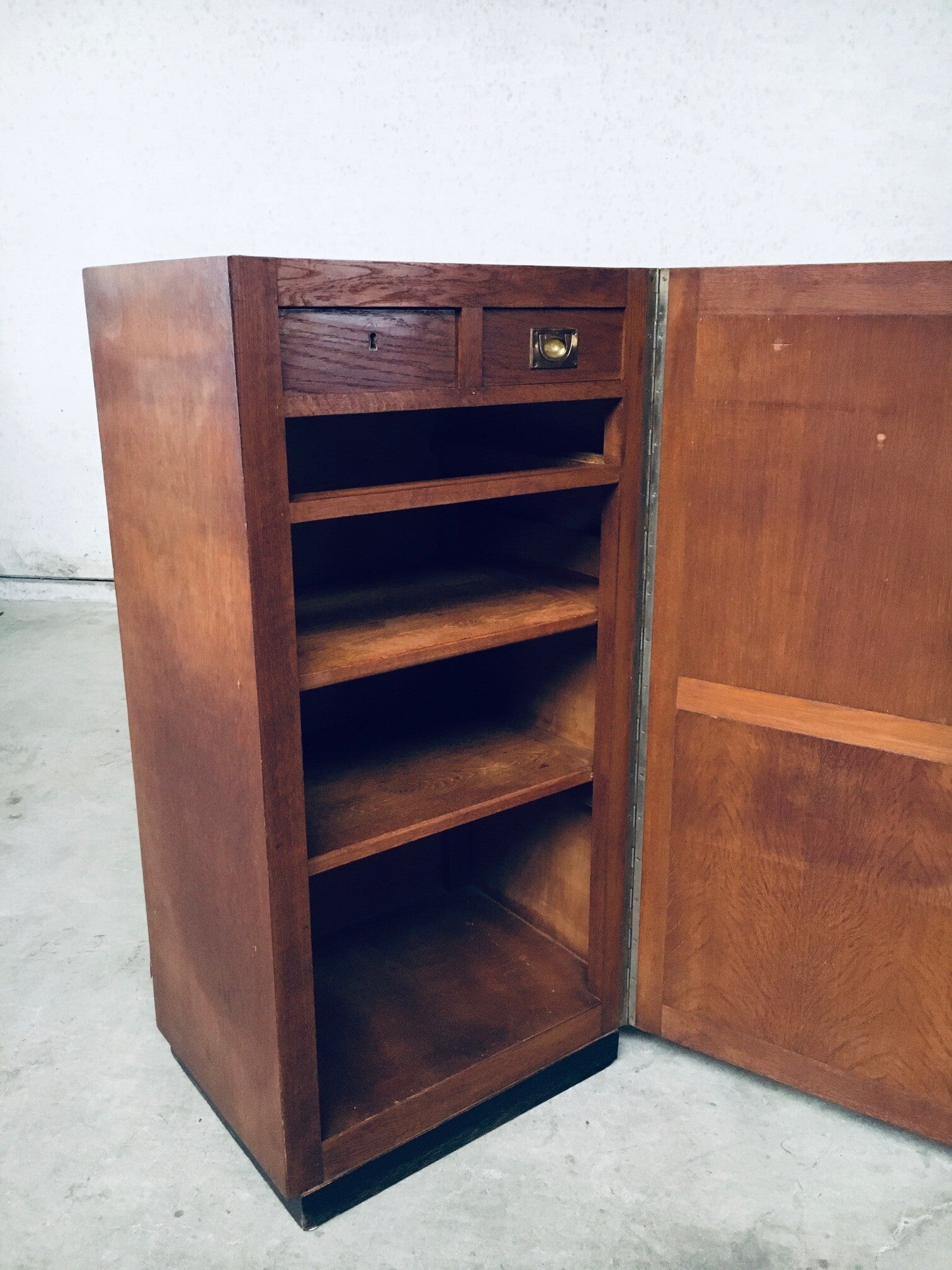 Early 20th Century Design High Cabinet in the style of Le Corbusier. Made in France, 1920's period. Oak constructed cabinet with carved black stained long handle and black painted base. Has different height compartments inside with two drawers, one has a brass handle, the other a keyhole. Probably missing a larger drawer underneath the 2 smaller drawers. Beautiful in it's simplicit, construction and use of materials which is remenissant to Le Corbusier designs. This comes in good, all original condition, with signs of it's use and age. Measures 122cm x 61cm x 47cm.