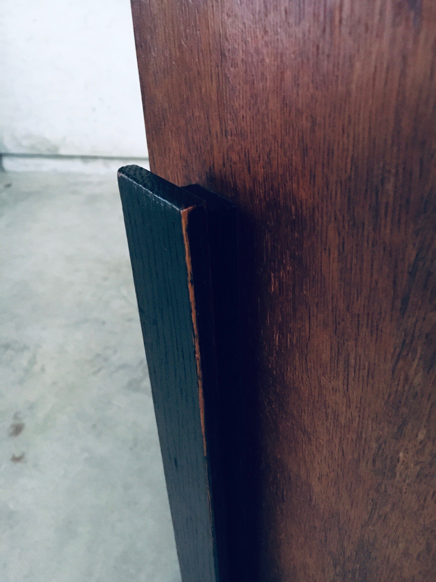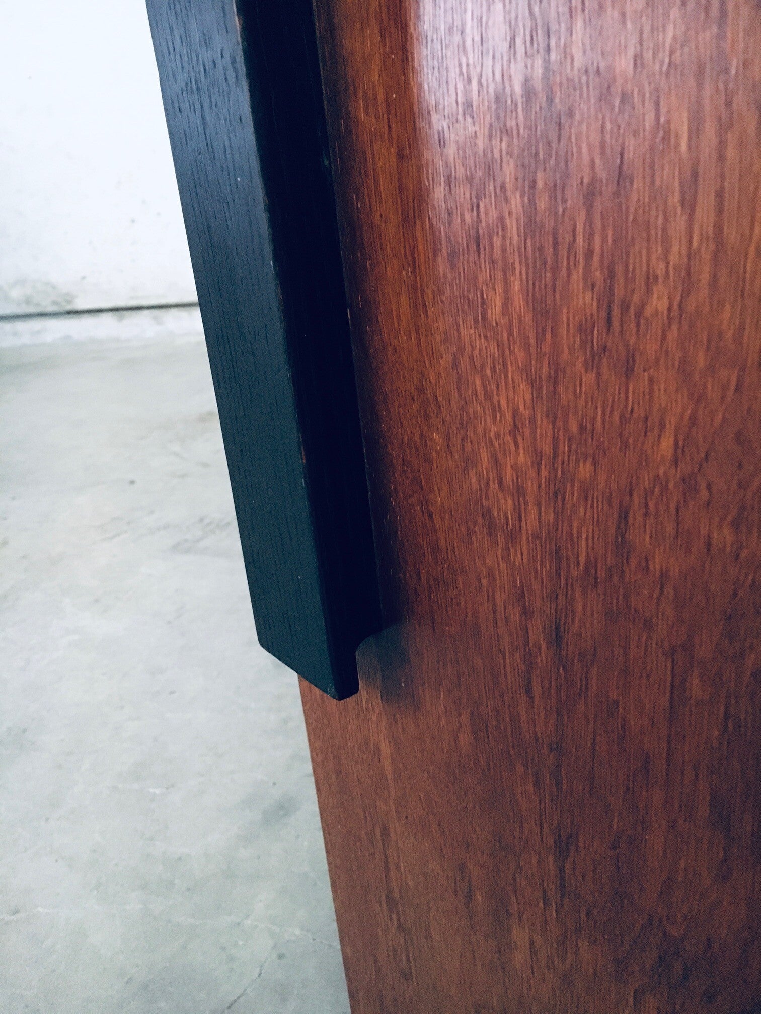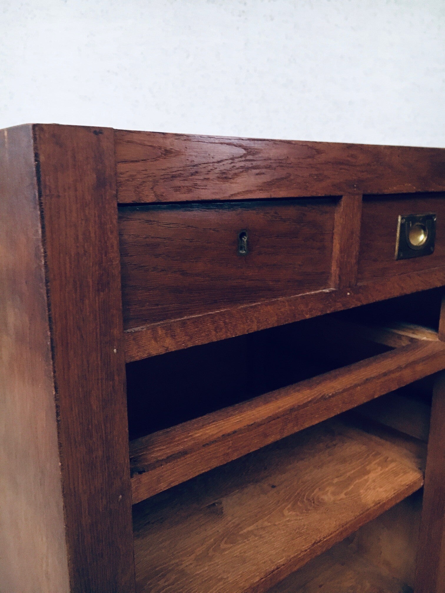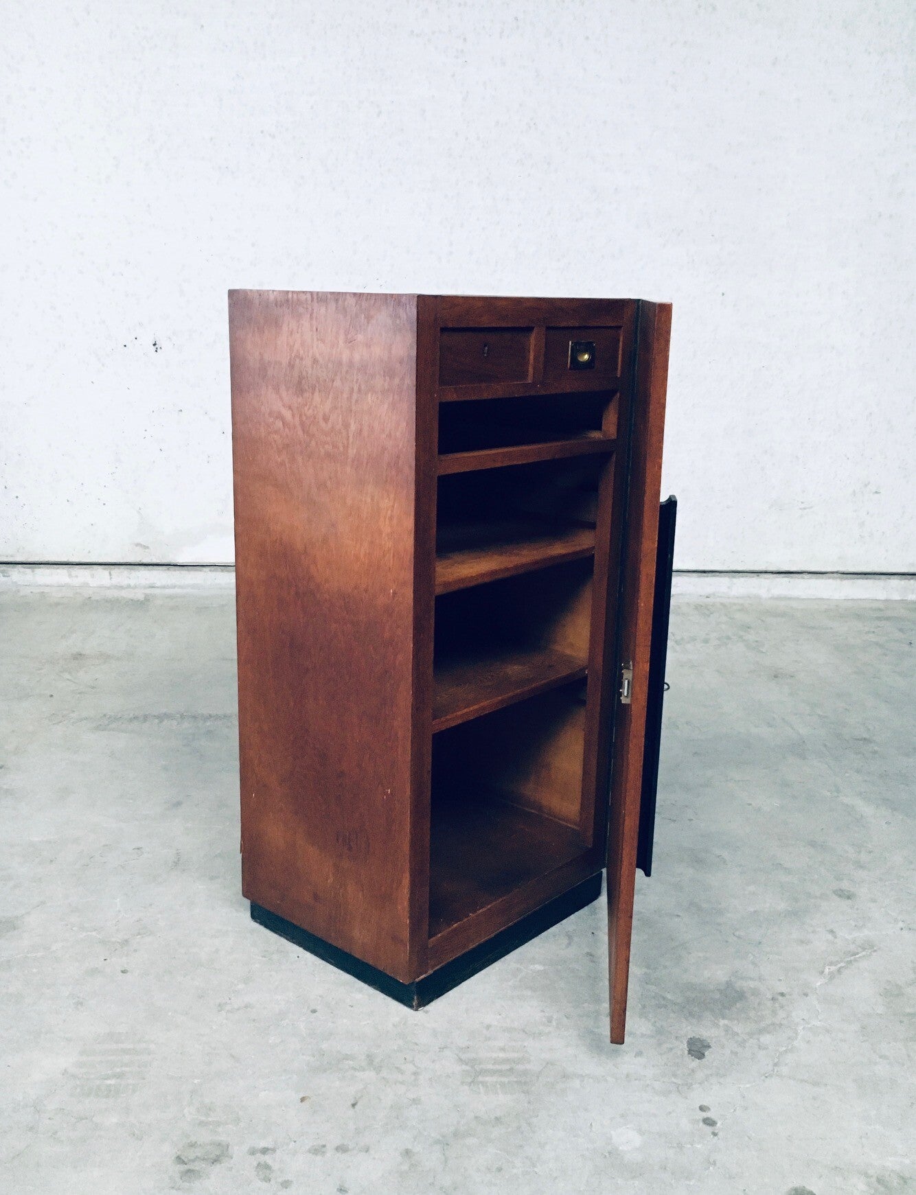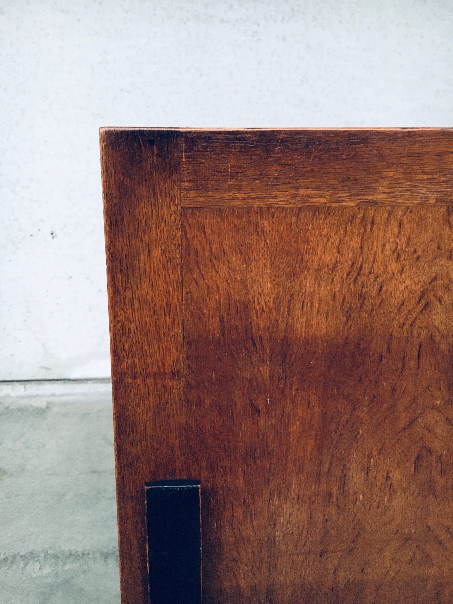 Early 20th Century Design High Cabinet in the style of Le Corbusier. Made in France, 1920's period. Oak constructed cabinet with carved black stained long handle and black painted base. Has different height compartments inside with two drawers, one has a brass handle, the other a keyhole. Probably missing a larger drawer underneath the 2 smaller drawers. Beautiful in it's simplicit, construction and use of materials which is remenissant to Le Corbusier designs. This comes in good, all original condition, with signs of it's use and age. Measures 122cm x 61cm x 47cm.