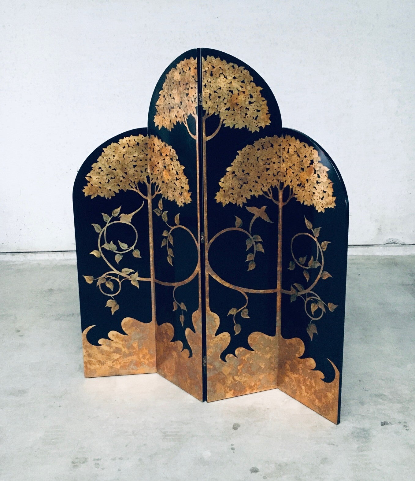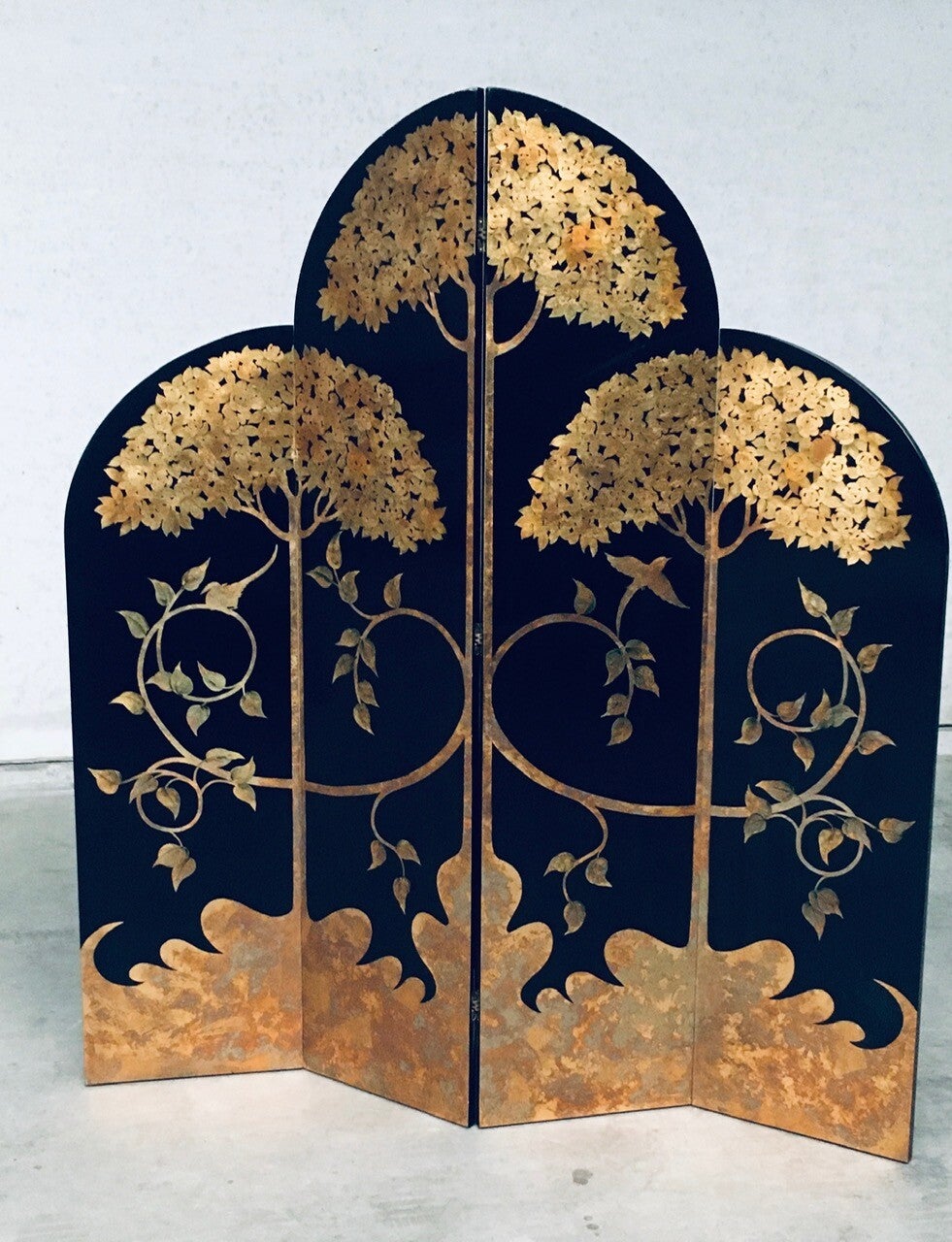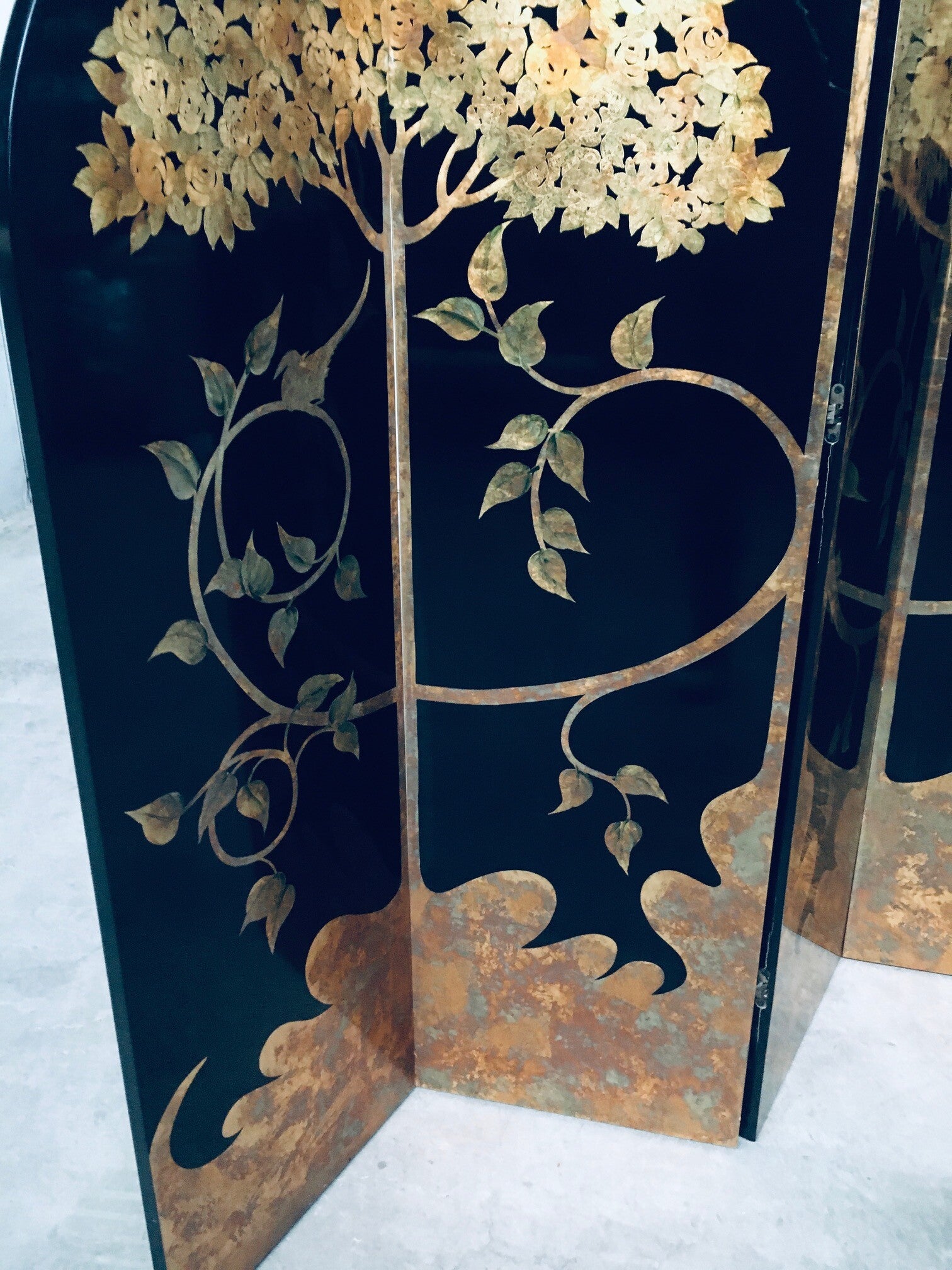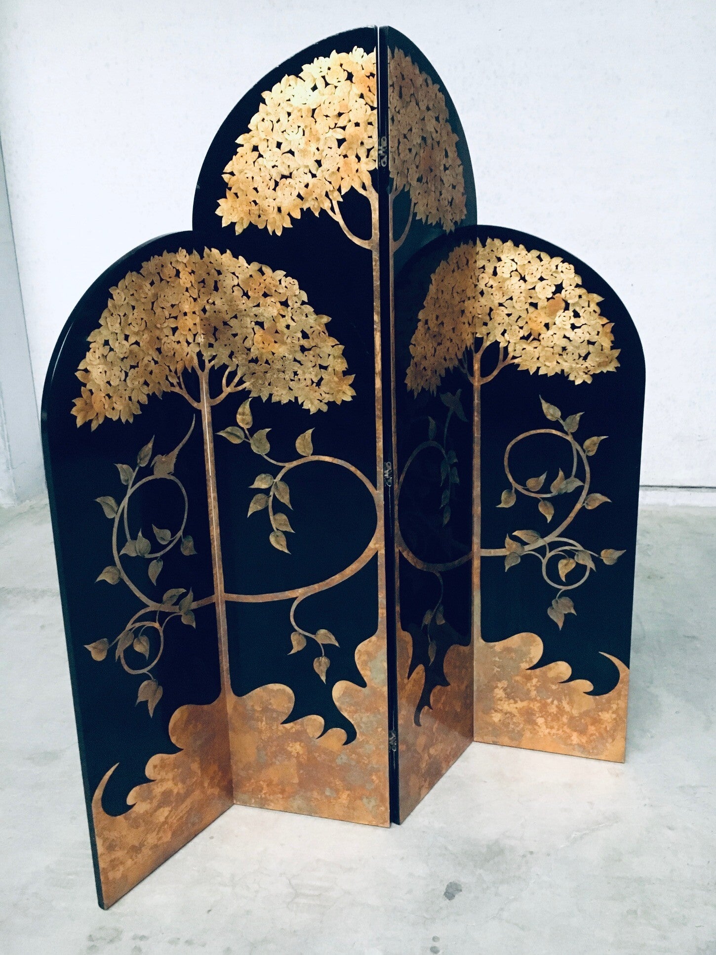 Vintage Art Deco Revival Asian Style Black & Gold Leaf 4 Panel Free Standing Screen Room Divider. Made in the 1980's period. Black lacquered wooden panels with gold leaf tree and flower motifs. Folding tall screen with 4 hinged panels. This comes in good overall condition with minor signs of it's use and age. Scratches and wear marks on the front and back. The back has more marks in the black lacquer finish. This measures about 199cm high and each panel measures 46cm wide.