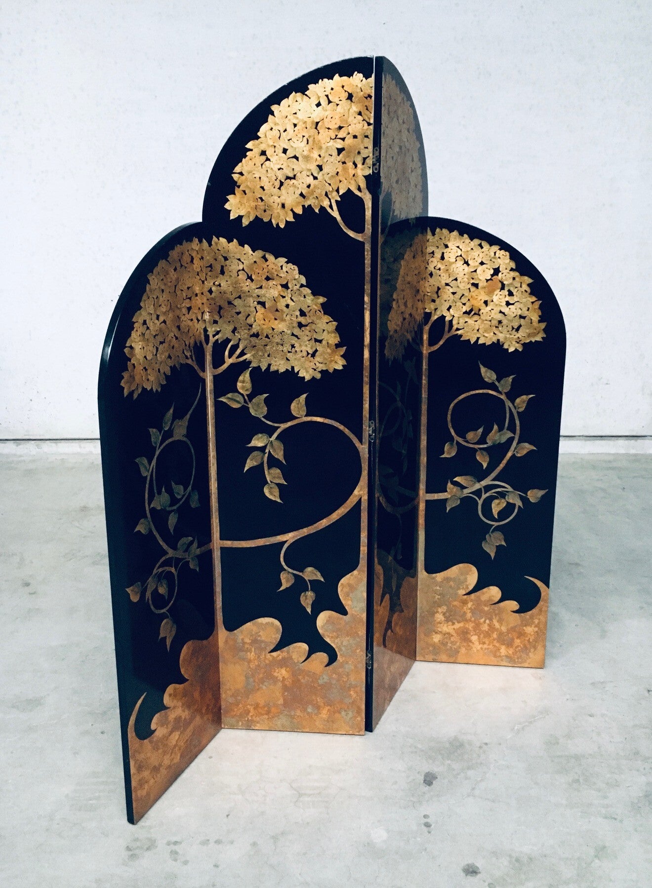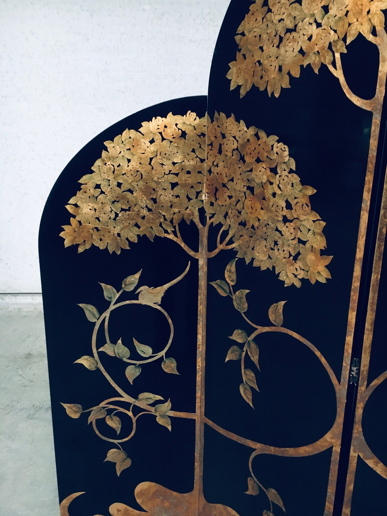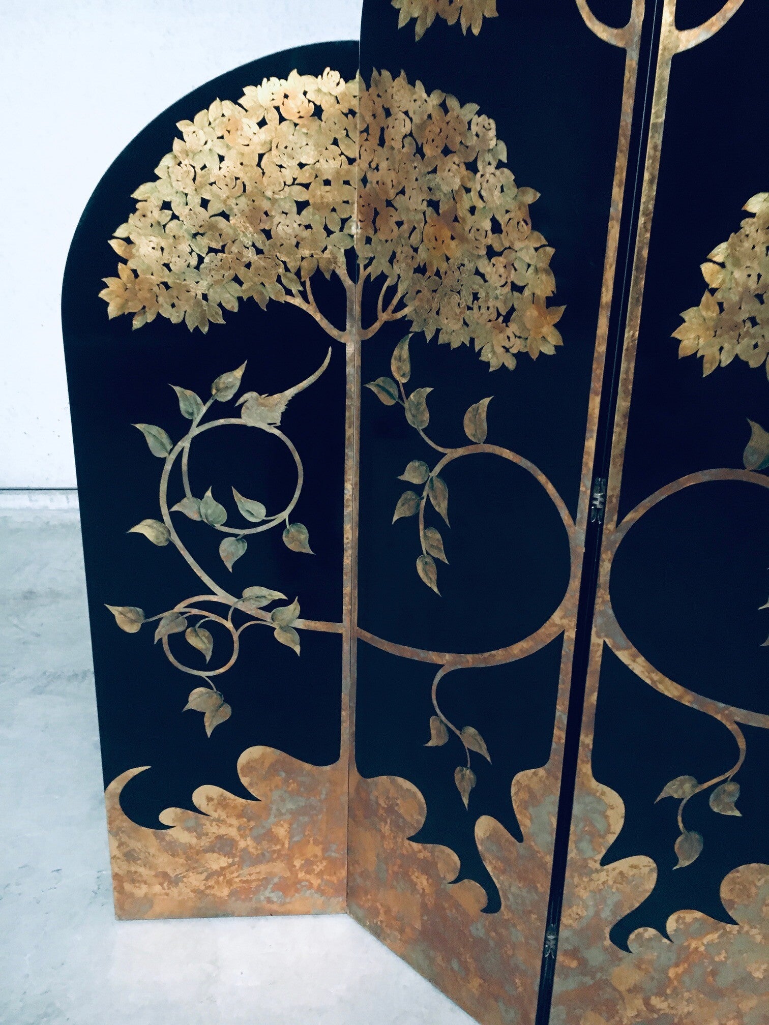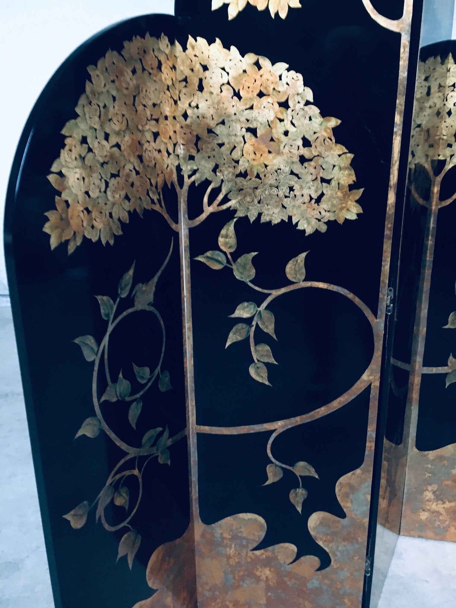 Vintage Art Deco Revival Asian Style Black & Gold Leaf 4 Panel Free Standing Screen Room Divider. Made in the 1980's period. Black lacquered wooden panels with gold leaf tree and flower motifs. Folding tall screen with 4 hinged panels. This comes in good overall condition with minor signs of it's use and age. Scratches and wear marks on the front and back. The back has more marks in the black lacquer finish. This measures about 199cm high and each panel measures 46cm wide.