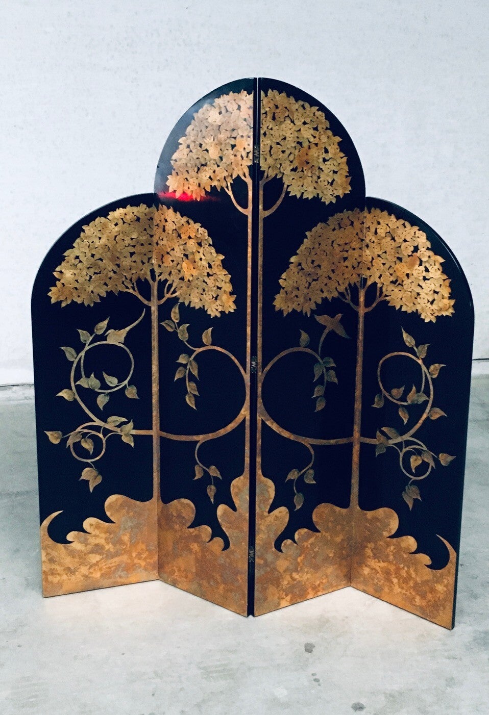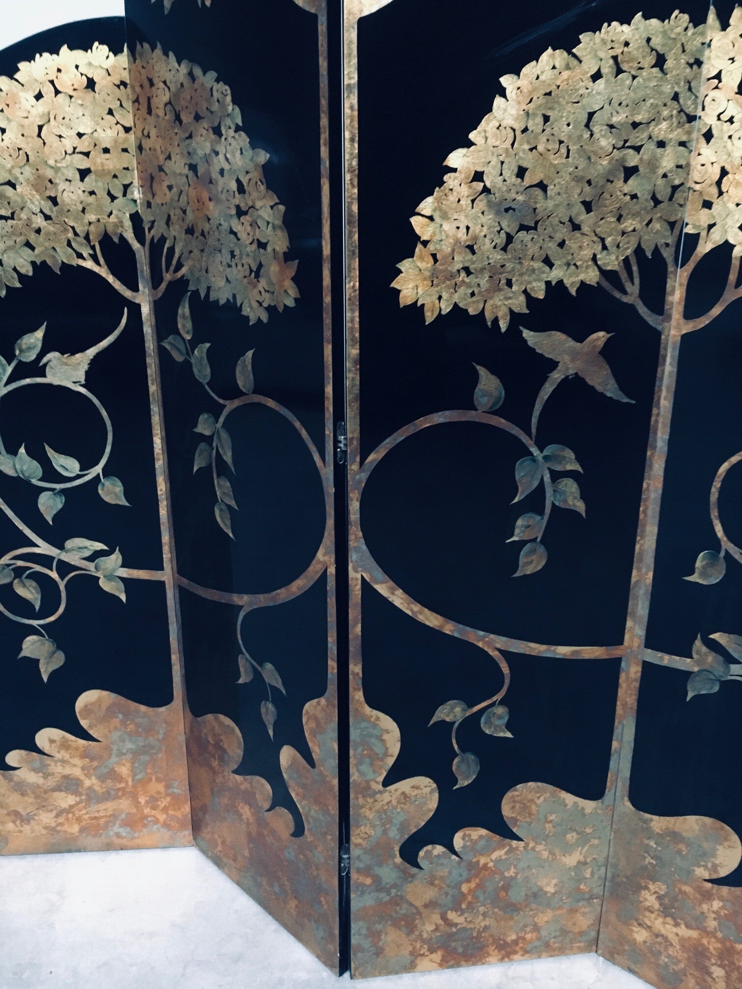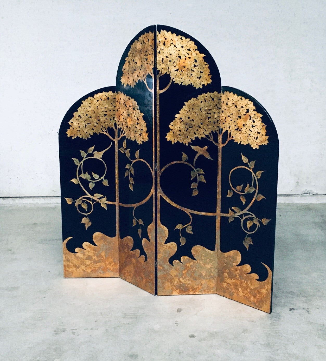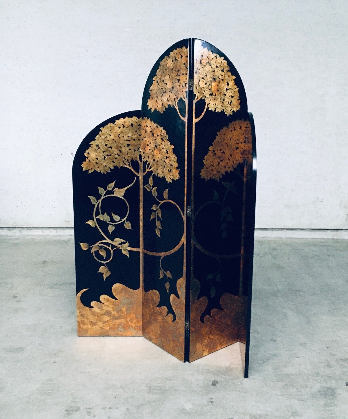 Vintage Art Deco Revival Asian Style Black & Gold Leaf 4 Panel Free Standing Screen Room Divider. Made in the 1980's period. Black lacquered wooden panels with gold leaf tree and flower motifs. Folding tall screen with 4 hinged panels. This comes in good overall condition with minor signs of it's use and age. Scratches and wear marks on the front and back. The back has more marks in the black lacquer finish. This measures about 199cm high and each panel measures 46cm wide.