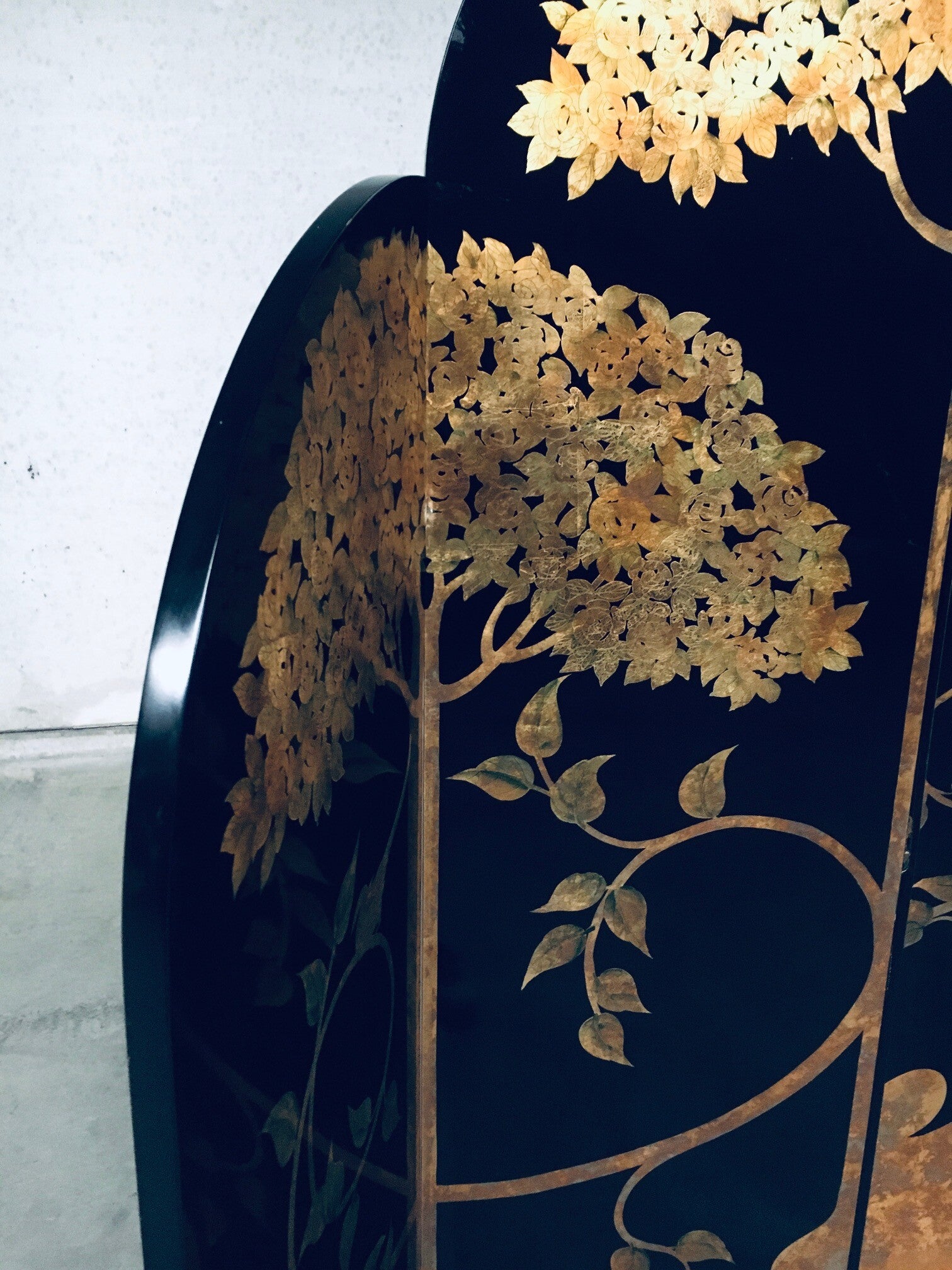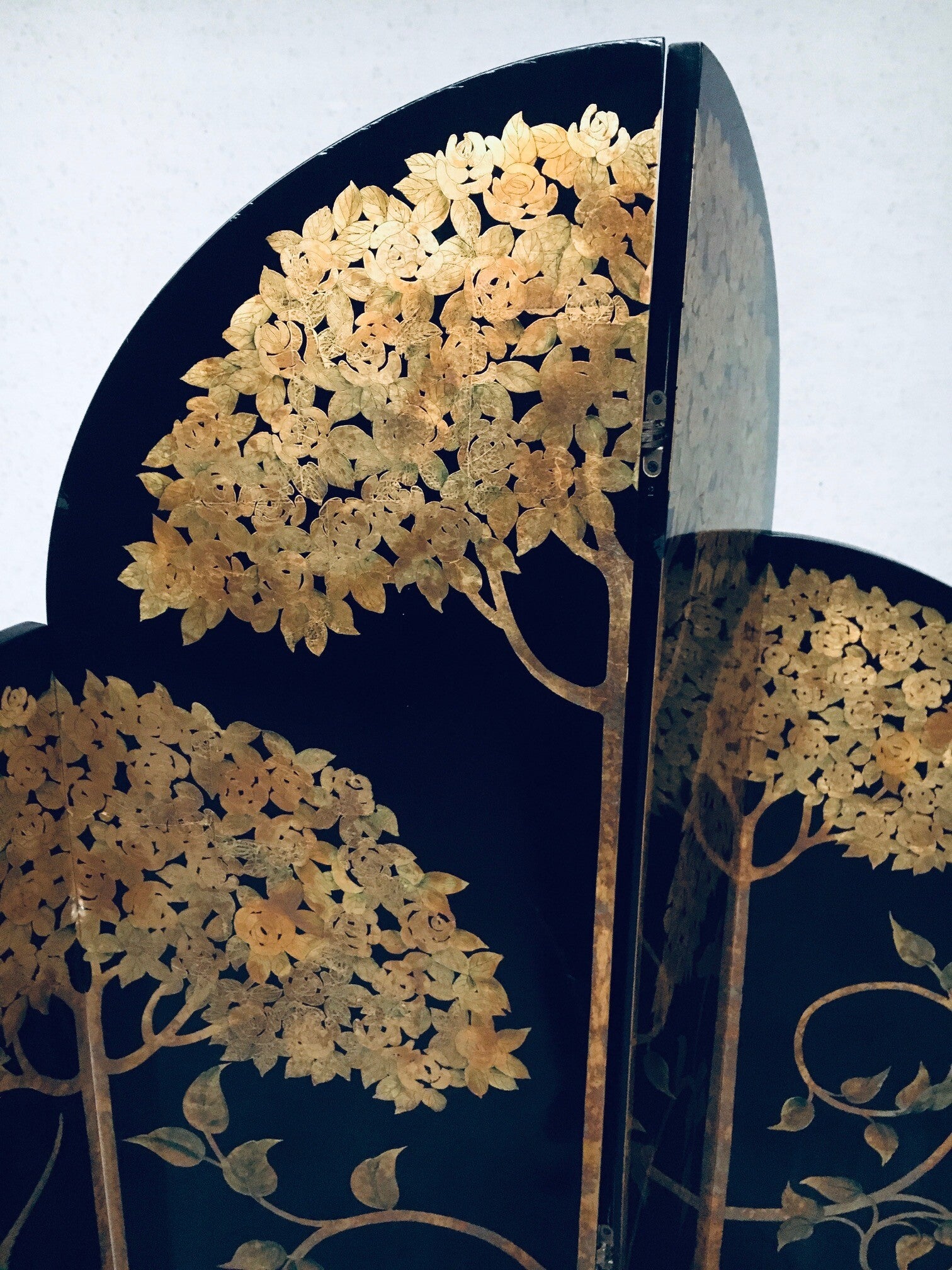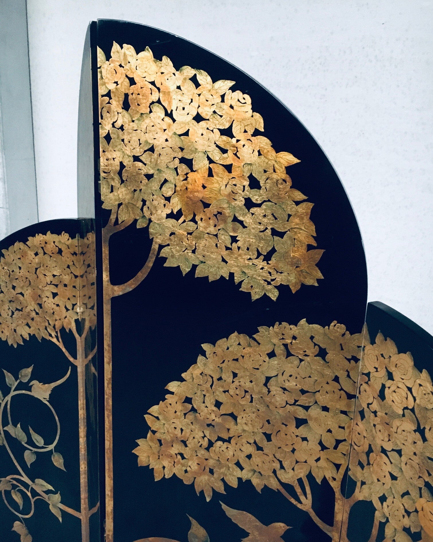 1980's Art Deco Revival Asian Black & Gold Leaf Screen Room Divider