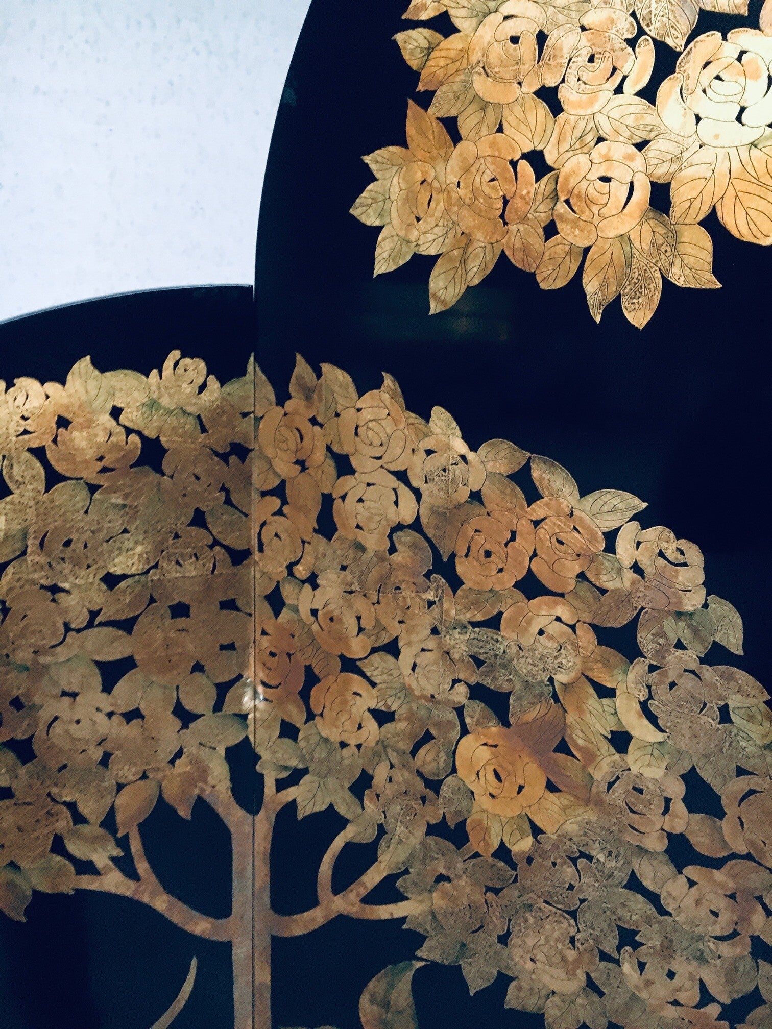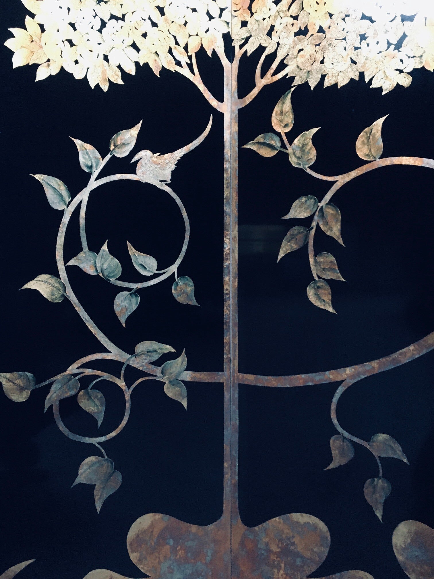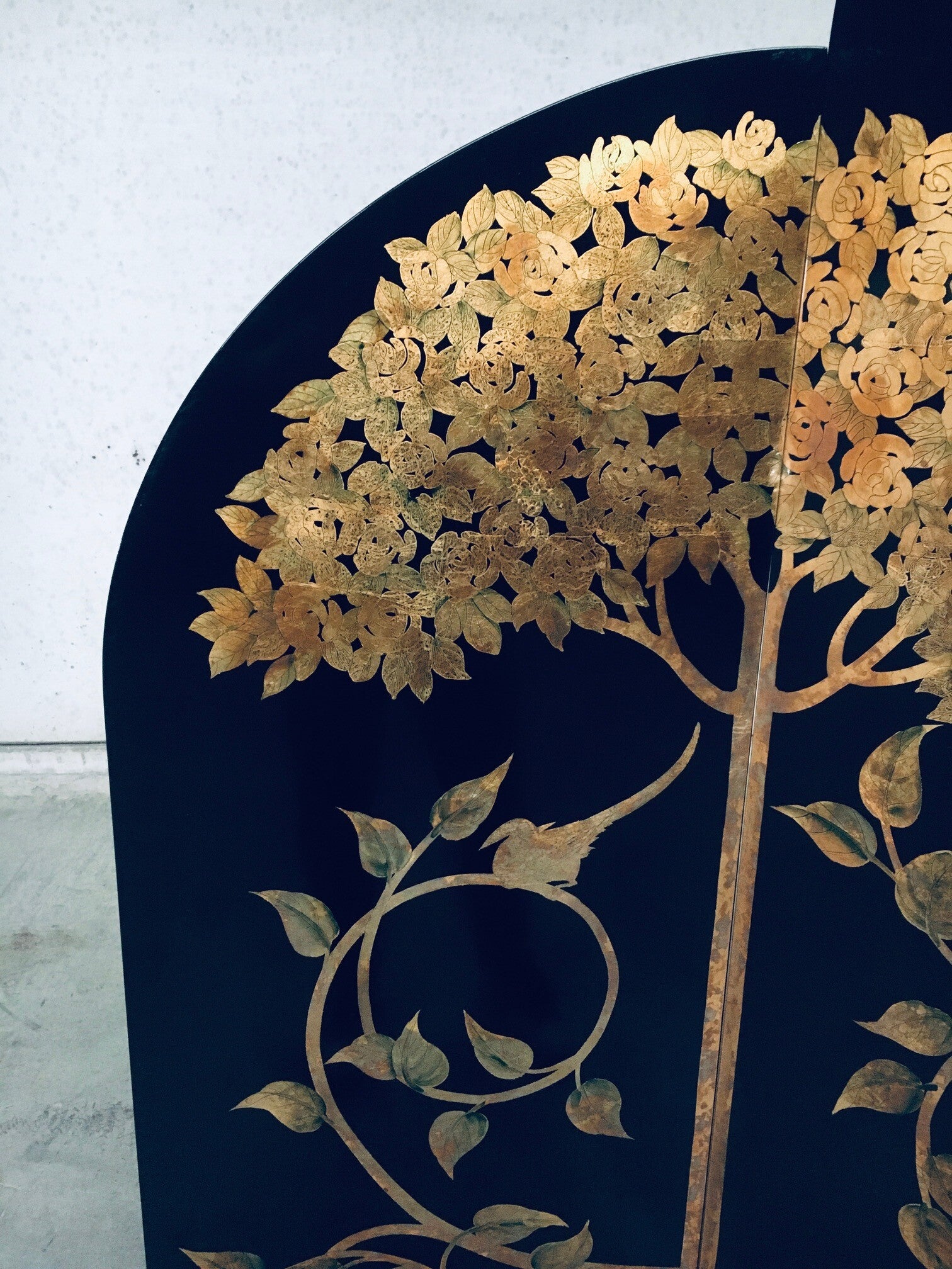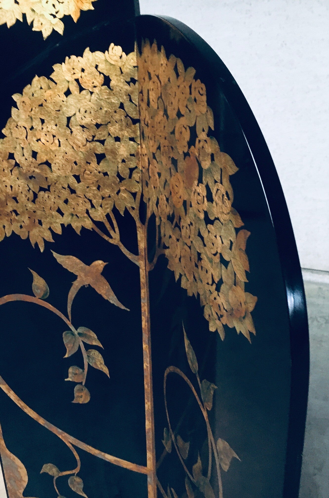 1980's Art Deco Revival Asian Black & Gold Leaf Screen Room Divider