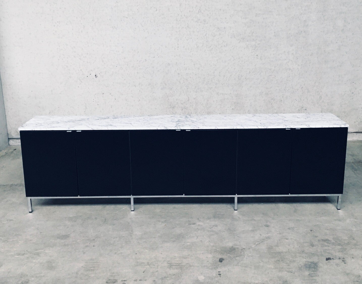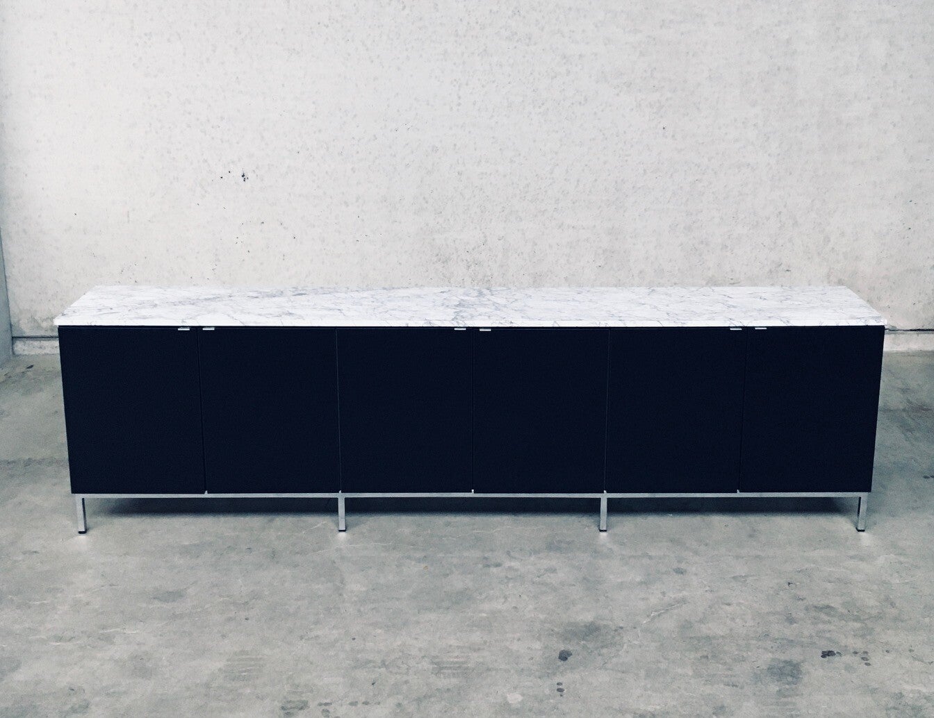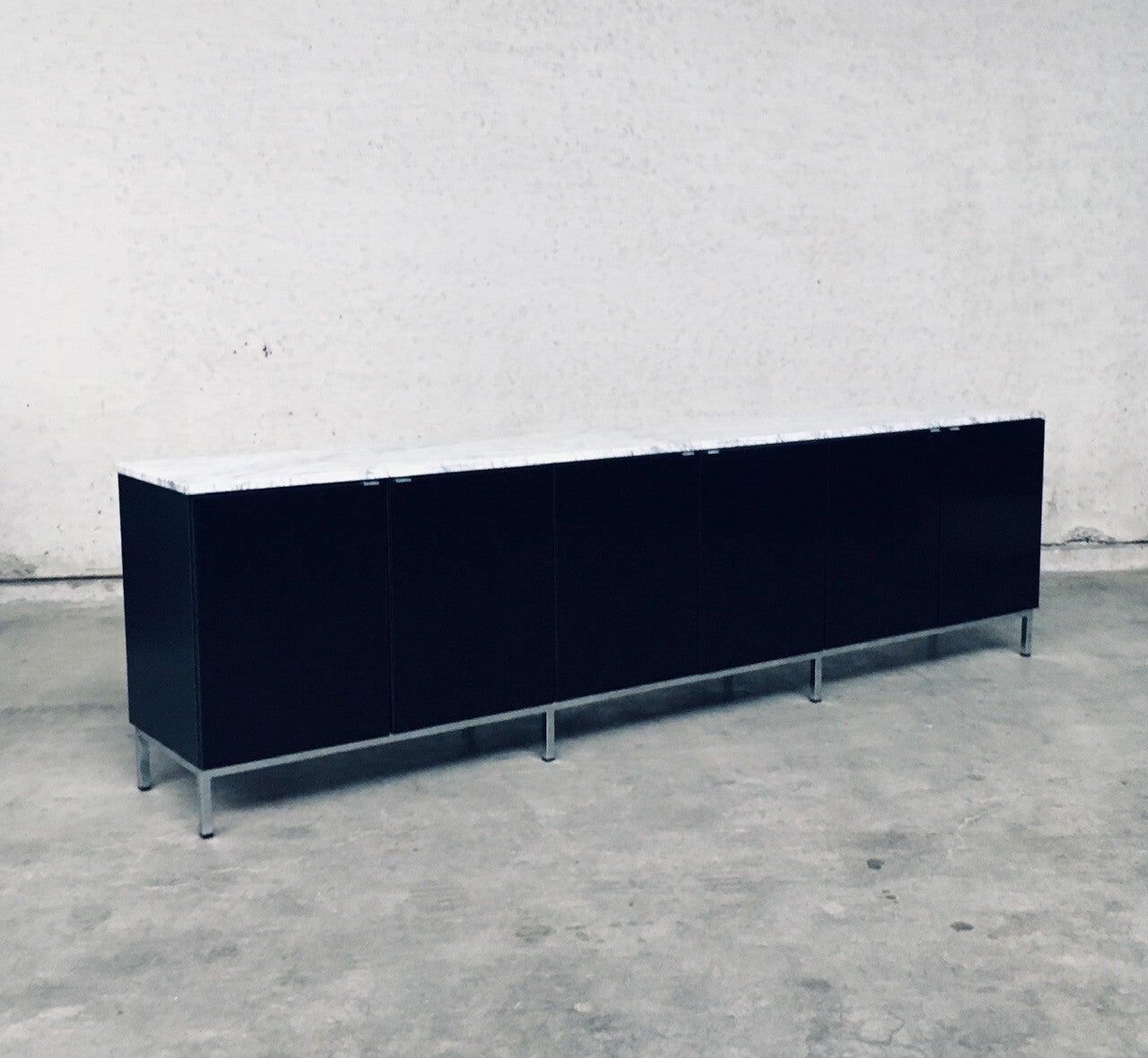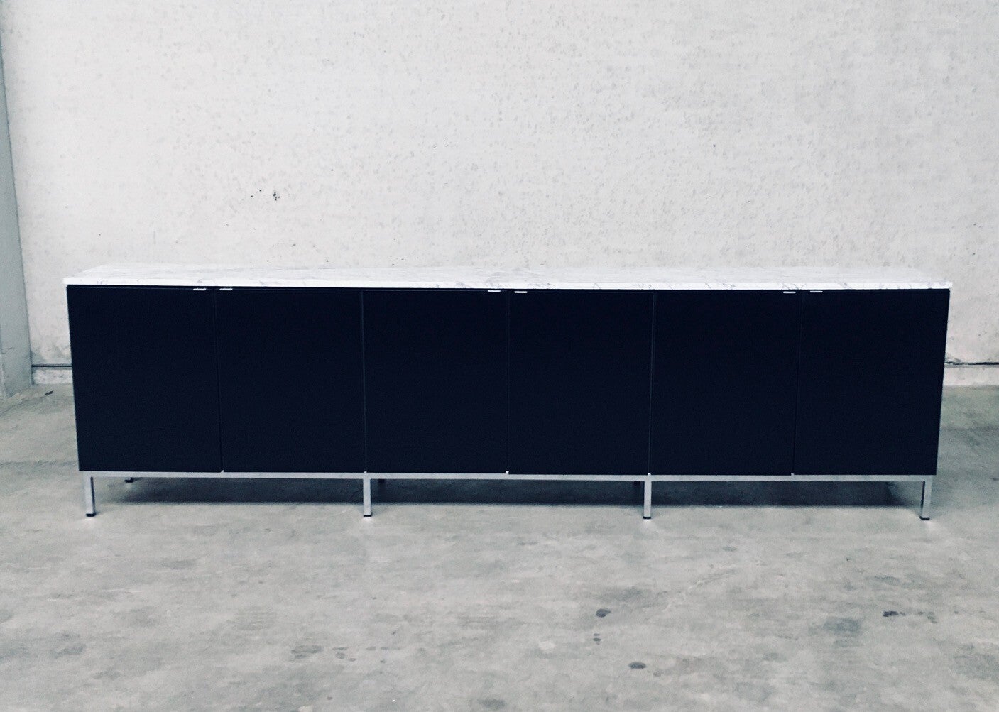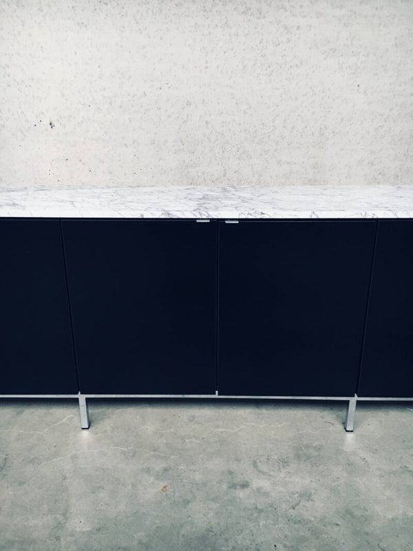 Vintage Midcentury Modern Design Credenza by Florence Knoll for Knoll International. Made in the 1970's period. A design classic from Knoll. Rare 6 door XL version in black with white solid carrara marble top. A Glass tray in the left and right parts. The middle part has no subdivisions. This cabinet comes in very good, original condition with minor wear marks for it's age and use. This measures 83,5cm high x 294cm wide x 48cm deep.