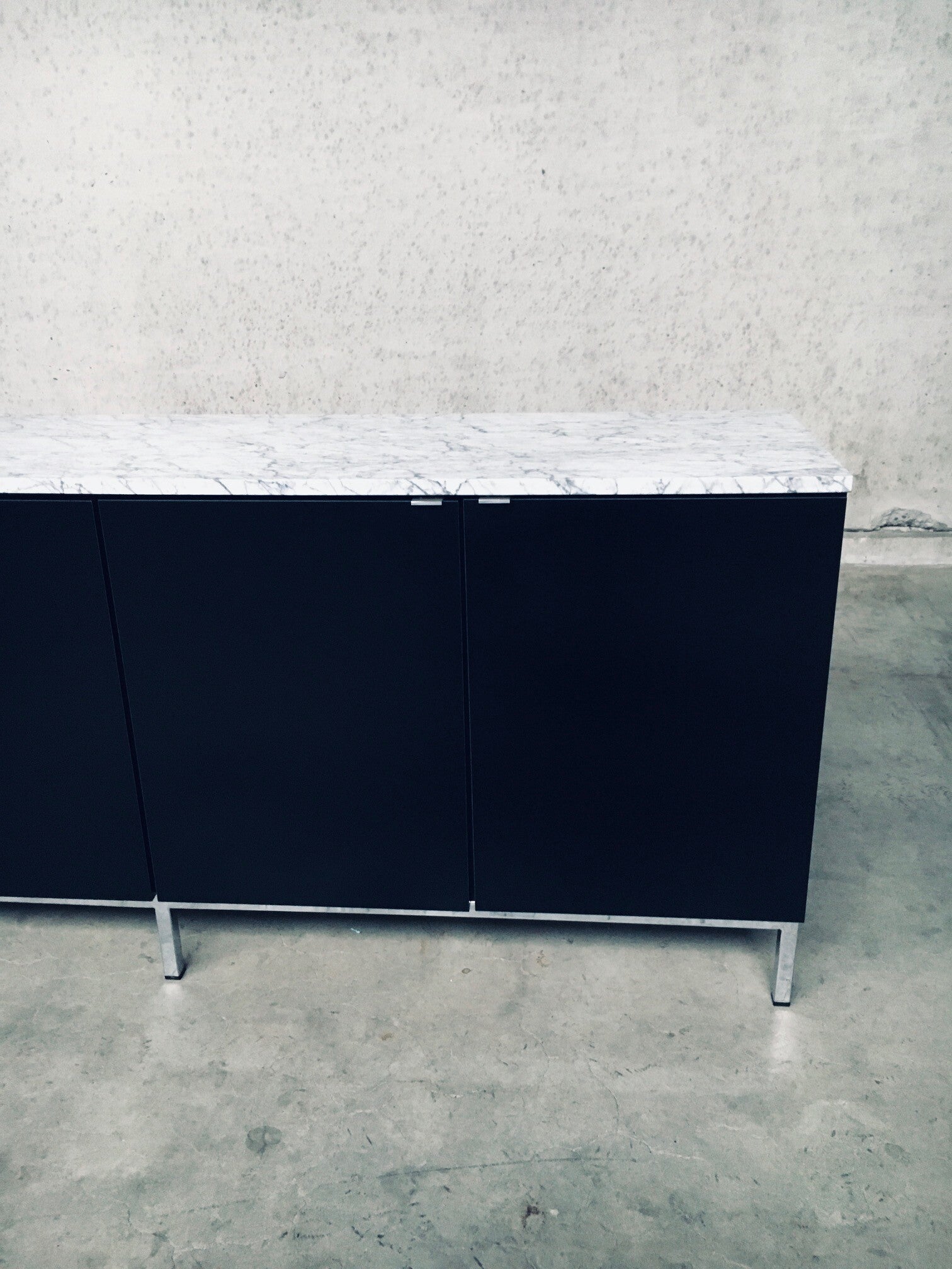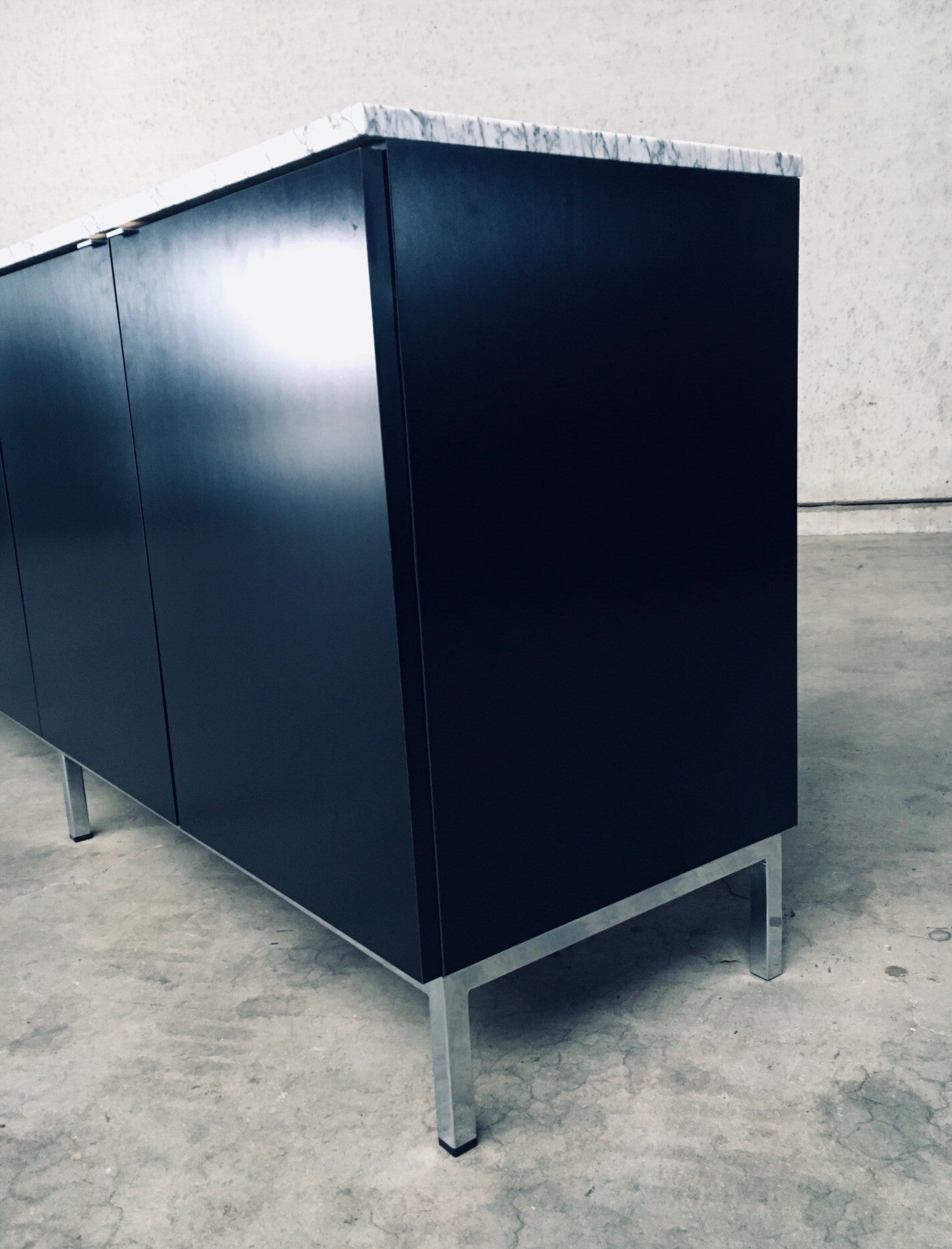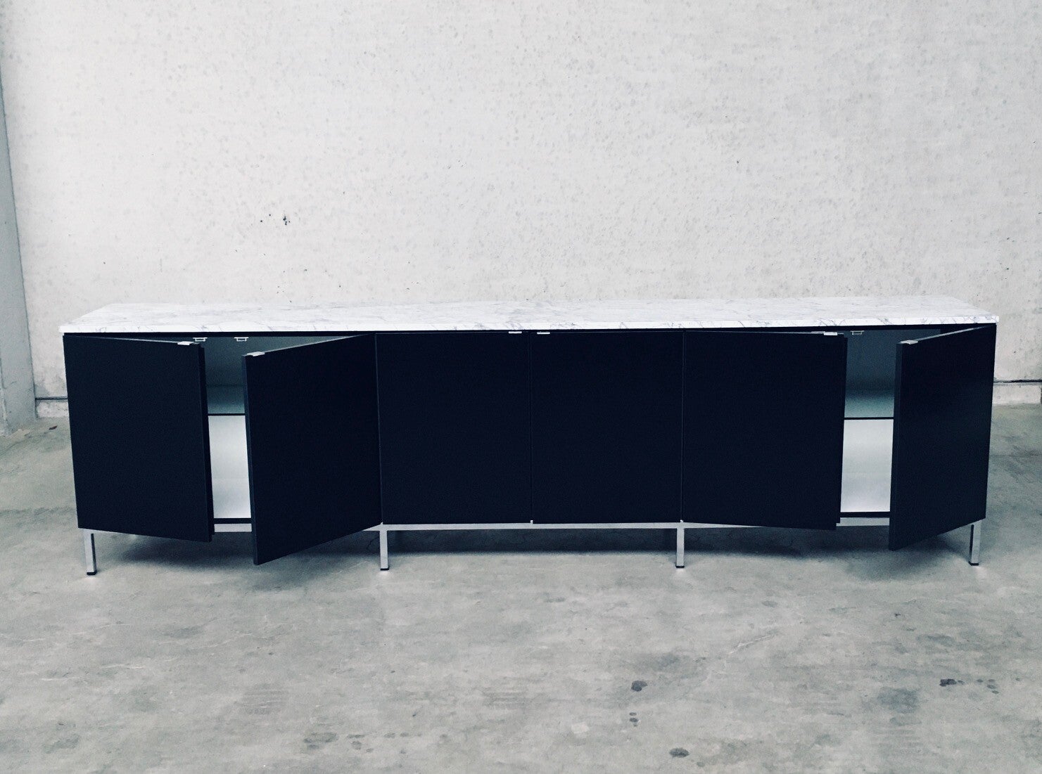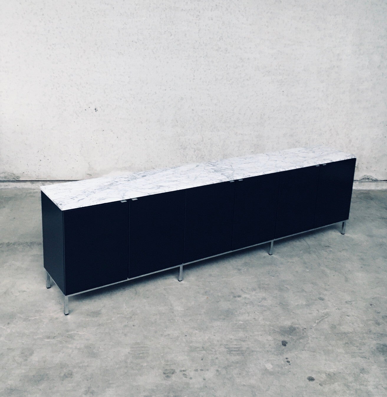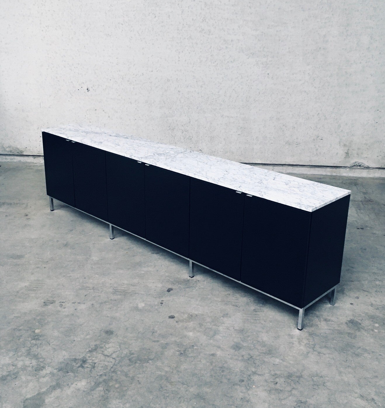 Vintage Midcentury Modern Design Credenza by Florence Knoll for Knoll International. Made in the 1970's period. A design classic from Knoll. Rare 6 door XL version in black with white solid carrara marble top. A Glass tray in the left and right parts. The middle part has no subdivisions. This cabinet comes in very good, original condition with minor wear marks for it's age and use. This measures 83,5cm high x 294cm wide x 48cm deep.