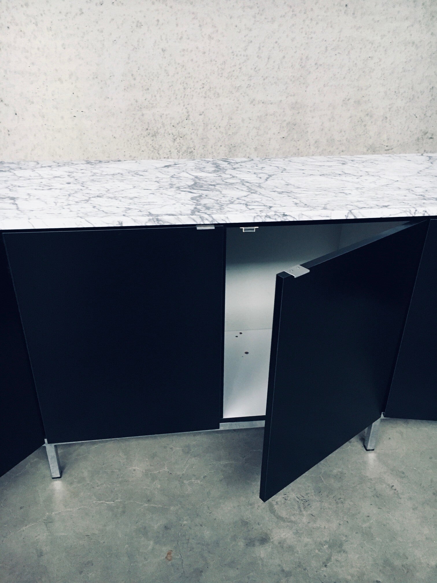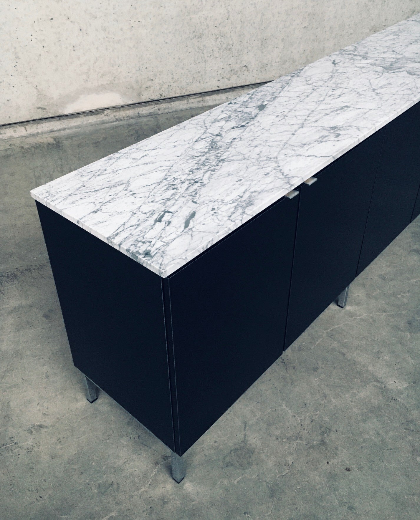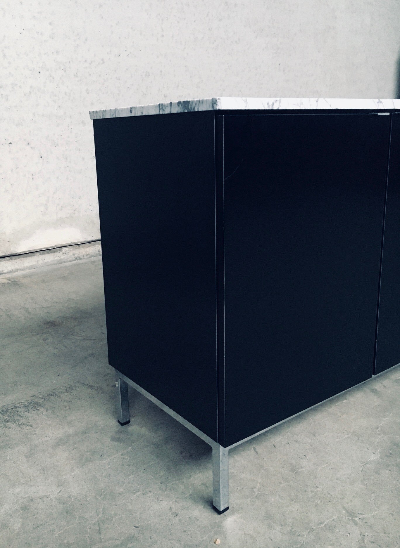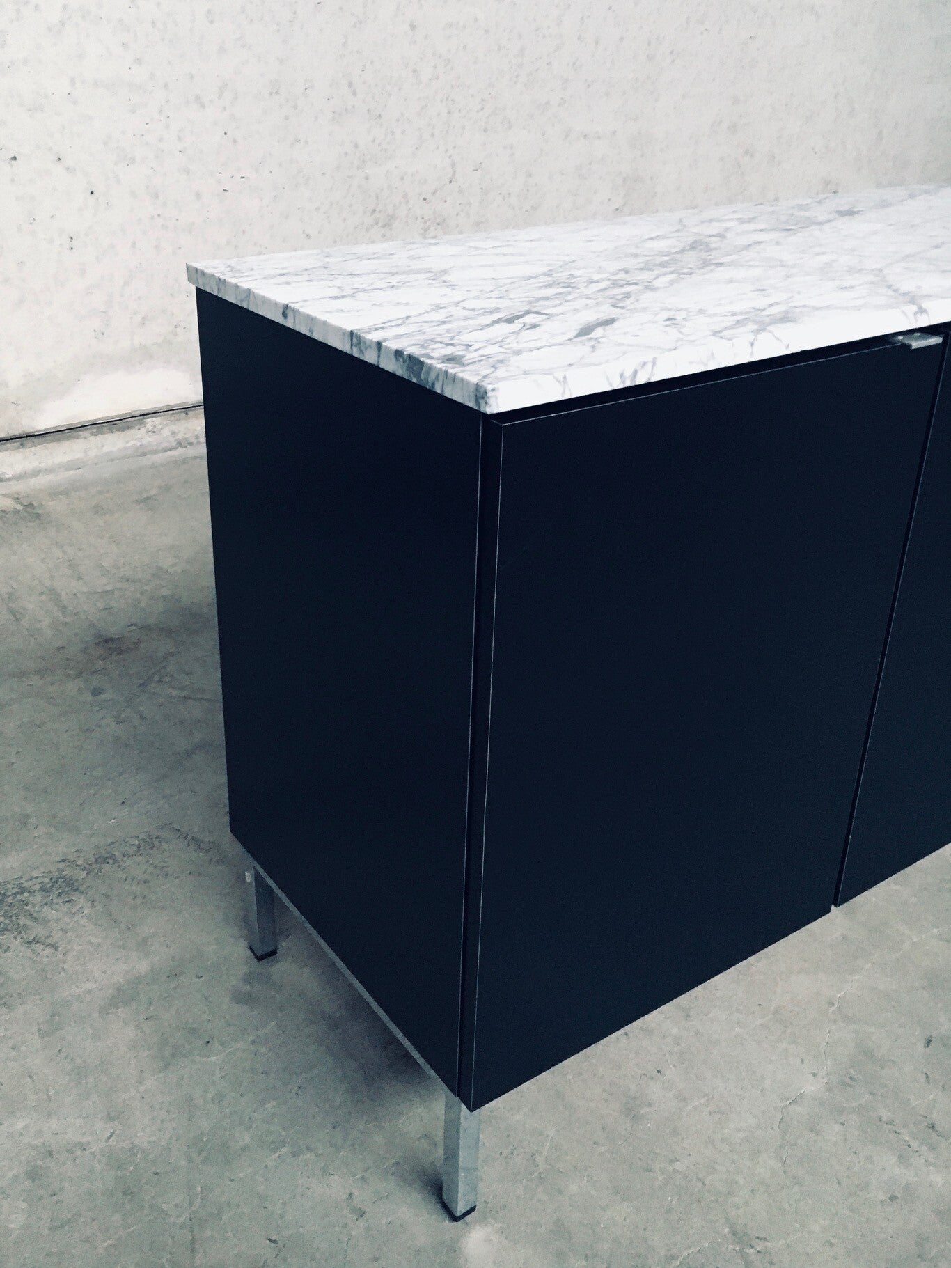 Vintage Midcentury Modern Design Credenza by Florence Knoll for Knoll International. Made in the 1970's period. A design classic from Knoll. Rare 6 door XL version in black with white solid carrara marble top. A Glass tray in the left and right parts. The middle part has no subdivisions. This cabinet comes in very good, original condition with minor wear marks for it's age and use. This measures 83,5cm high x 294cm wide x 48cm deep.